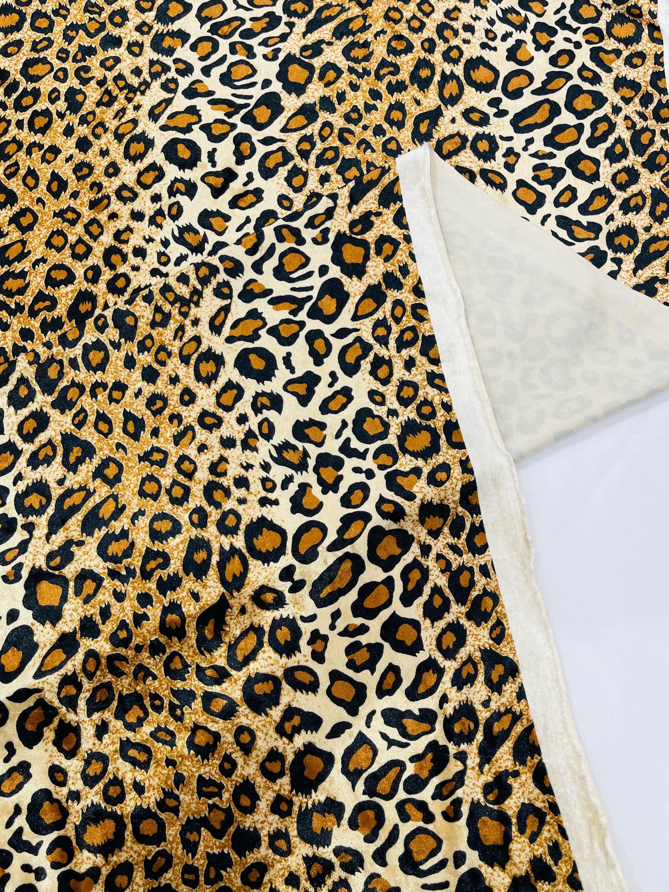 Leopard print on stretch velvet fabric. Item has a 20% stretch on the grain and has a 10% stretch vertical. If more than one yard is purchased, item will come in one piece. For instance, if you order one yard, you will receive a piece of 58" x 36". If you order two yards, you will receive a piece of 58" x 72", etc.