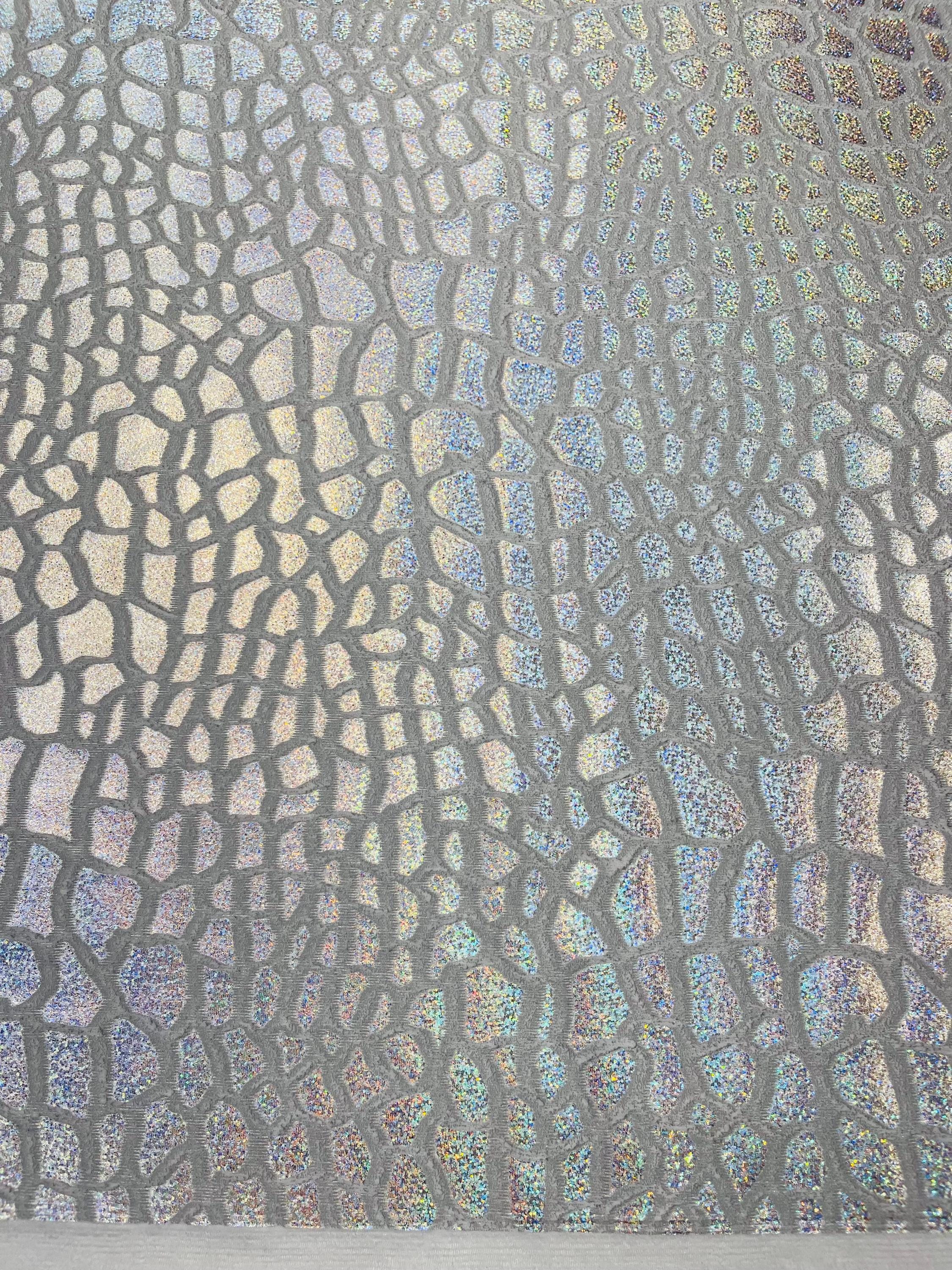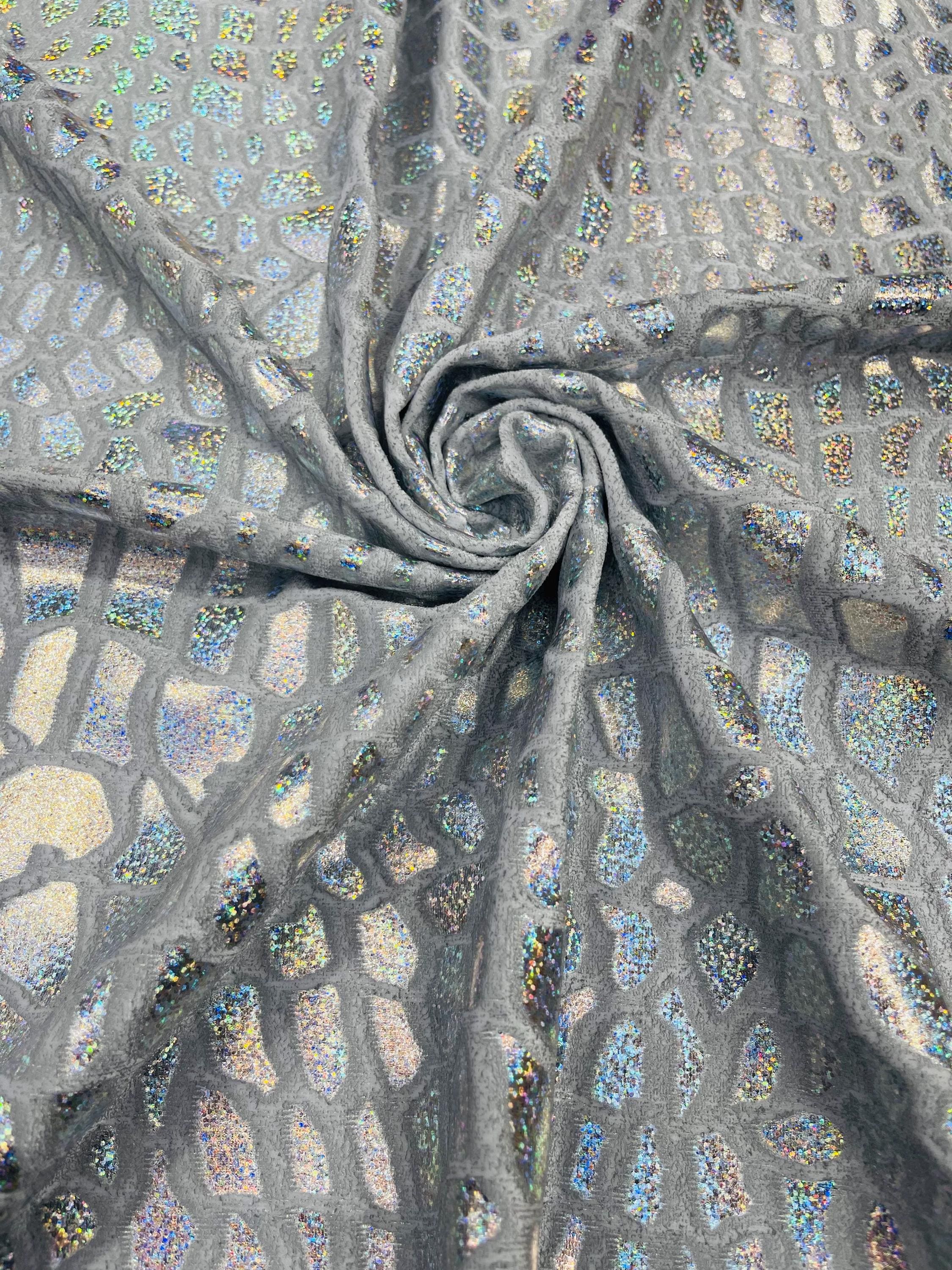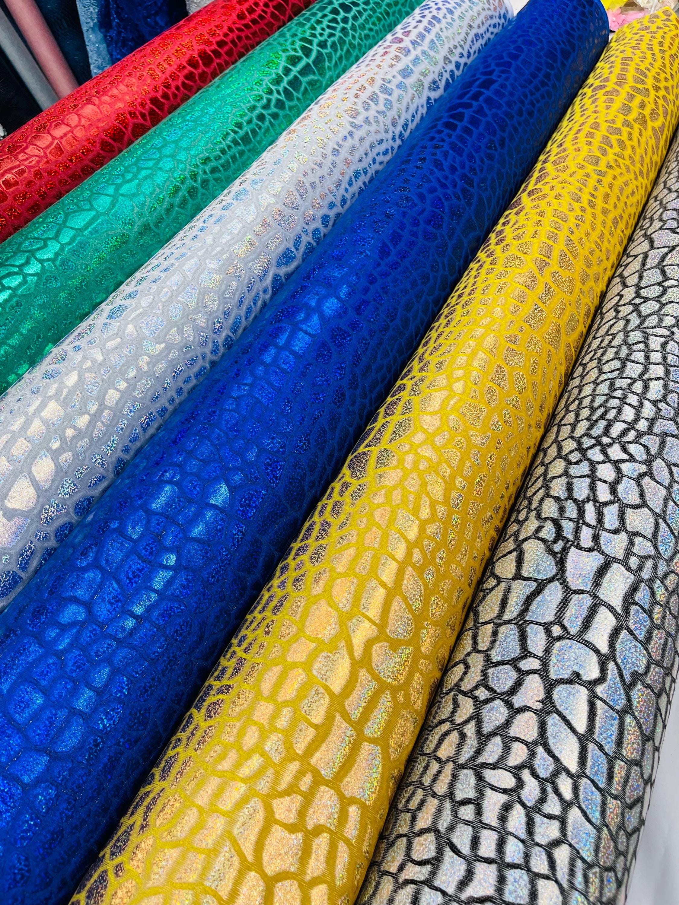 Giraffe Skin Design On Stretch Velvet Fabric; ideal for formal designs. Its luxurious feel and shimmering foil brings a touch of class to any design. This fabric is perfect for costumes, special occasion wear, and dance recital costumes. This fabric is lightweight yet durable and easy to work with, making it an ideal choice for various projects. It is colorfast and holds its shape well, making it perfect for long-term or daily wear. It is also easy to clean and maintain—just machine wash on a delicate cycle and hang dry or tumble dry using a cool setting.