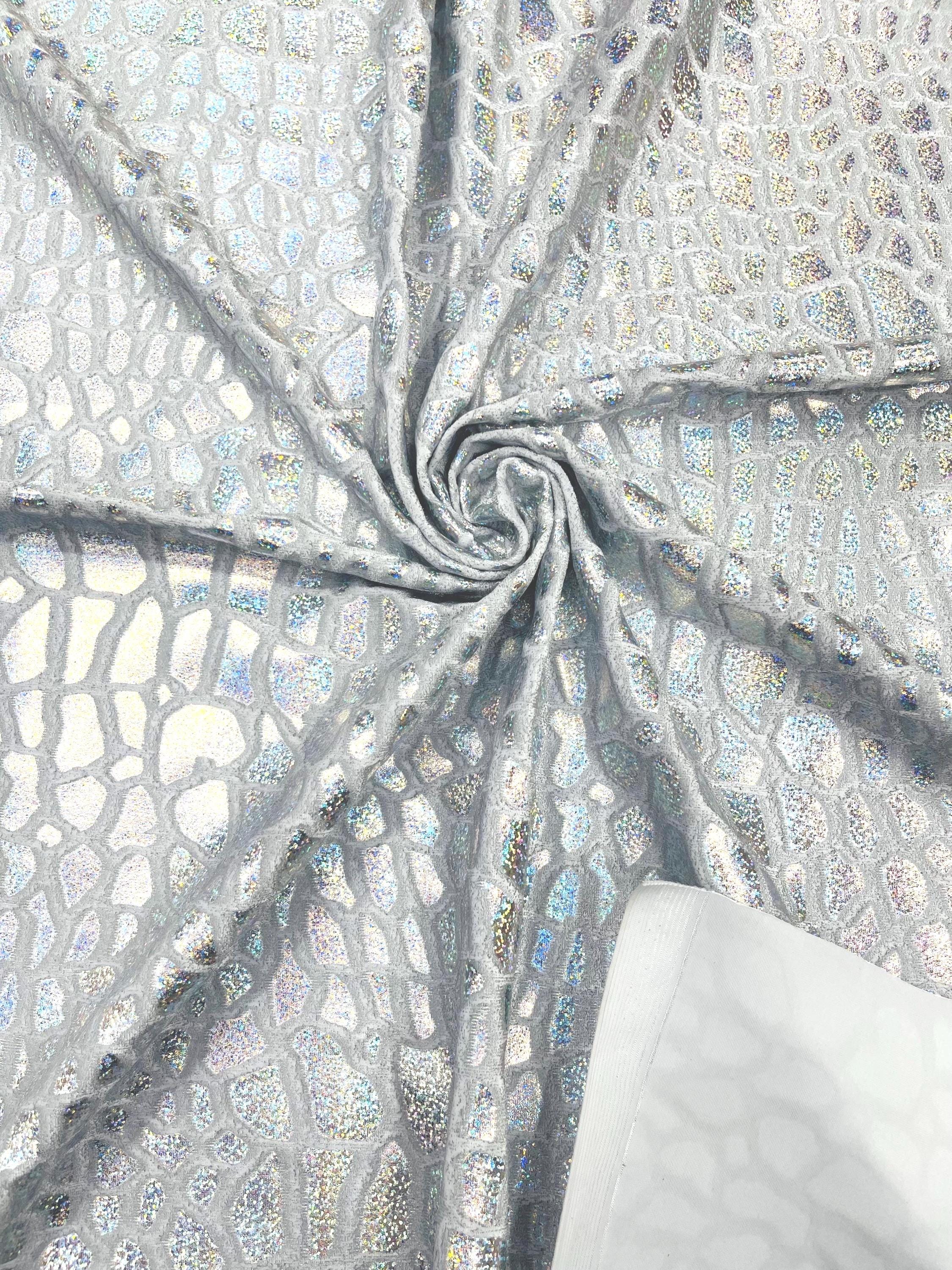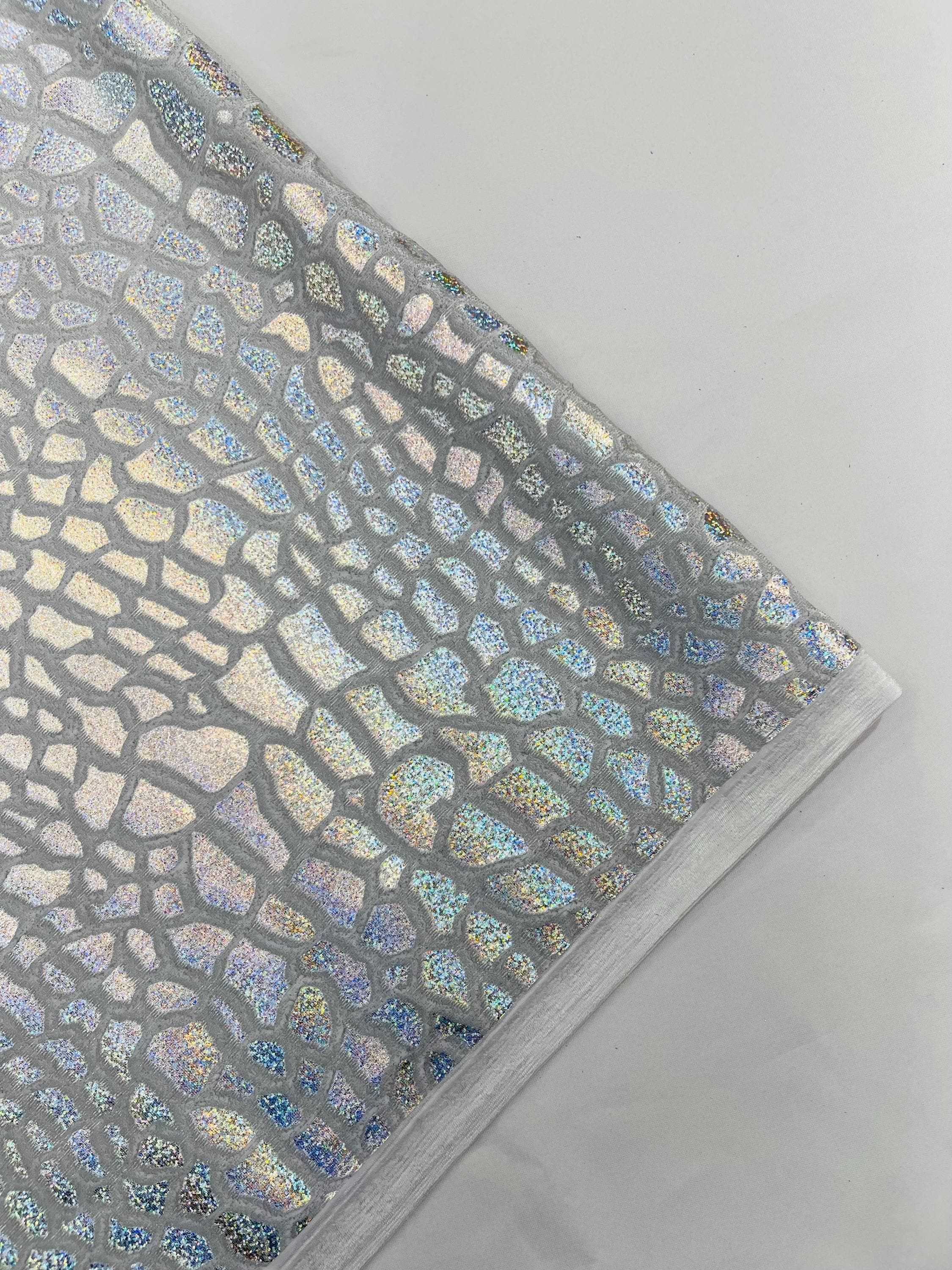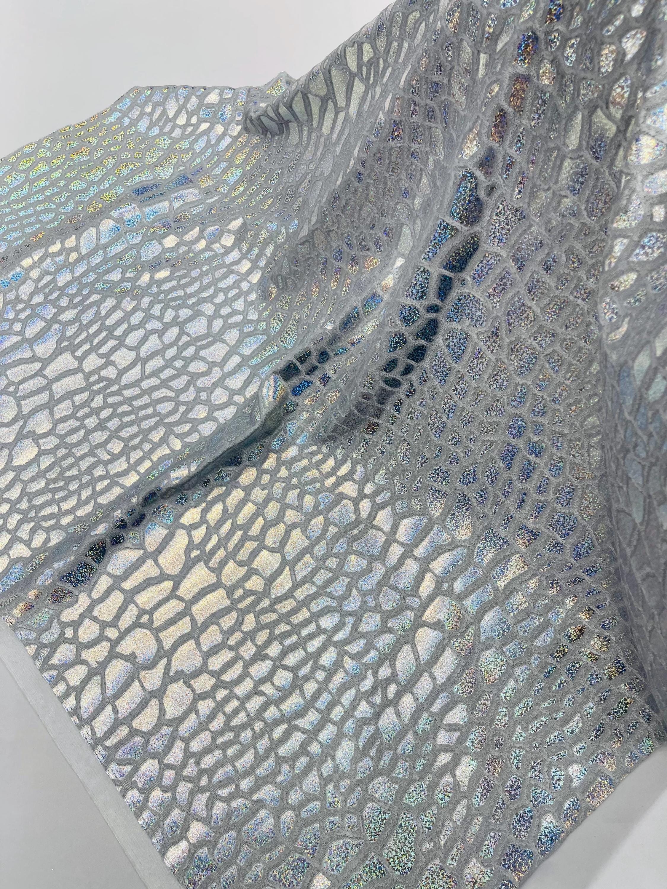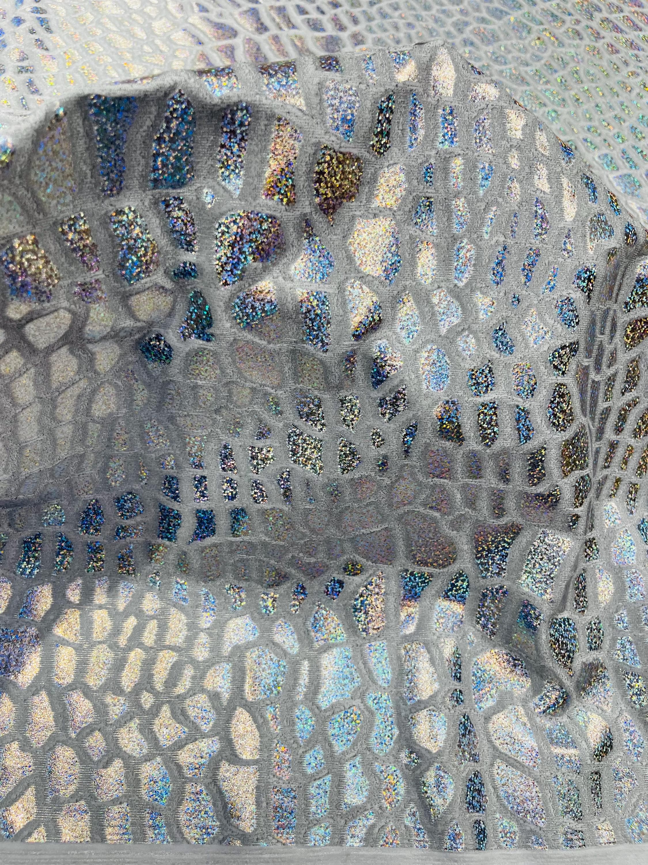 Giraffe Skin Design On Stretch Velvet Fabric; ideal for formal designs. Its luxurious feel and shimmering foil brings a touch of class to any design. This fabric is perfect for costumes, special occasion wear, and dance recital costumes. This fabric is lightweight yet durable and easy to work with, making it an ideal choice for various projects. It is colorfast and holds its shape well, making it perfect for long-term or daily wear. It is also easy to clean and maintain—just machine wash on a delicate cycle and hang dry or tumble dry using a cool setting.