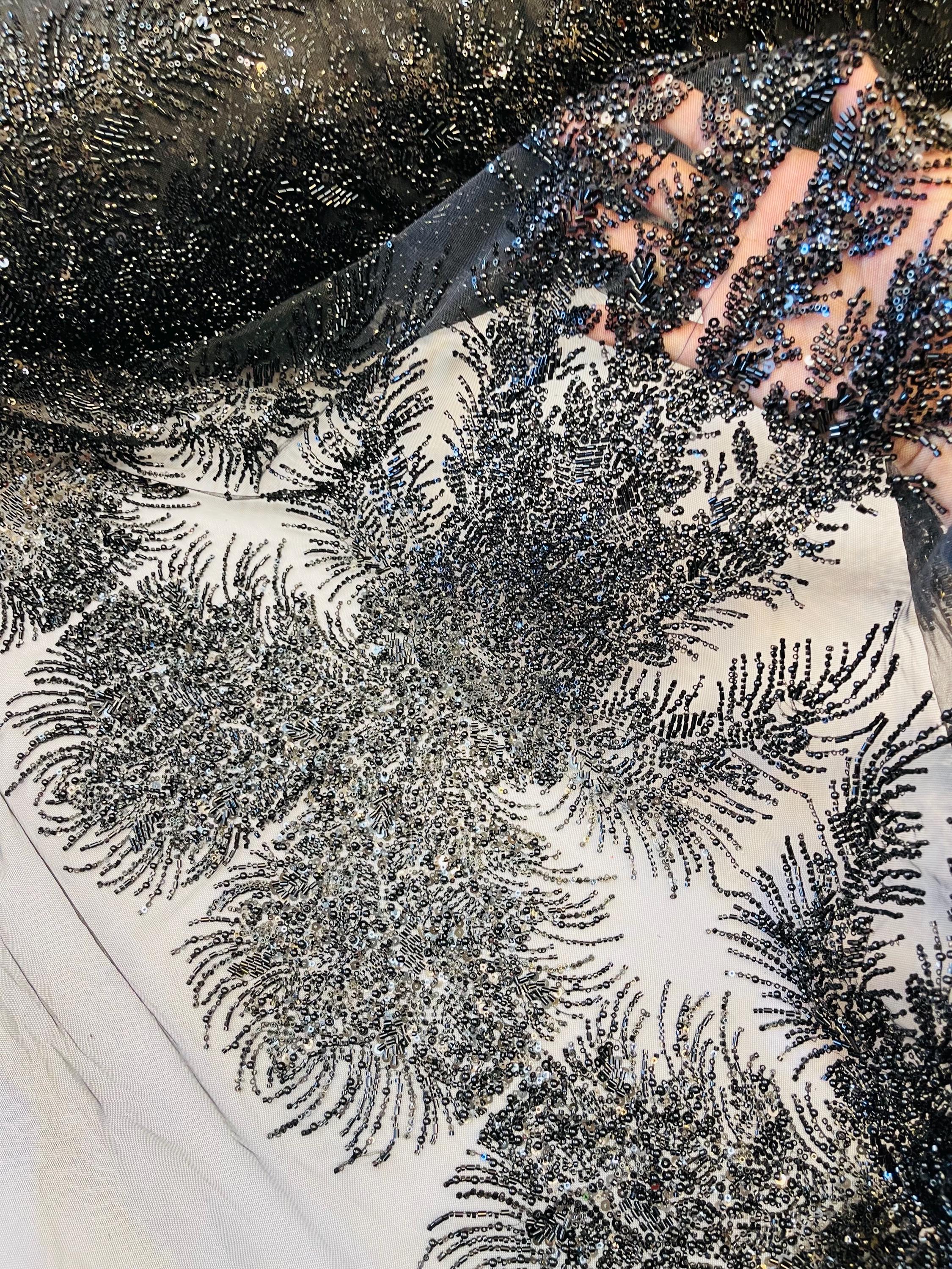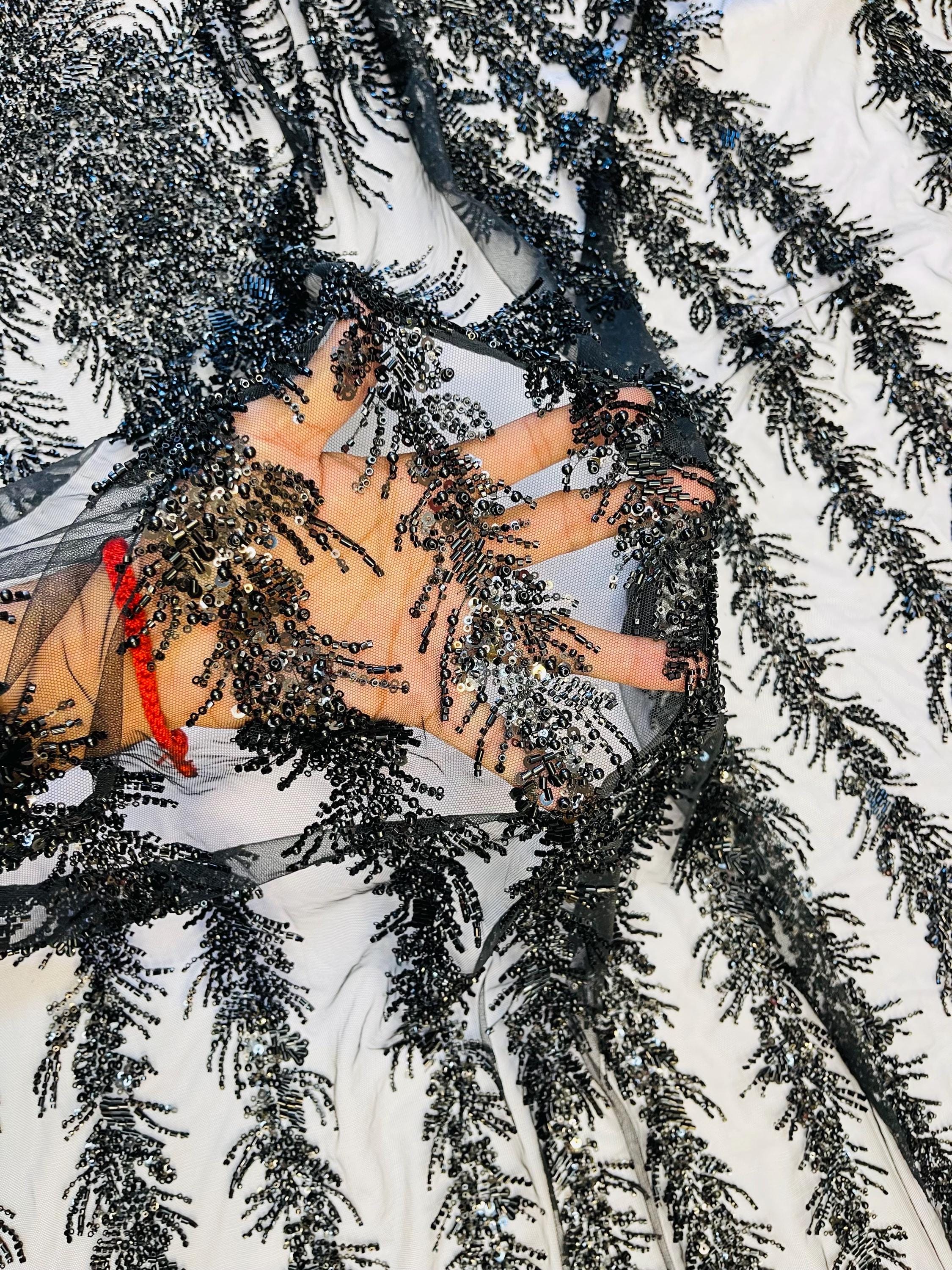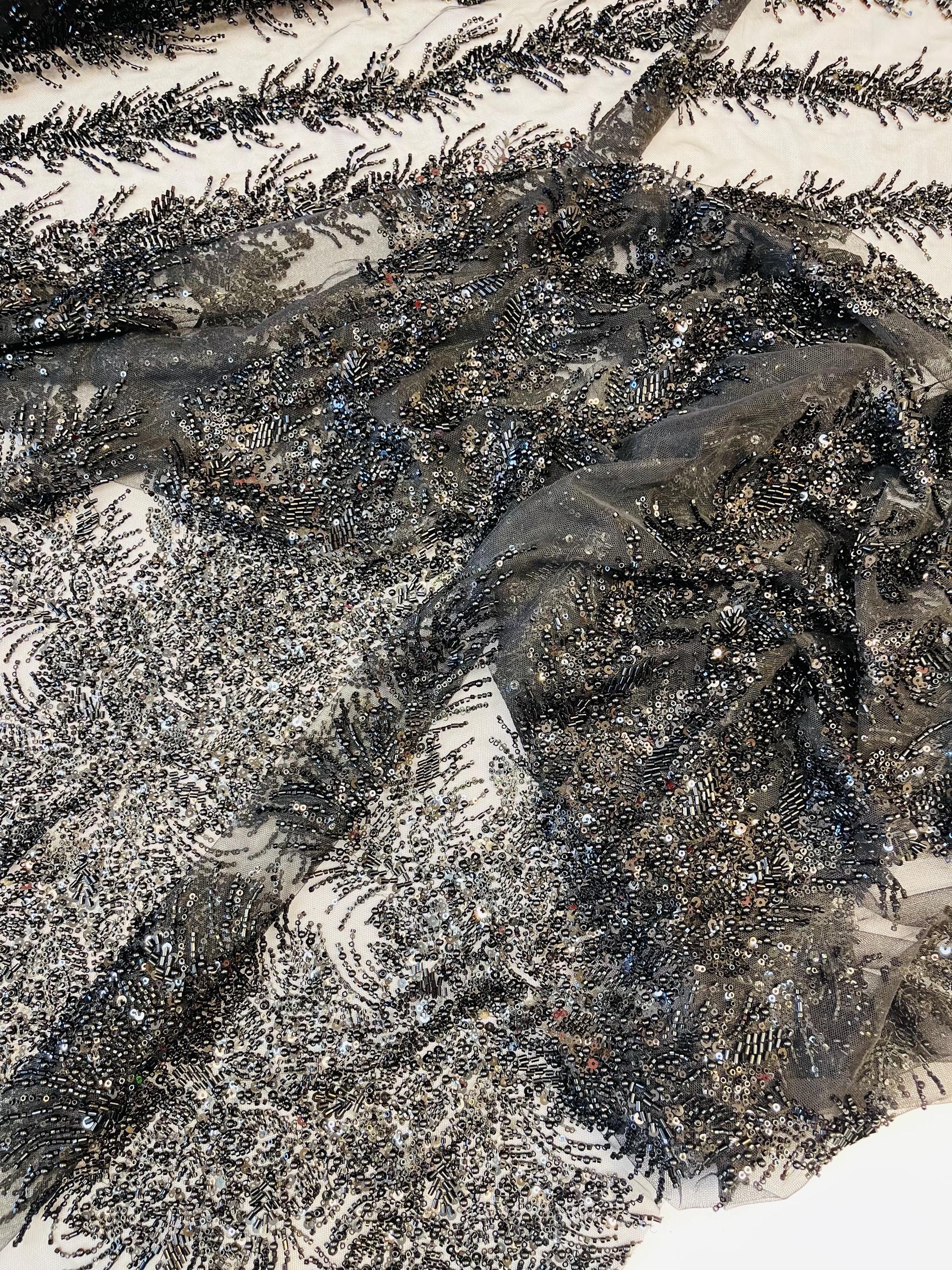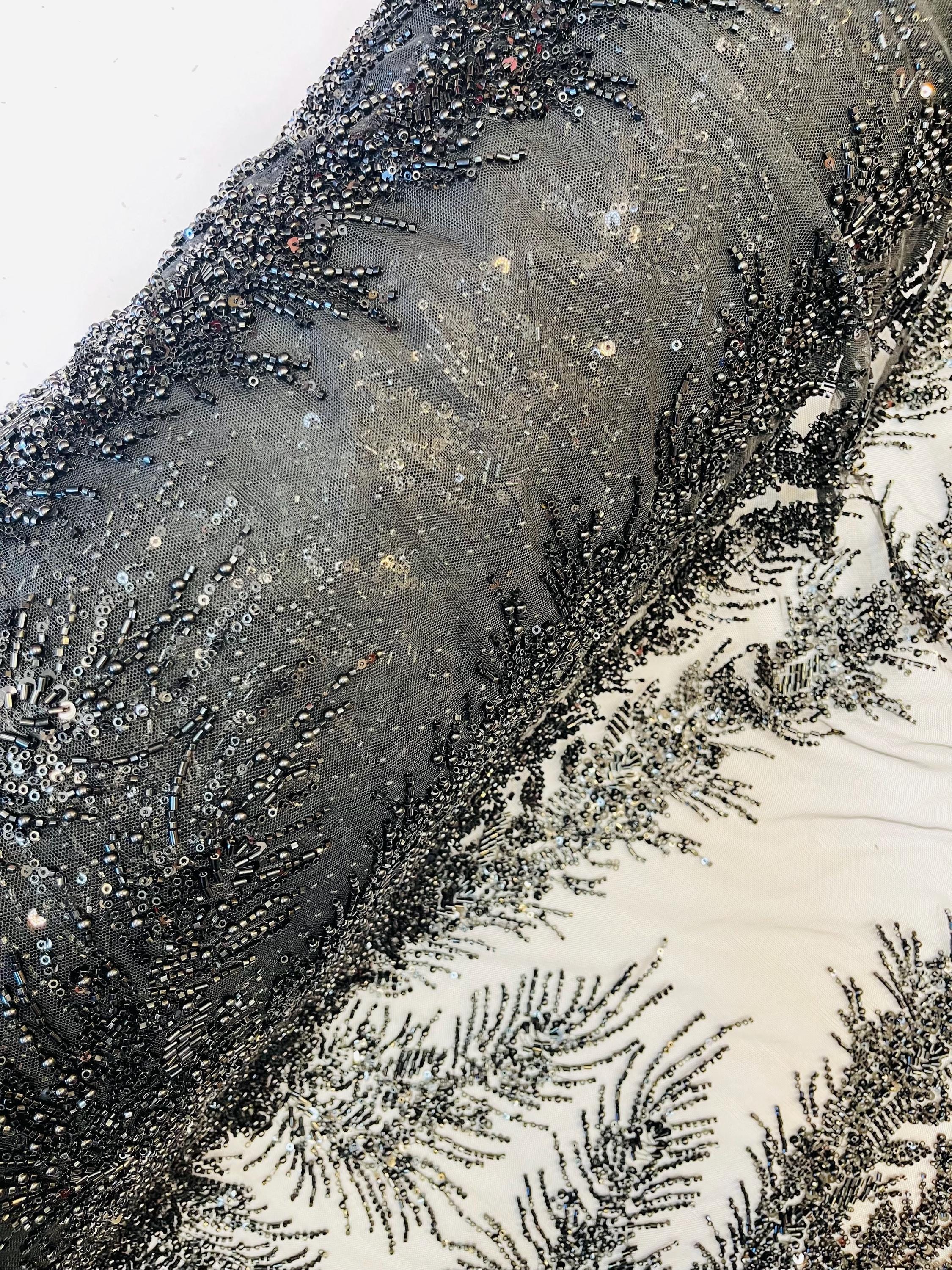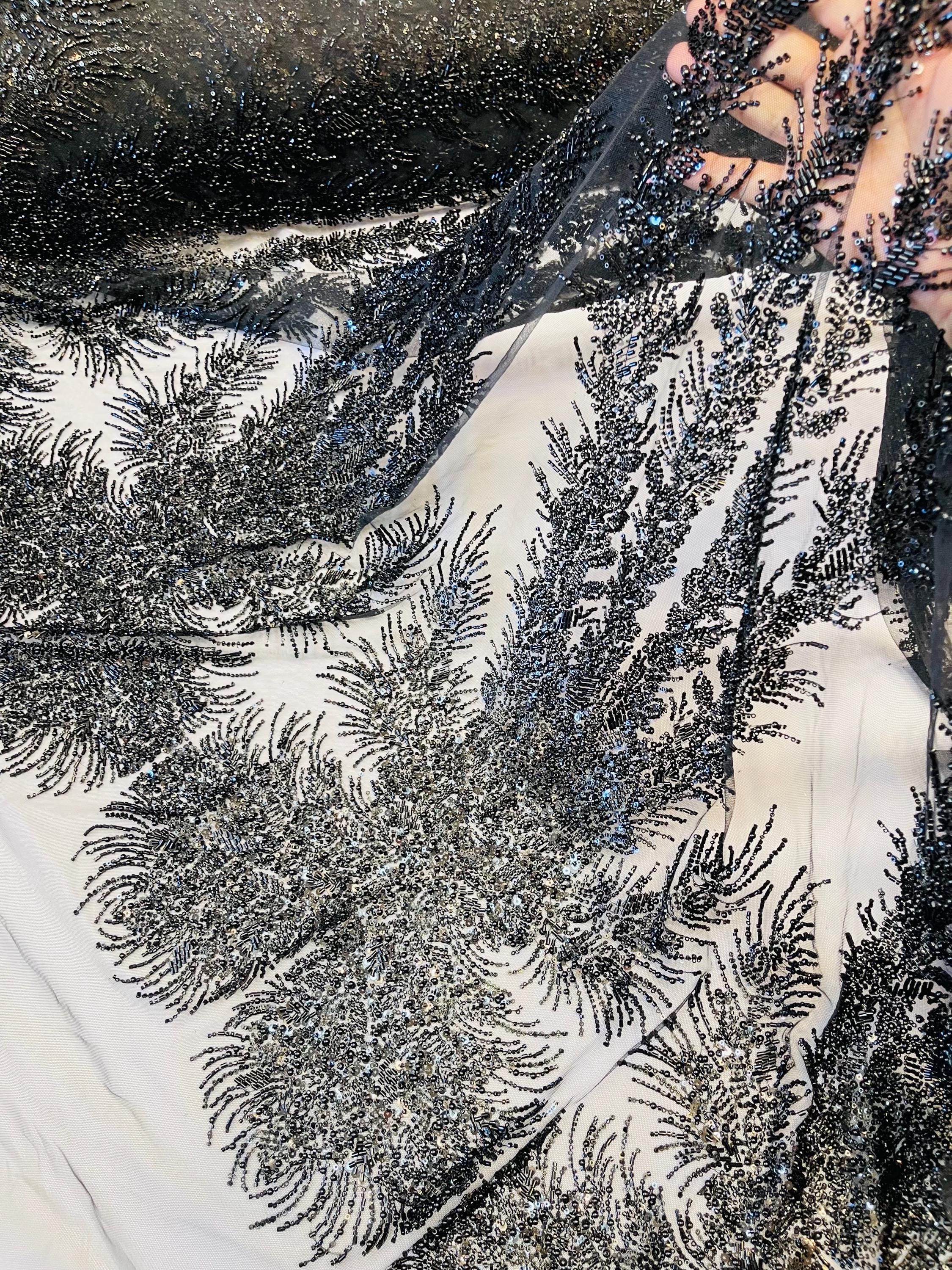 Black Beaded Fabric | Fashion Pattern With Pearls Beads and Sequin, Bridal beaded Prom Dress