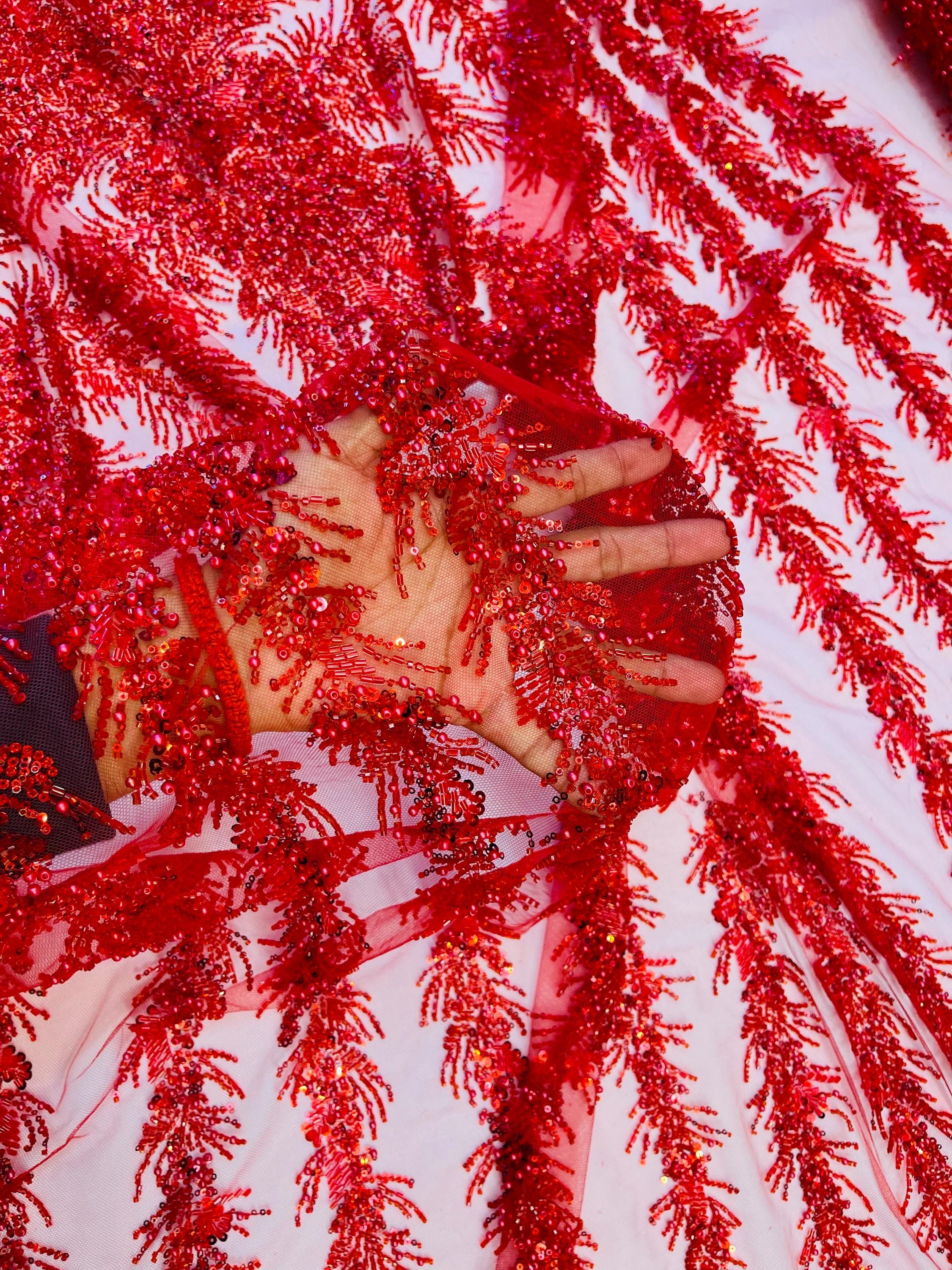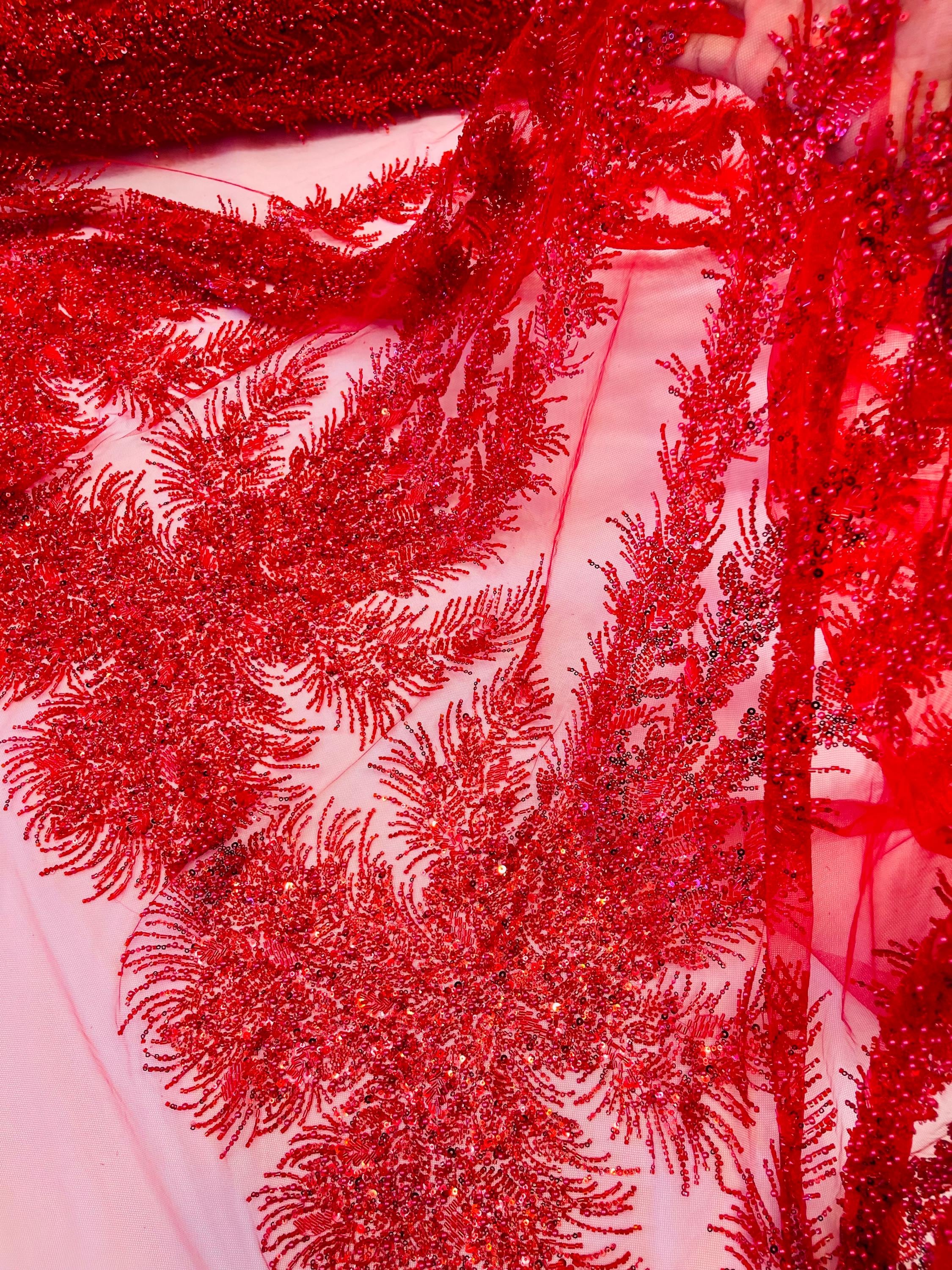 The beautiful design includes embroidered wavy plants patterns with beads across a mesh fabric of great quality. It has a beautiful border on both ends. This lace can be used for dresses, tablecloths, nightgowns, prom gowns, bridesmaid gowns, wedding gowns, table covers/runners, pillows, home /event decorations, and much more.
