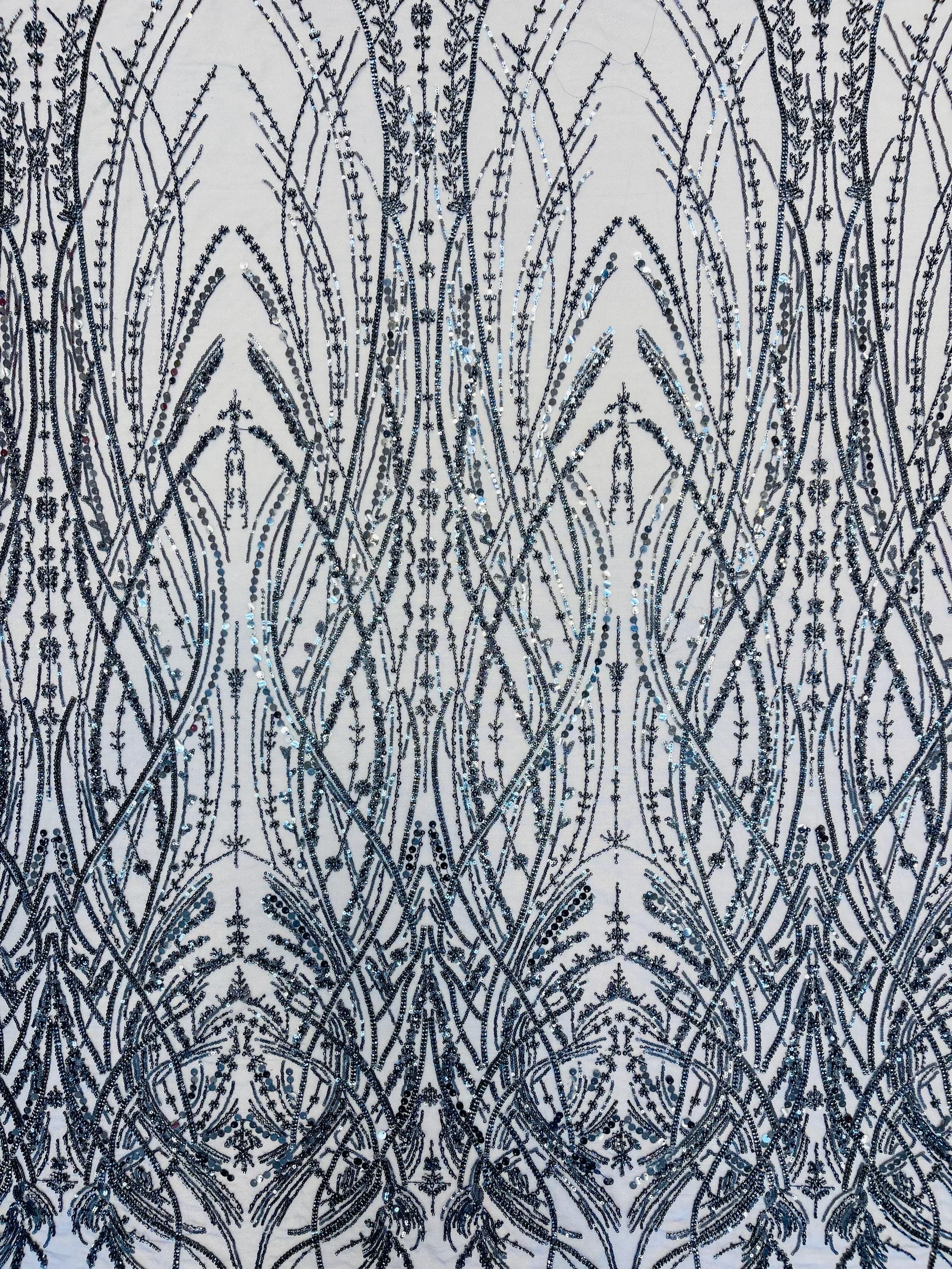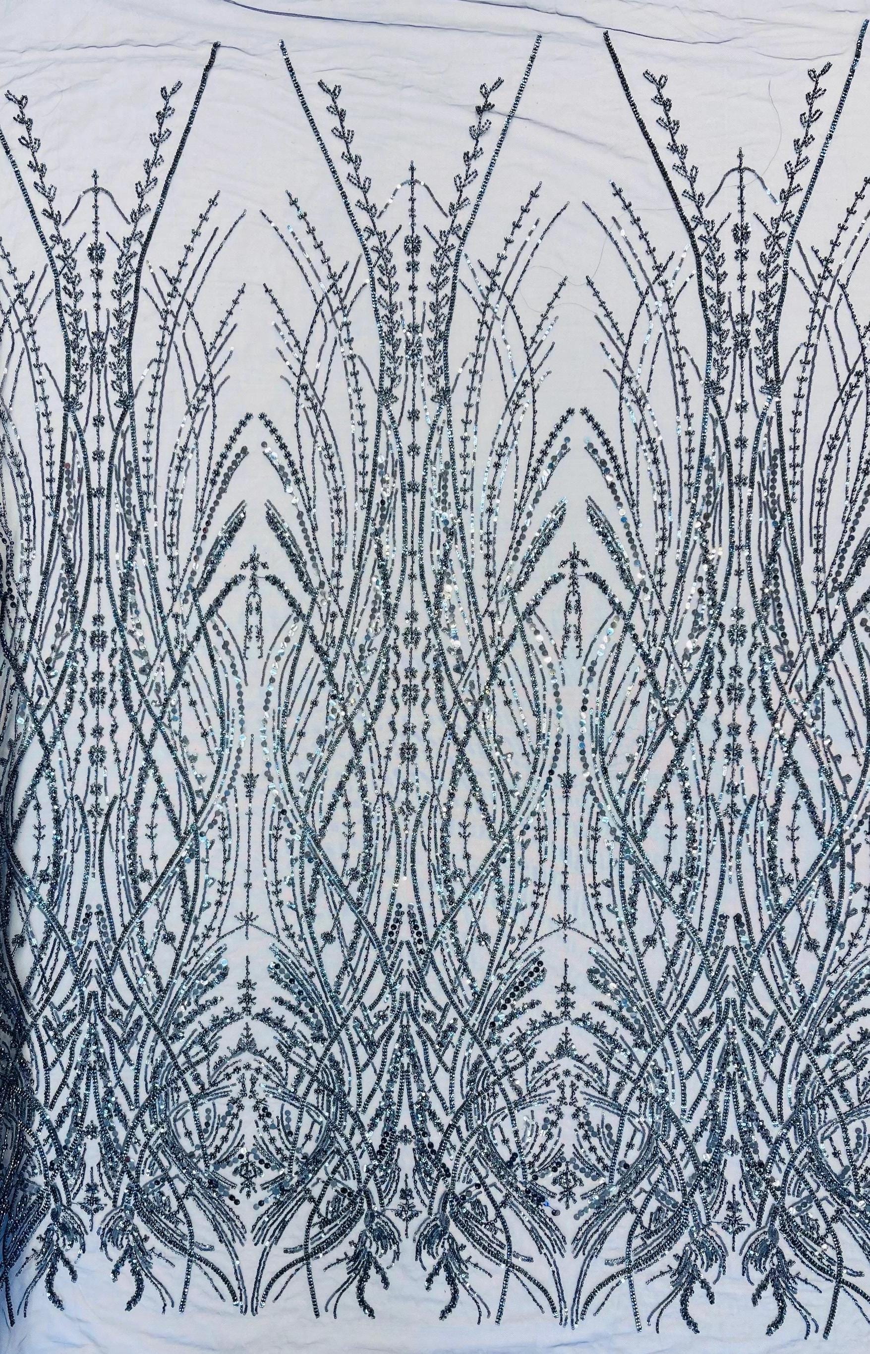 The beautiful design includes embroidered wavy plants patterns with beads across a mesh fabric of great quality. It has a beautiful border on both ends. This lace can be used for dresses, tablecloths, nightgowns, prom gowns, bridesmaid gowns, wedding gowns, table covers/runners, pillows, home /event decorations, and much more.