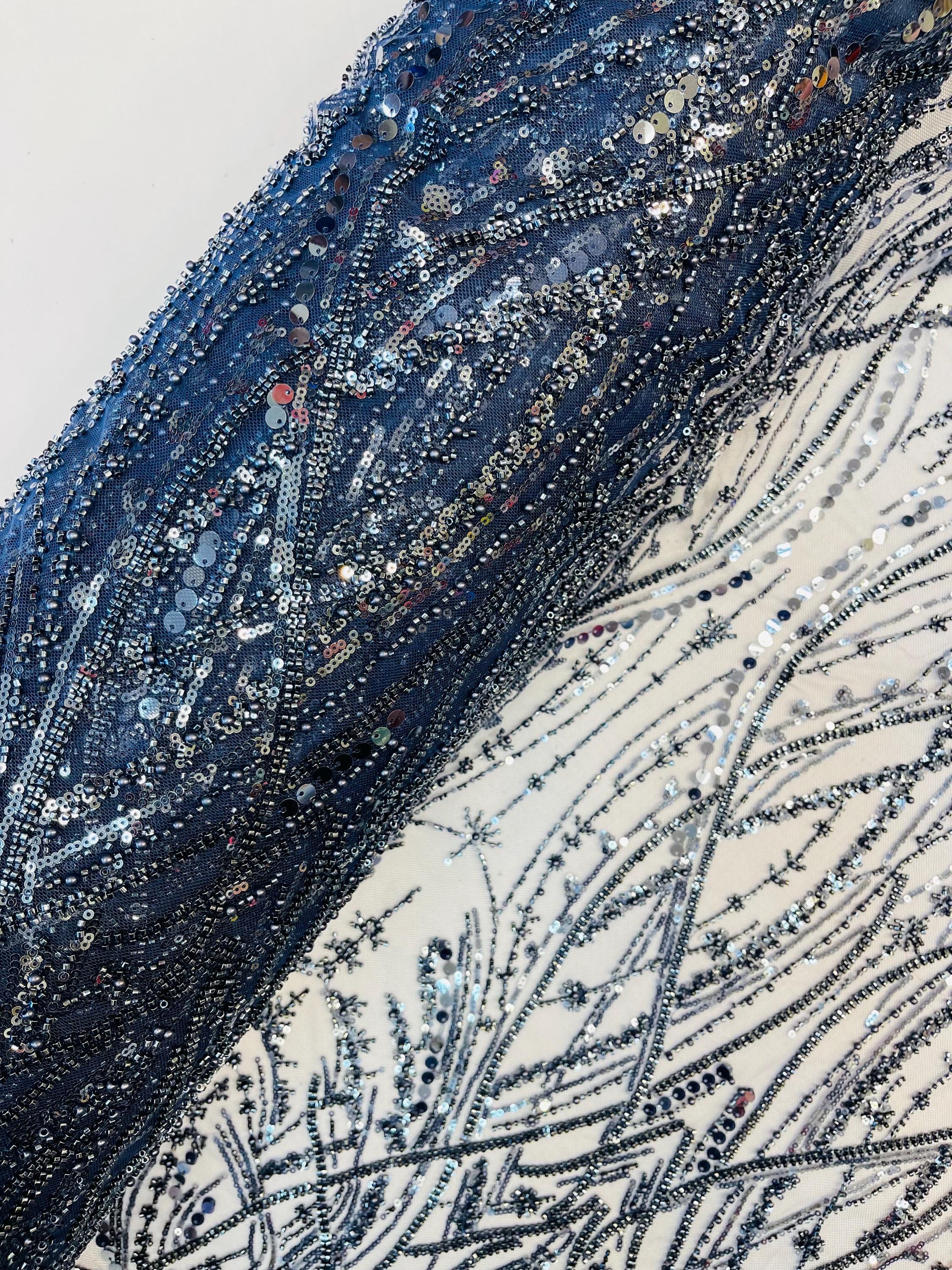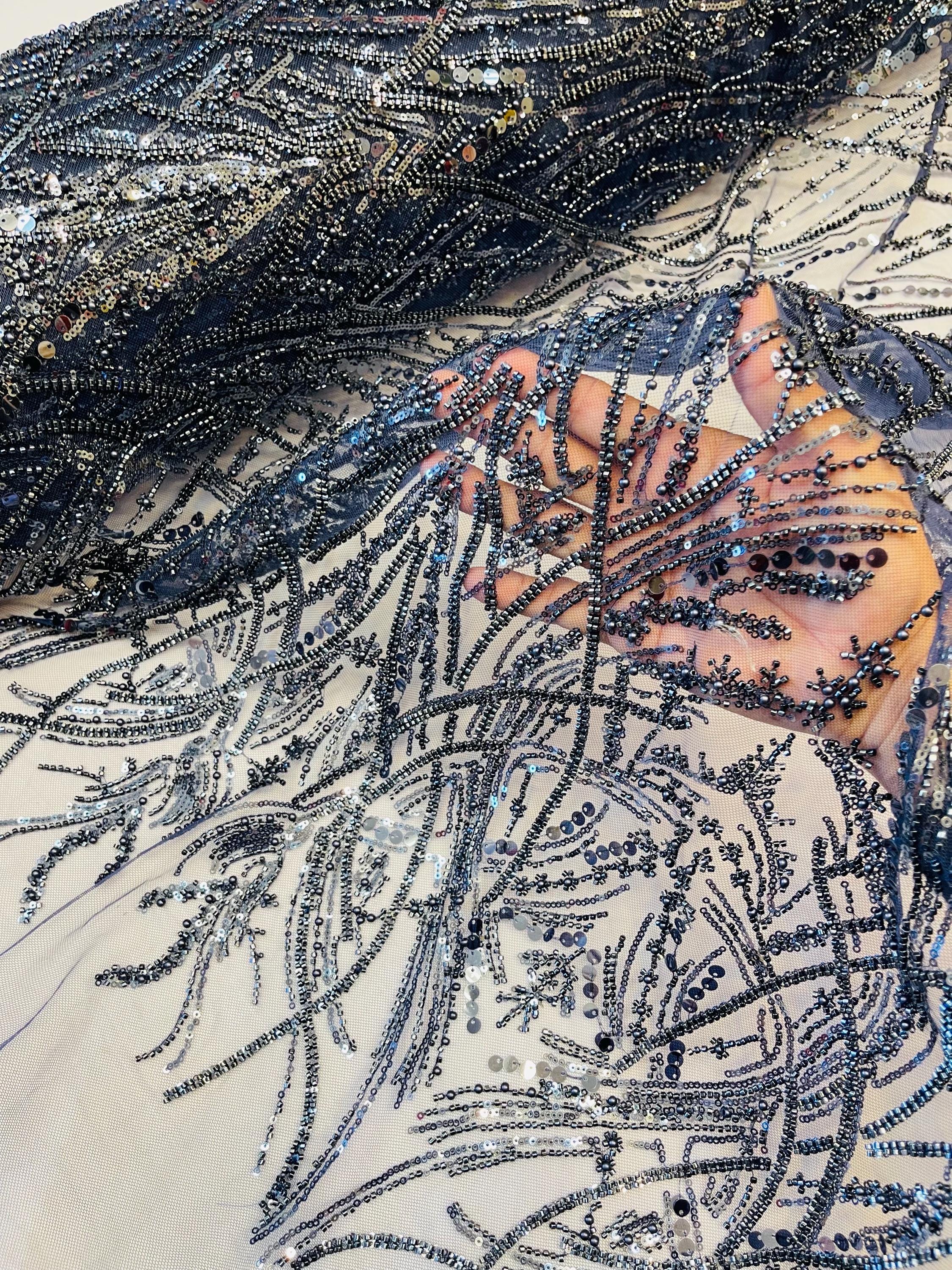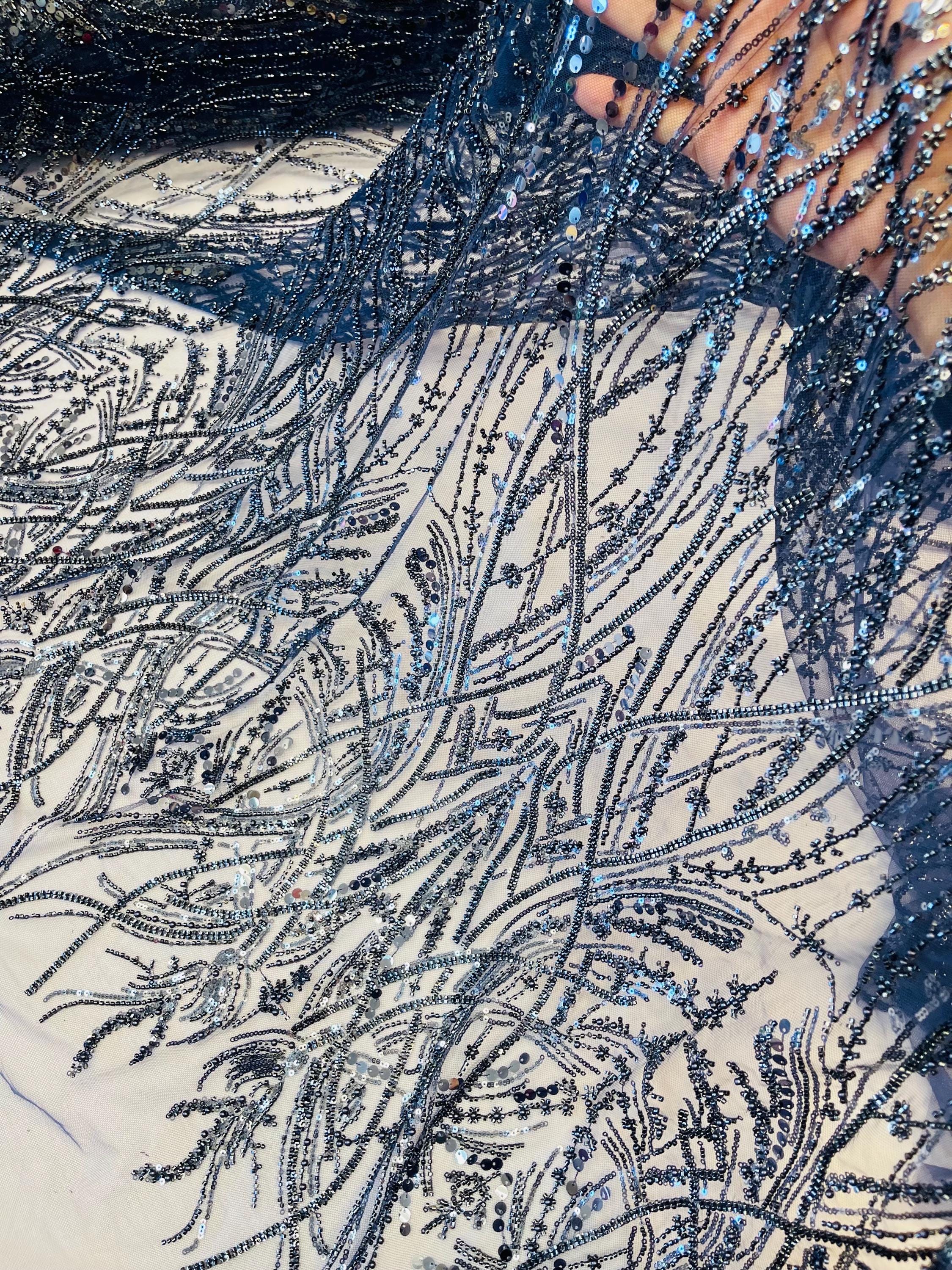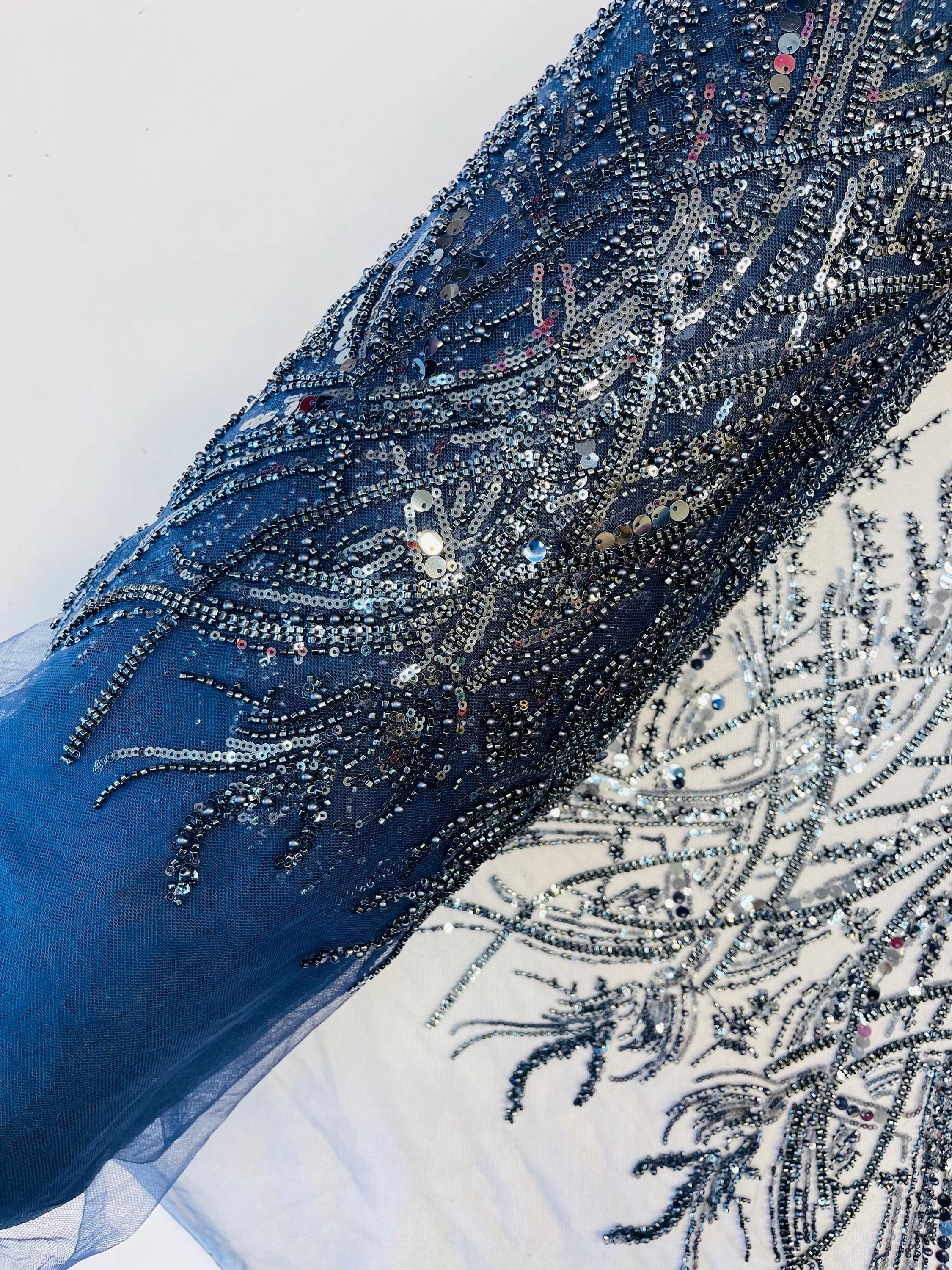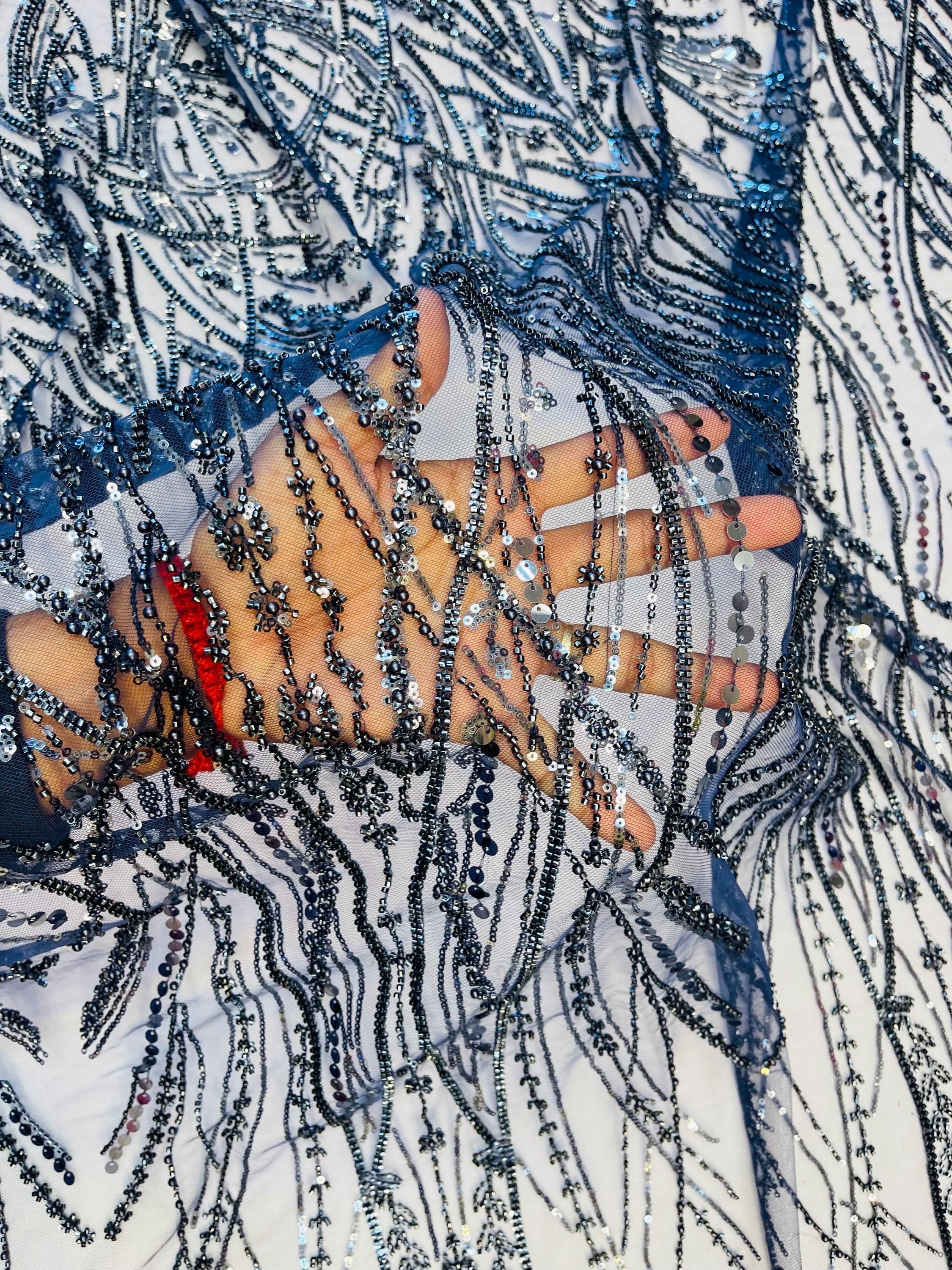 Navy Blue Beaded Lace Fabric | Beads & Sequin Embroidery By The Yard
