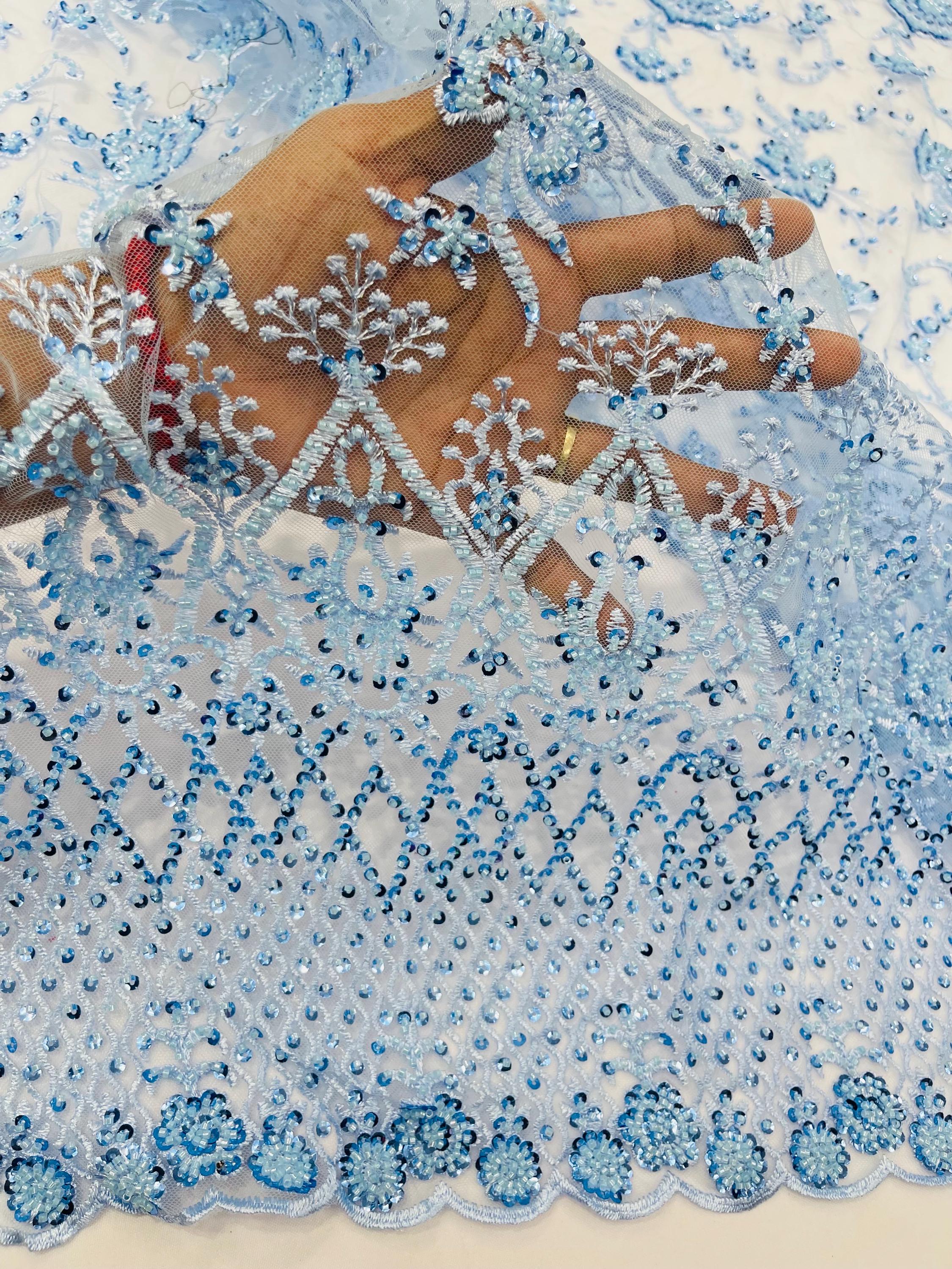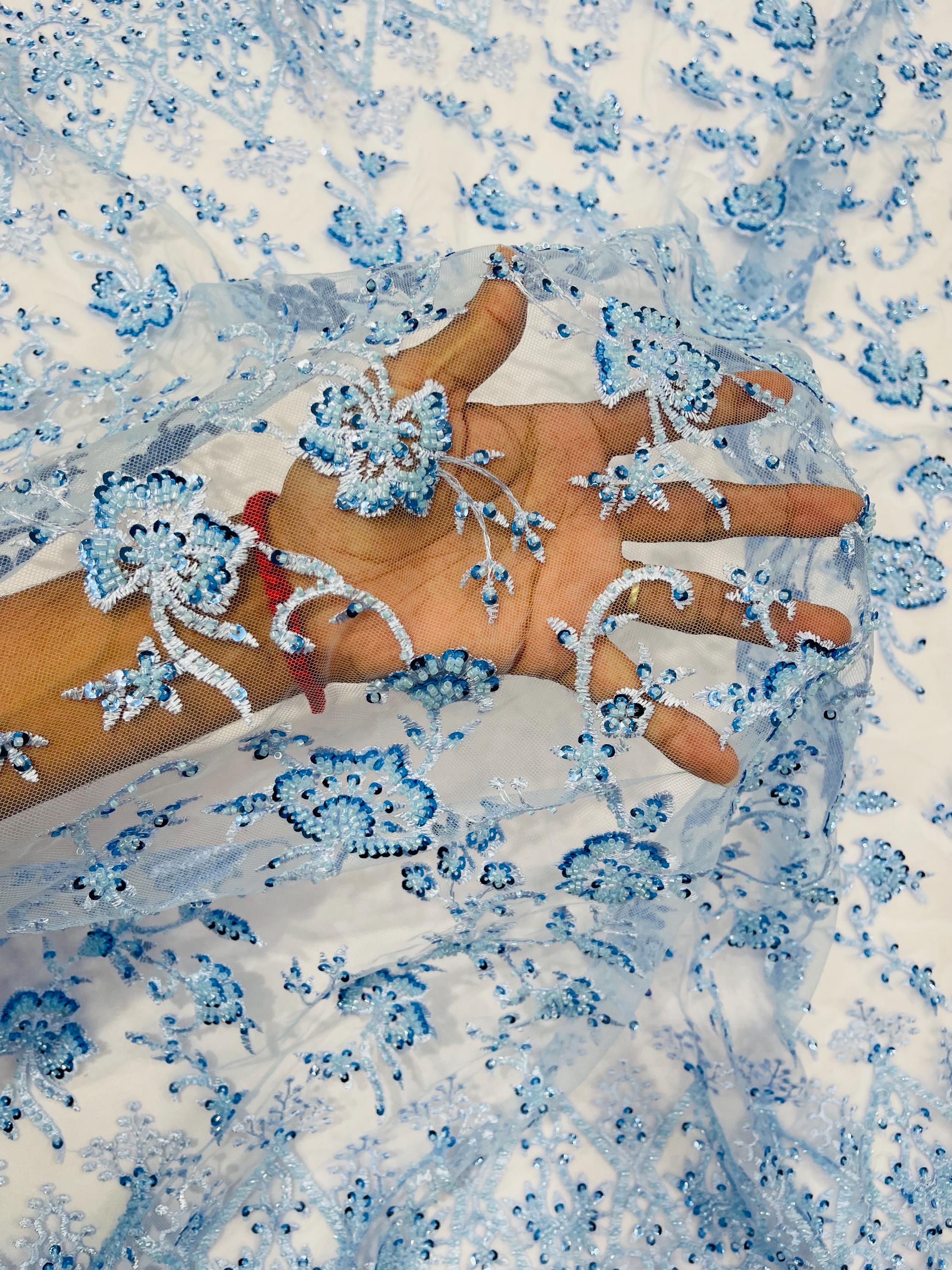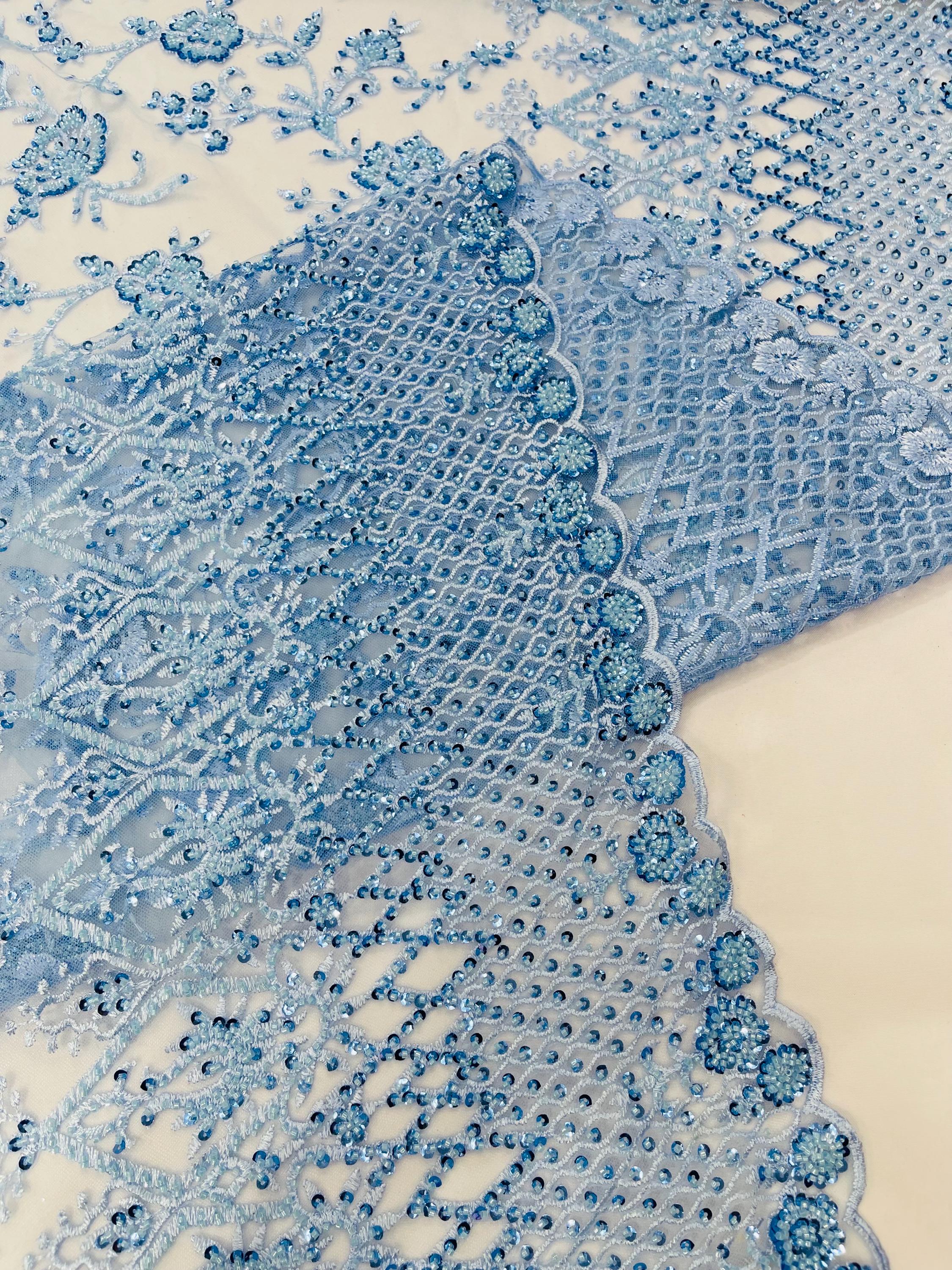 Baby Blue Beaded Sequined Lace Fabric: Embroidered Mesh, Bridal Wedding Dress