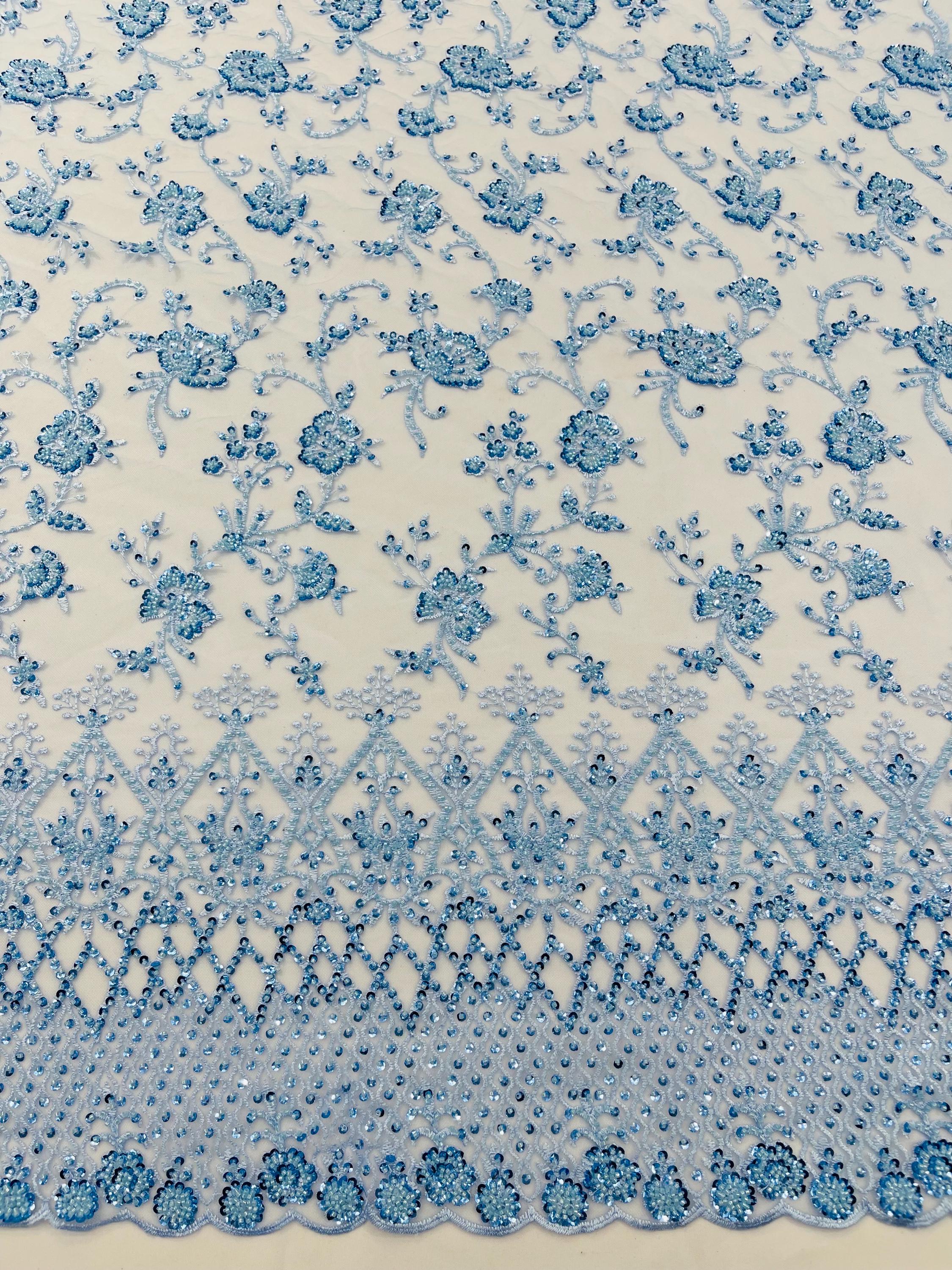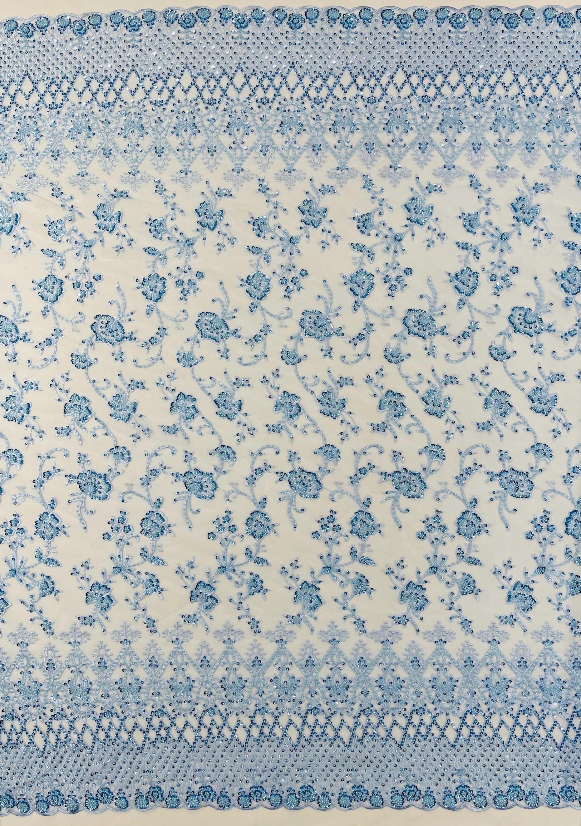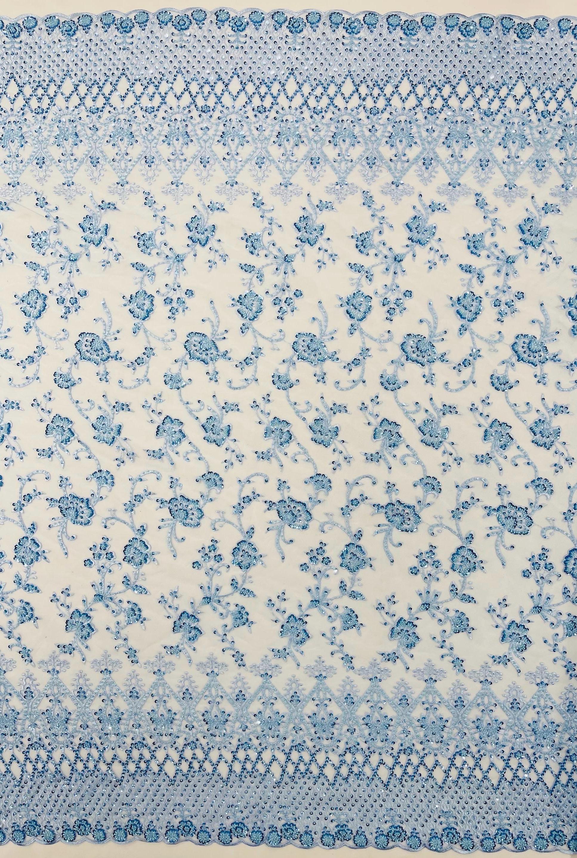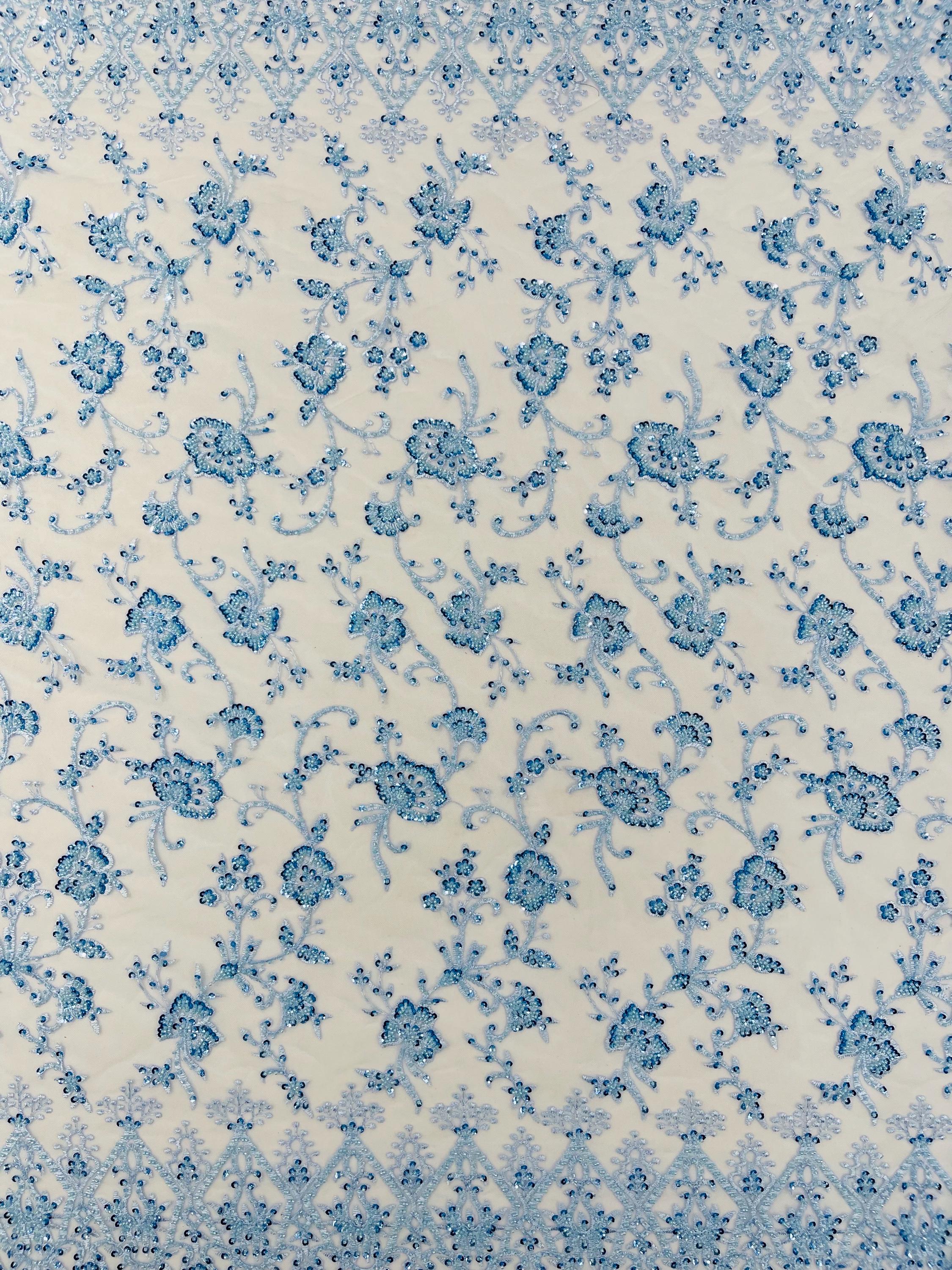 Baby Blue Beaded Sequined Lace Fabric: Embroidered Mesh, Bridal Wedding Dress