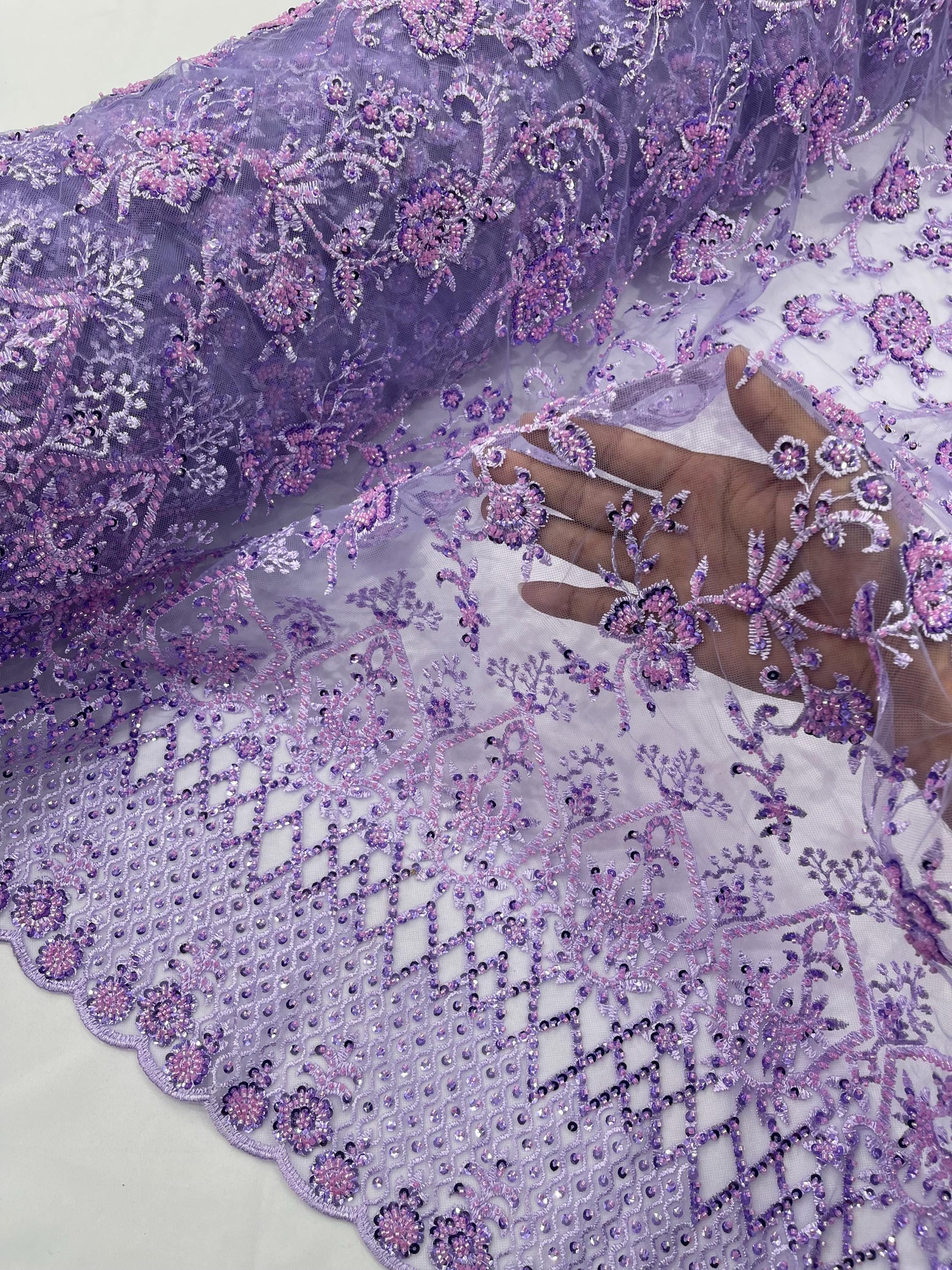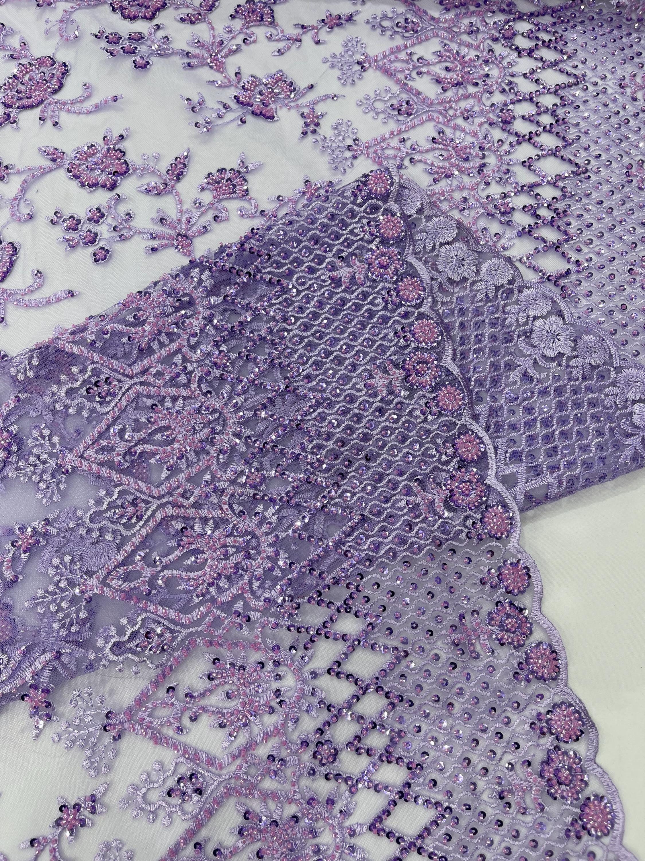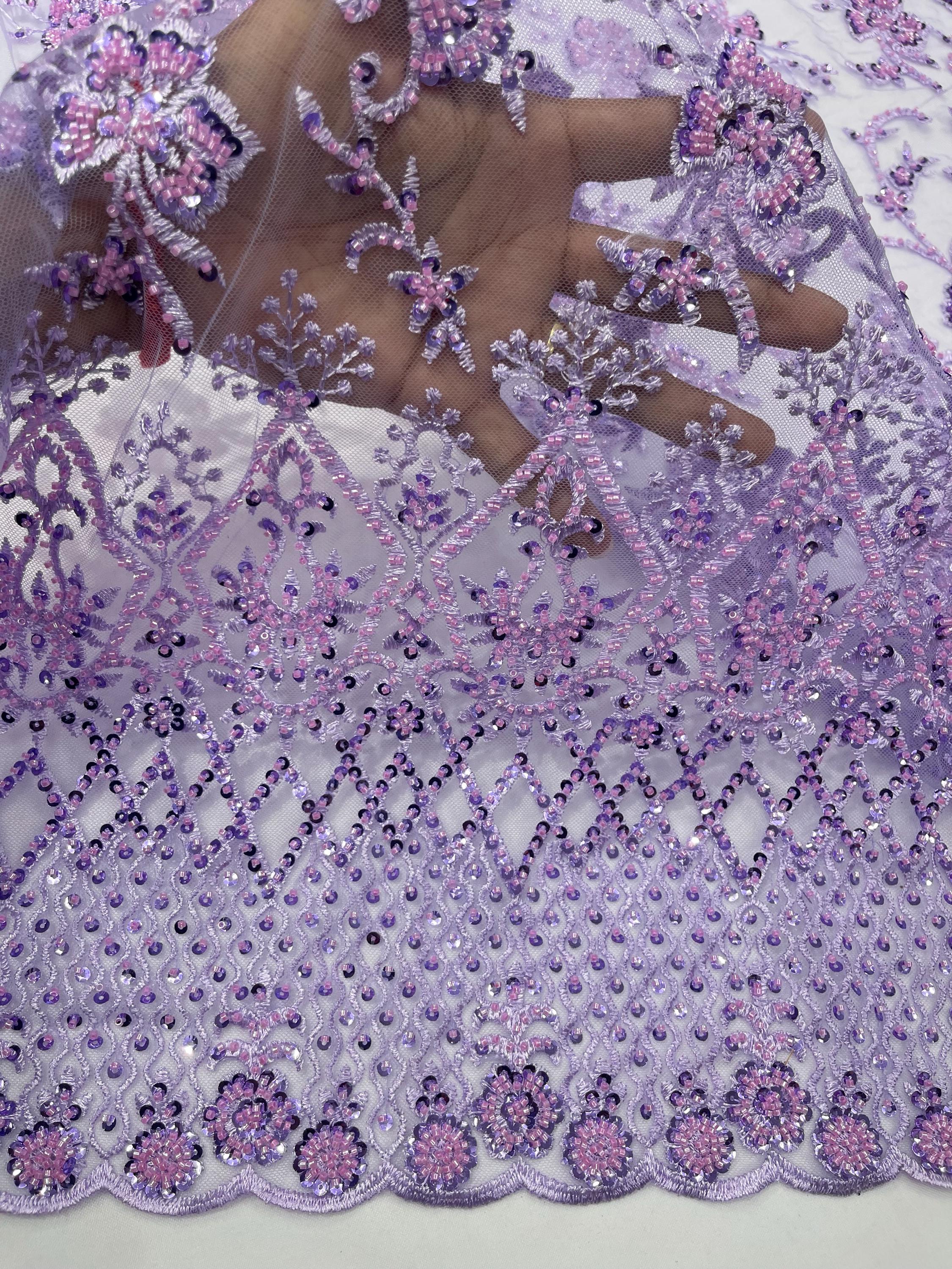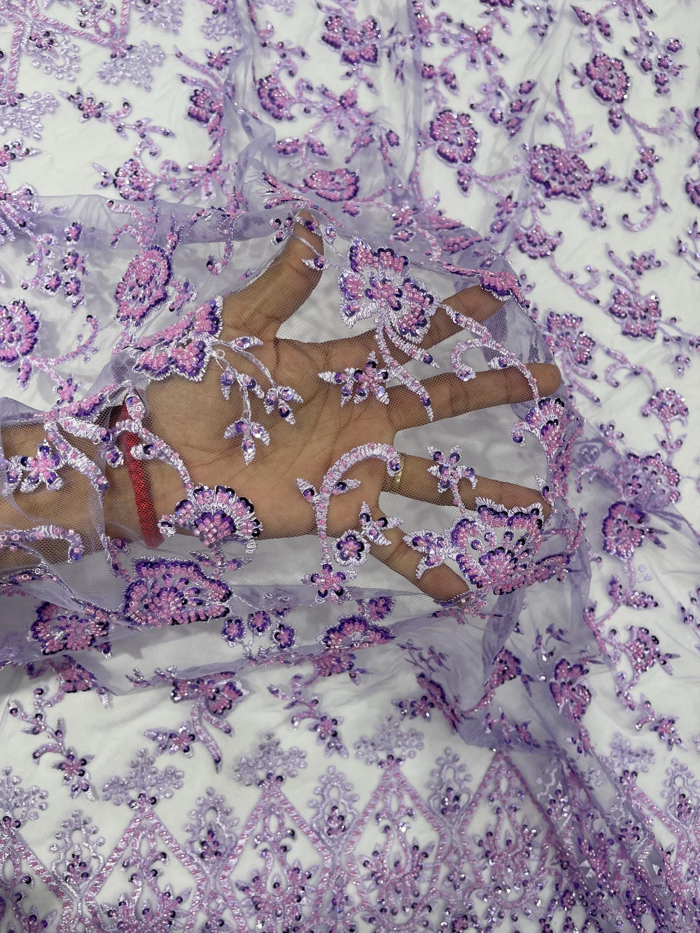 Lilac Beaded Sequined Lace Fabric: Embroidered Mesh, Bridal Wedding Dress