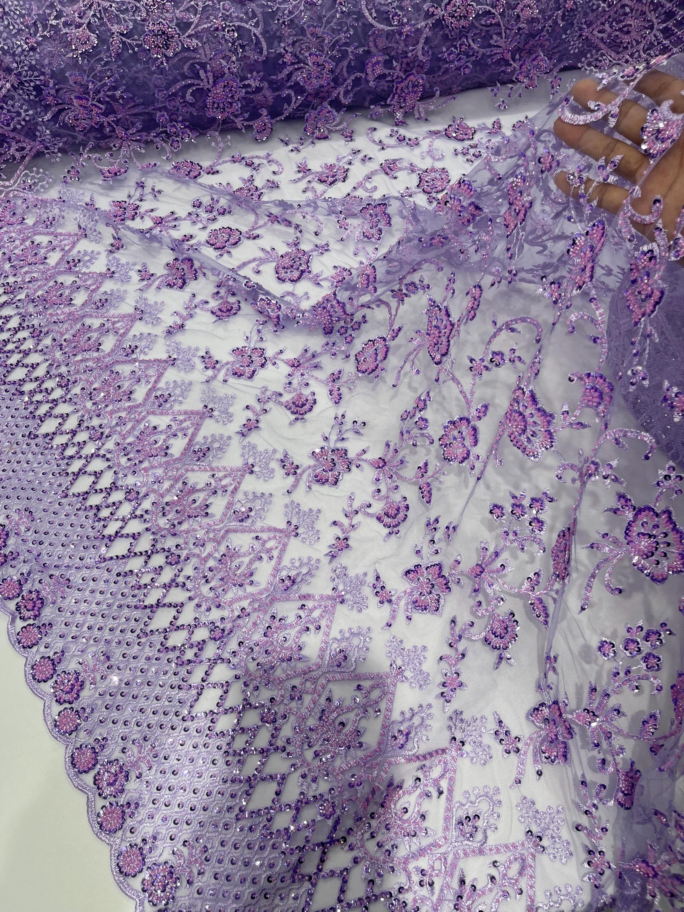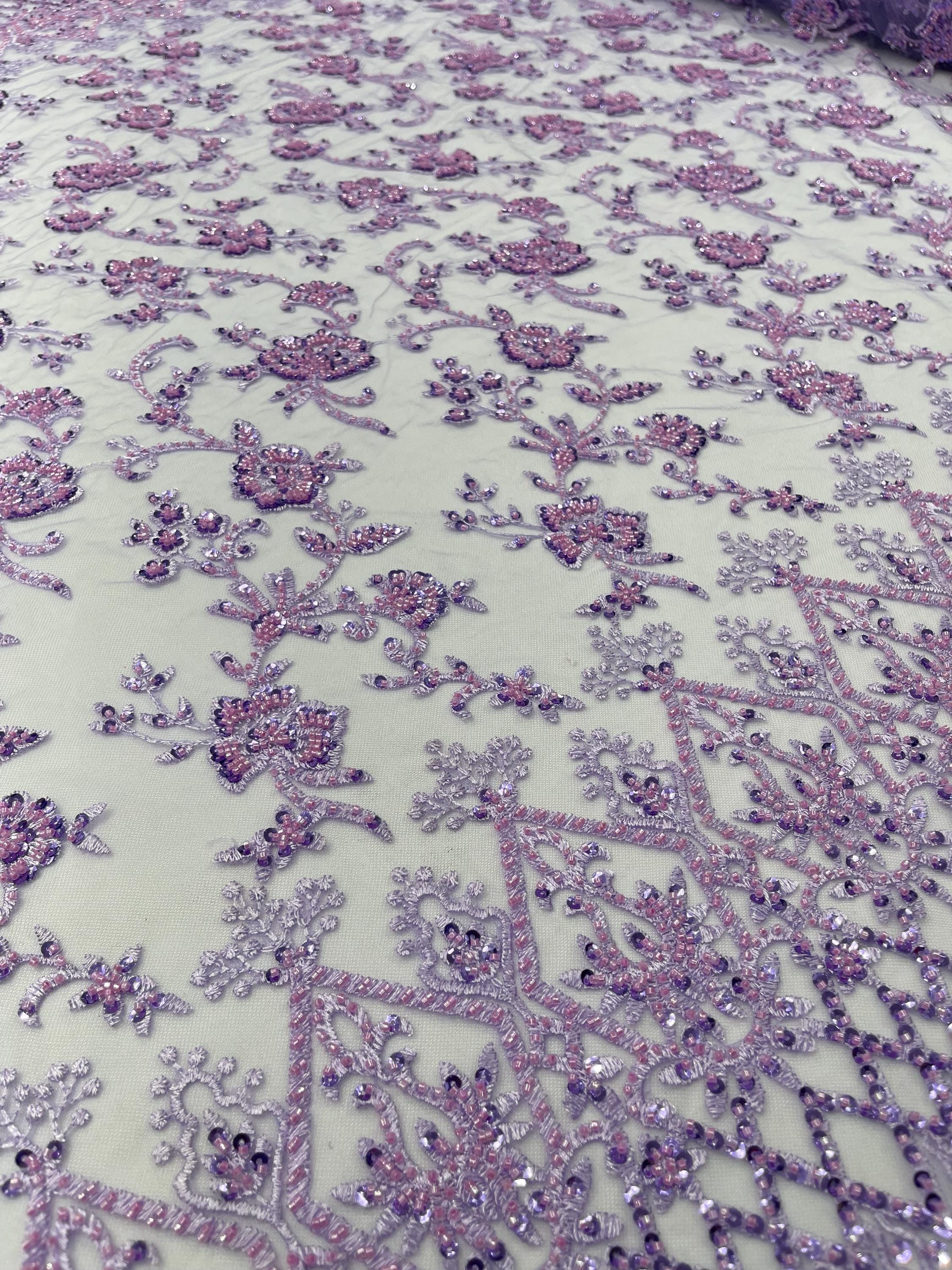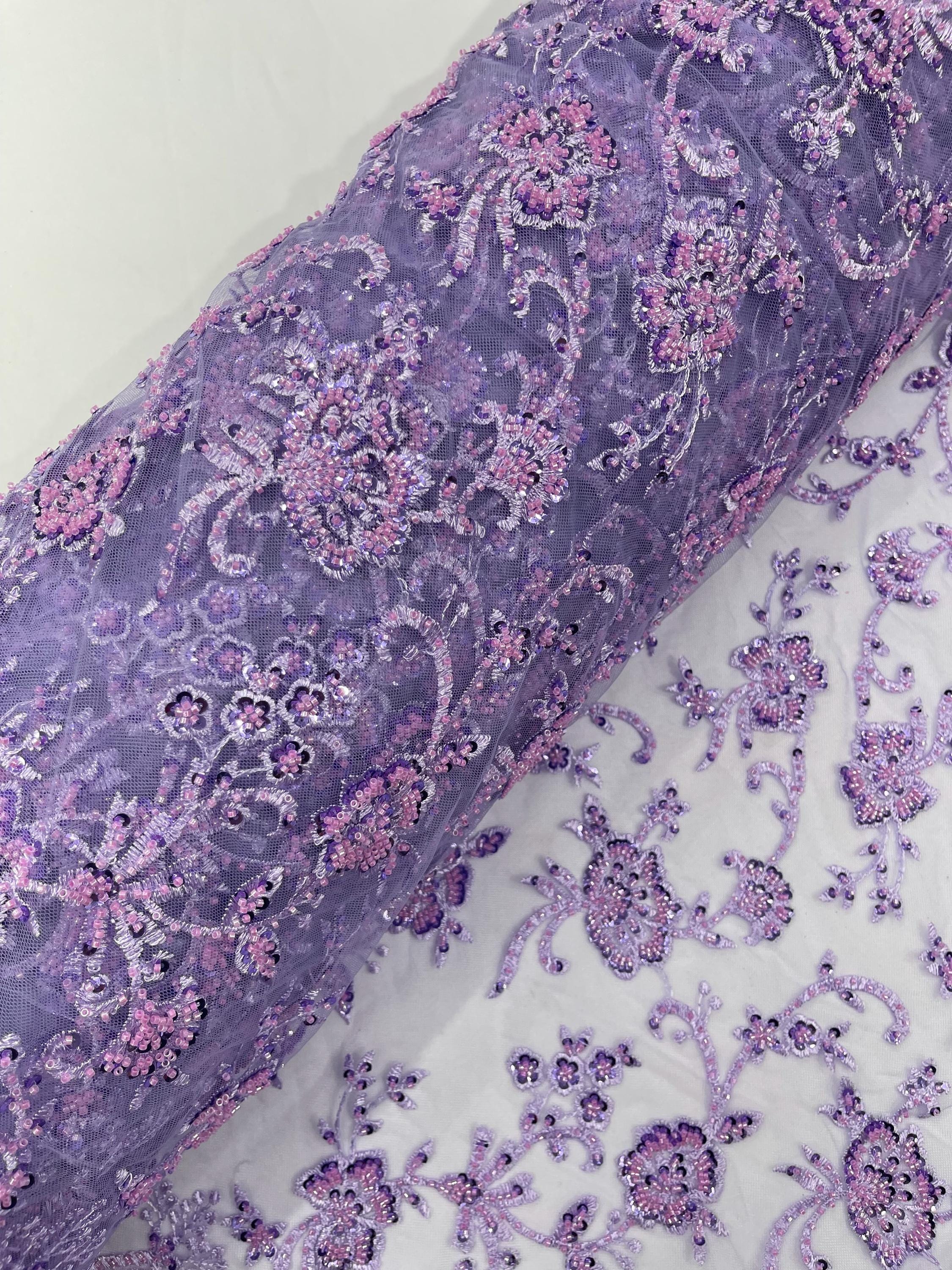 Lilac Beaded Sequined Lace Fabric: Embroidered Mesh, Bridal Wedding Dress