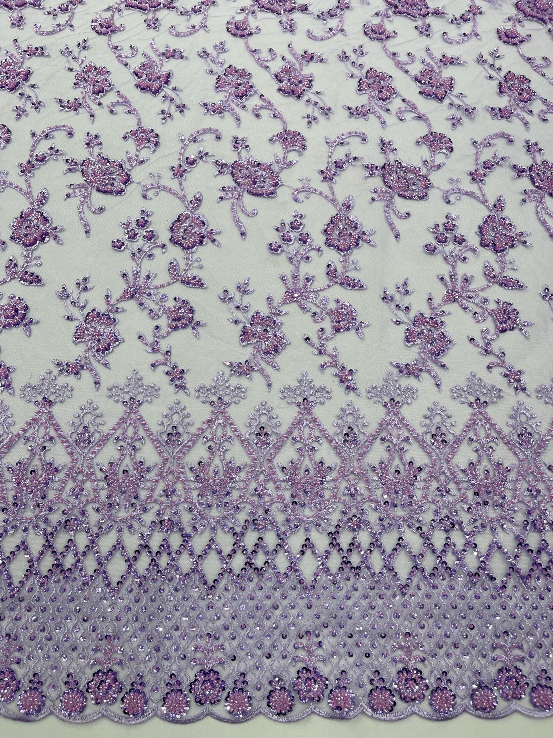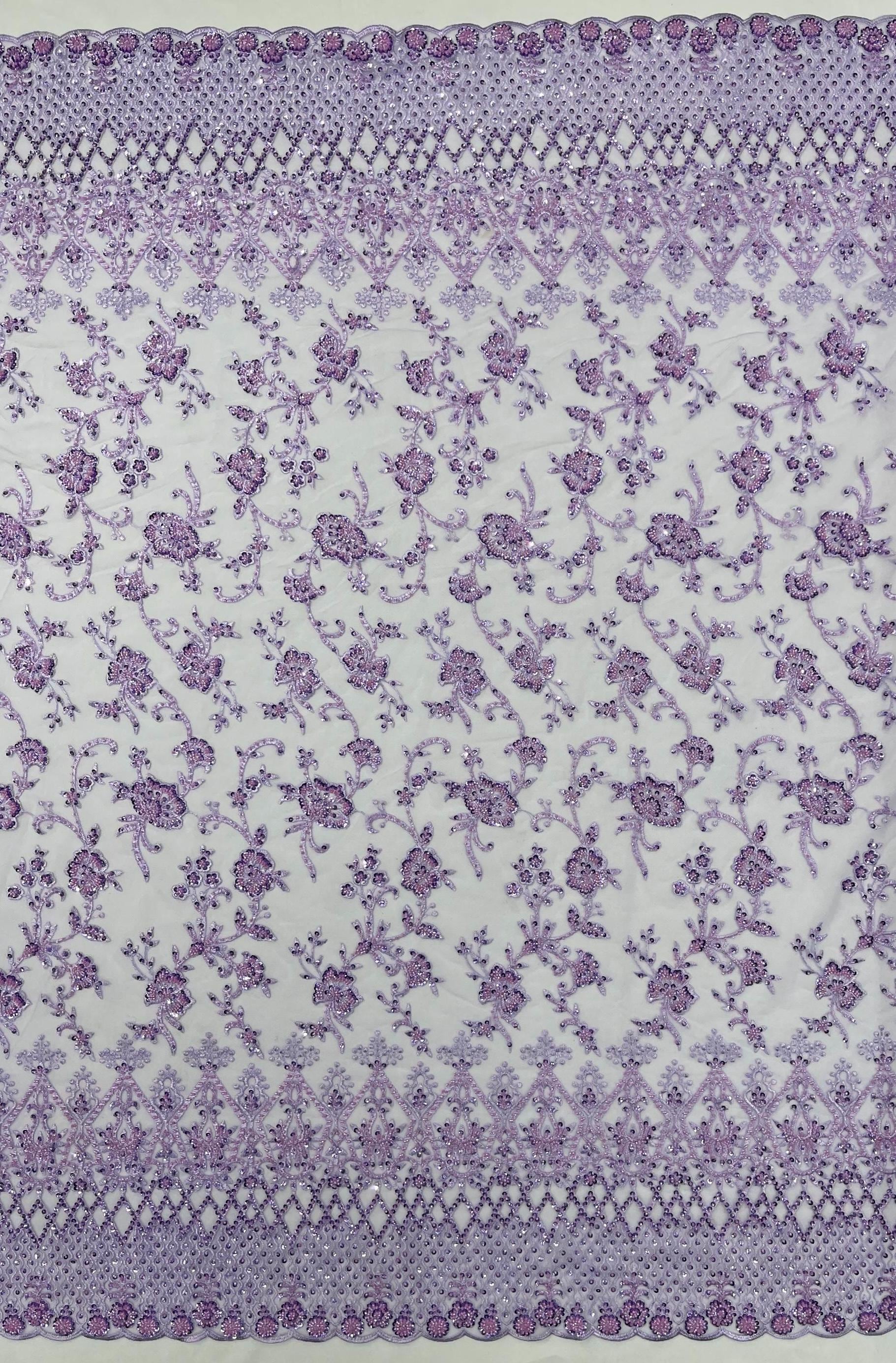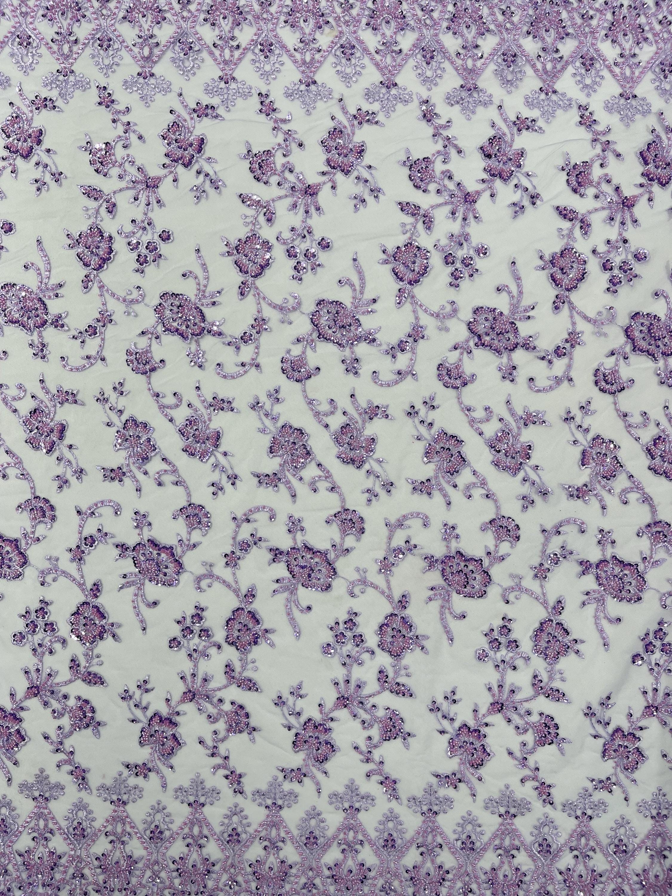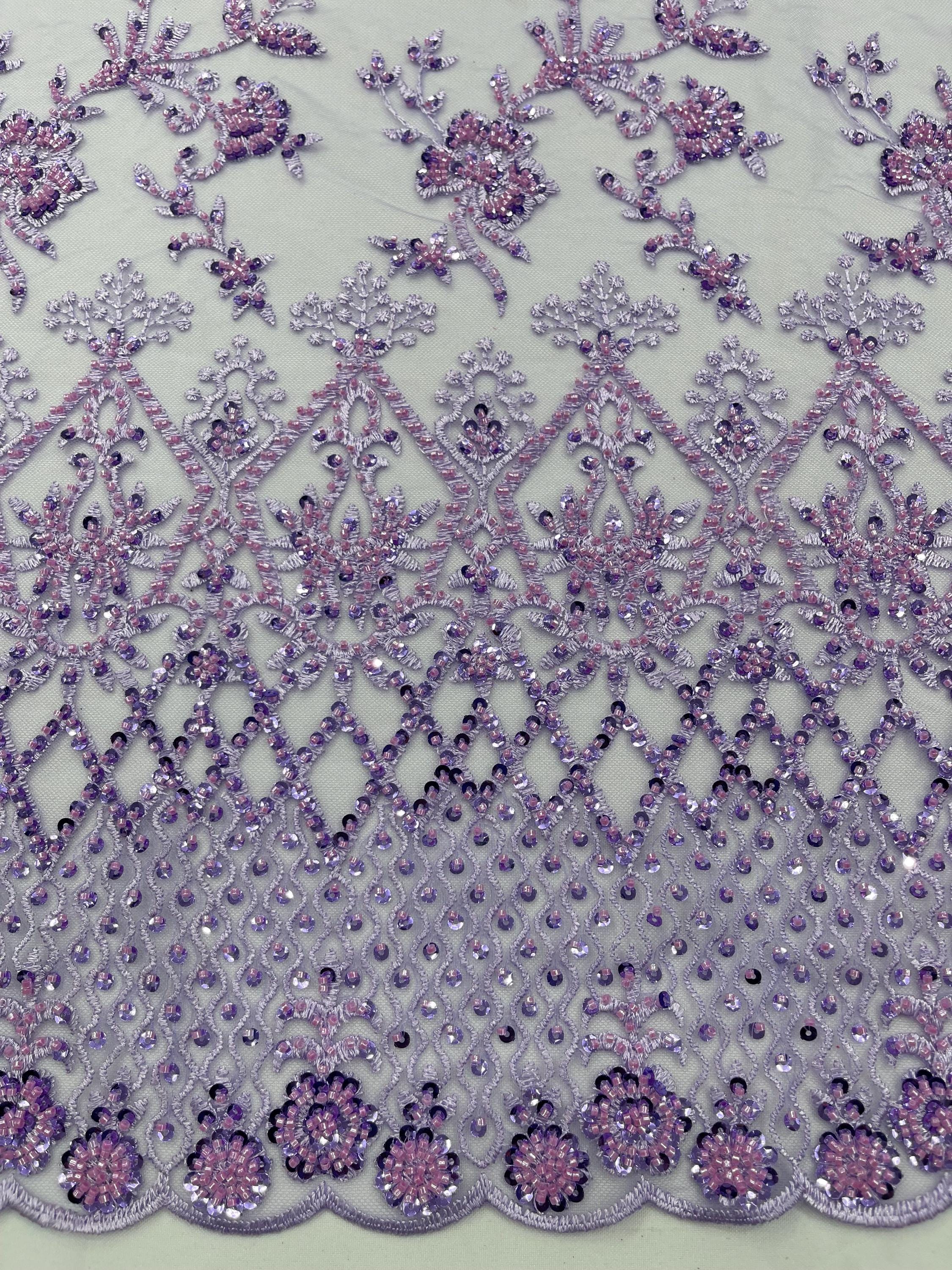 Lilac Beaded Sequined Lace Fabric: Embroidered Mesh, Bridal Wedding Dress
