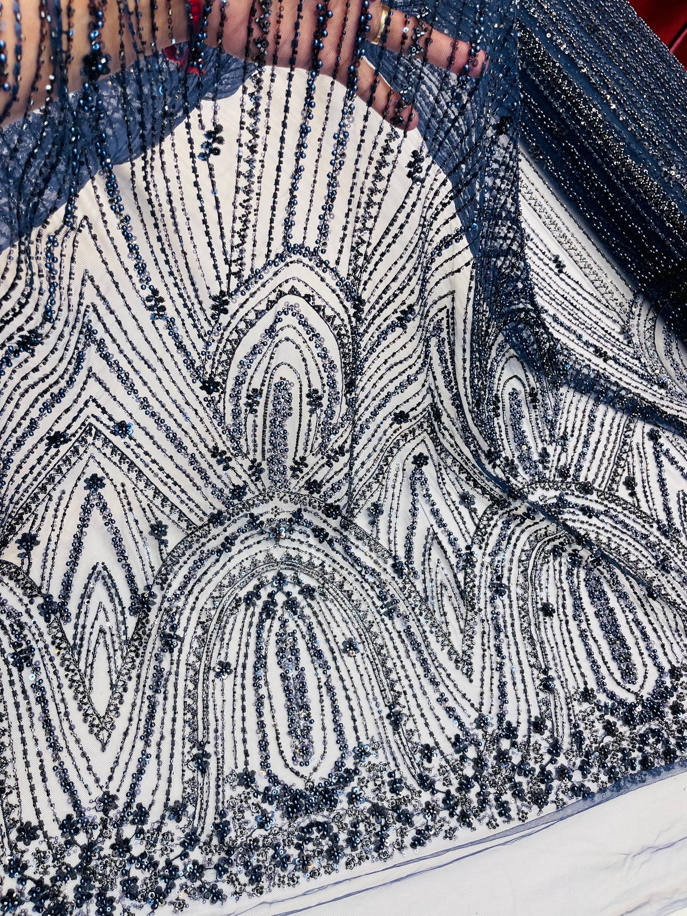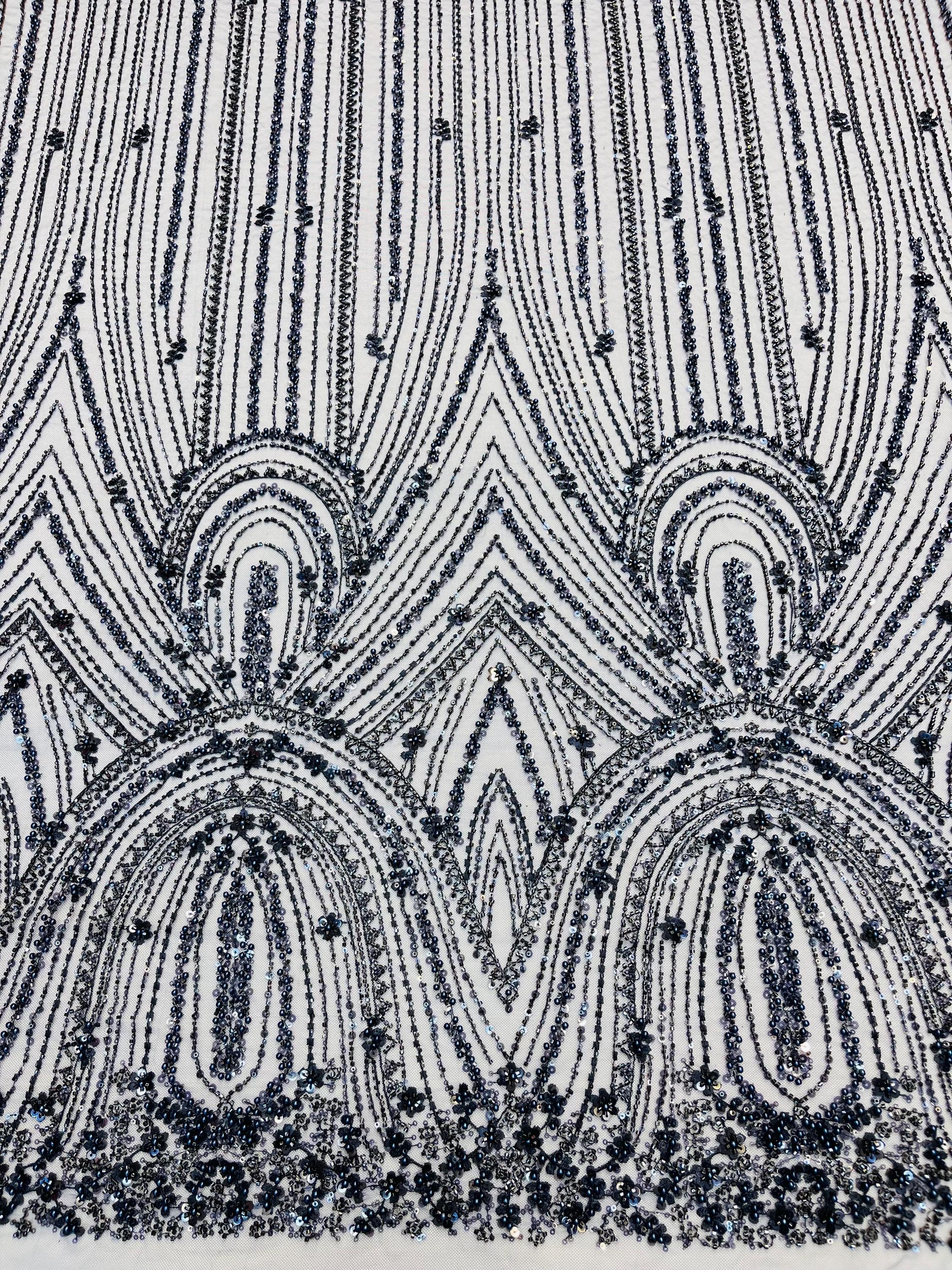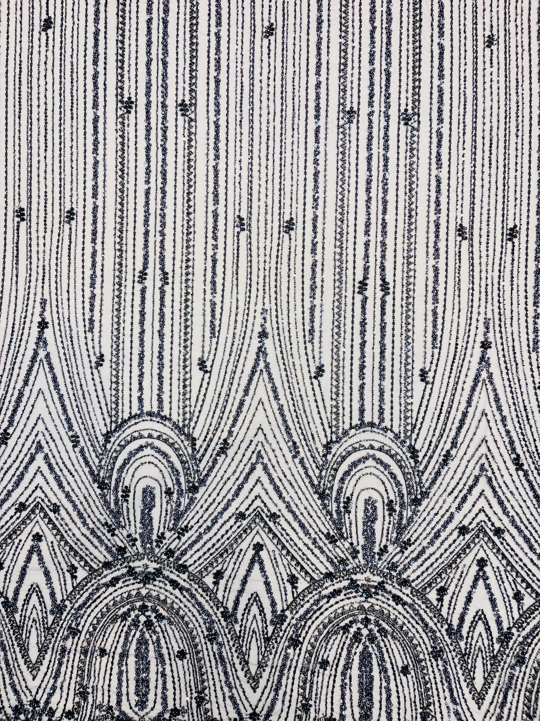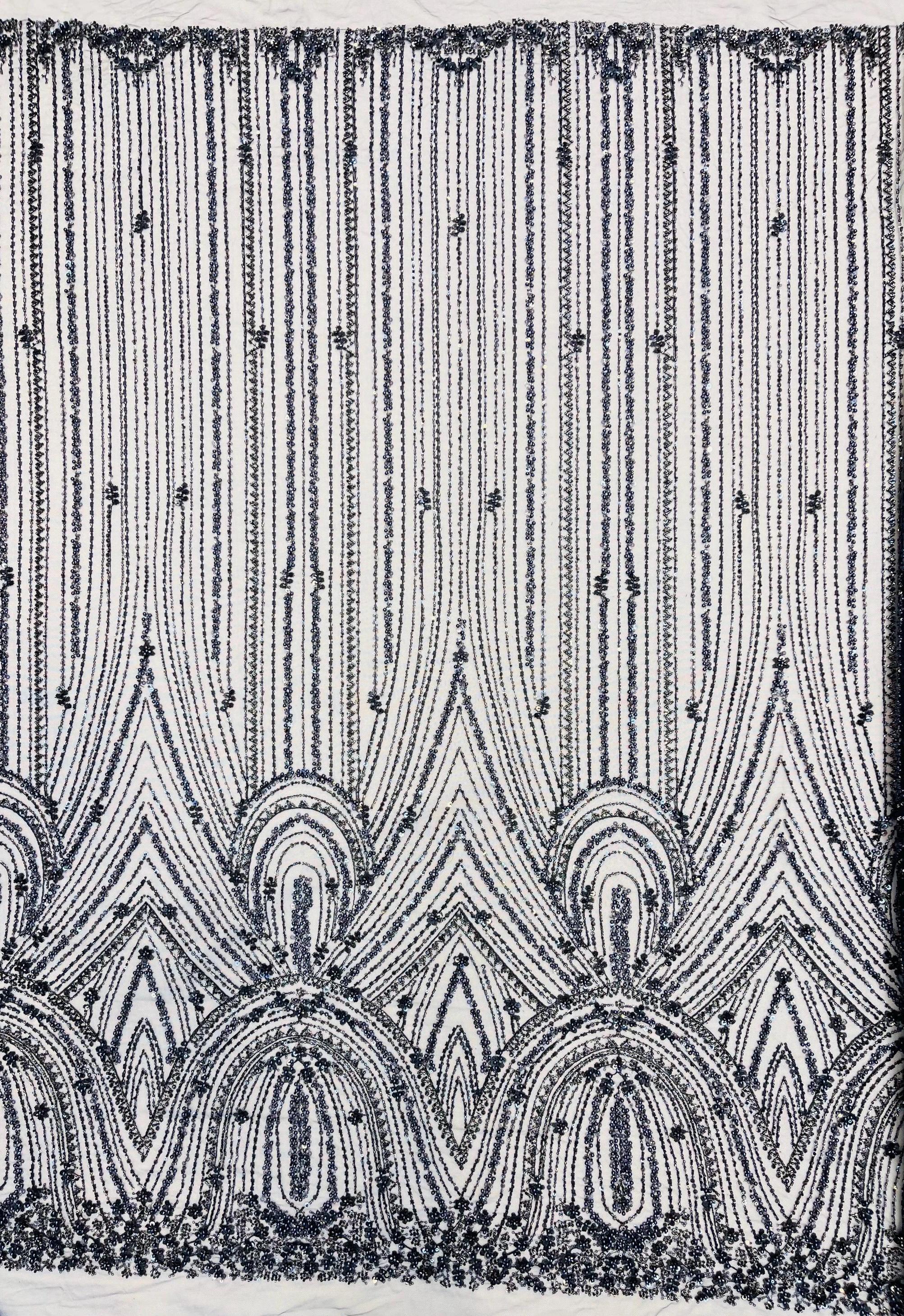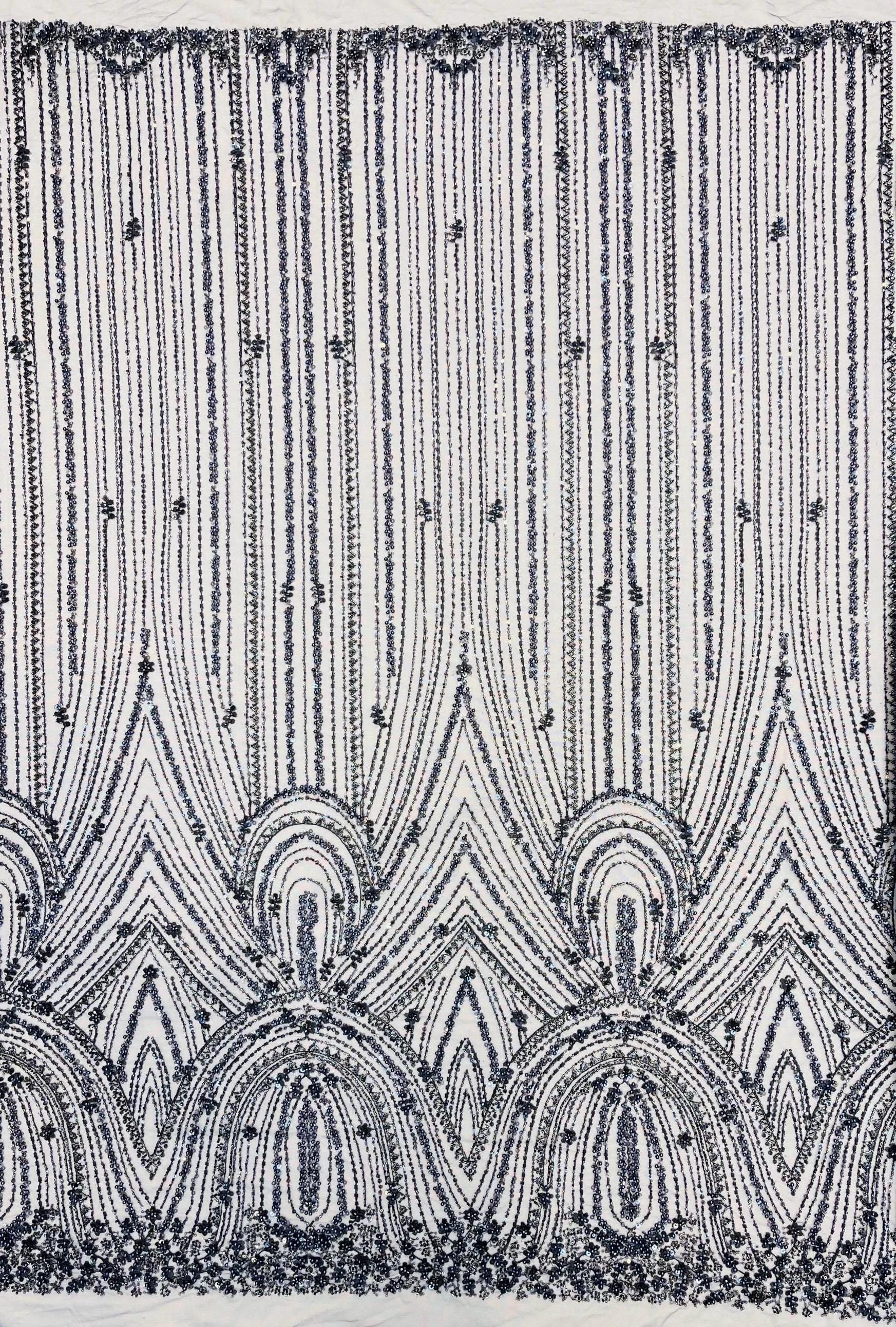 The beautiful design includes embroidered wavy plants patterns with beads across a mesh fabric of great quality. It has a beautiful border on both ends. This lace can be used for dresses, tablecloths, nightgowns, prom gowns, bridesmaid gowns, wedding gowns, table covers/runners, pillows, home /event decorations, and much more.