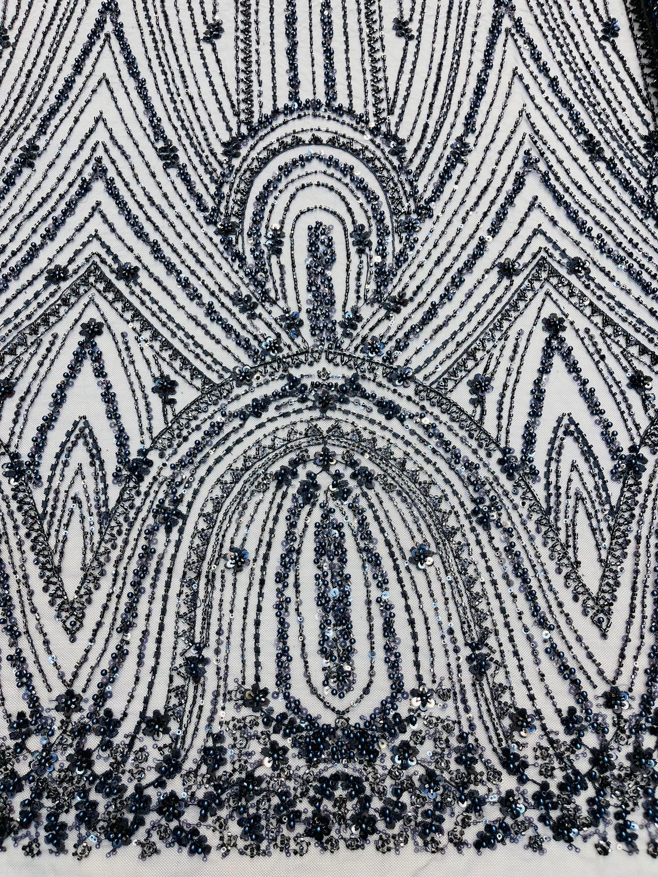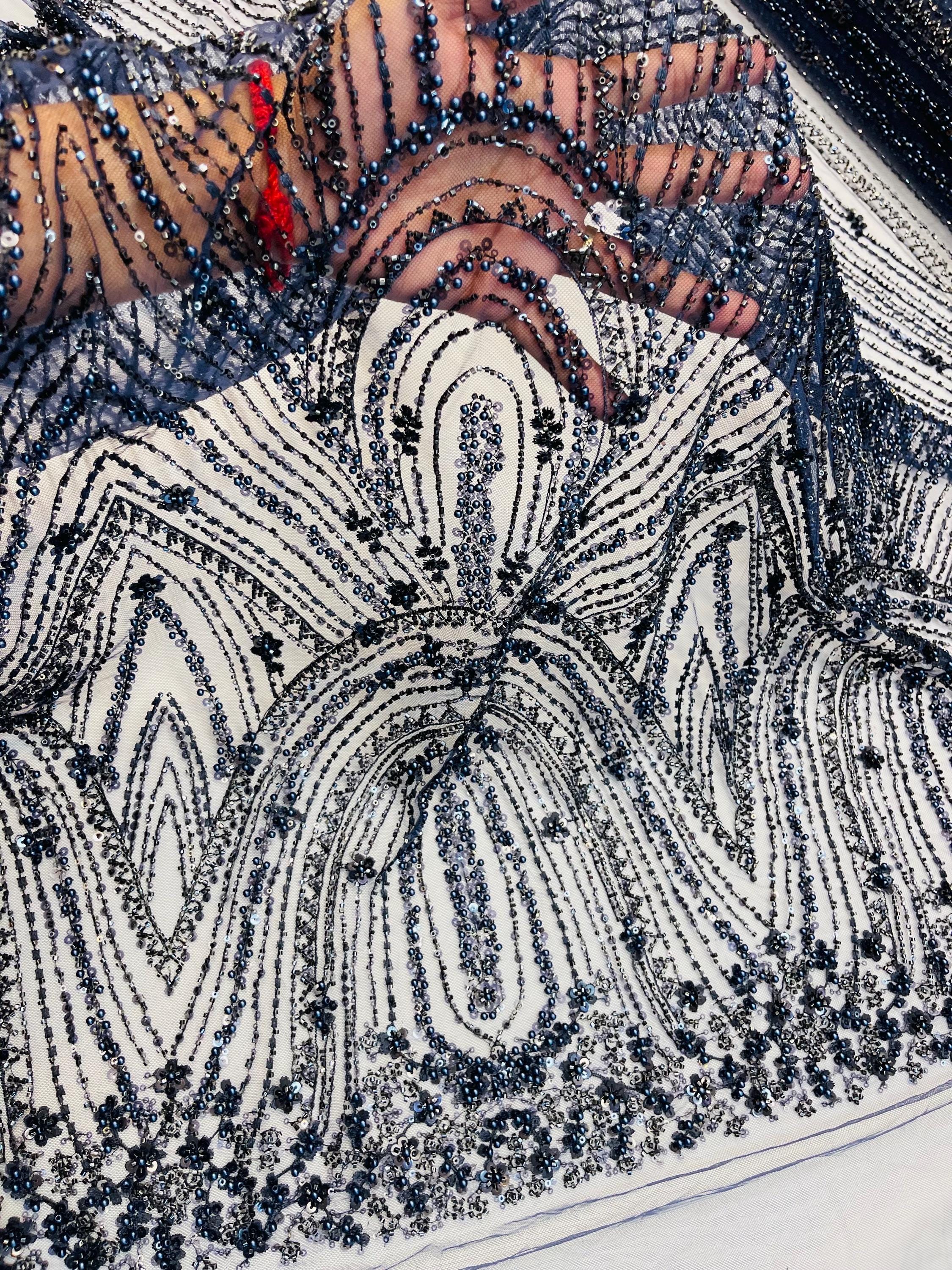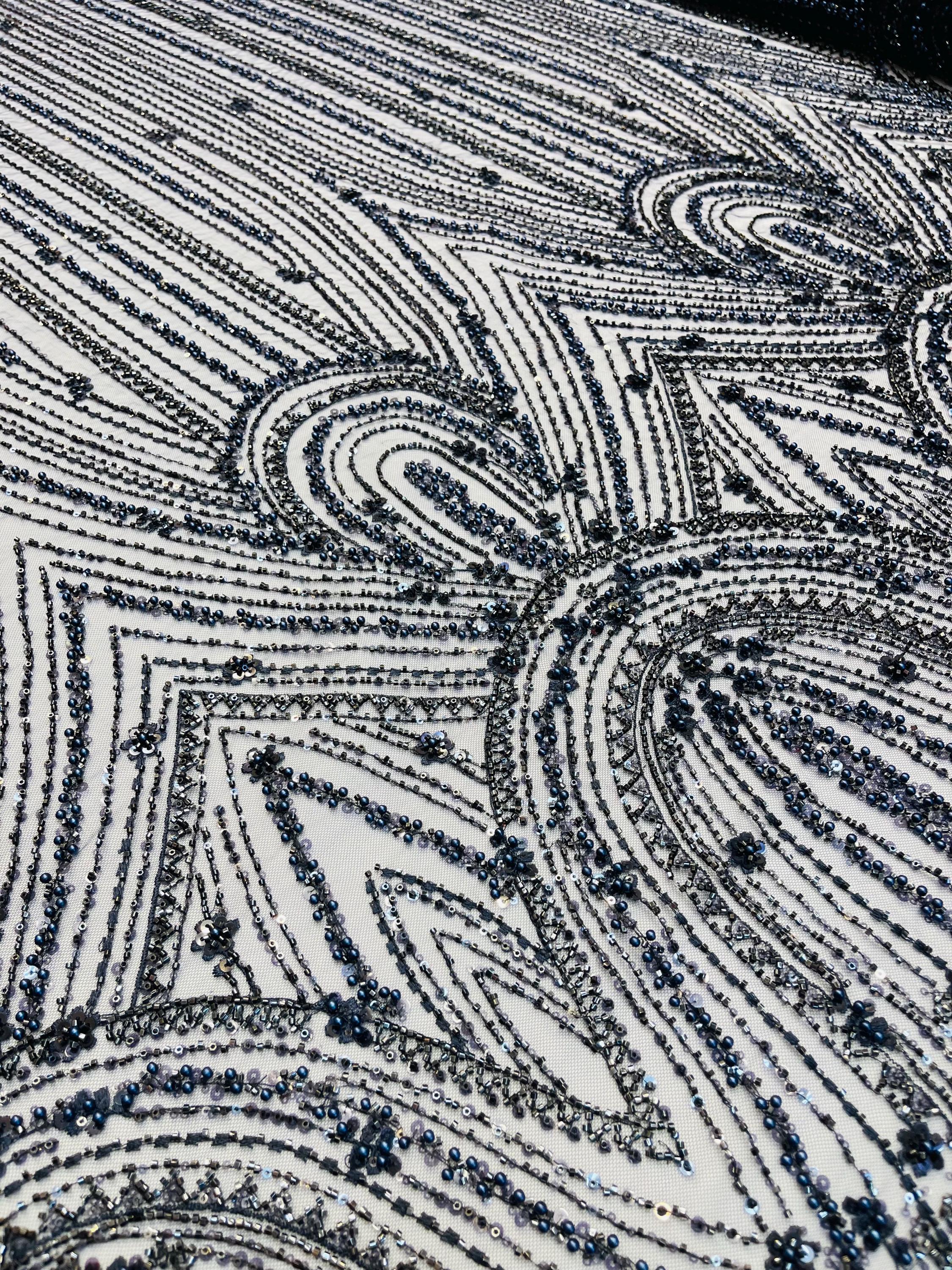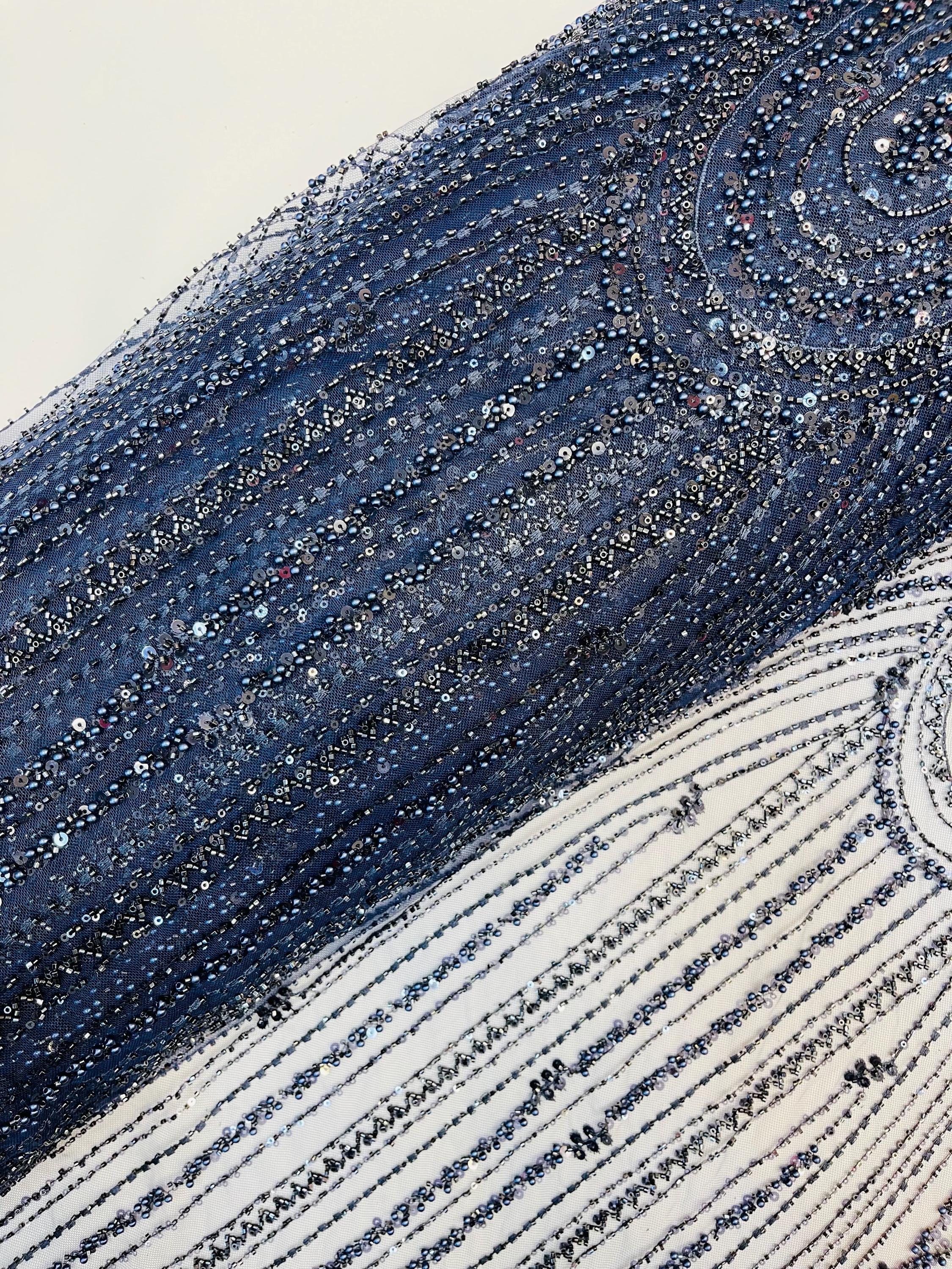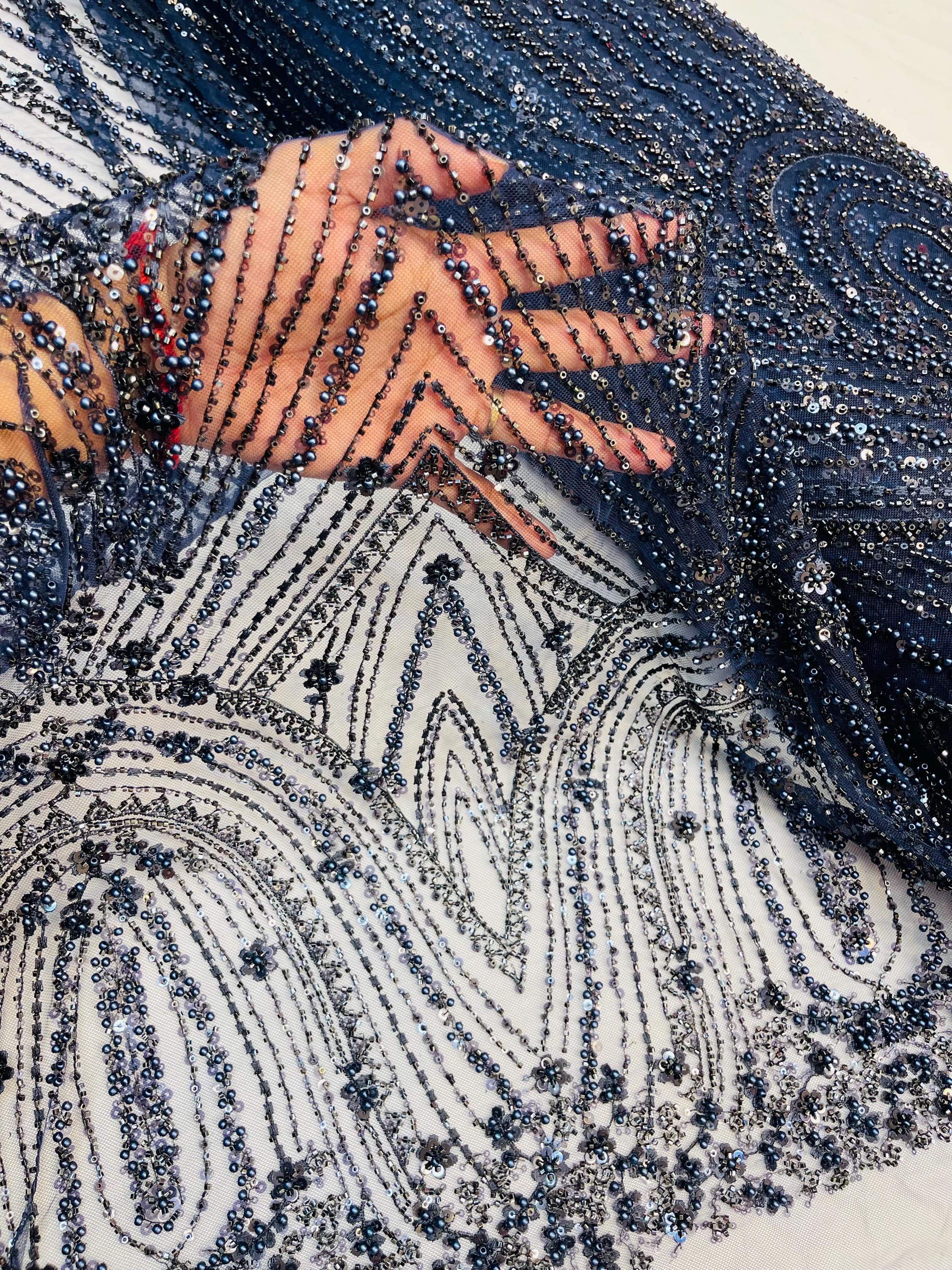 The beautiful design includes embroidered wavy plants patterns with beads across a mesh fabric of great quality. It has a beautiful border on both ends. This lace can be used for dresses, tablecloths, nightgowns, prom gowns, bridesmaid gowns, wedding gowns, table covers/runners, pillows, home /event decorations, and much more.