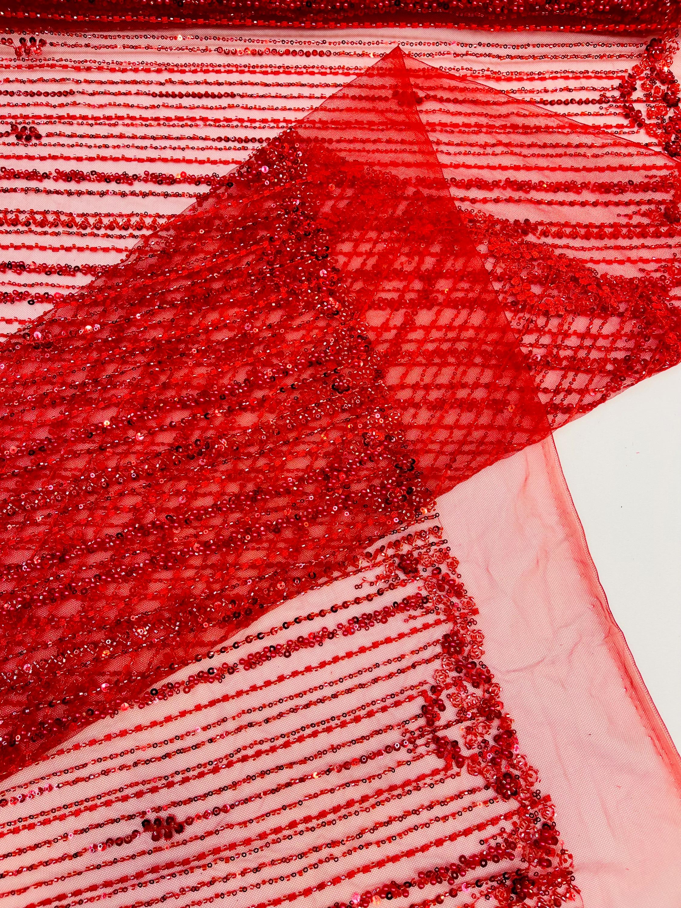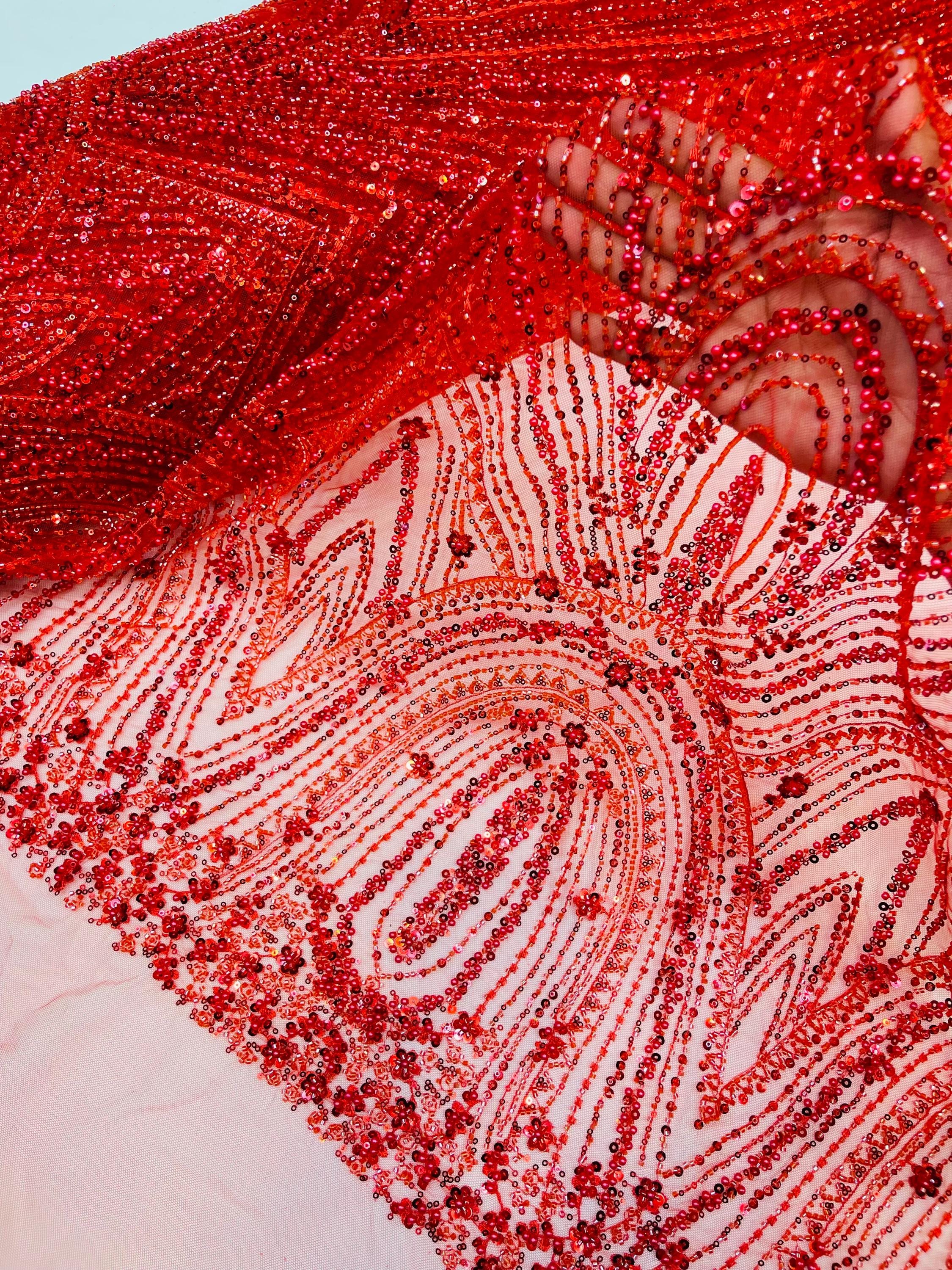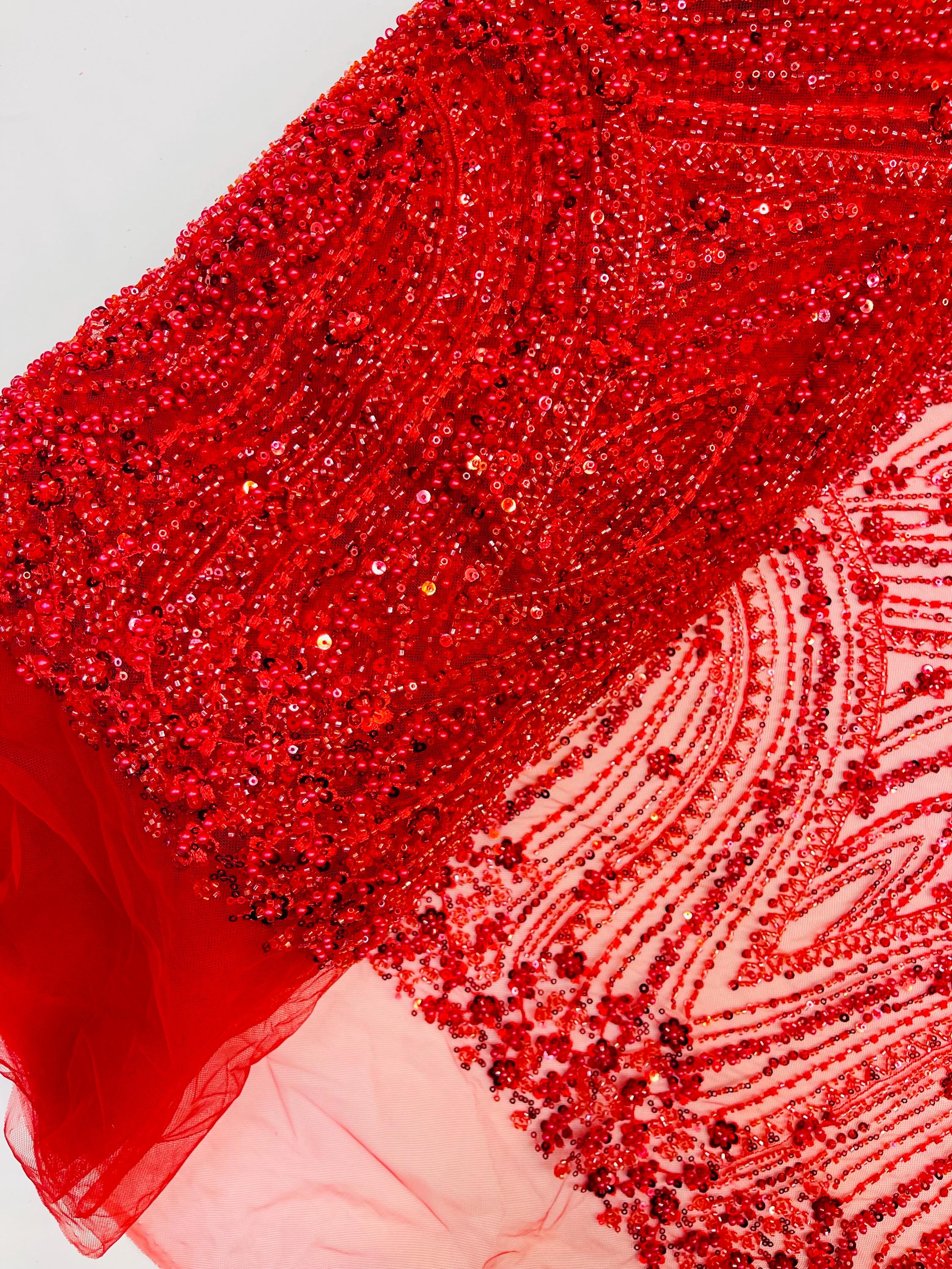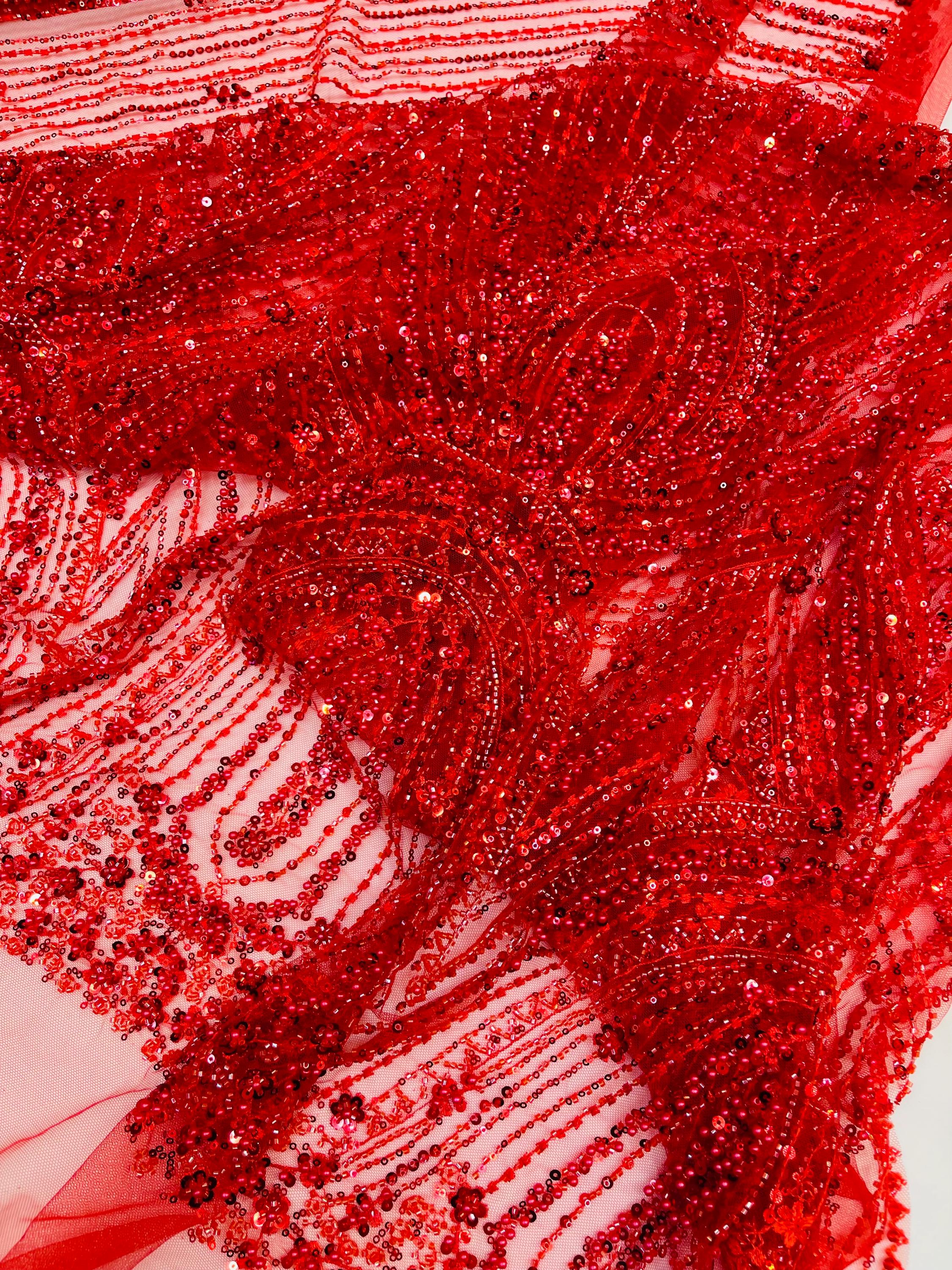 Red Beaded Fabric | Fashion Pattern With Beads and Sequin, Bridal Pearls Prom Dress