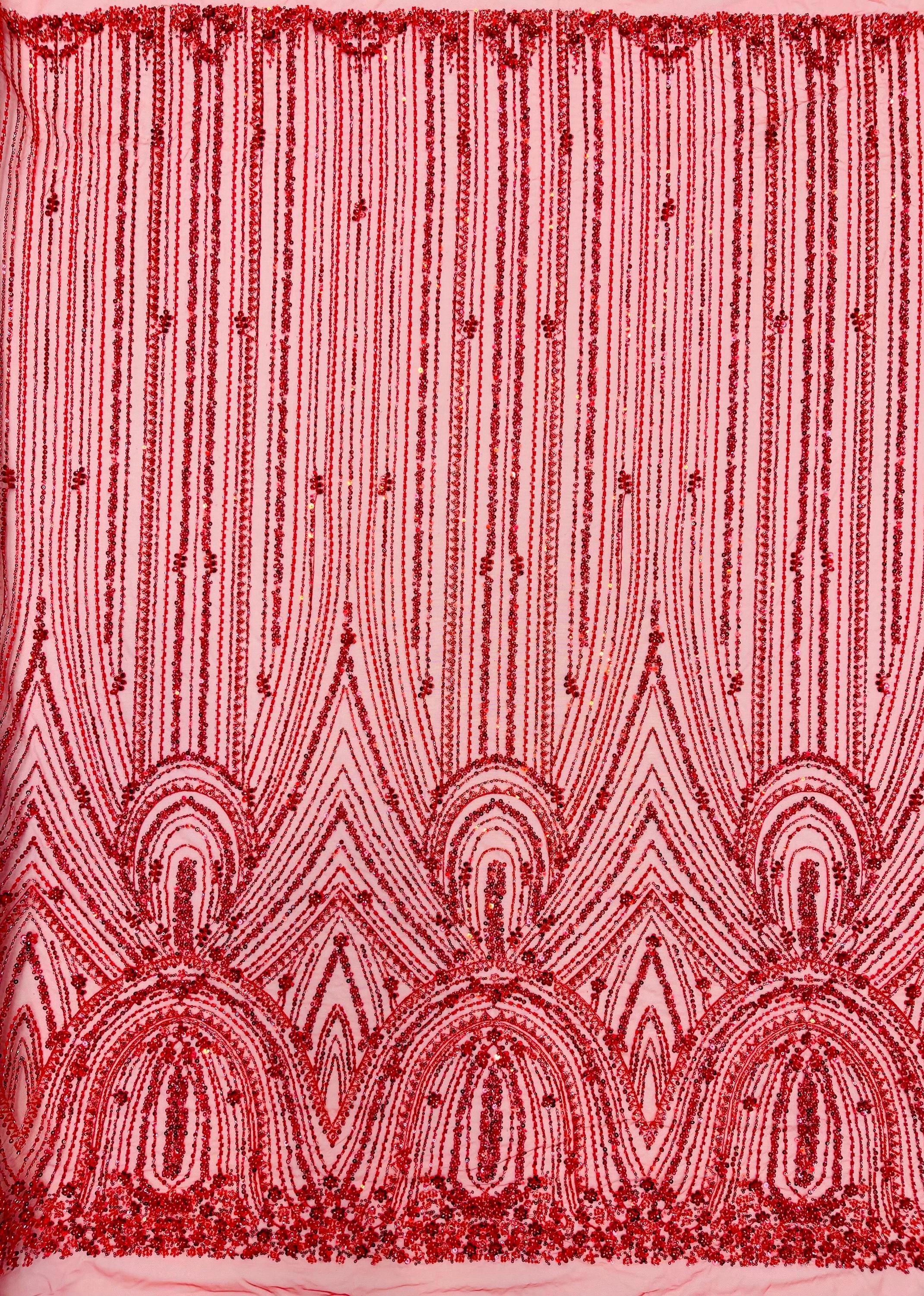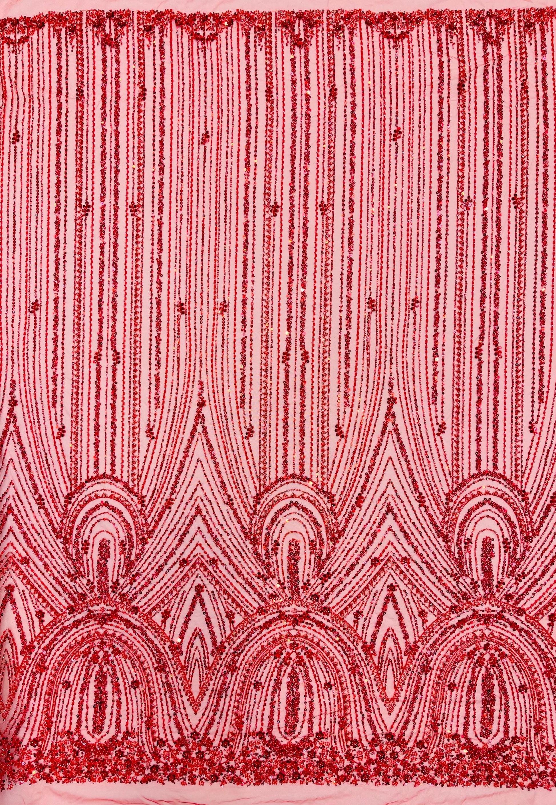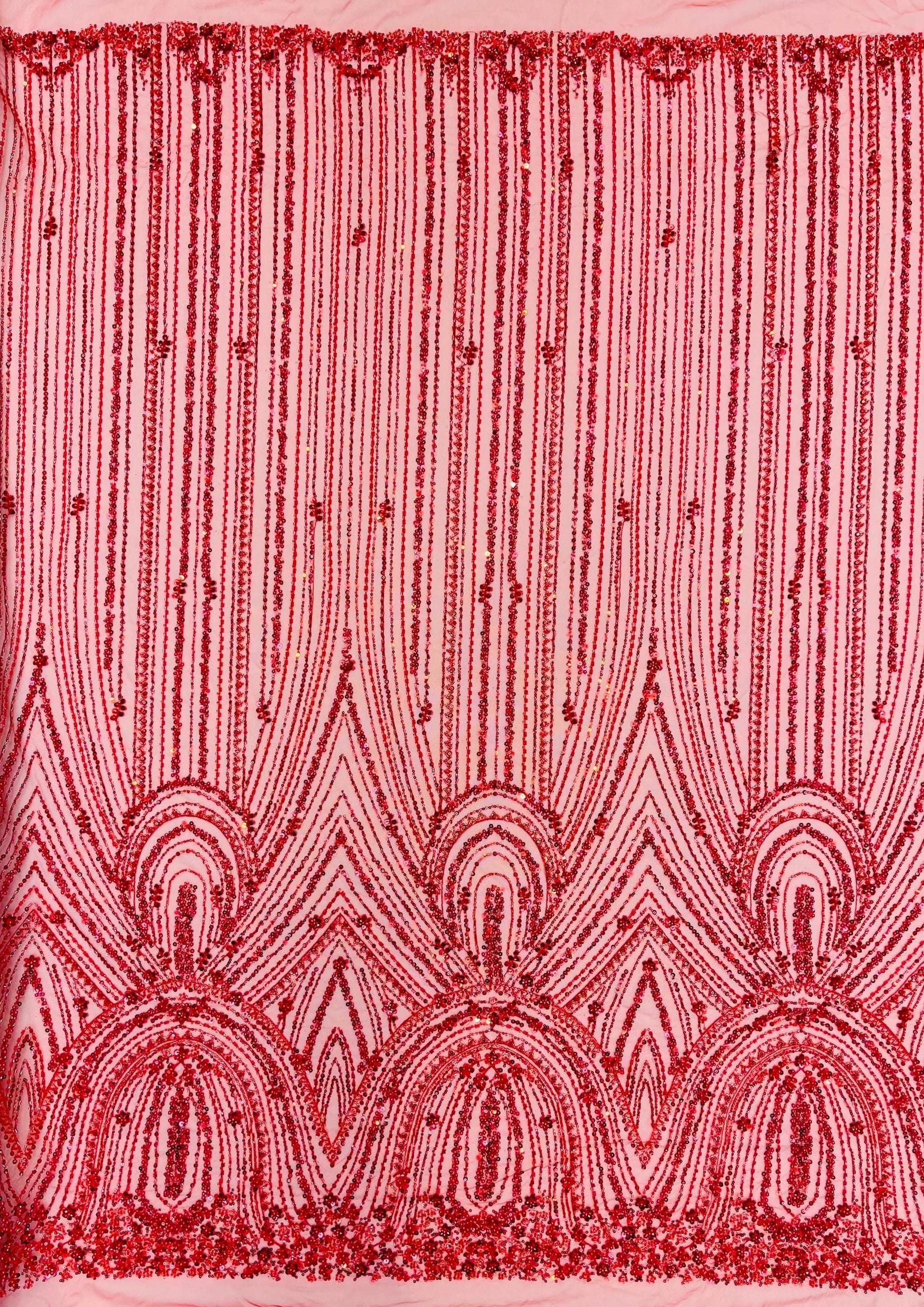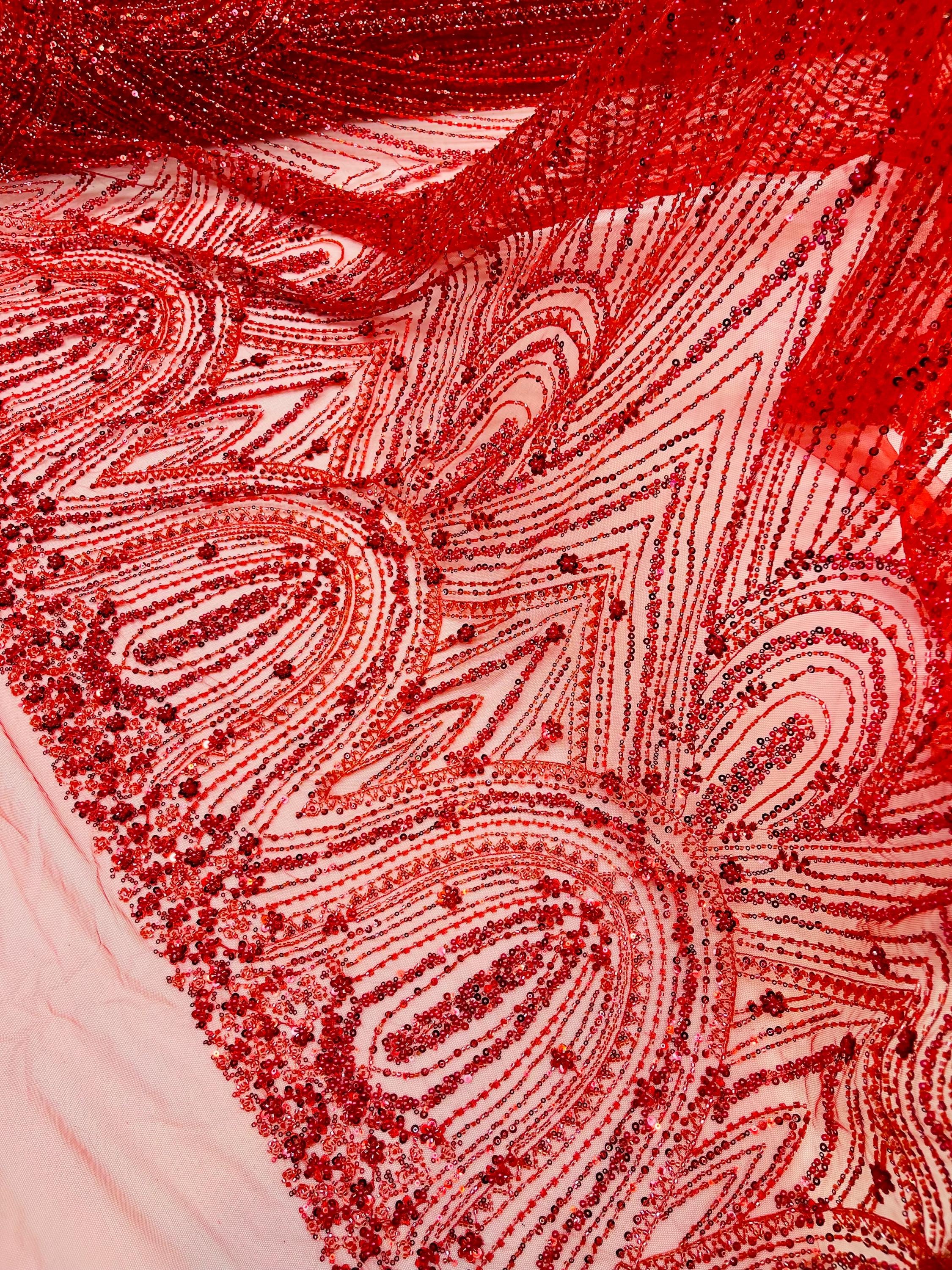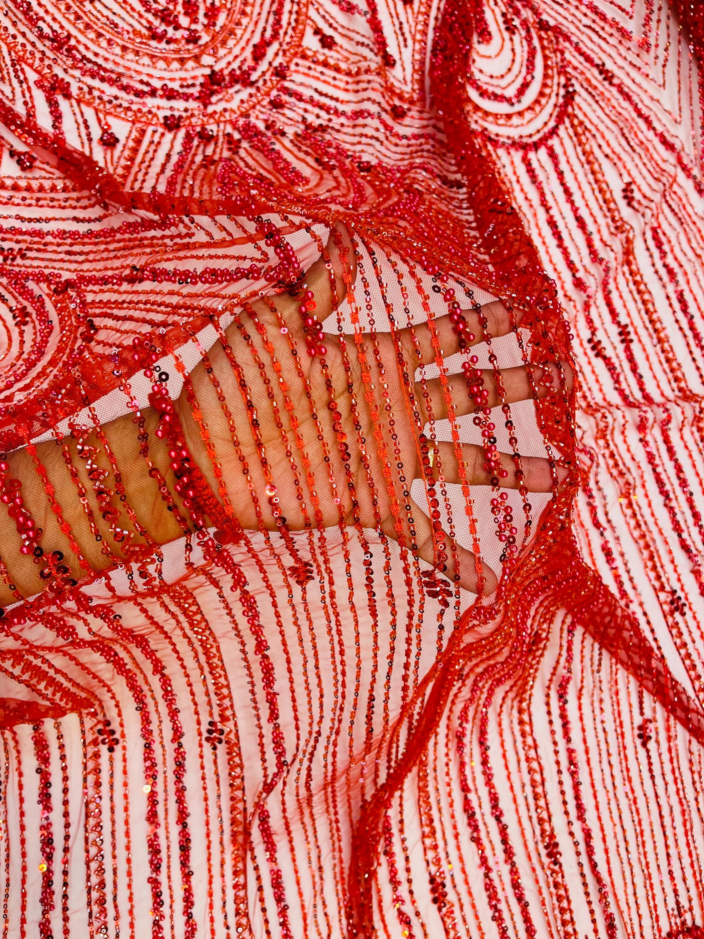 Red Beaded Fabric | Fashion Pattern With Beads and Sequin, Bridal Pearls Prom Dress