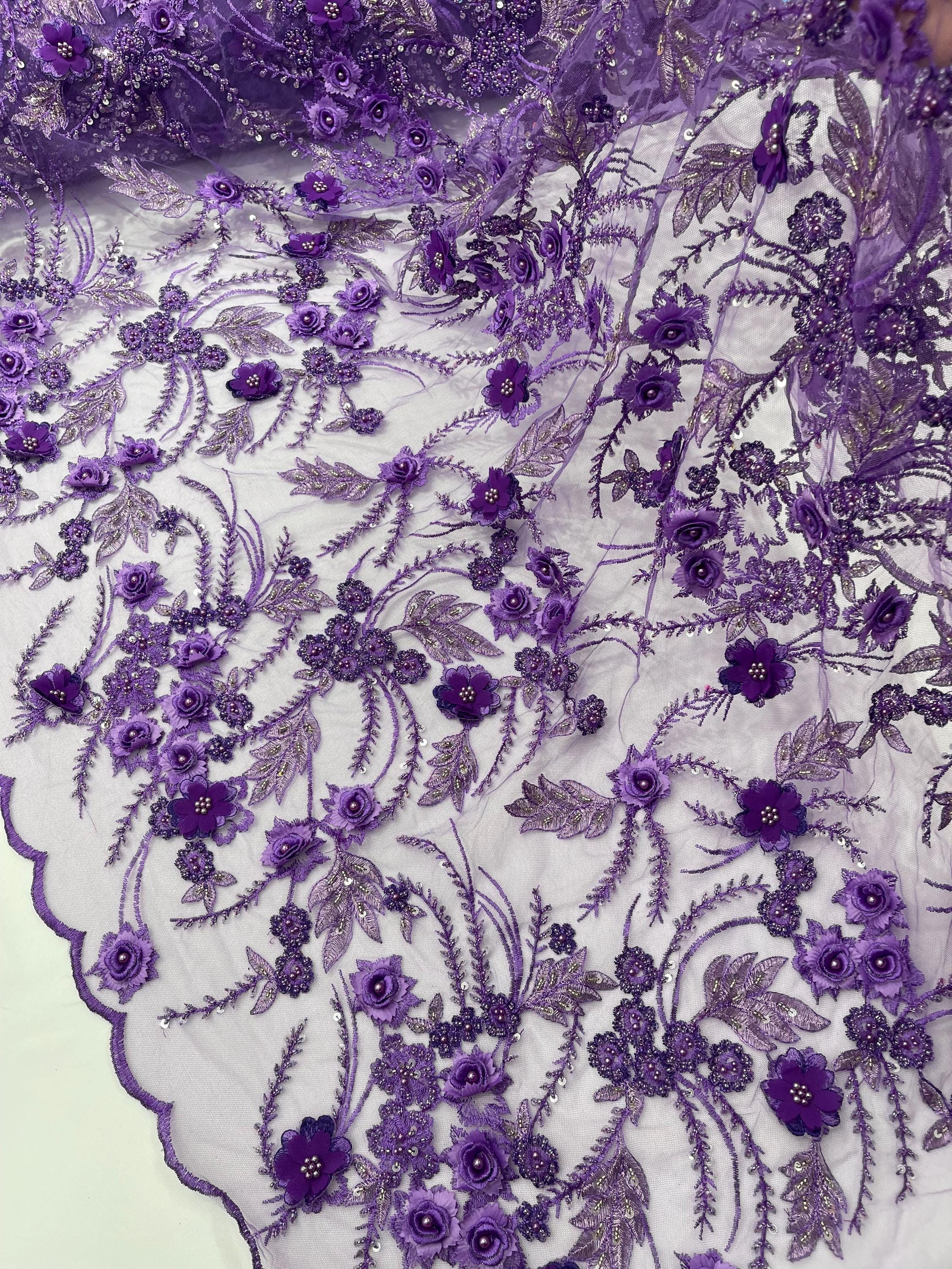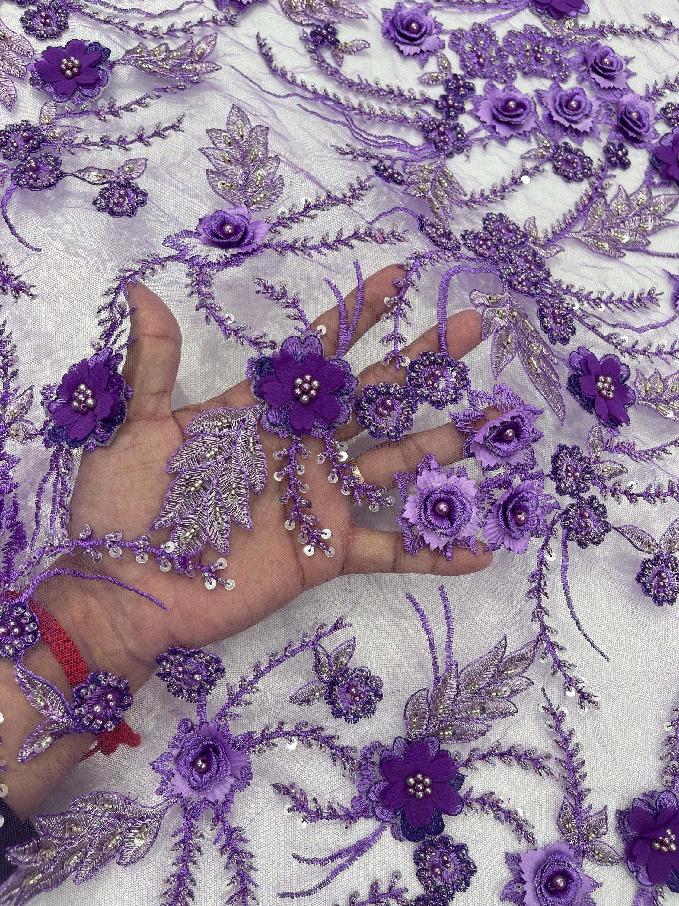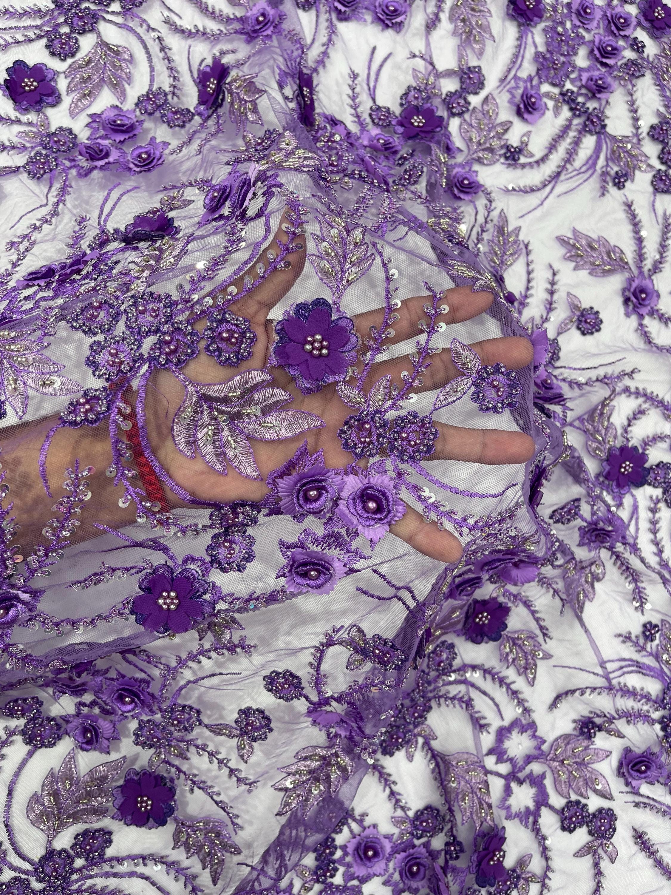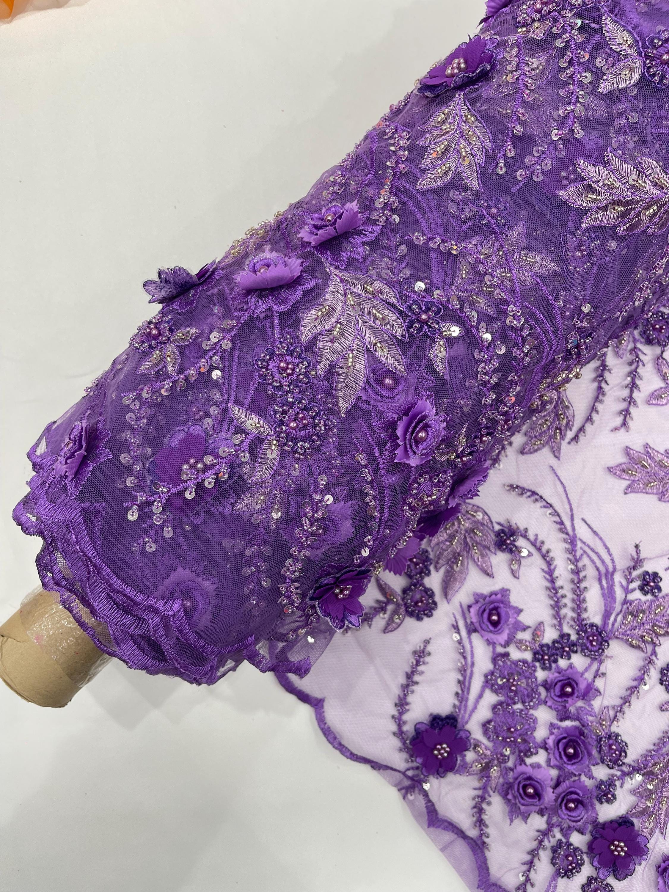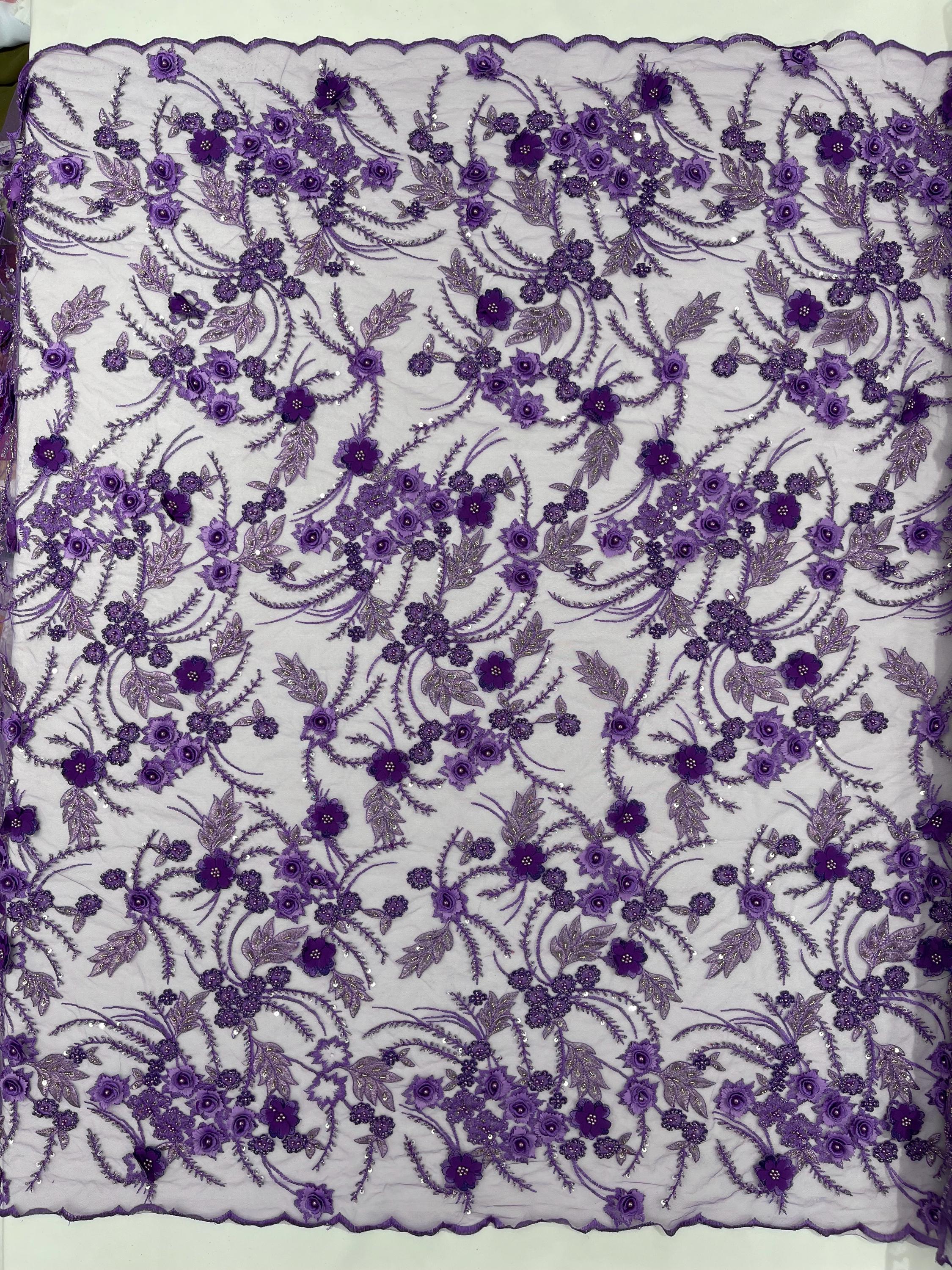 Purple 3D Floral Beaded Lace Fabric: Beaded Sequins on a Mesh, Apparel-Prom - By The Yard