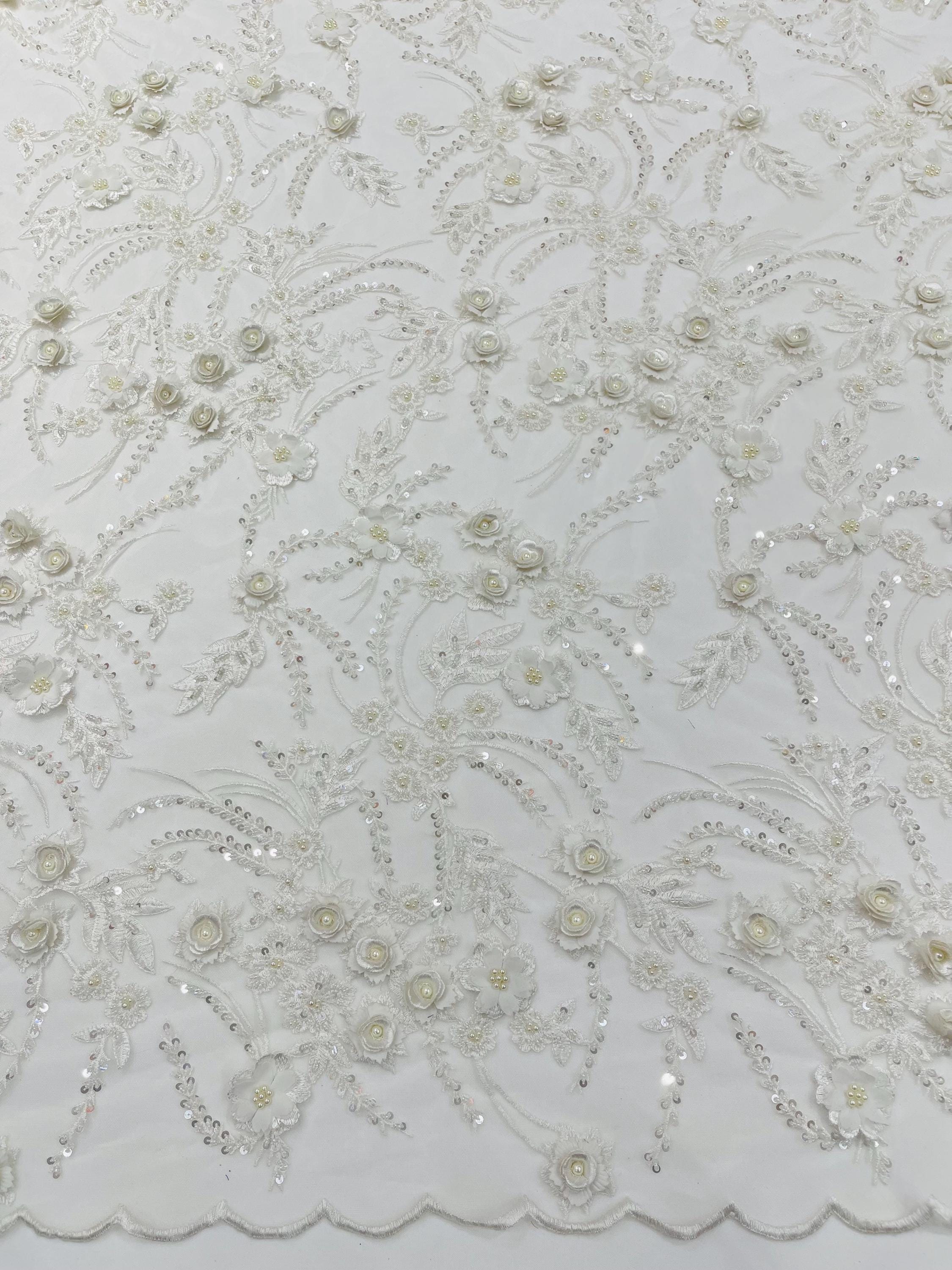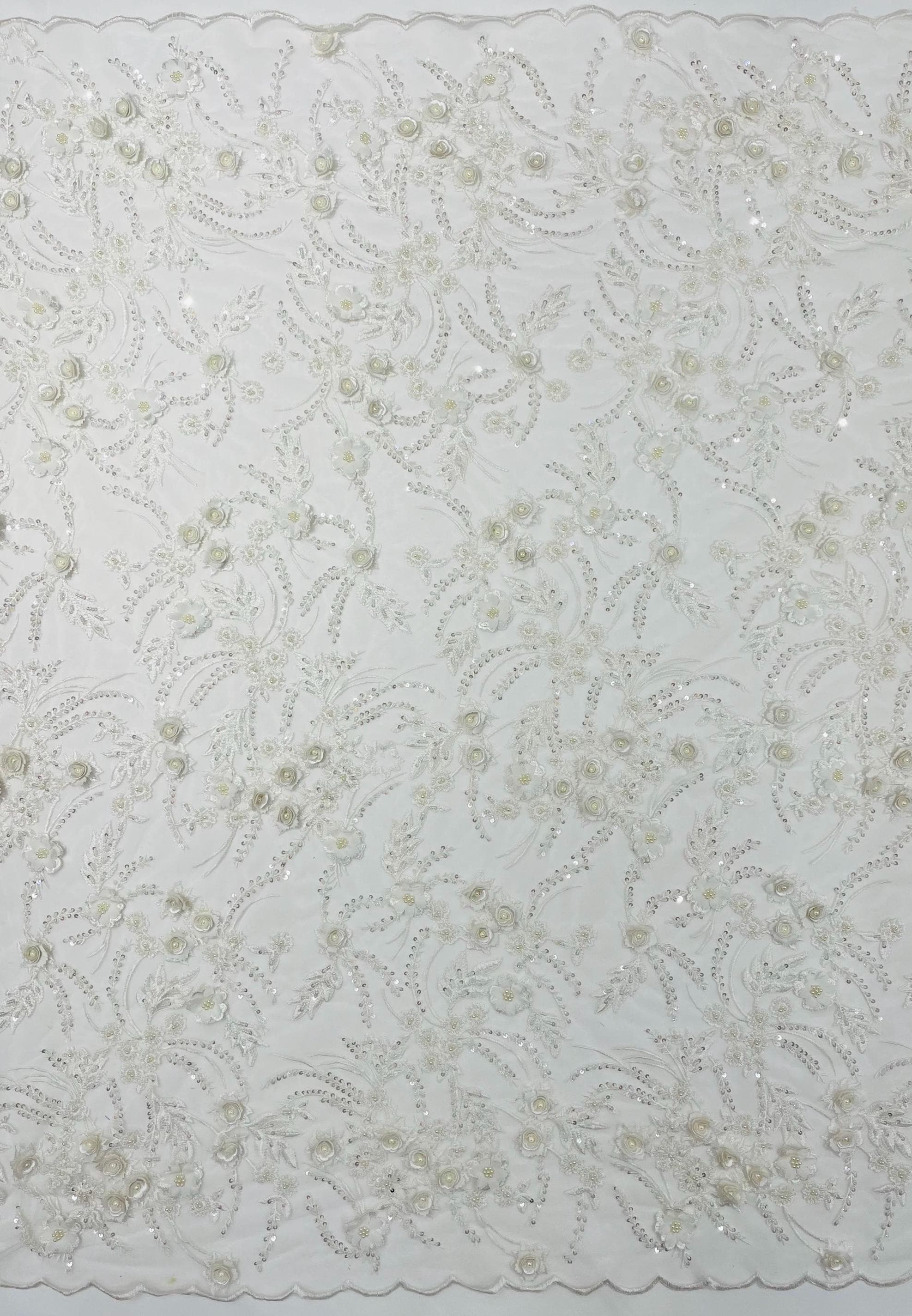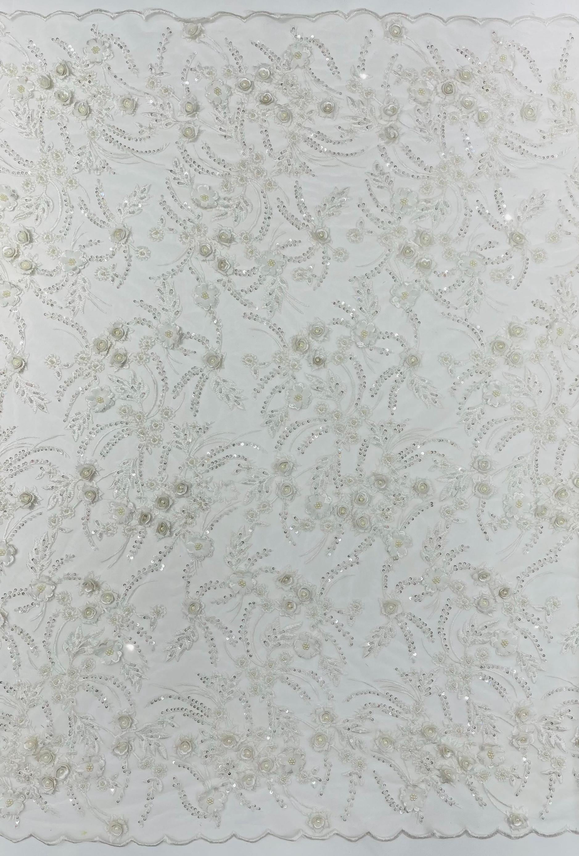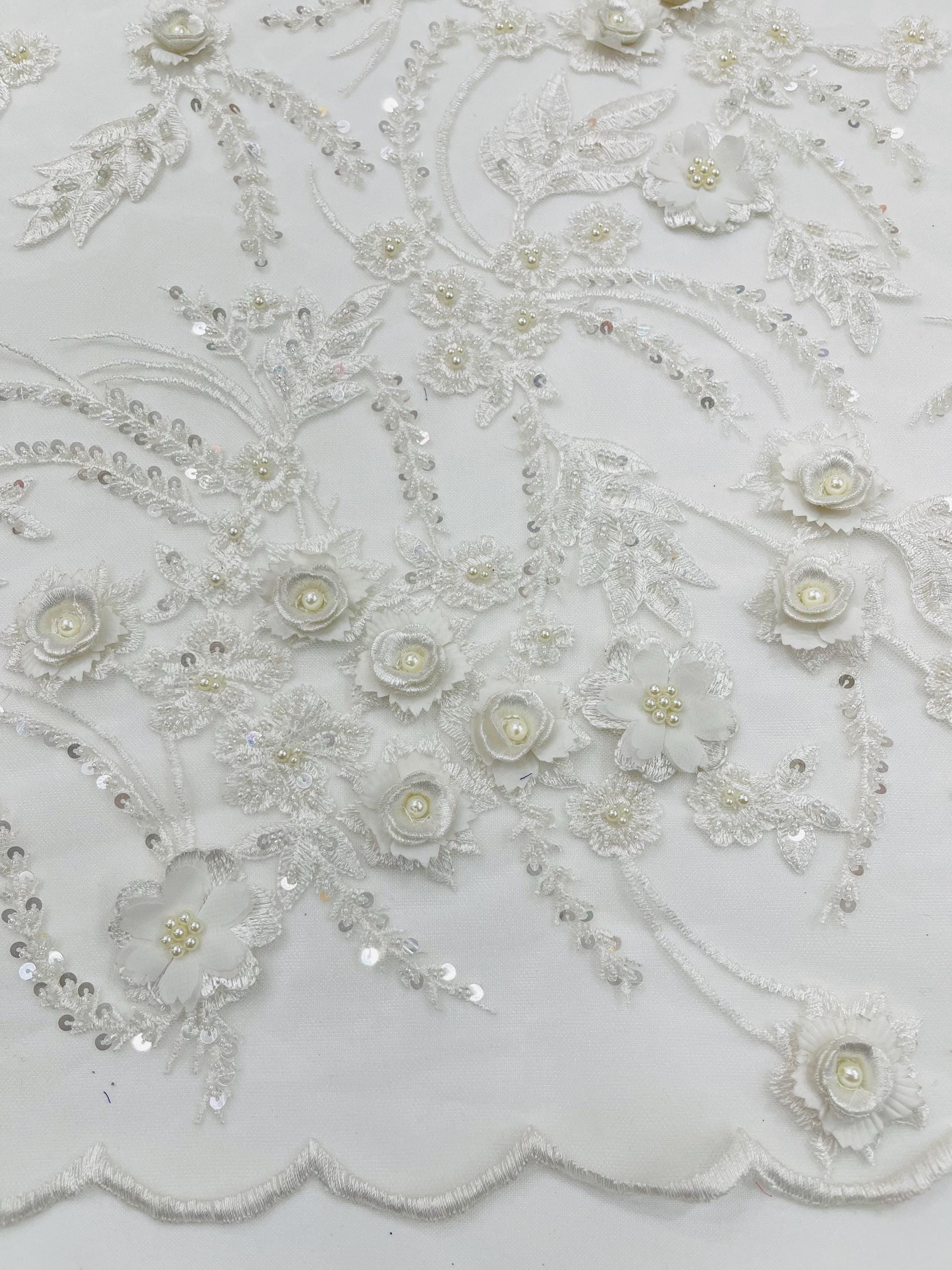 Off White 3D Floral Beaded Lace Fabric: Beaded Sequins on a Mesh, Apparel-Prom - By The Yard