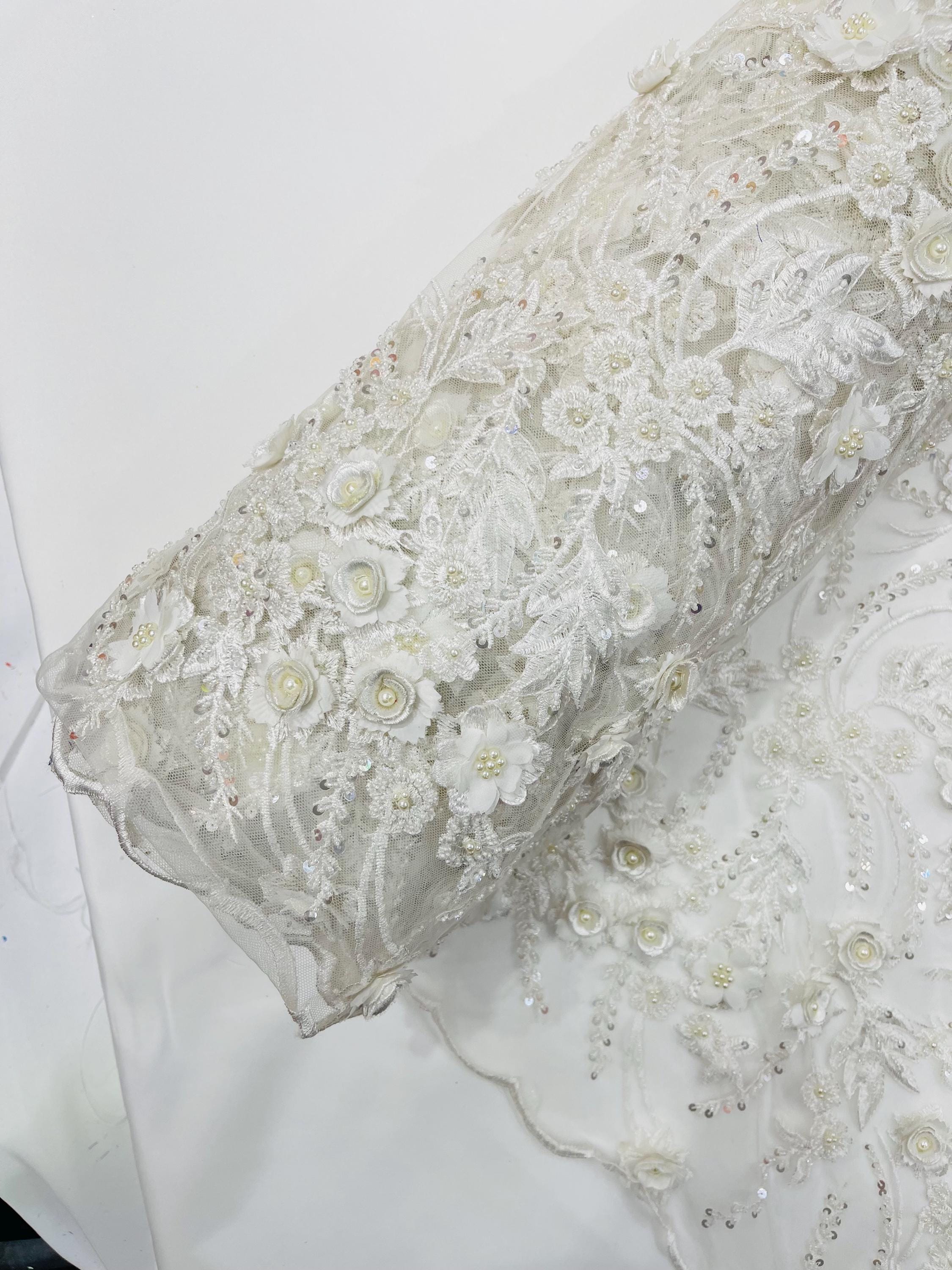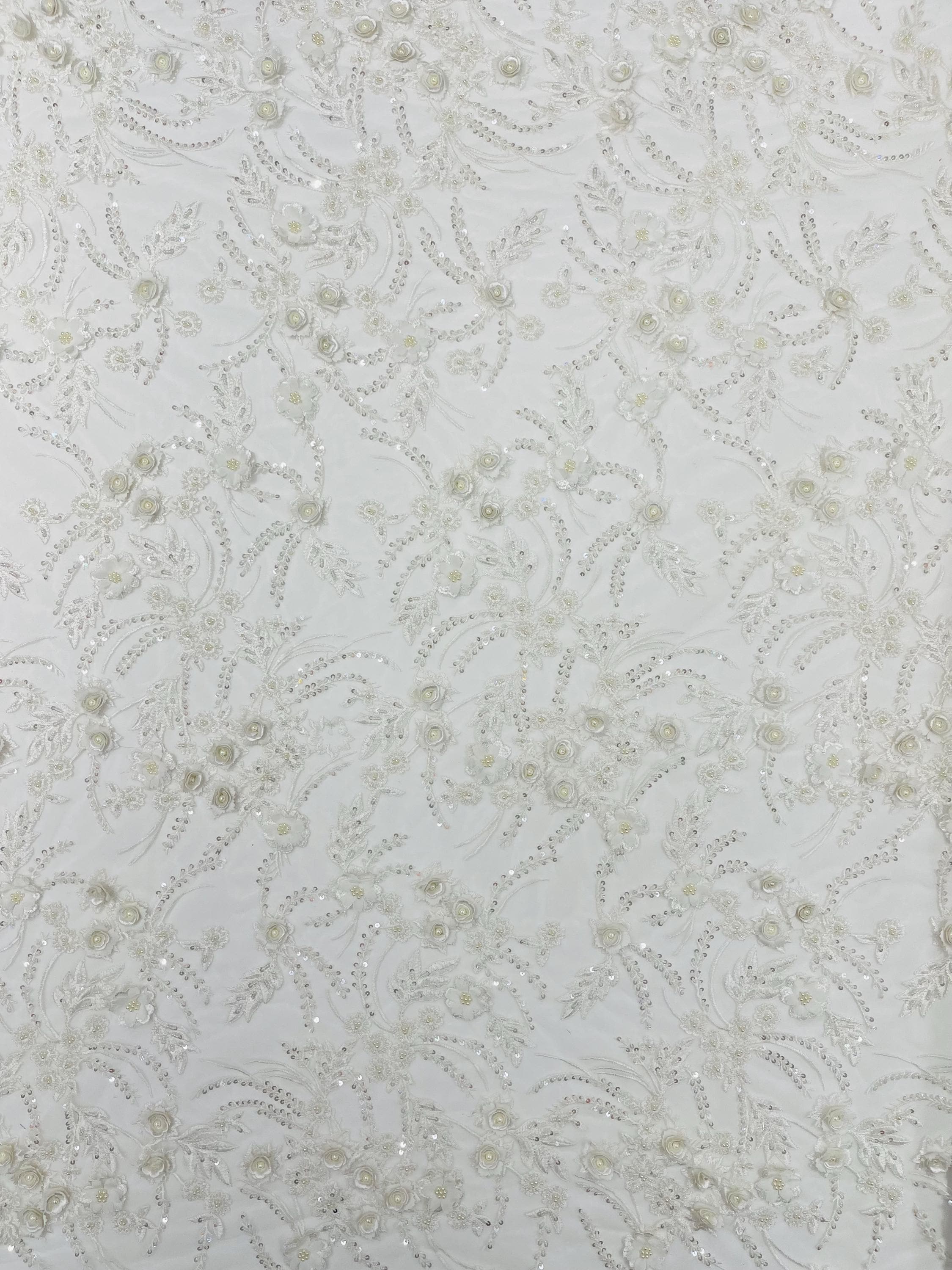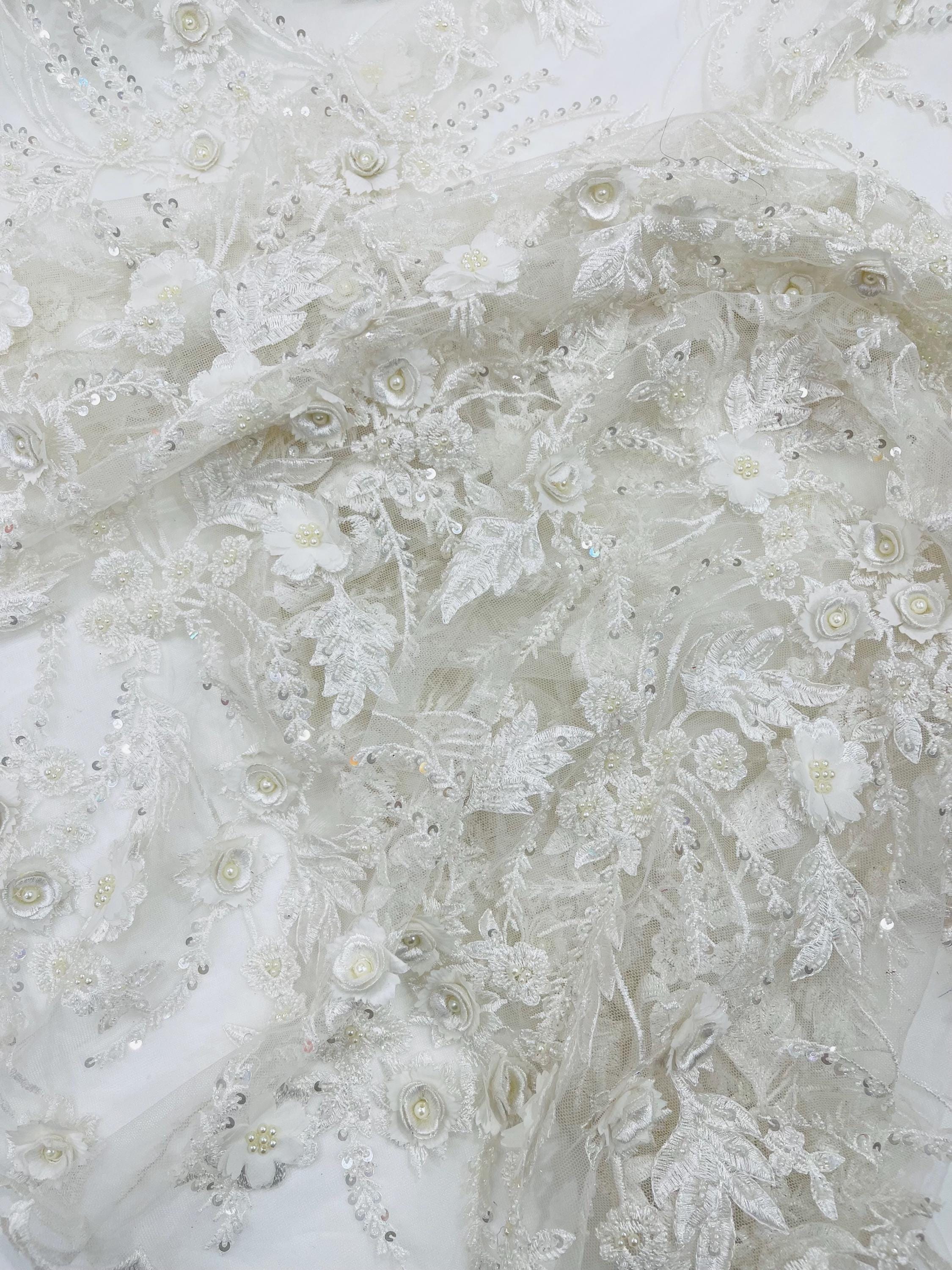Off White 3D Floral Beaded Lace Fabric: Beaded Sequins on a Mesh, Apparel-Prom - By The Yard