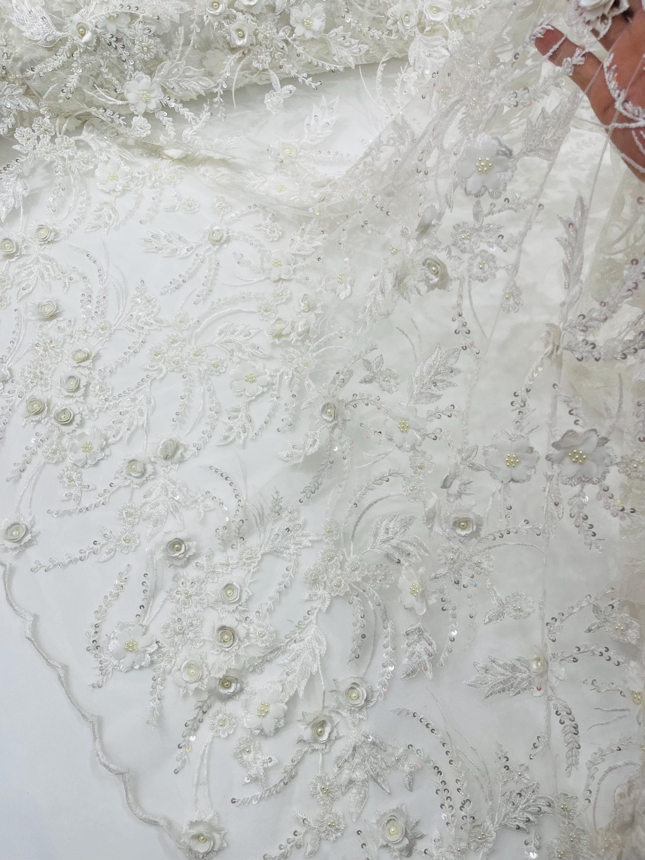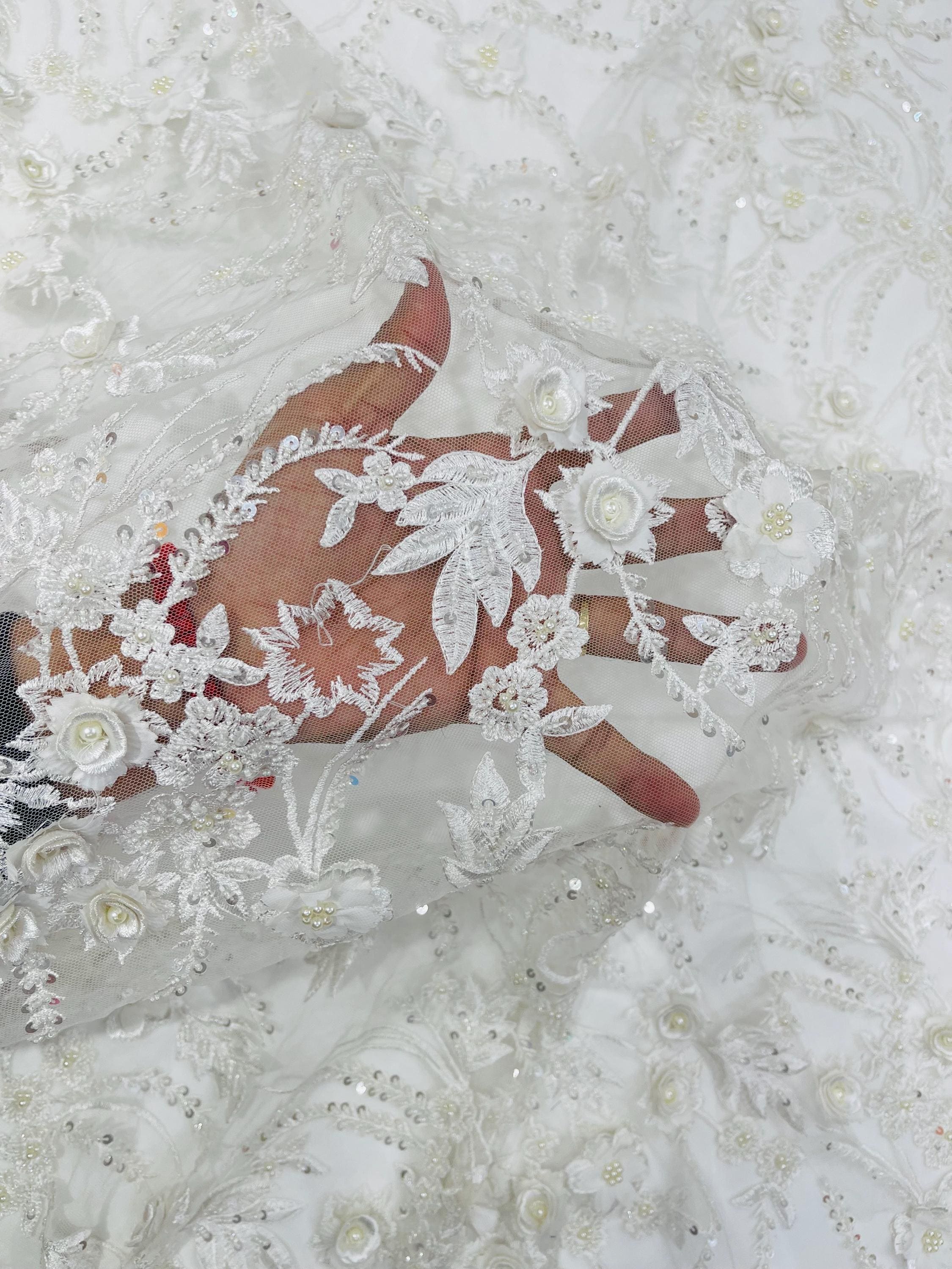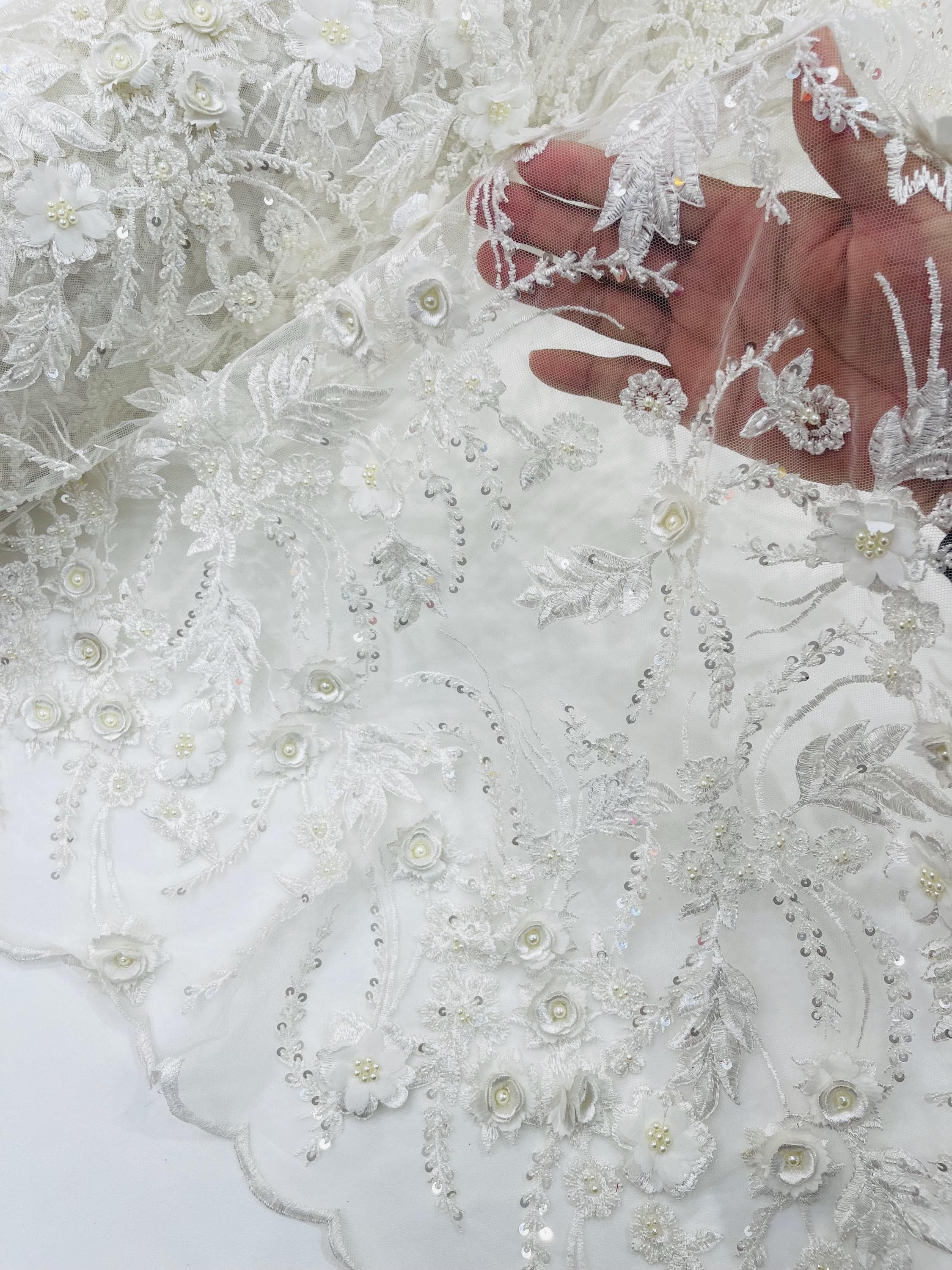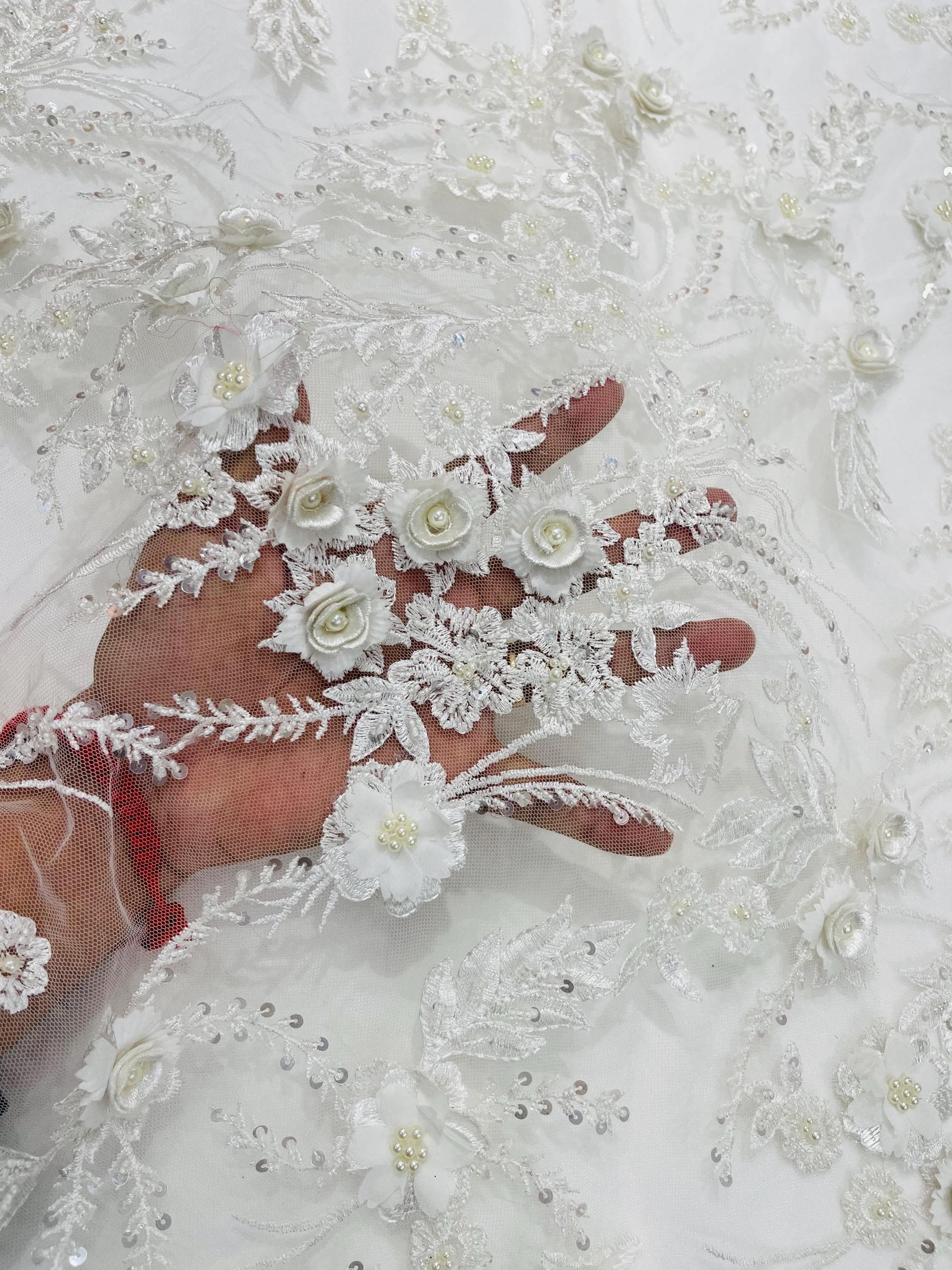 Off White 3D Floral Beaded Lace Fabric: Beaded Sequins on a Mesh, Apparel-Prom - By The Yard