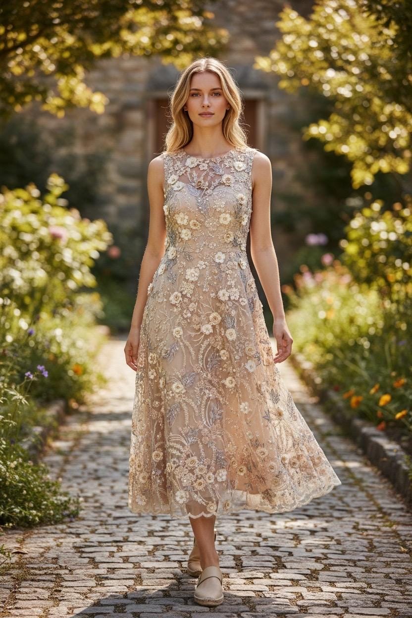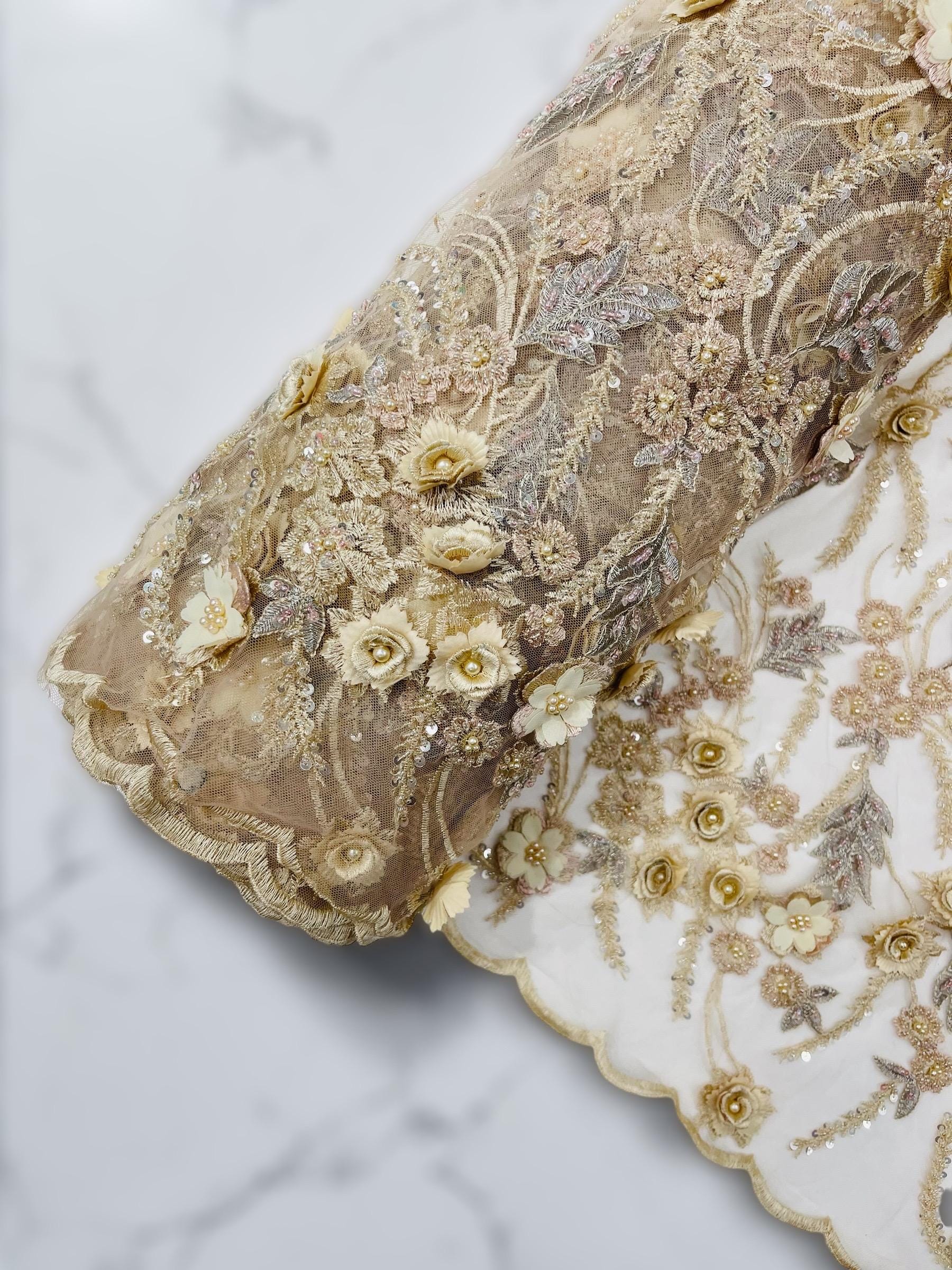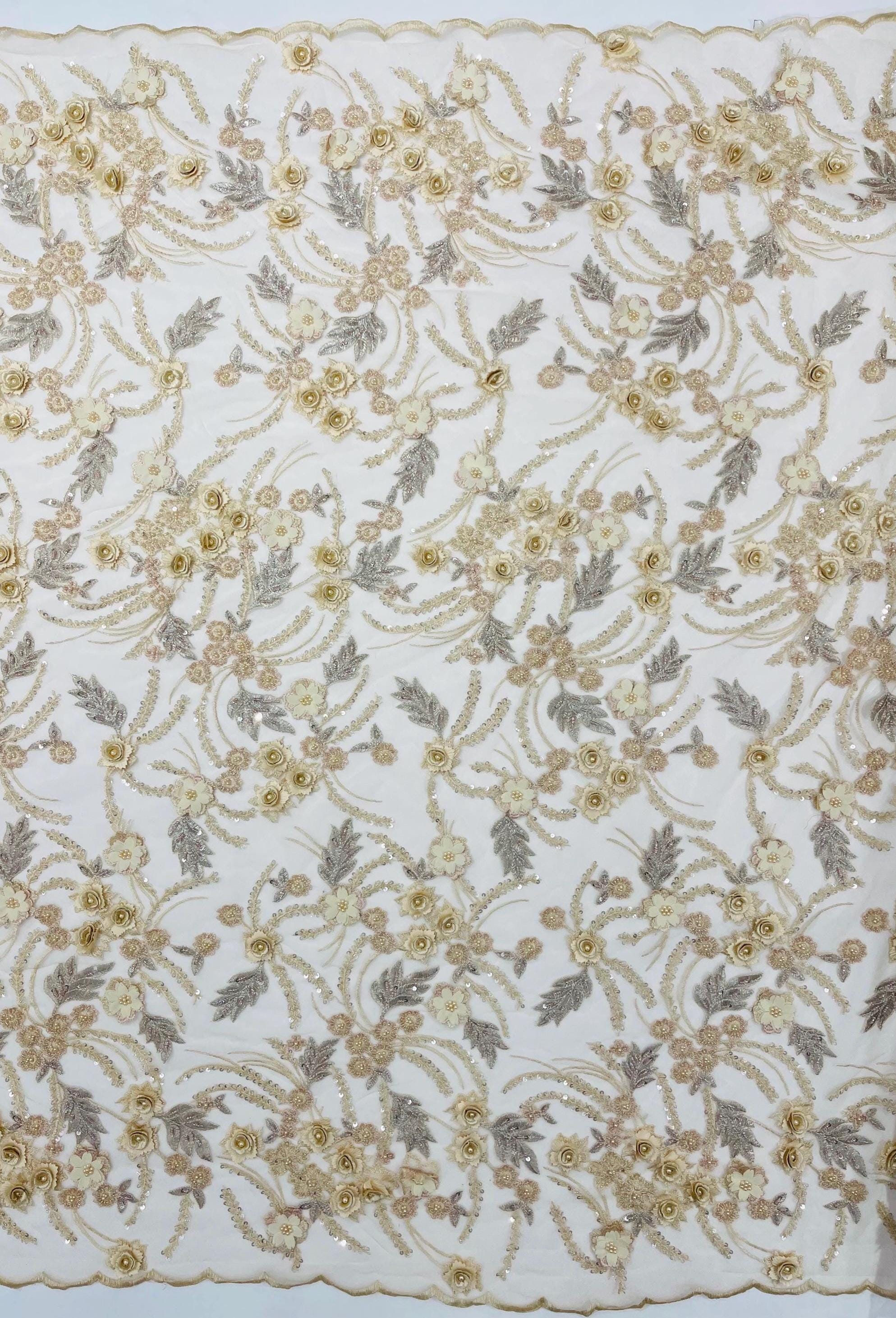 The beautiful design includes embroidered wavy leaf patterns with beads across a mesh fabric of great quality. It has a beautiful border on both ends. This lace can be used for dresses, tablecloths, nightgowns, prom gowns, bridesmaid gowns, wedding gowns, table covers/runners, pillows, home /event decorations, and much more.