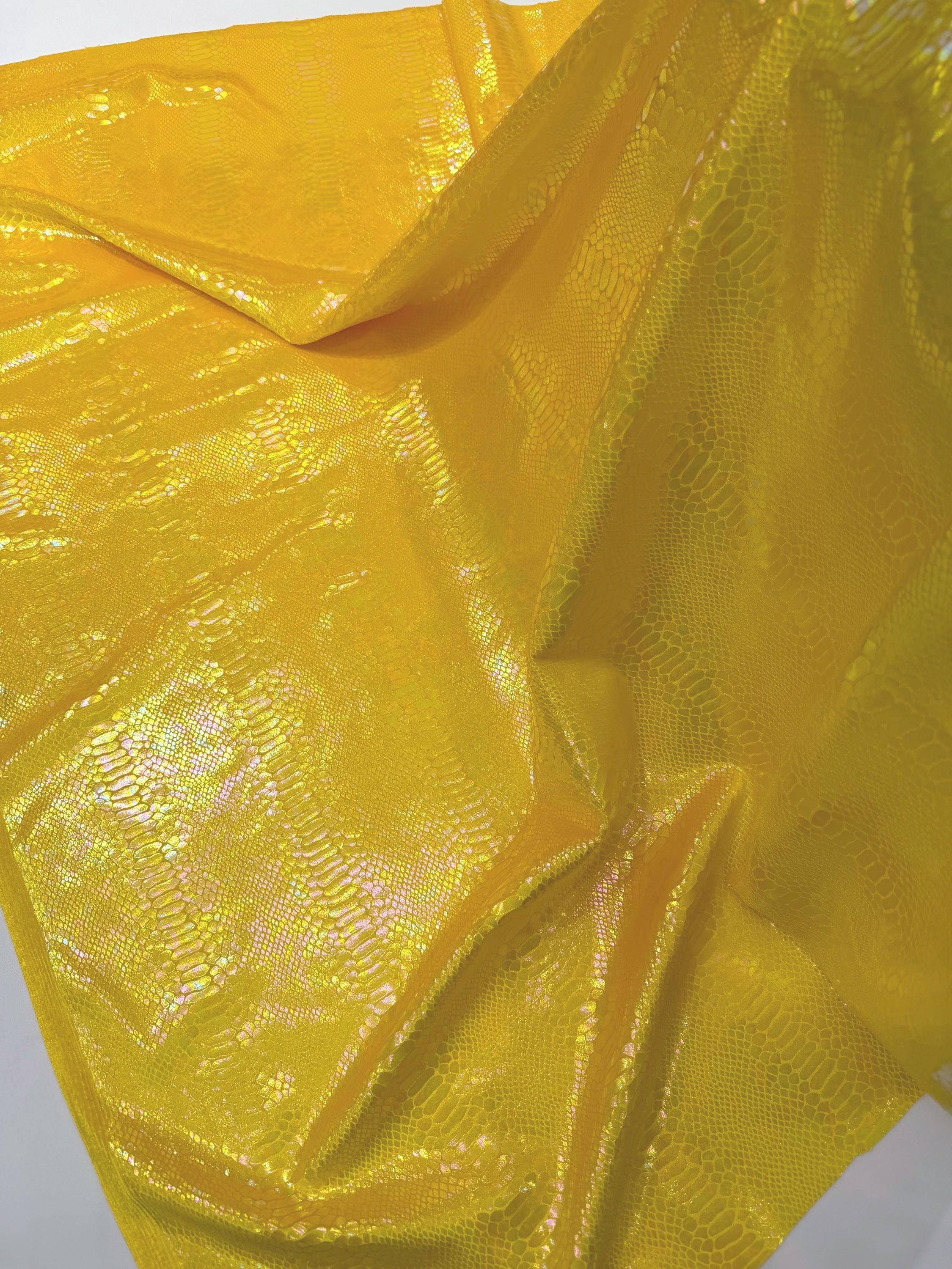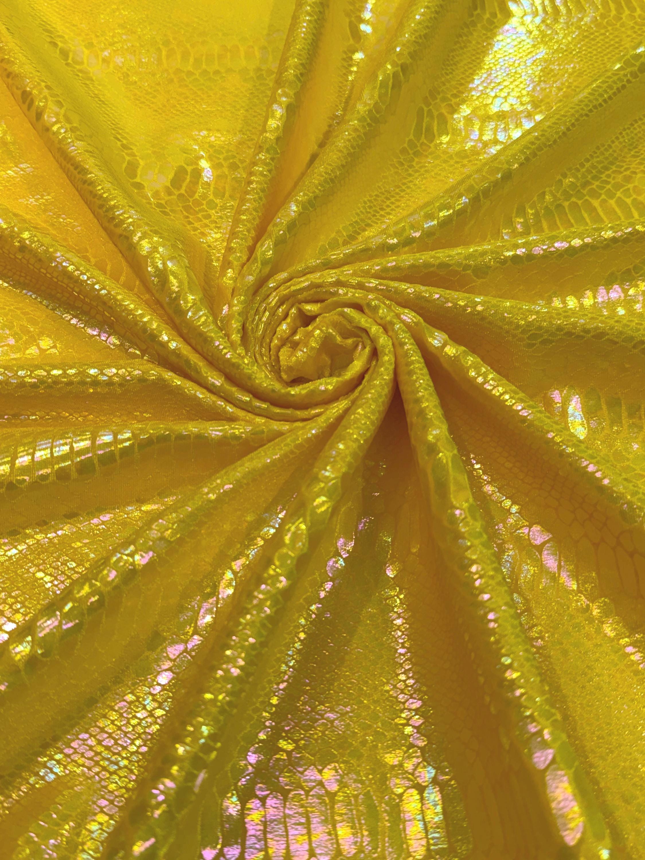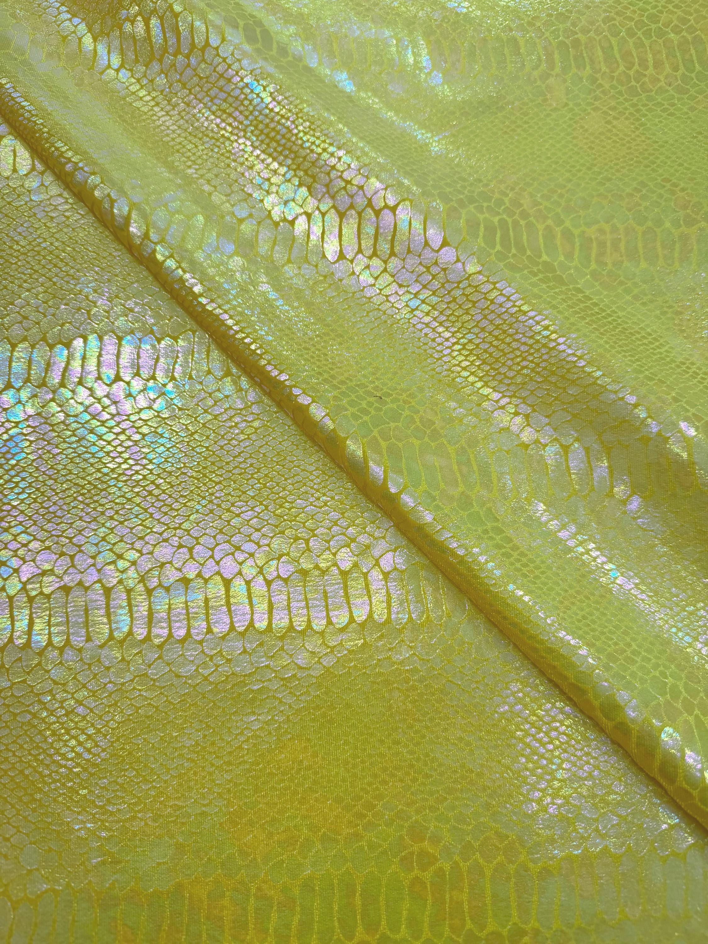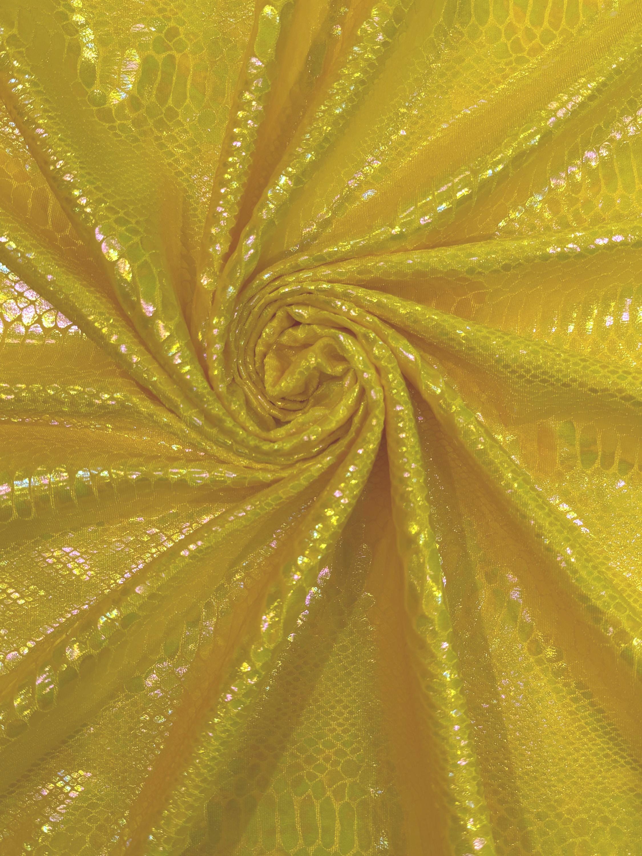 Yellow Iridescent Snake Illusion Foil Stretch Velvet Fabric | Snake Print - by the yard
