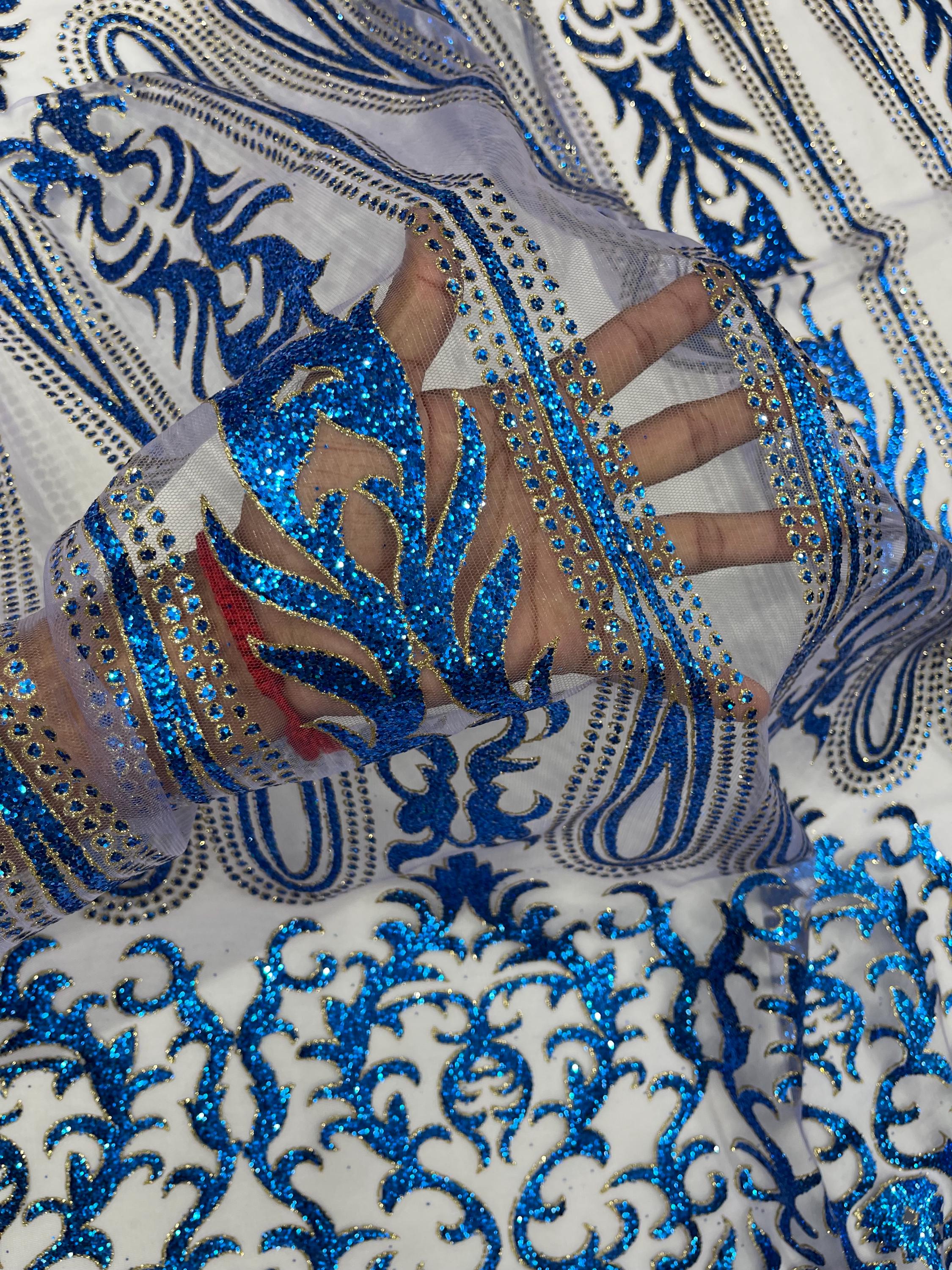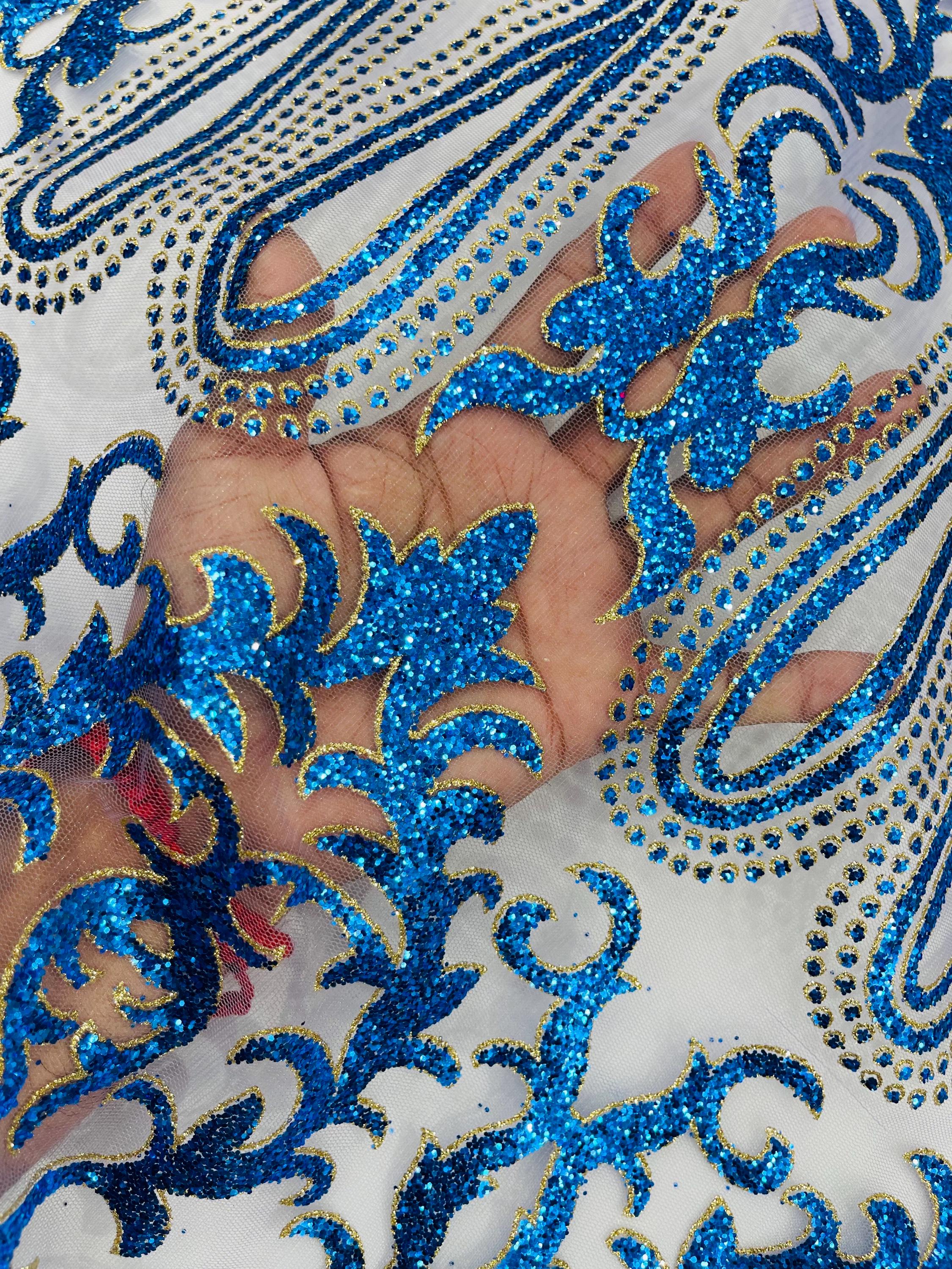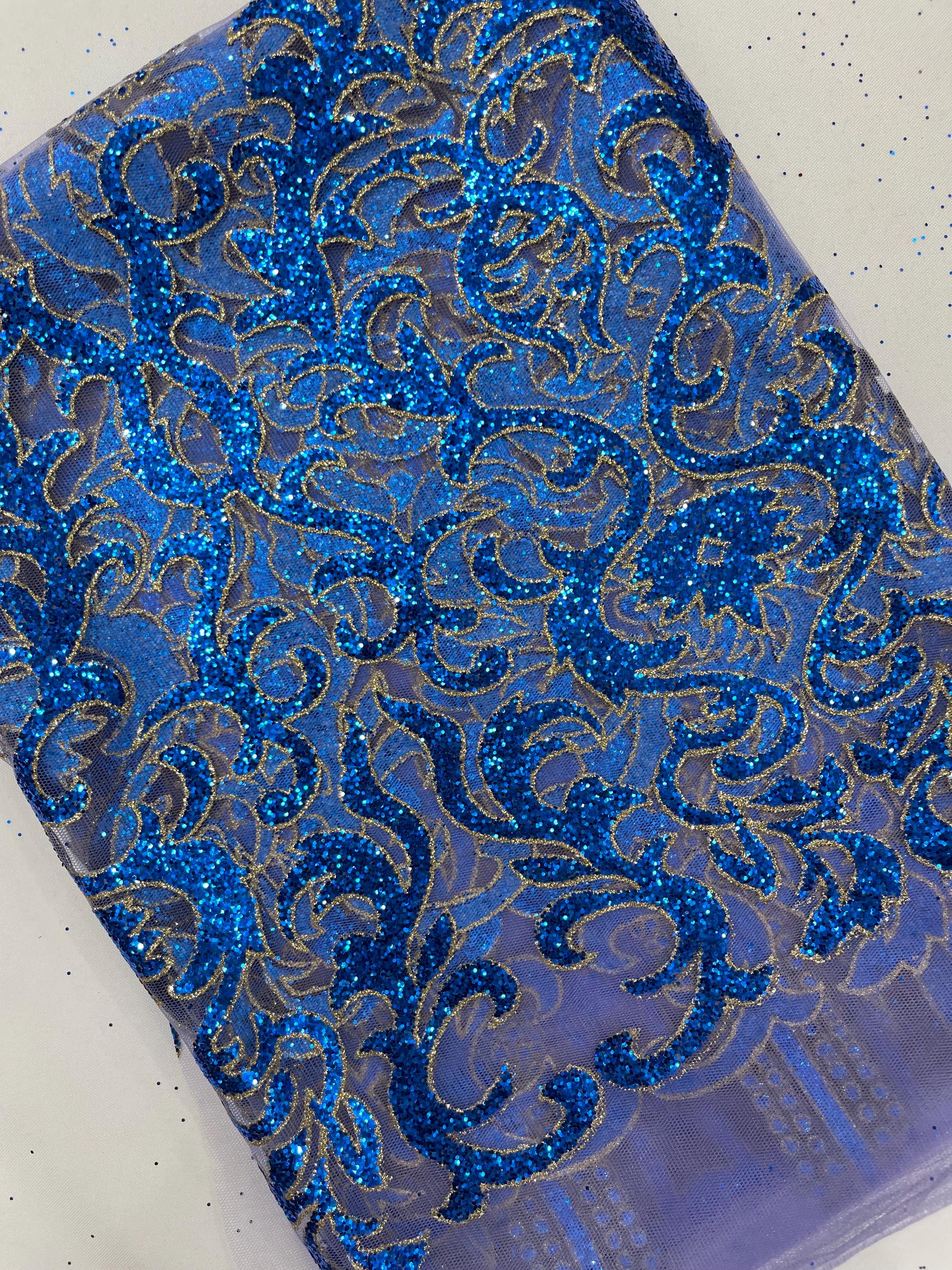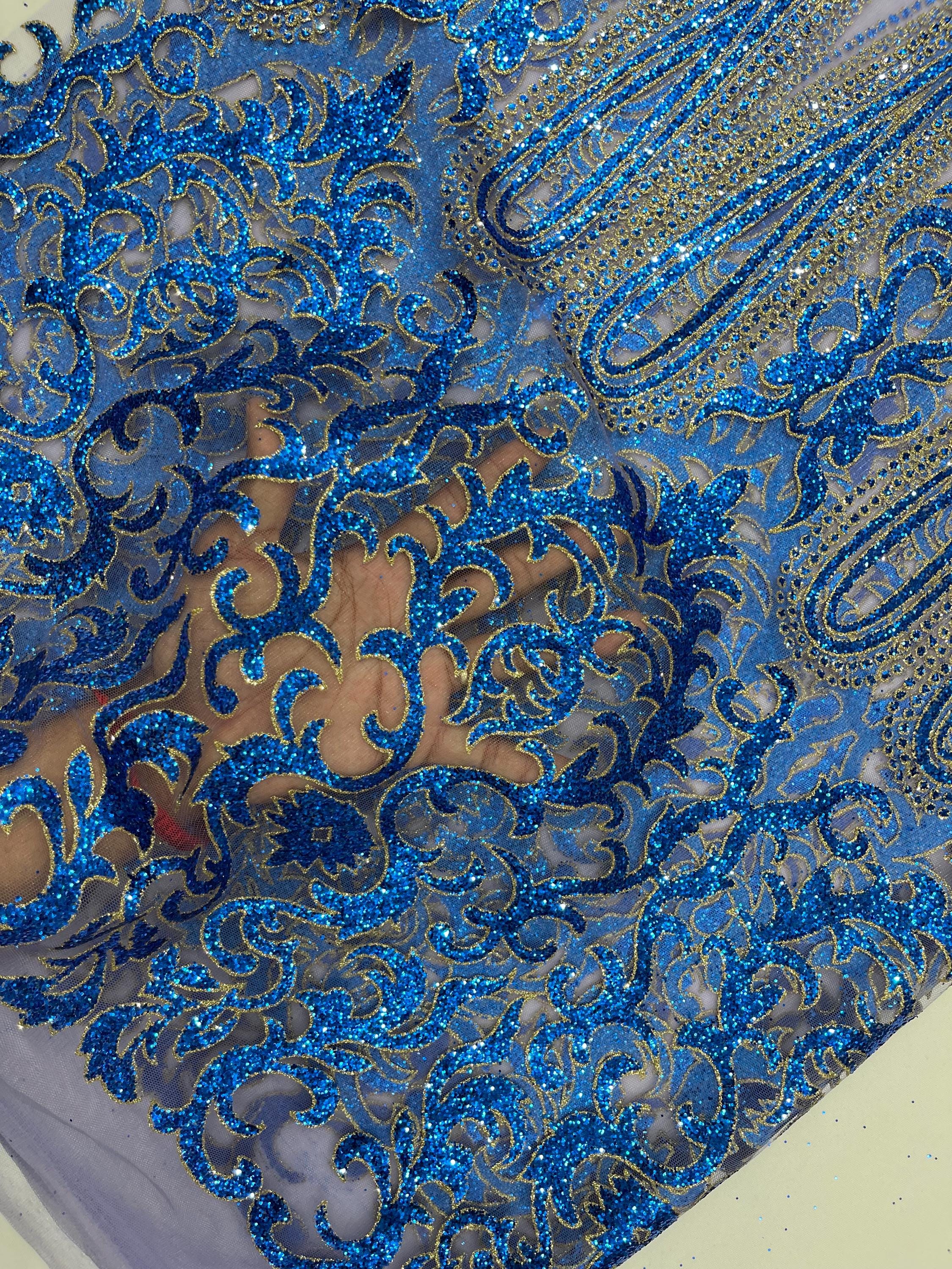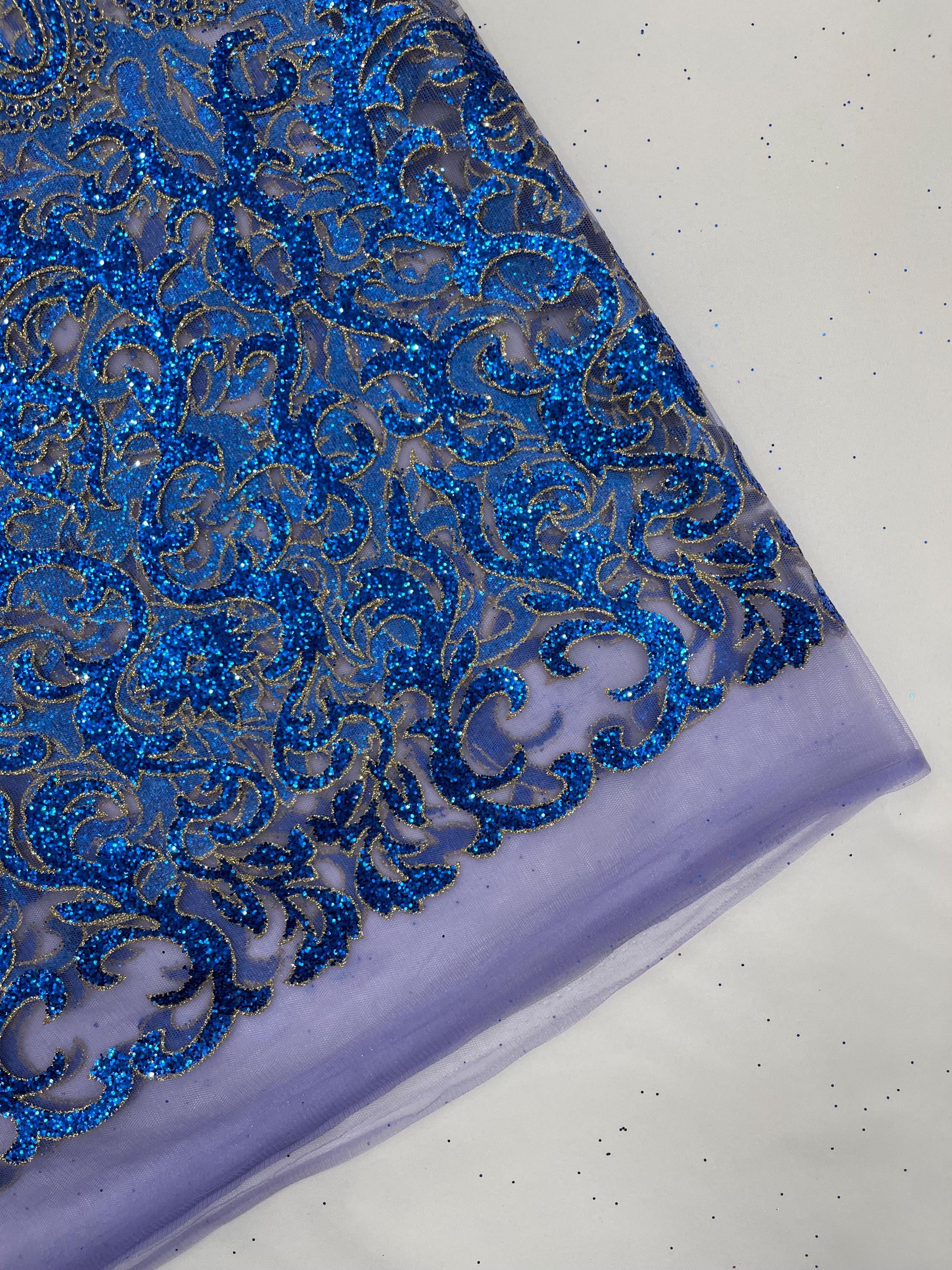 Royal Blue/Gold Glitter Mesh Lace Fabric - Geometric Damask, Bridal, Prom by the yard