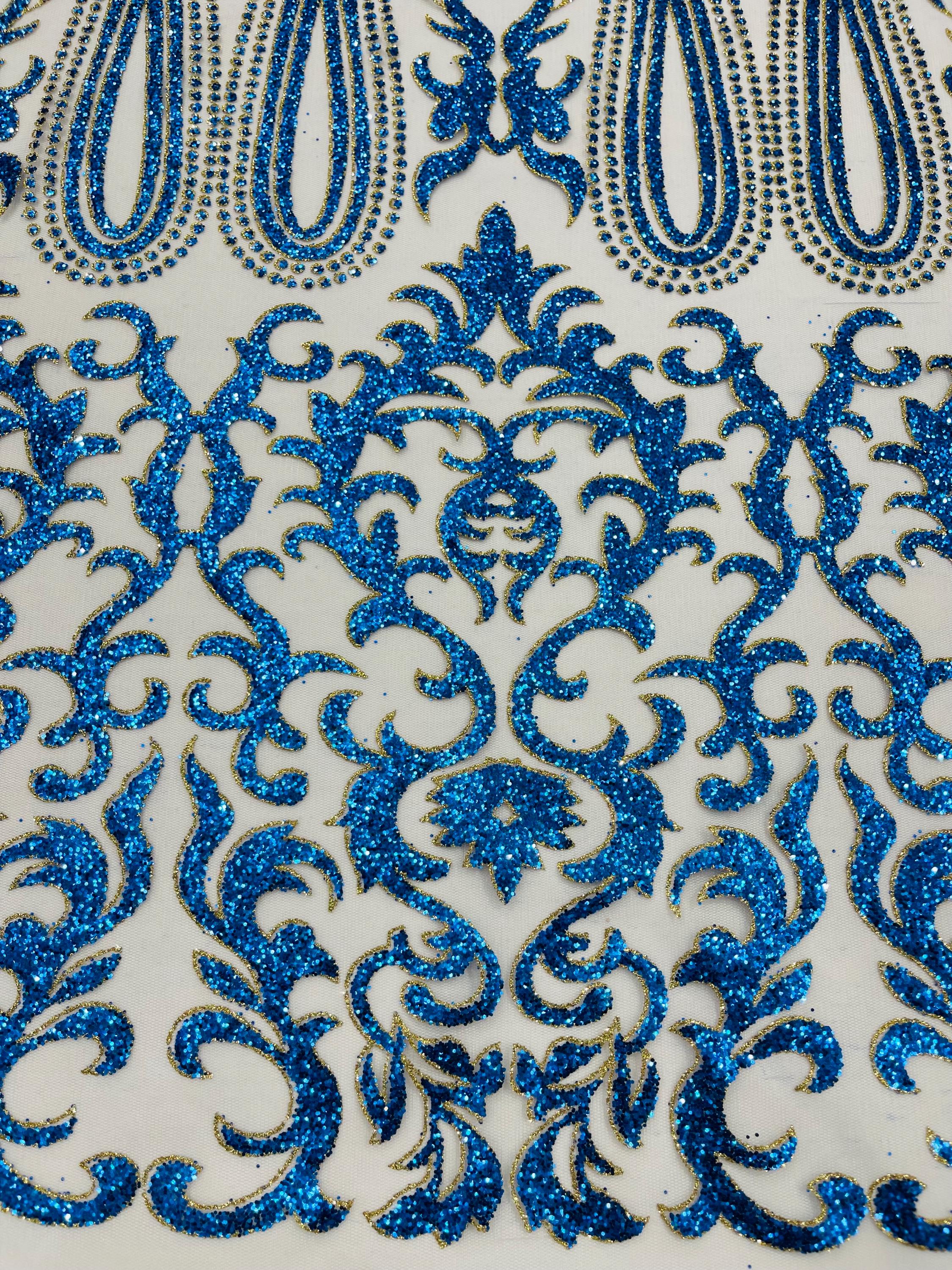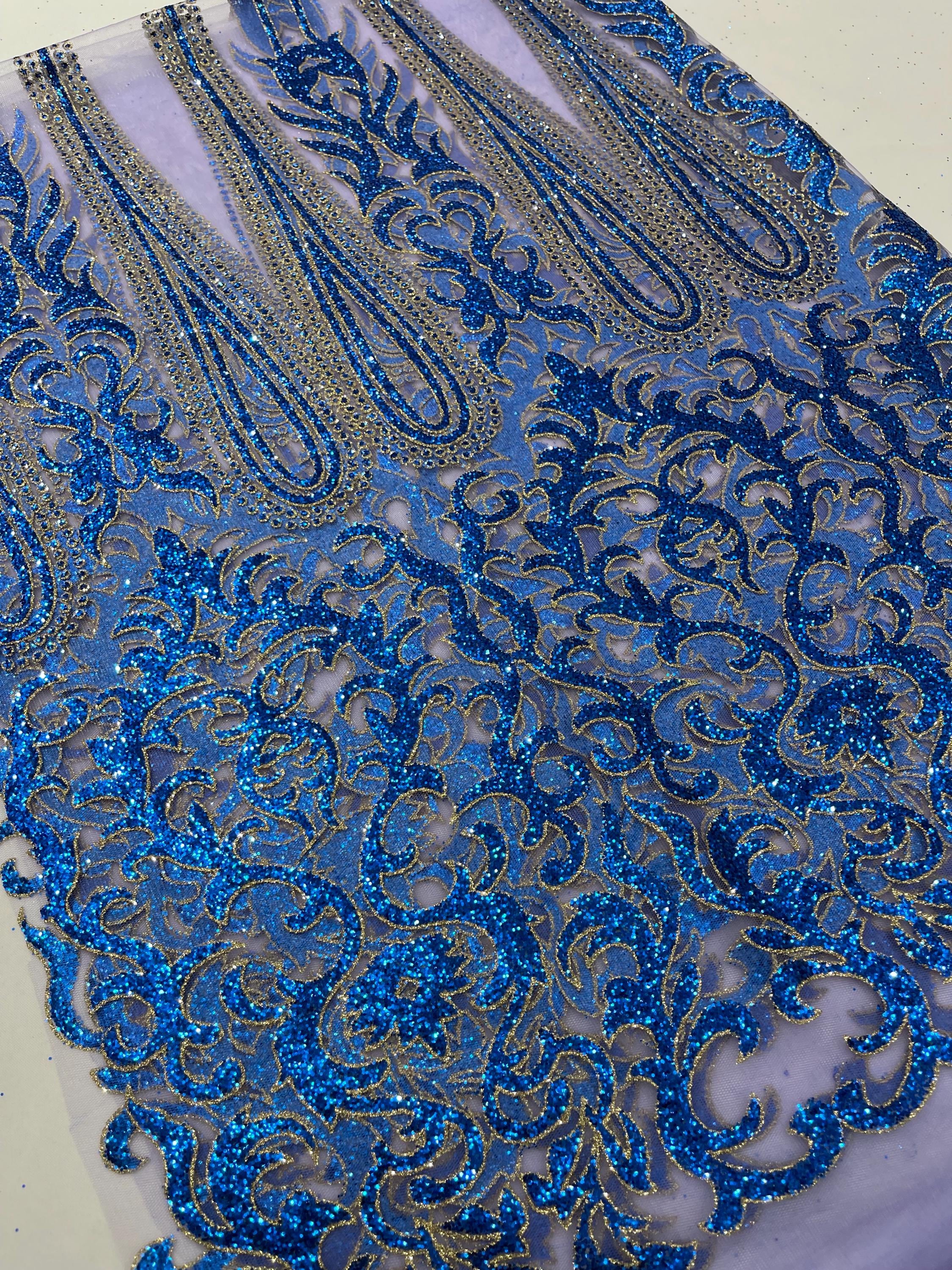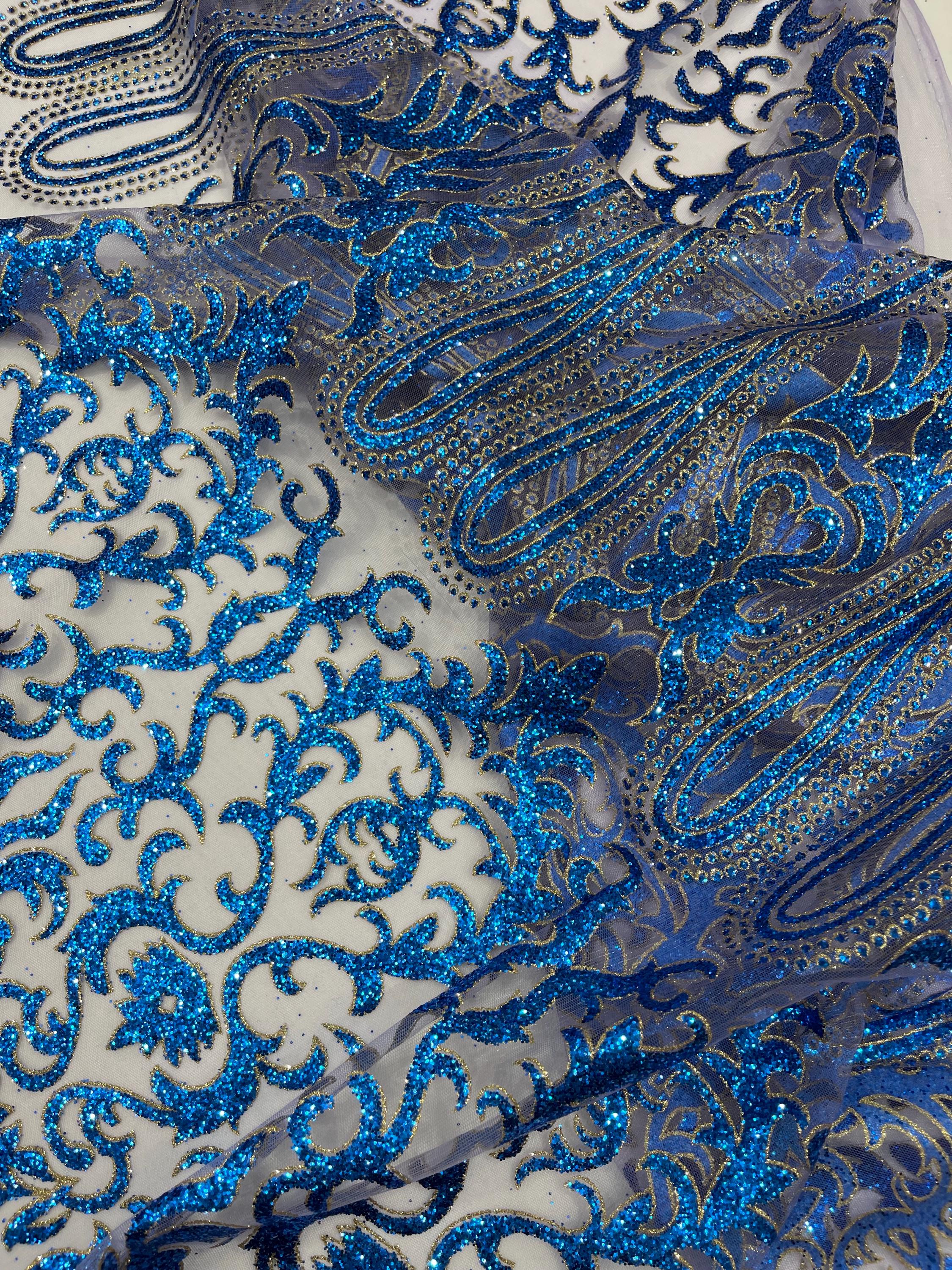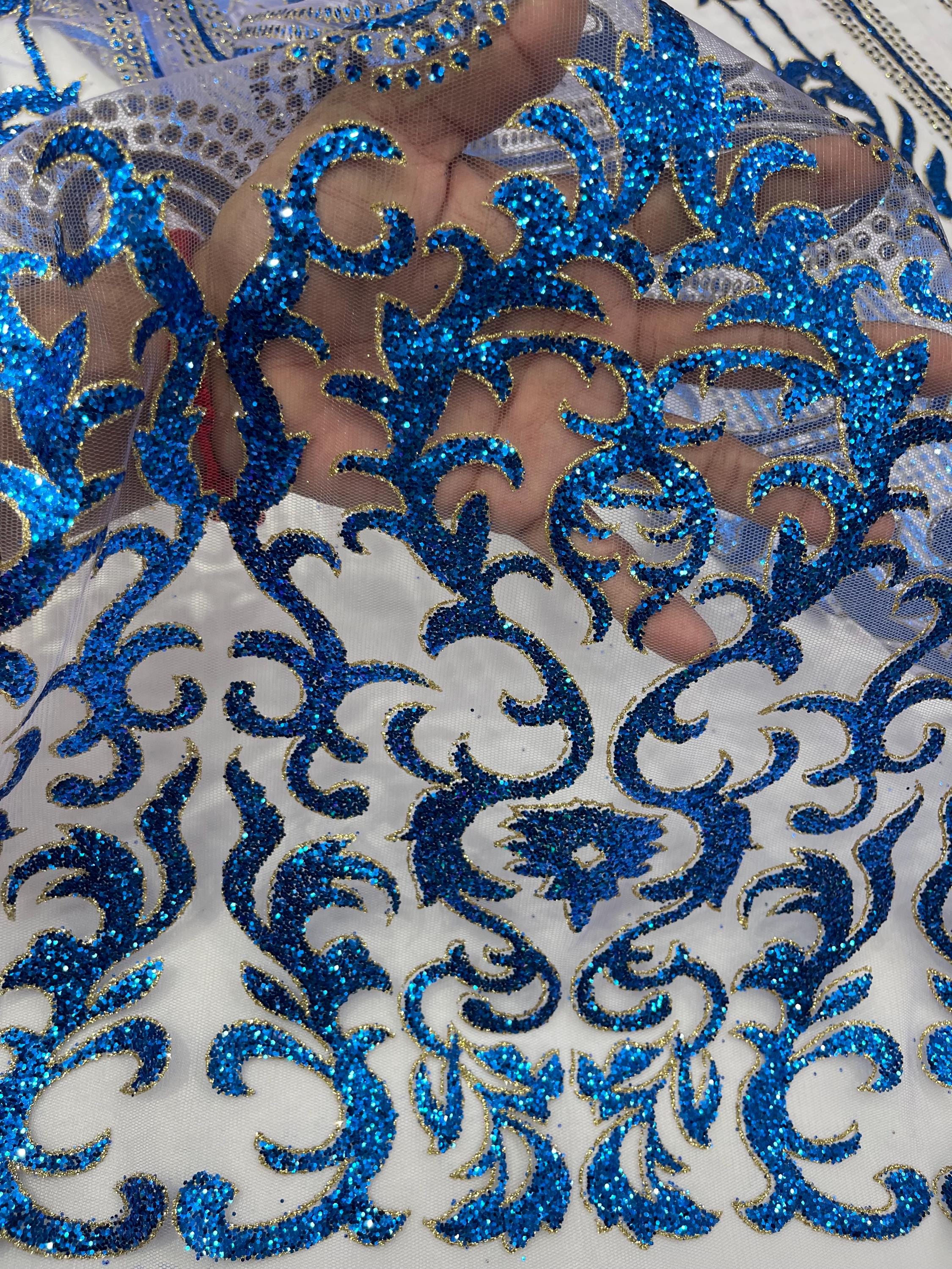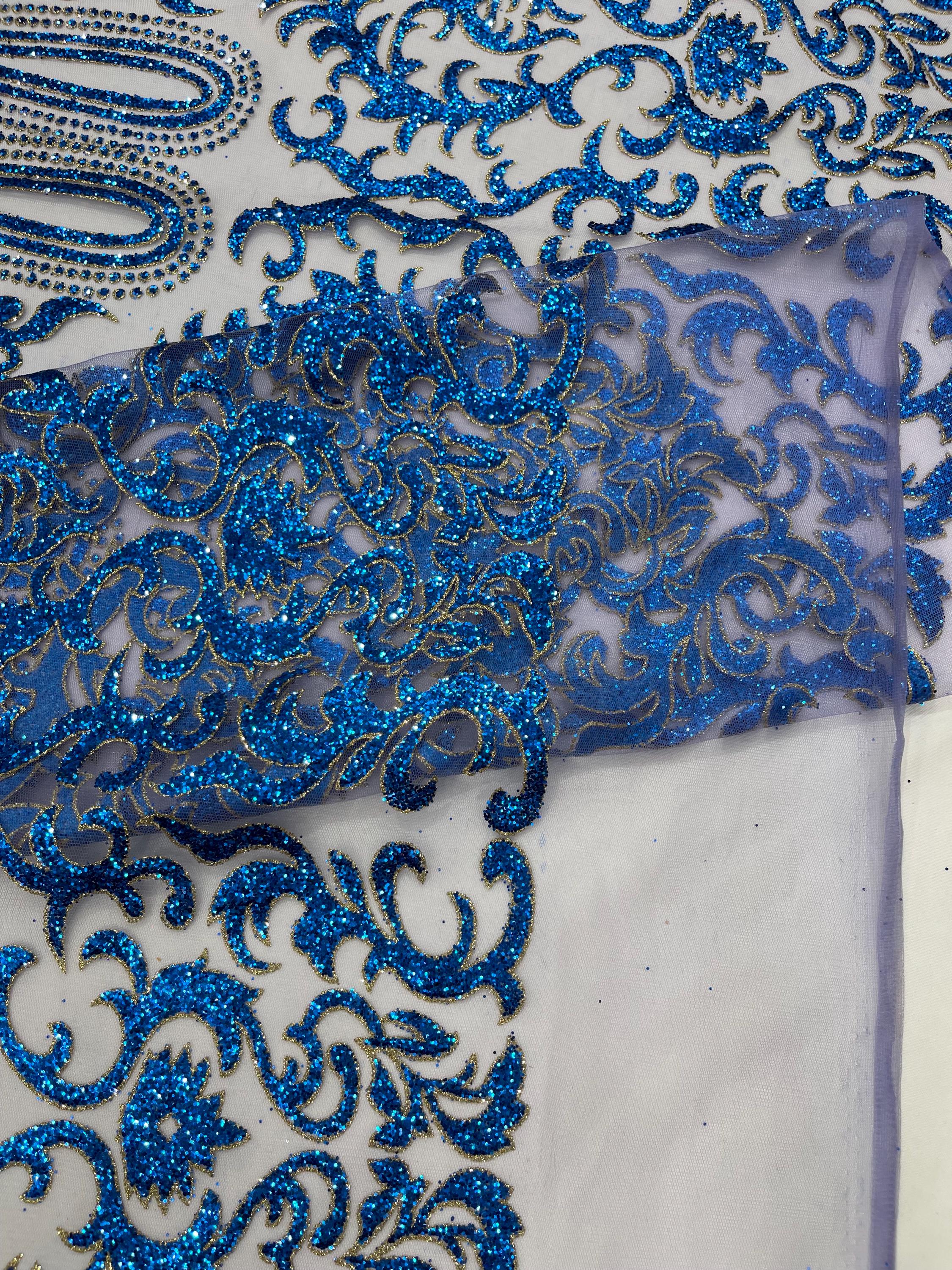 Royal Blue/Gold Glitter Mesh Lace Fabric - Geometric Damask, Bridal, Prom by the yard