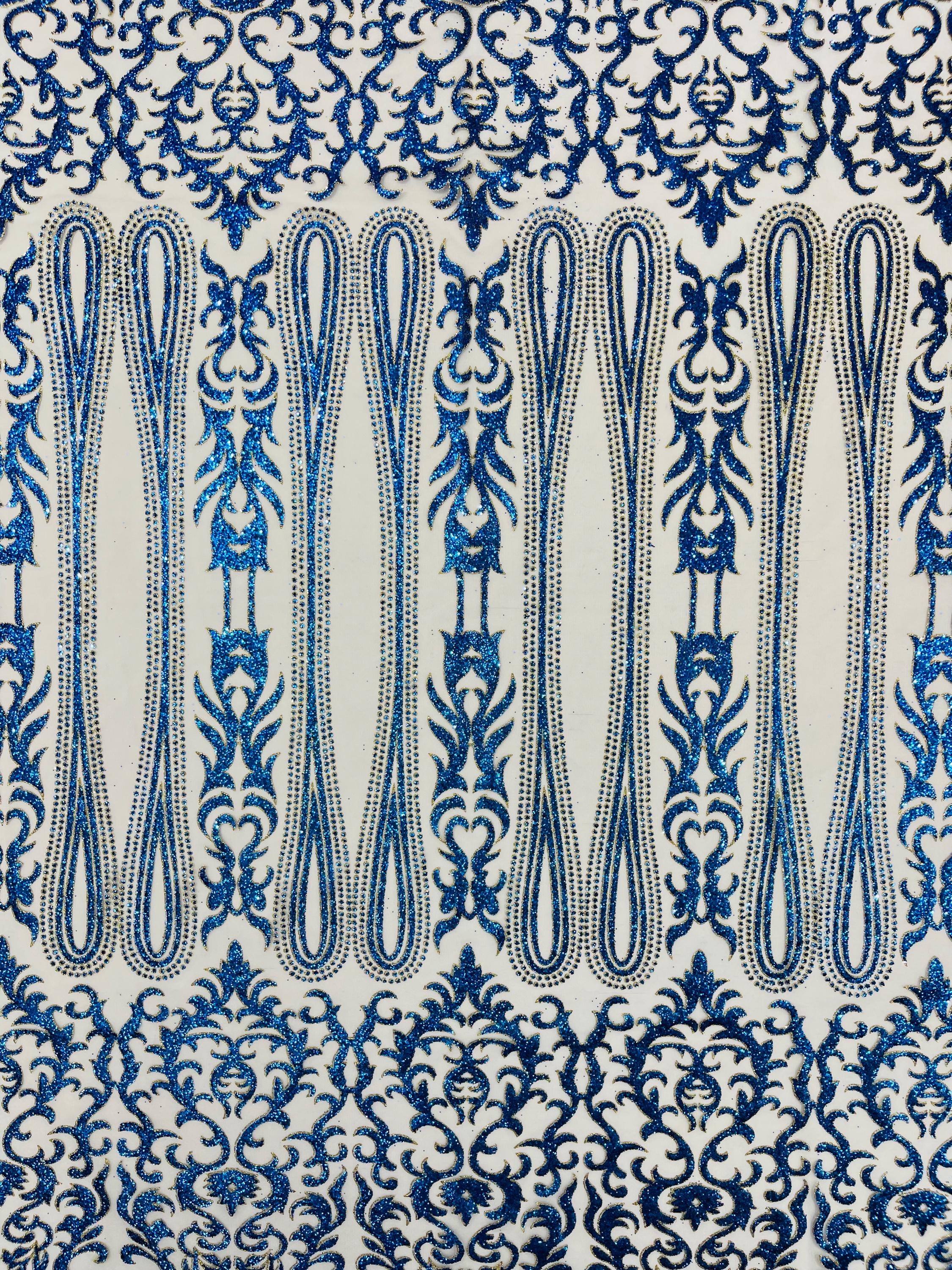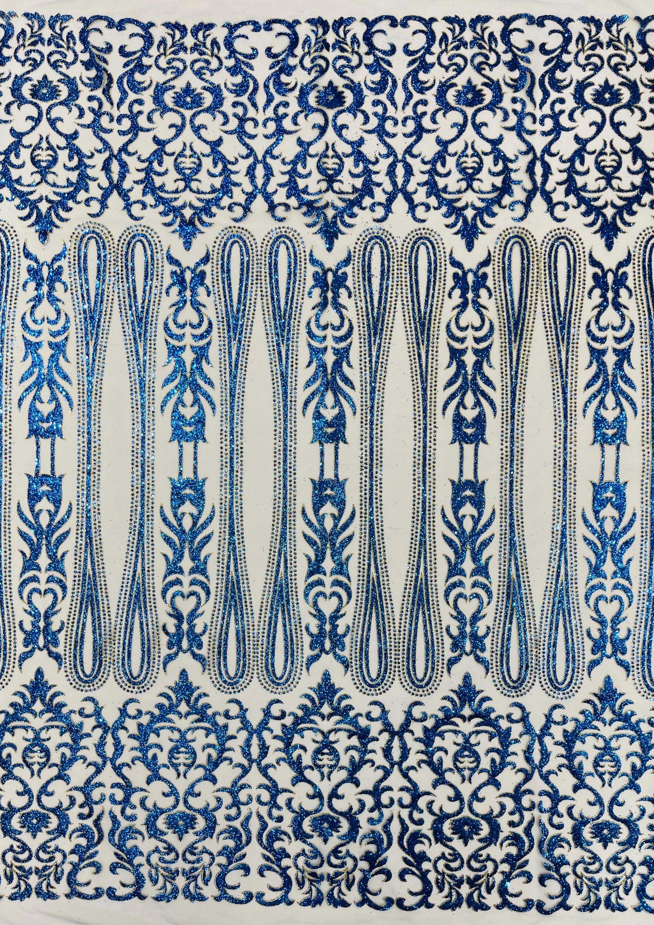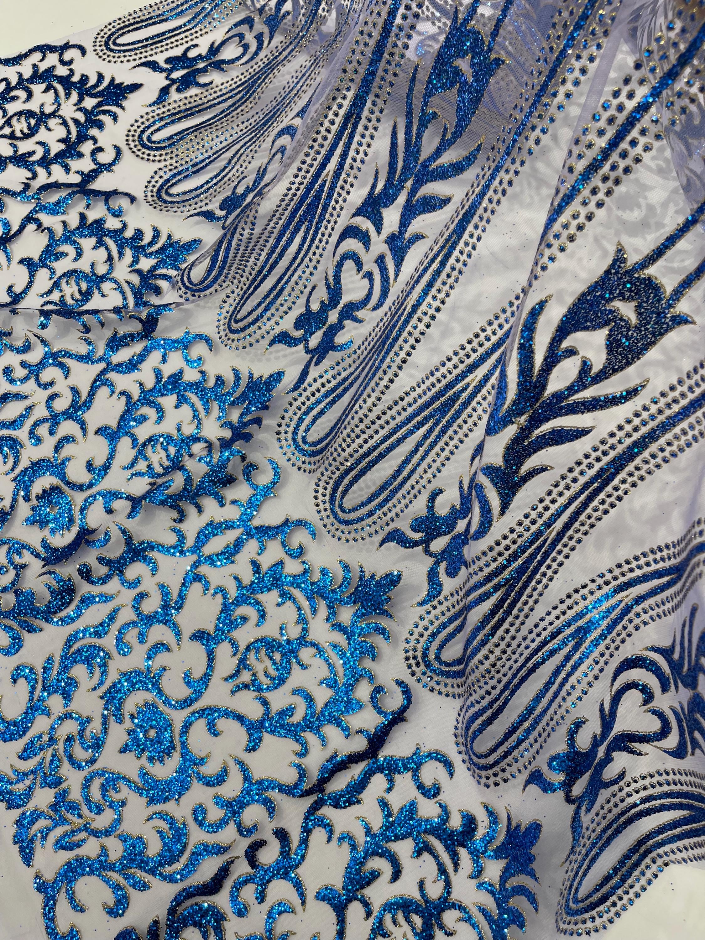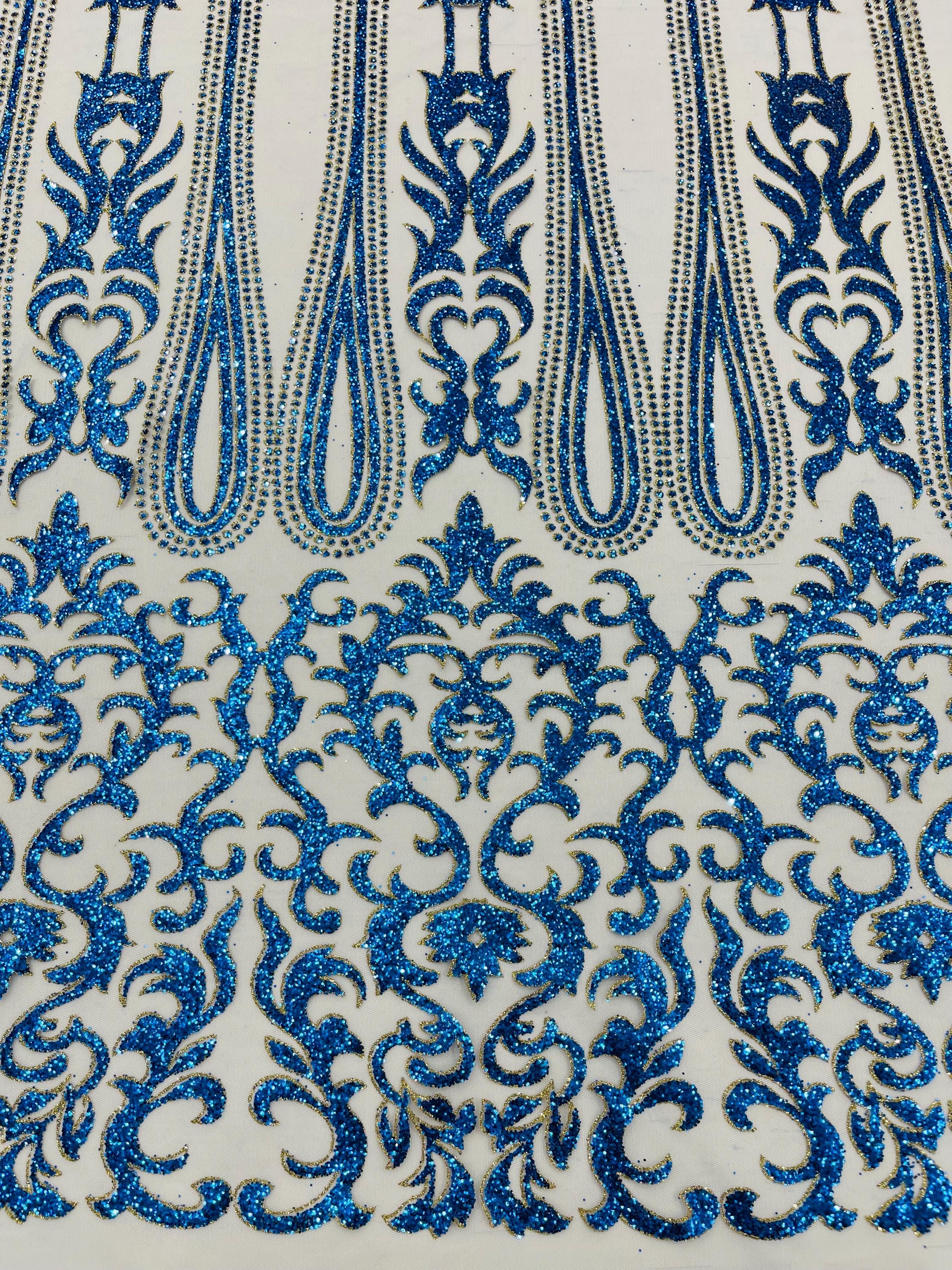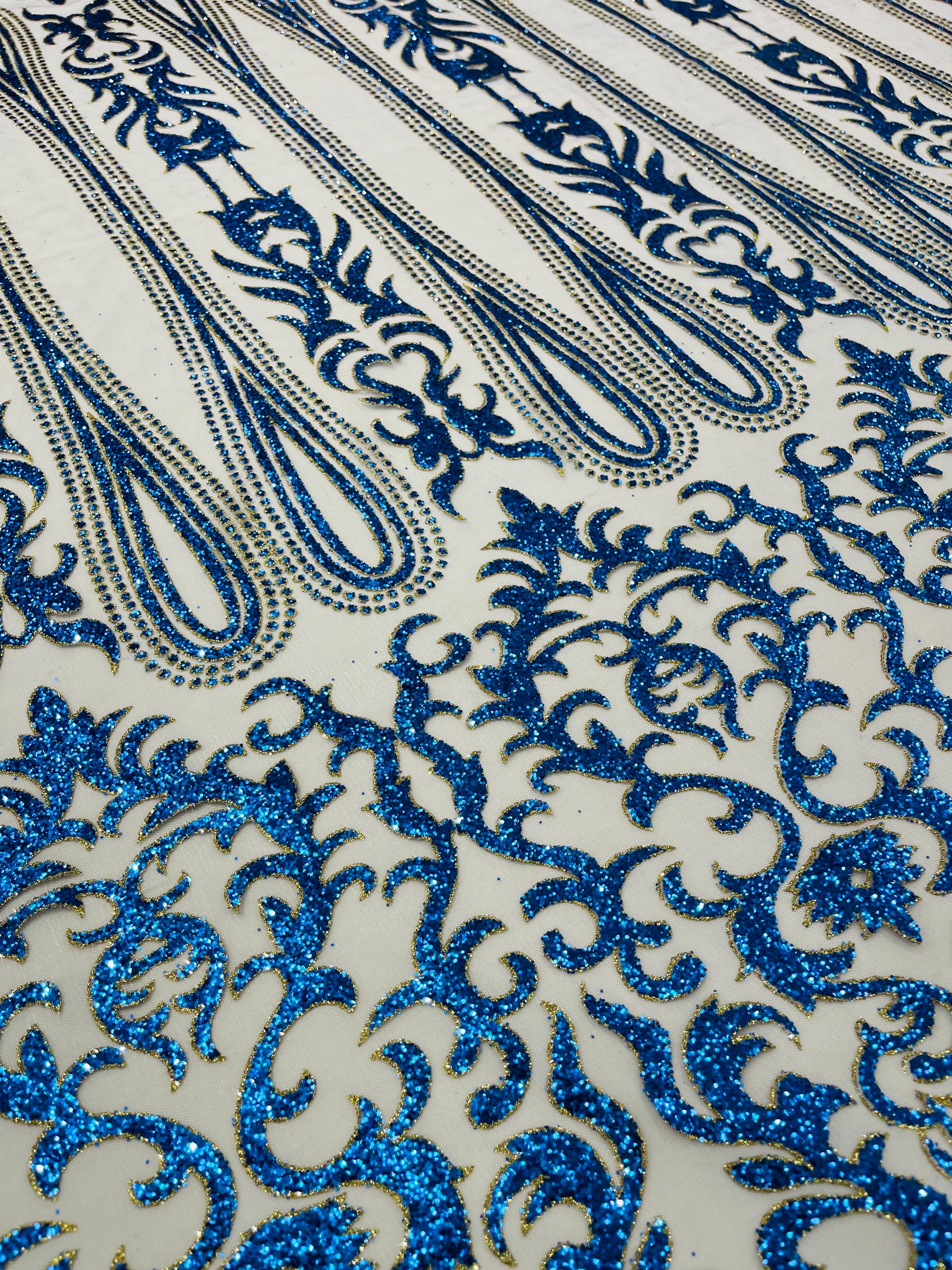 Royal Blue/Gold Glitter Mesh Lace Fabric - Geometric Damask, Bridal, Prom by the yard