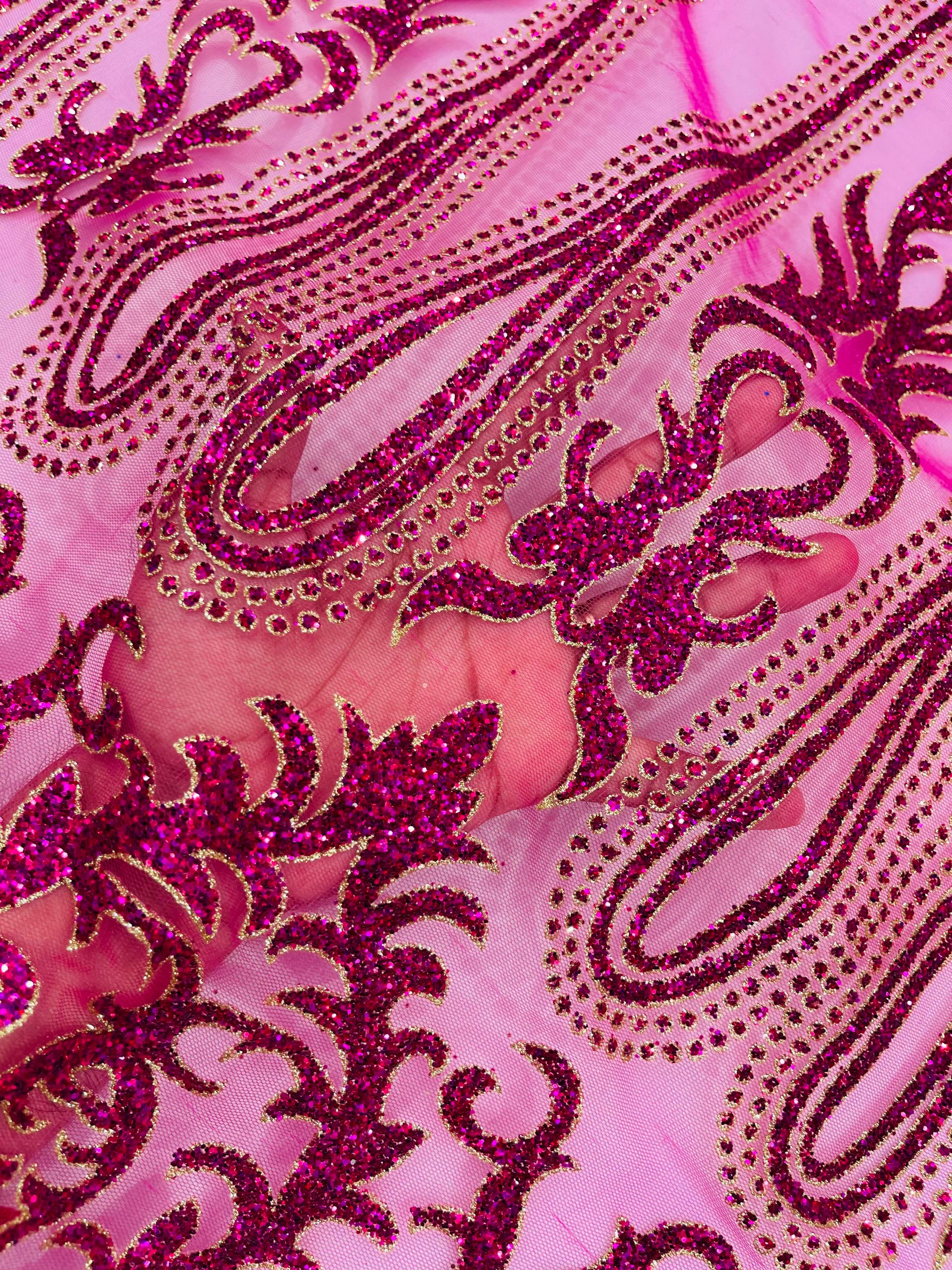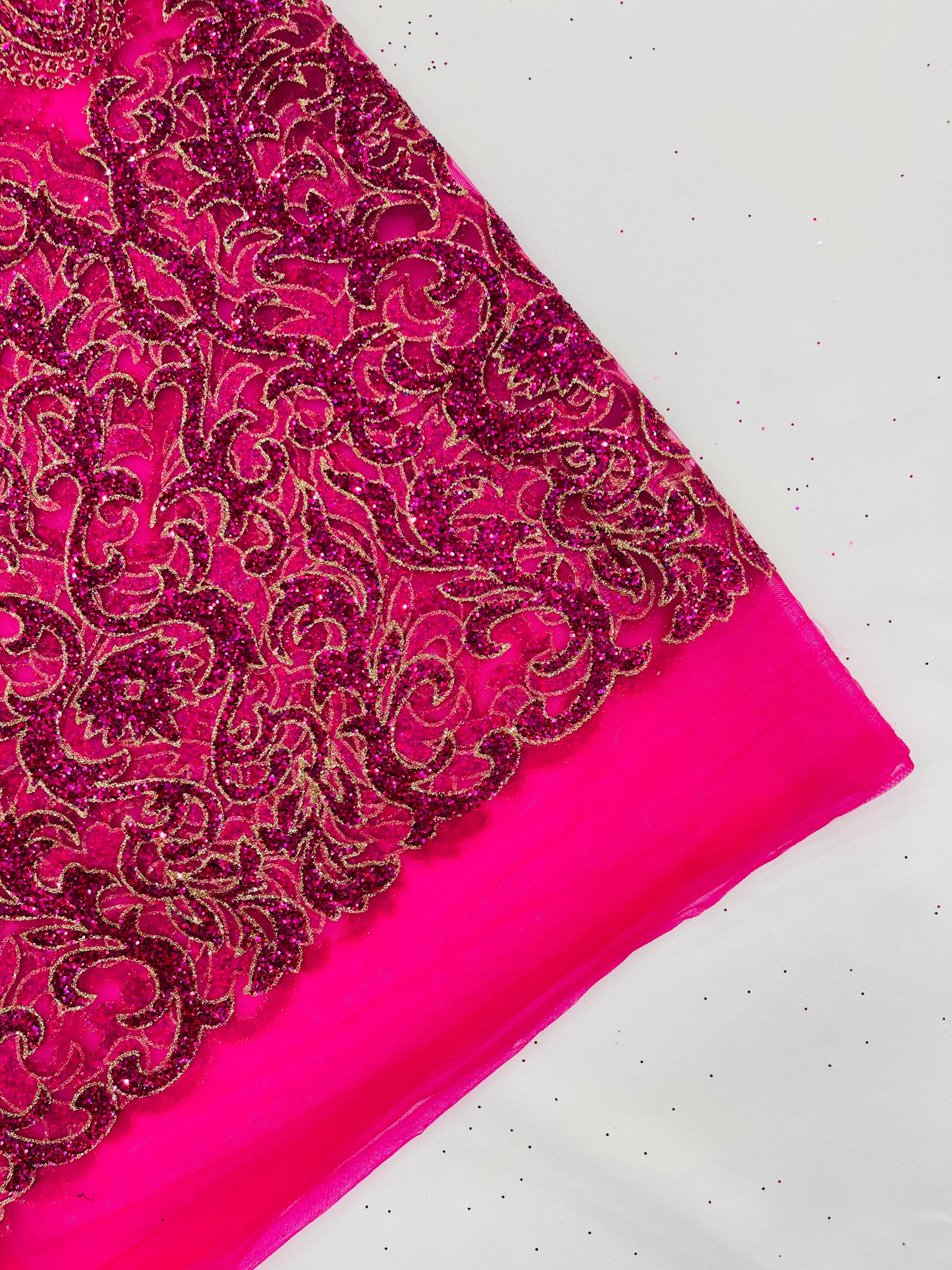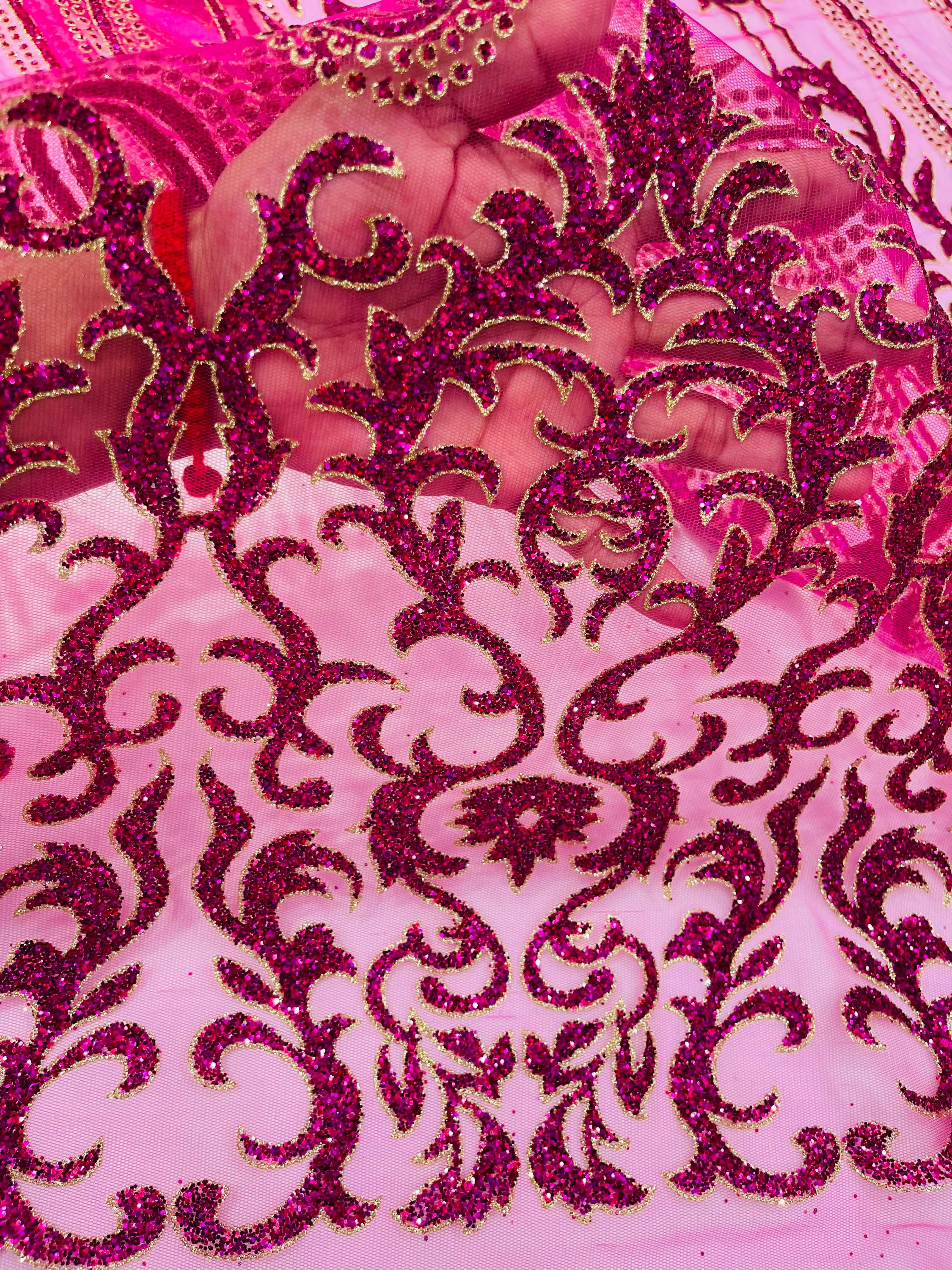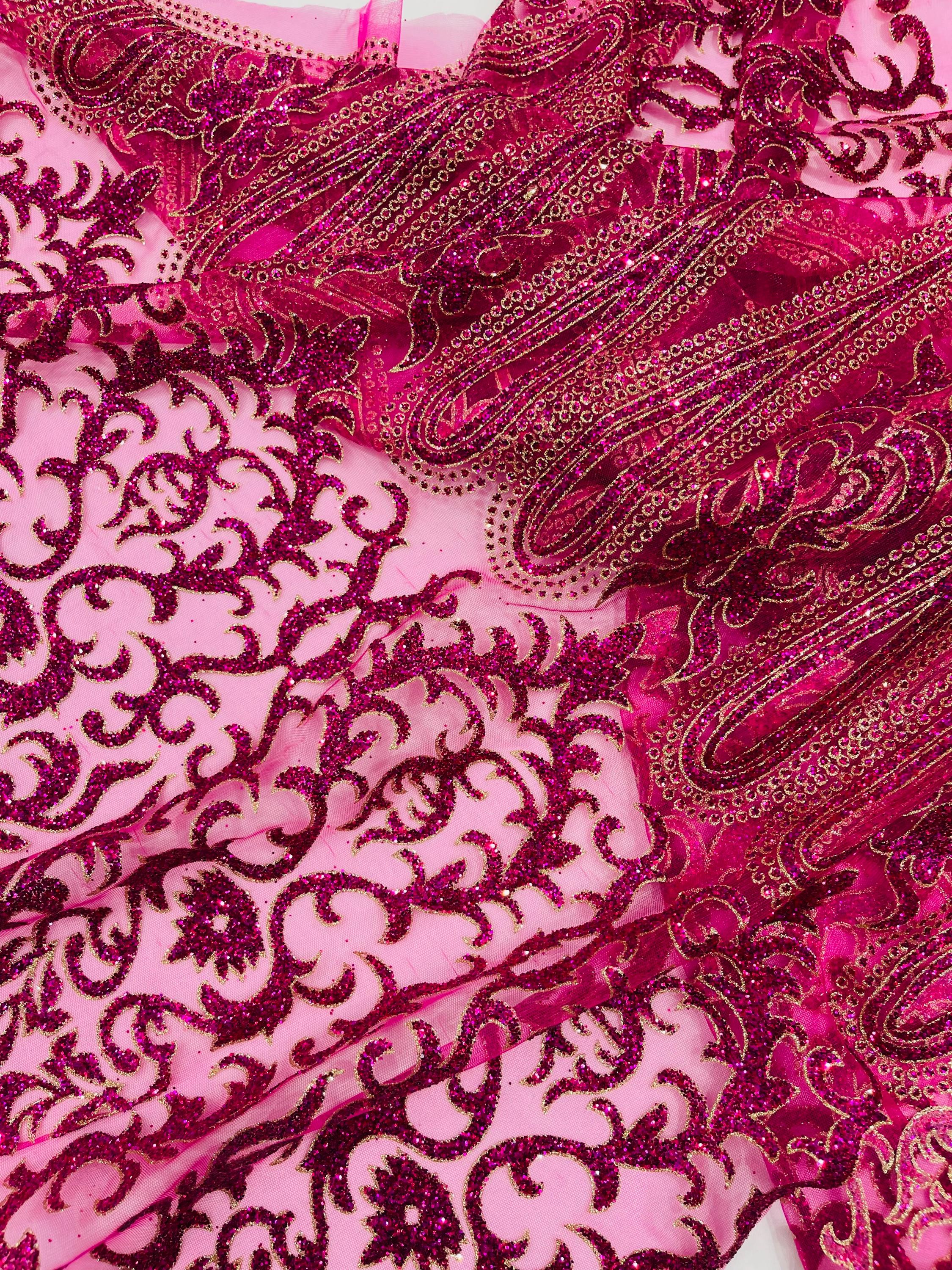 This elegant Glitter on mesh, Stand out magnificently as you gracefully appear wearing this stunning fabric. This lace has small Glitters glued on the mesh fabric and sheds too. Also this fabric is sheer with lots of glitters. If there is any shedding, it remains very sparkly. The whole Fabric Intricate throughout with color Glitter giving it a gorgeous and regal feel.