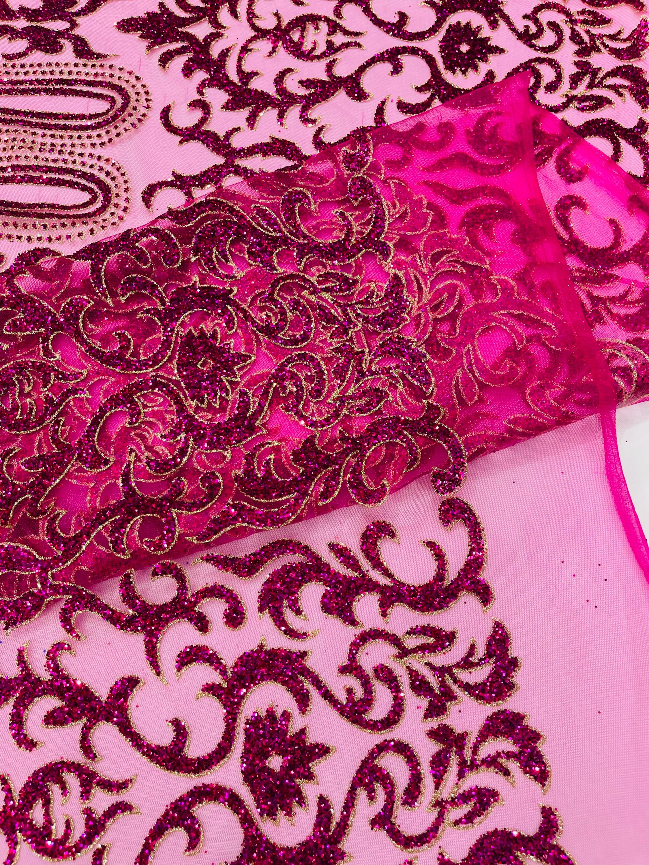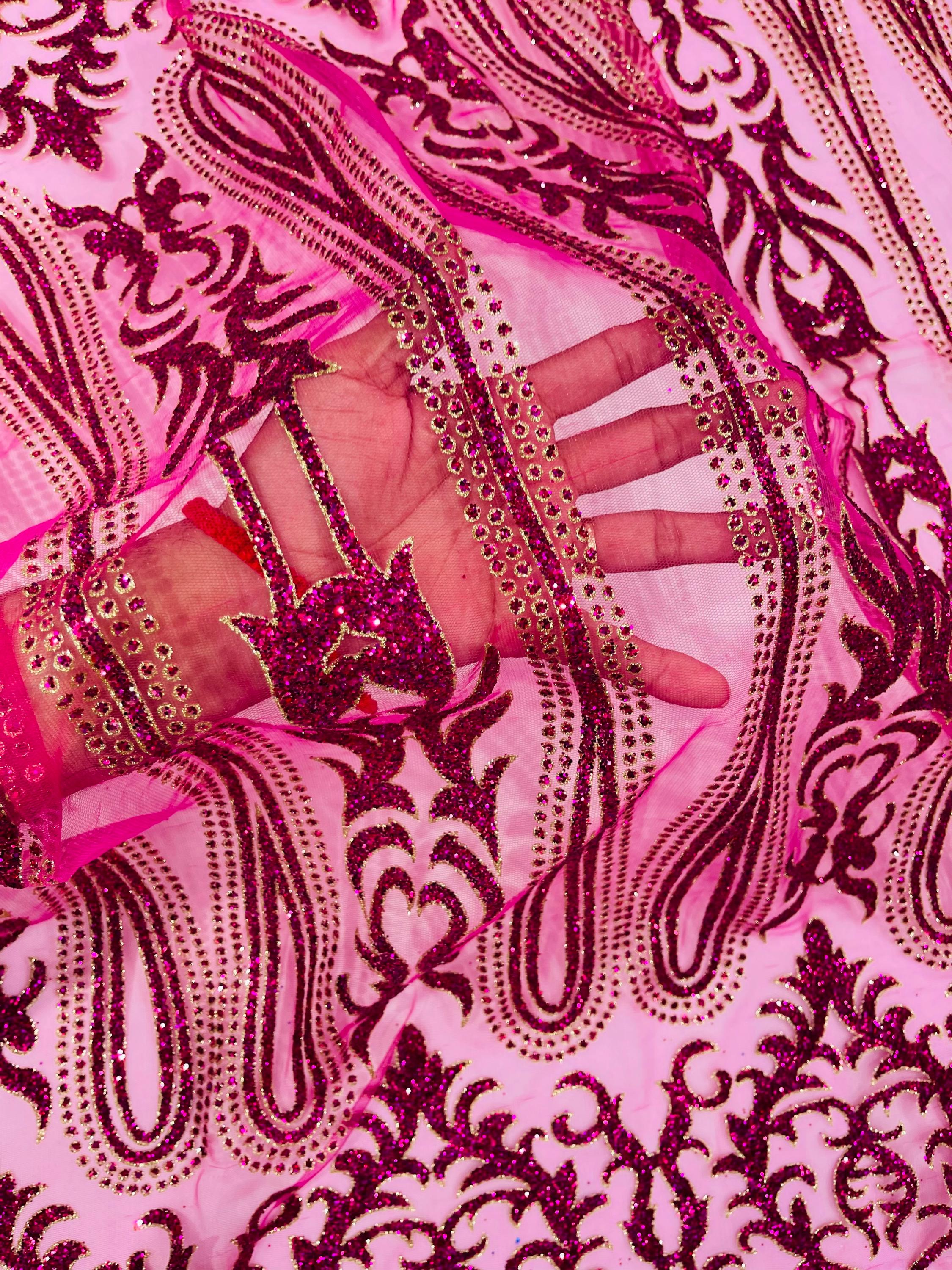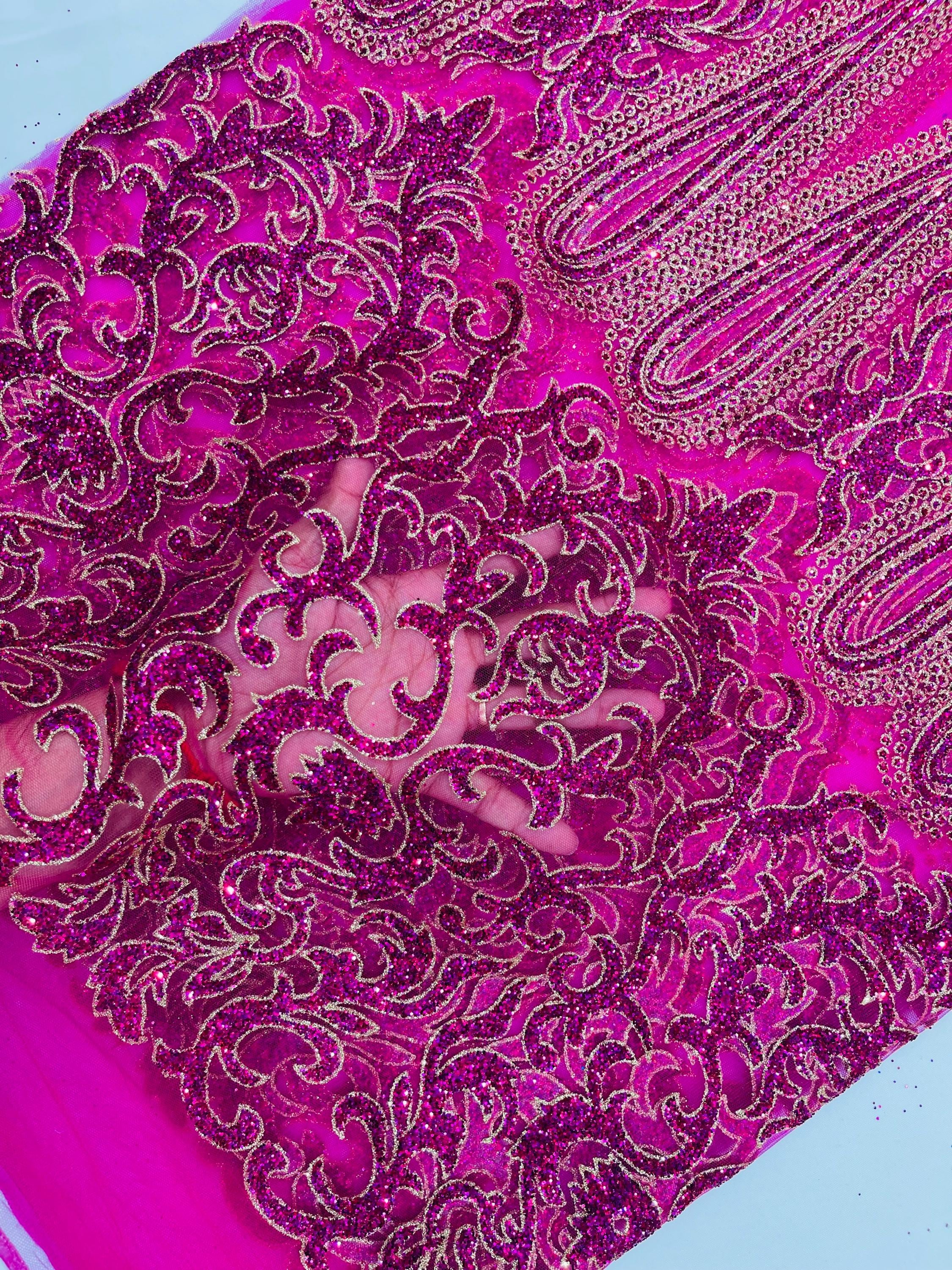This elegant Glitter on mesh, Stand out magnificently as you gracefully appear wearing this stunning fabric. This lace has small Glitters glued on the mesh fabric and sheds too. Also this fabric is sheer with lots of glitters. If there is any shedding, it remains very sparkly. The whole Fabric Intricate throughout with color Glitter giving it a gorgeous and regal feel.