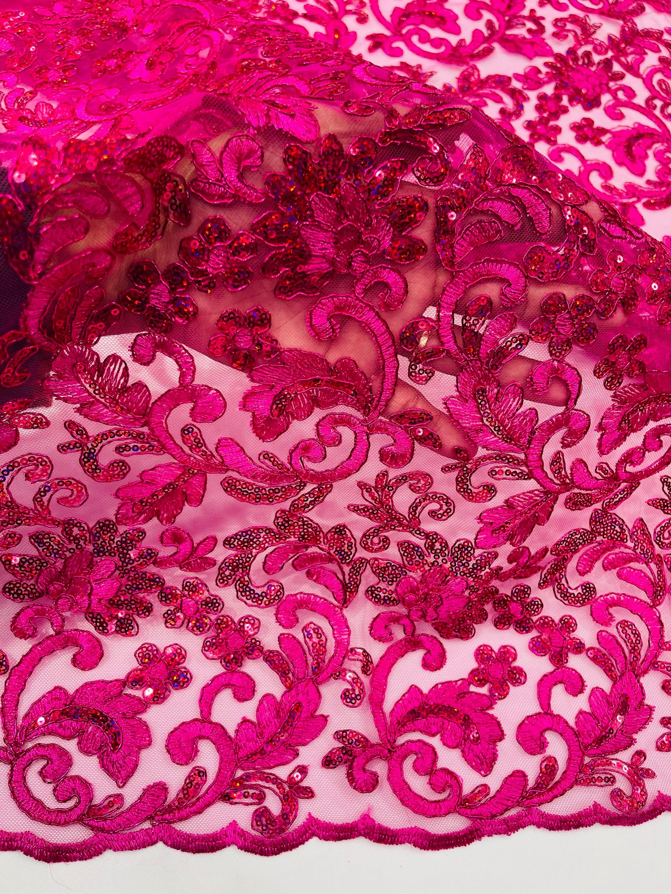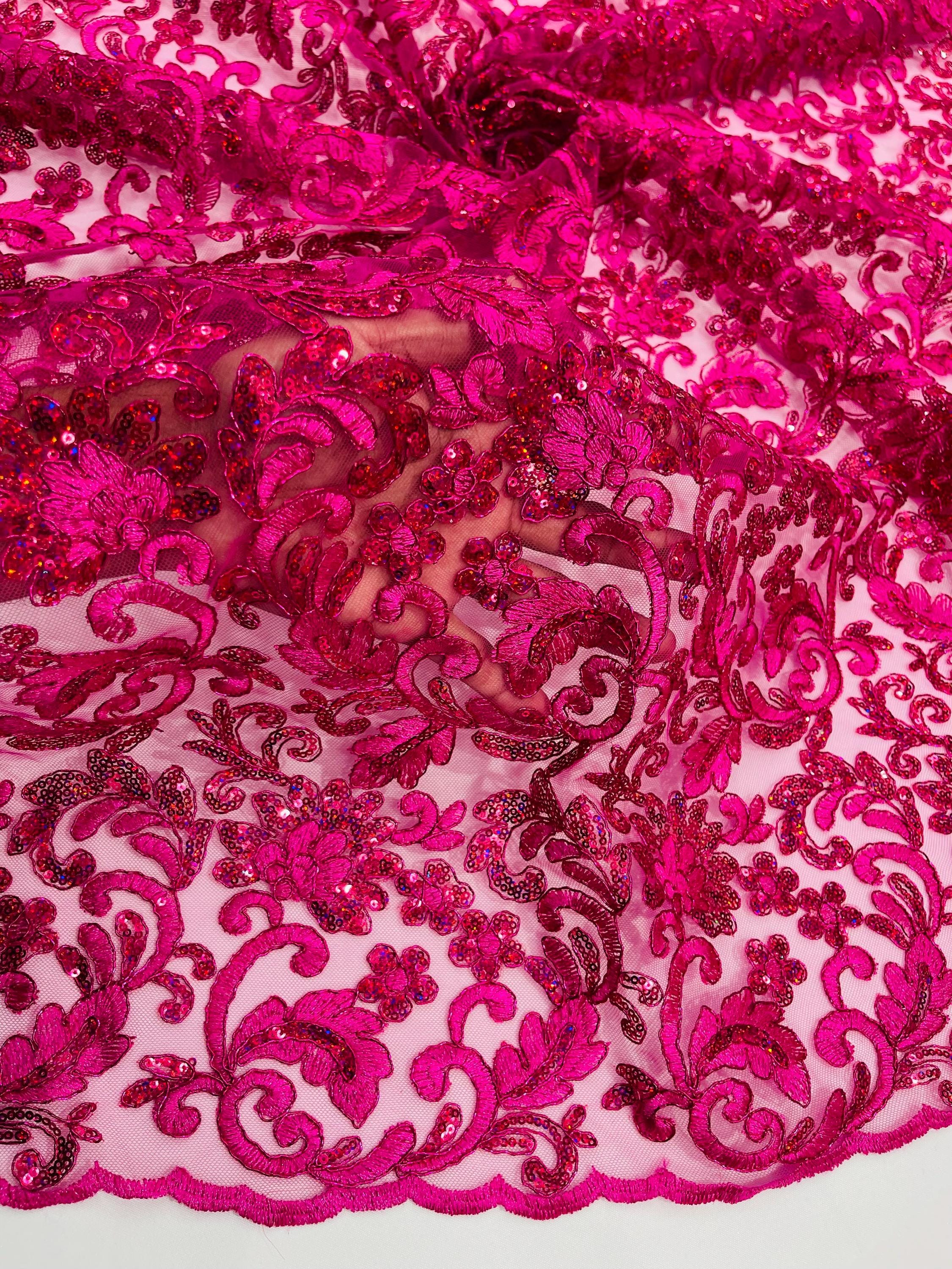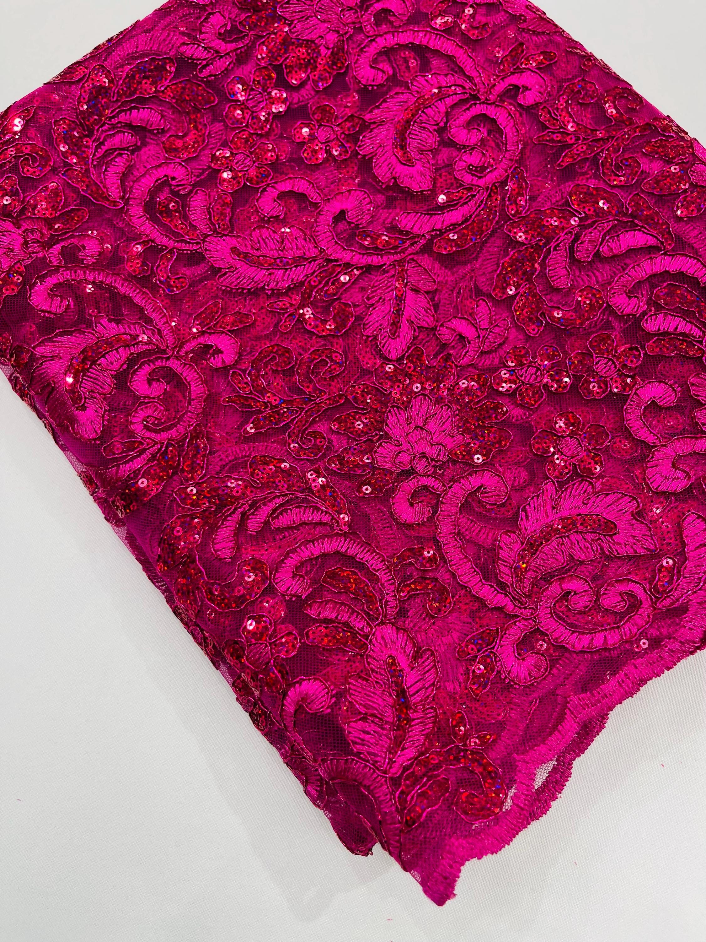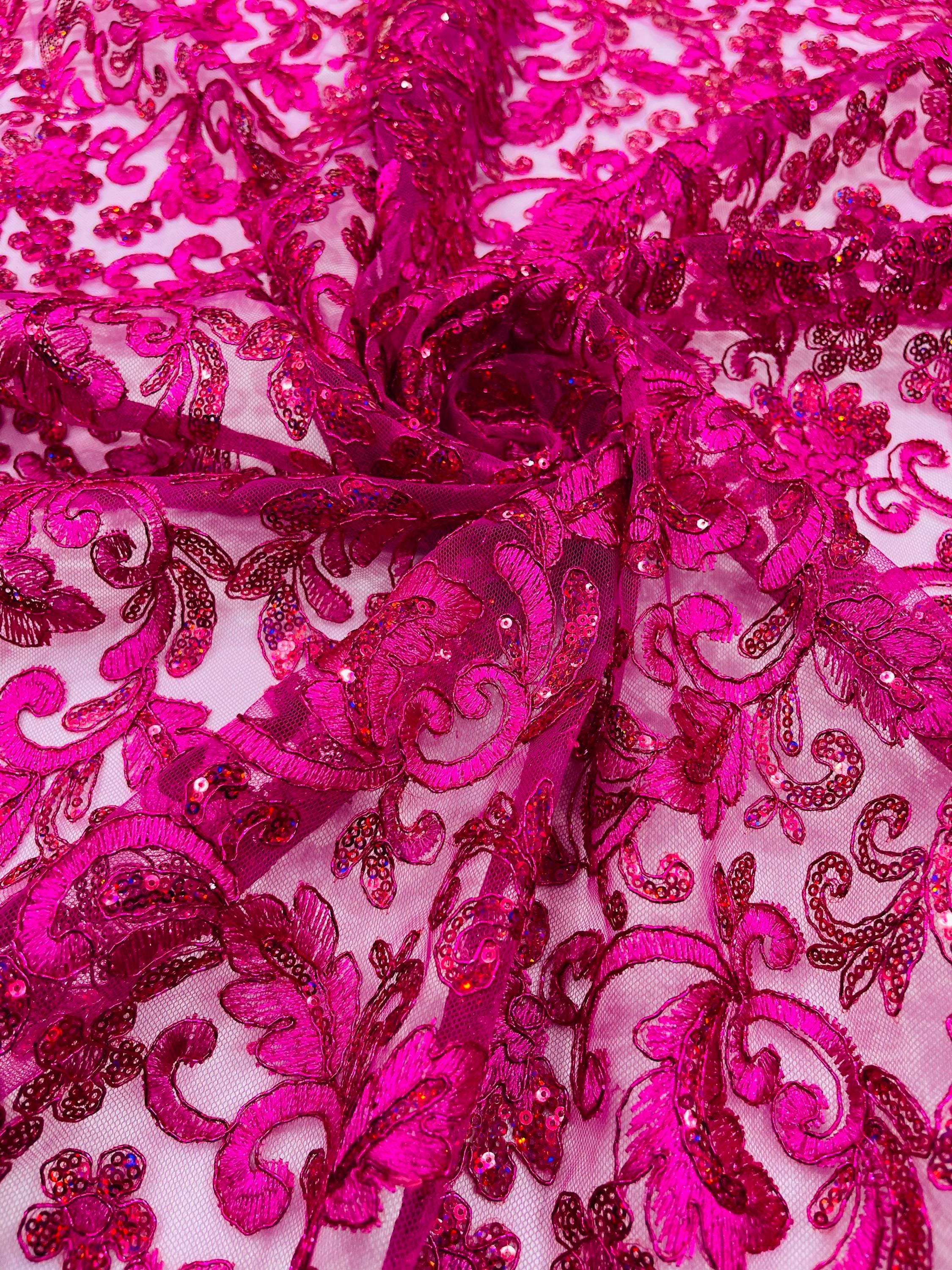 Fuchsia Metallic Corded Flower Lace Fabric by the yard: Embroider With Holographic Sequins Fabric