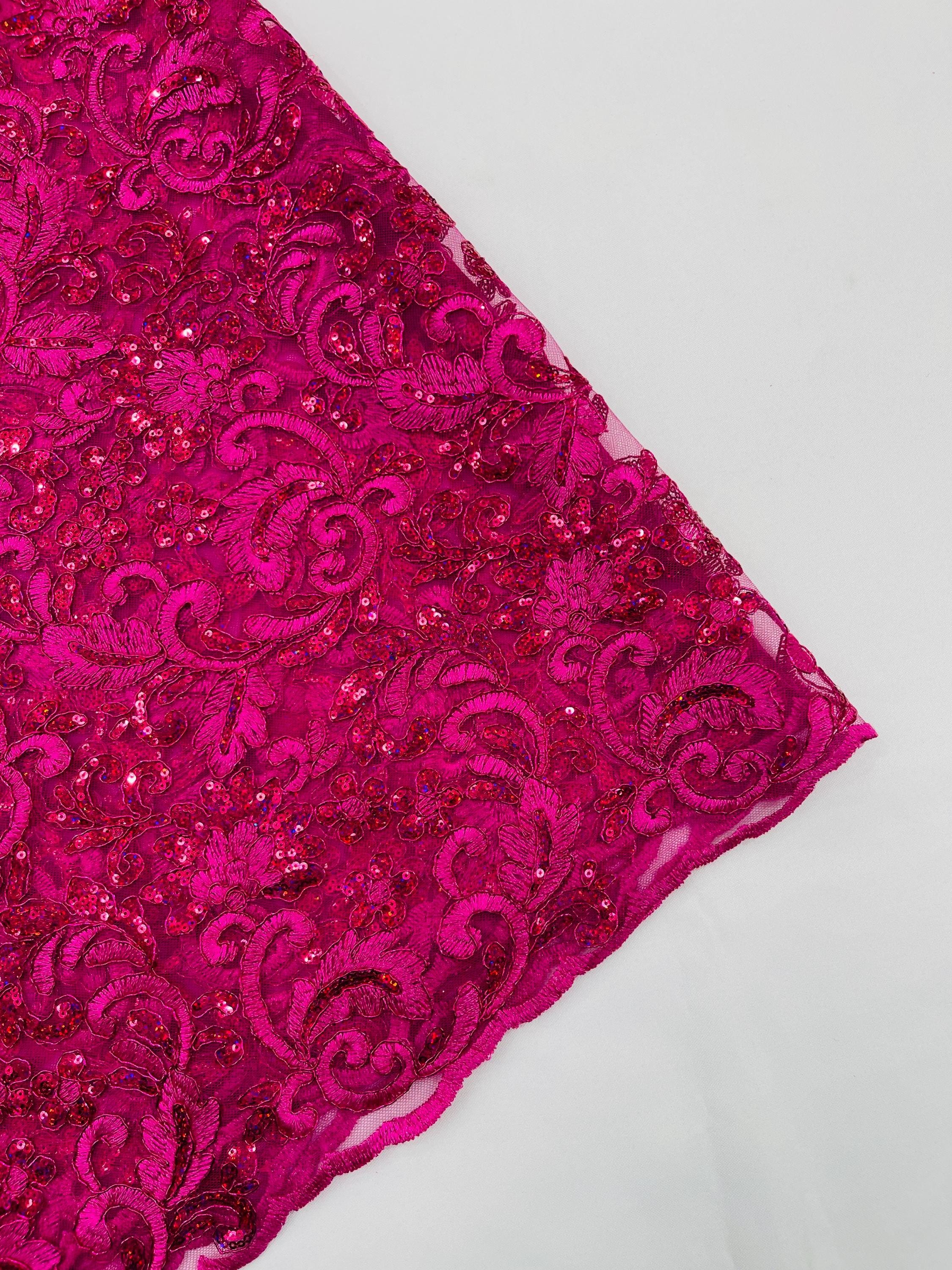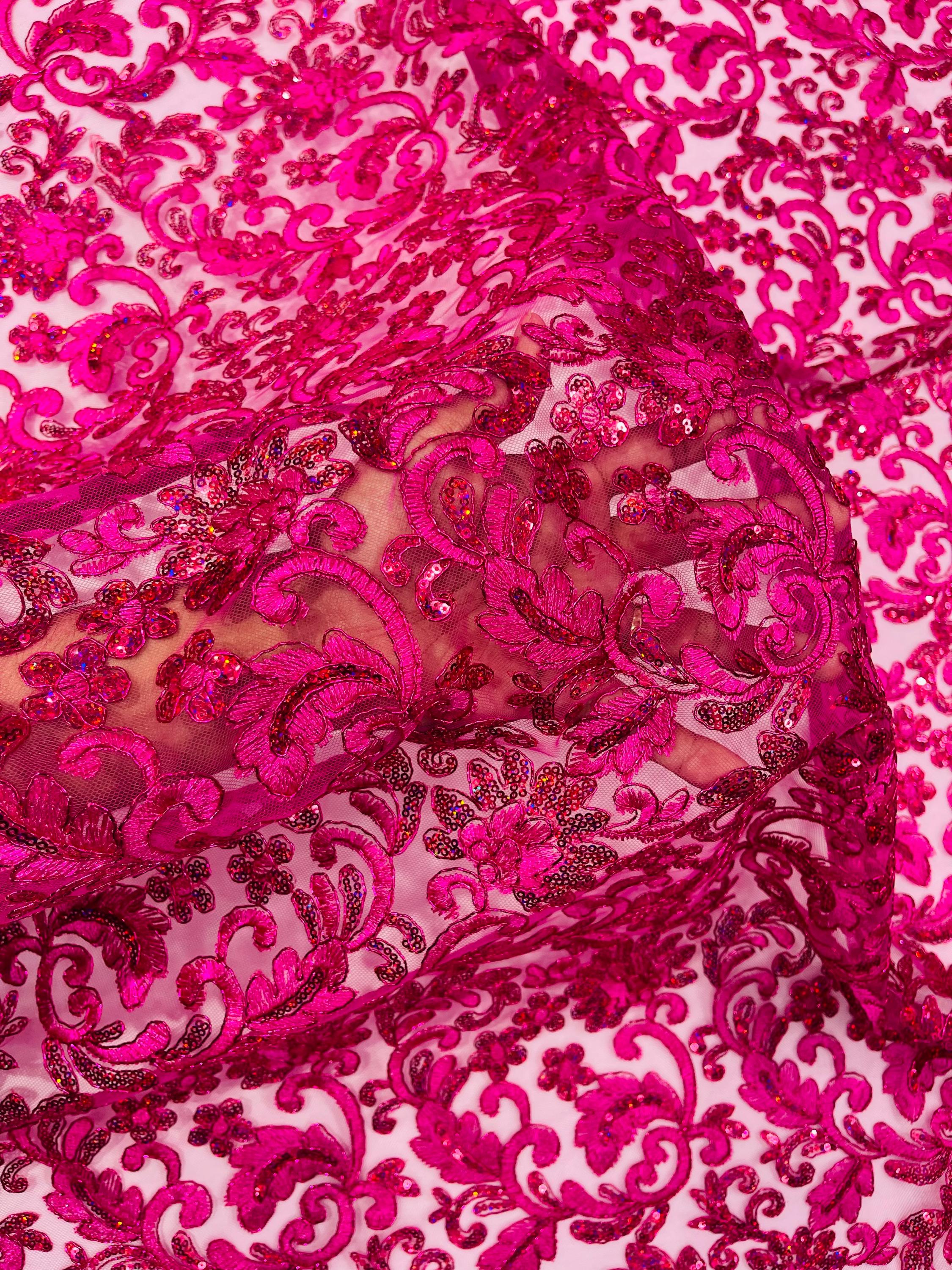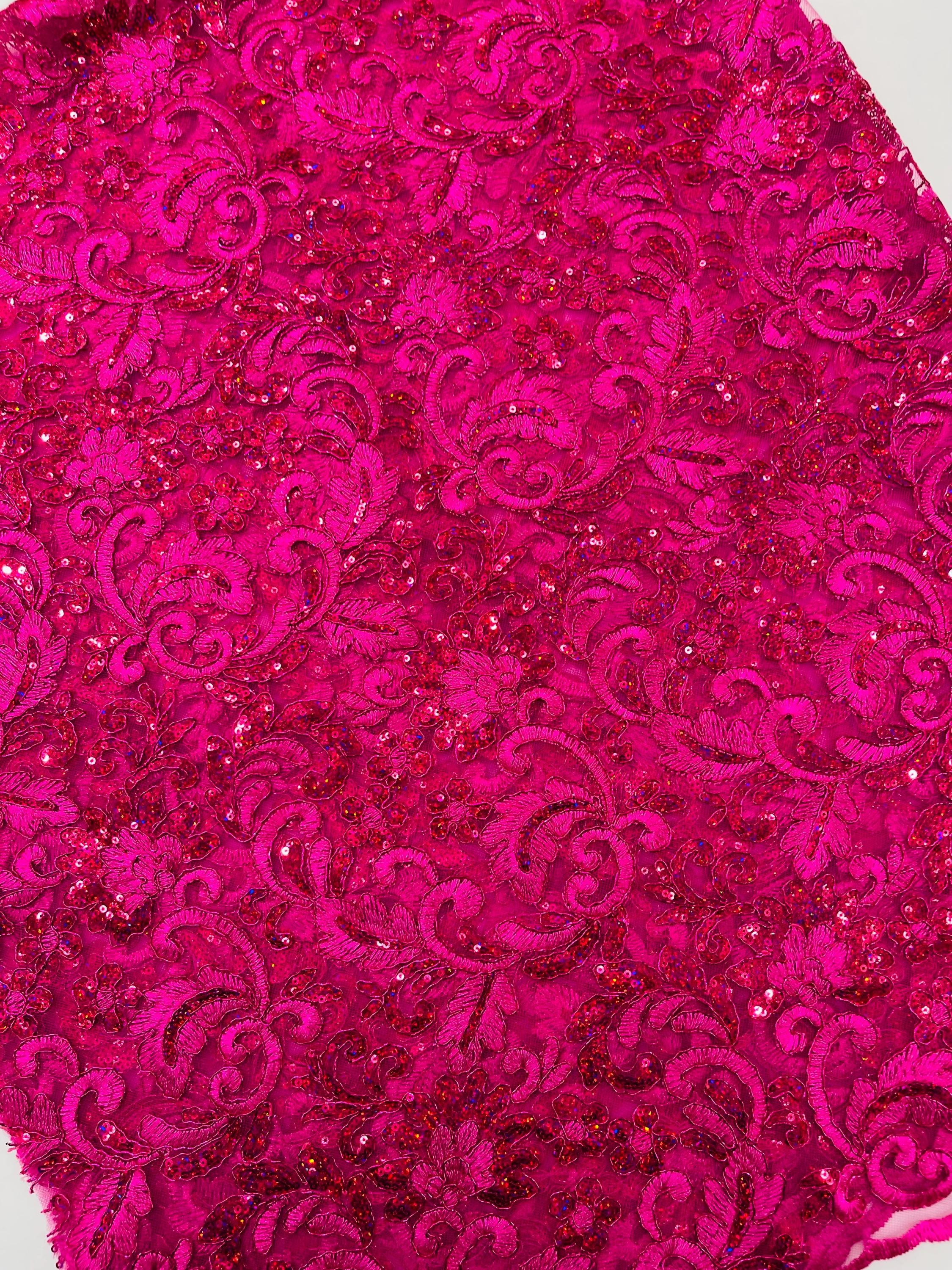 Fuchsia Metallic Corded Flower Lace Fabric by the yard: Embroider With Holographic Sequins Fabric