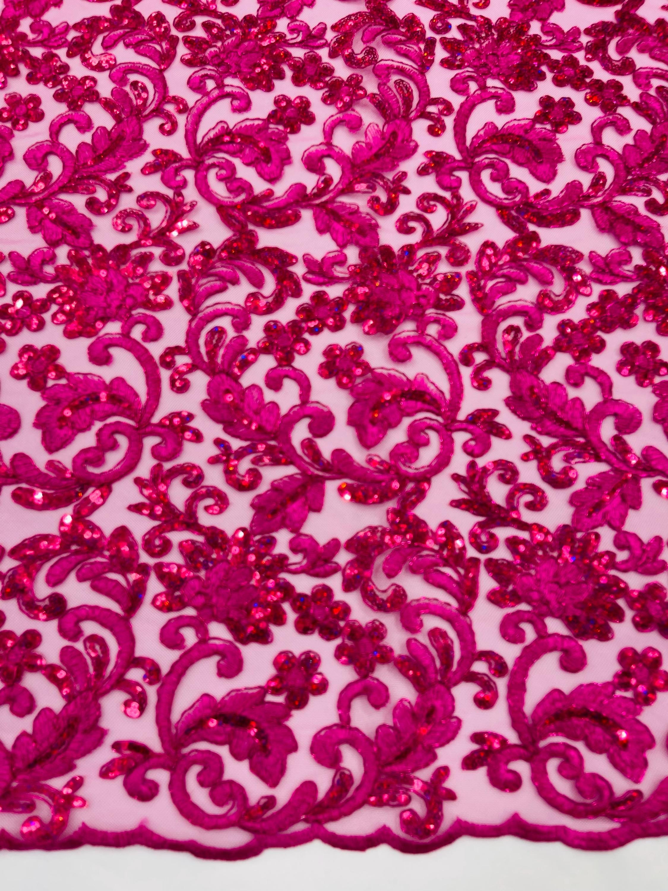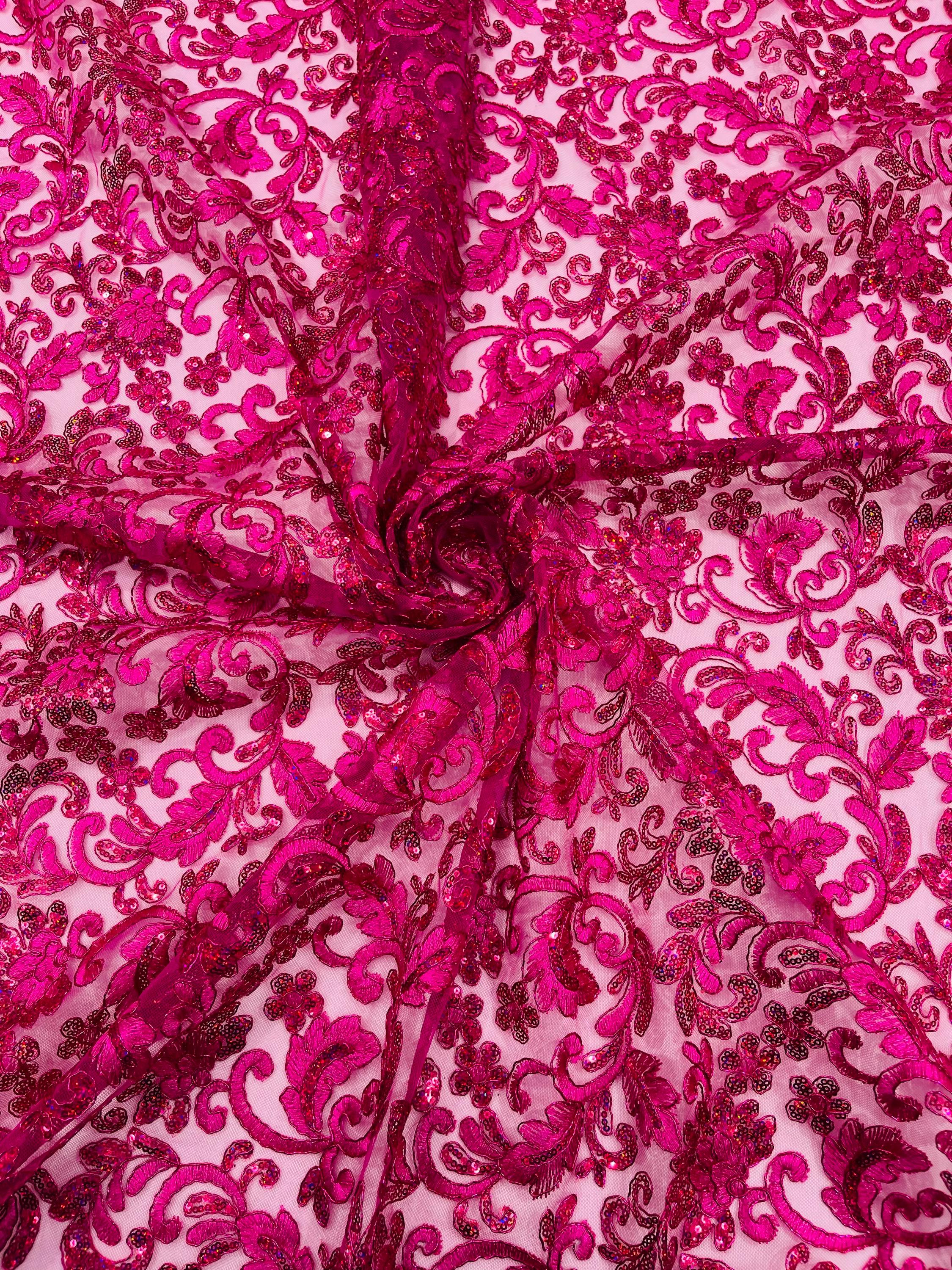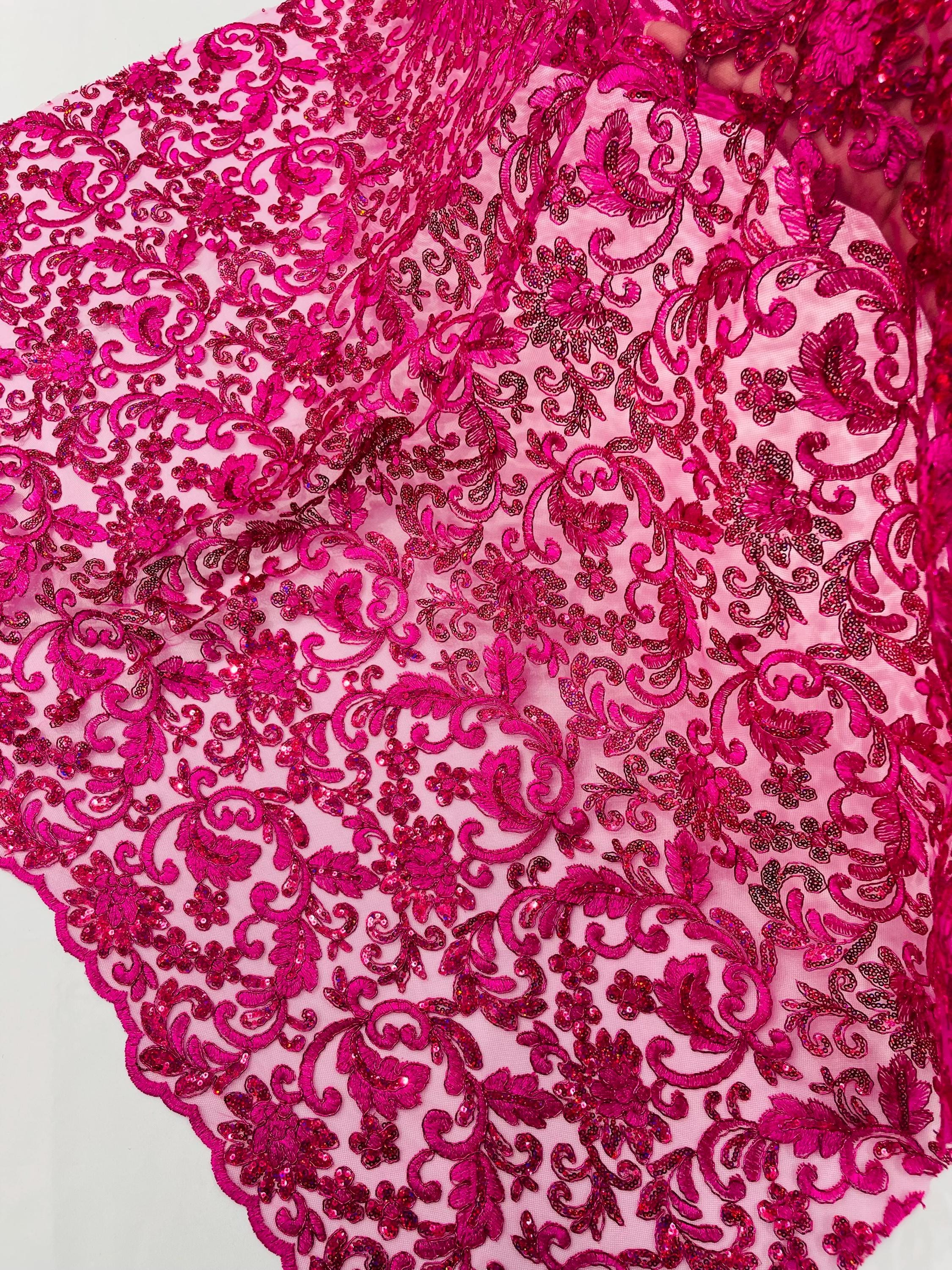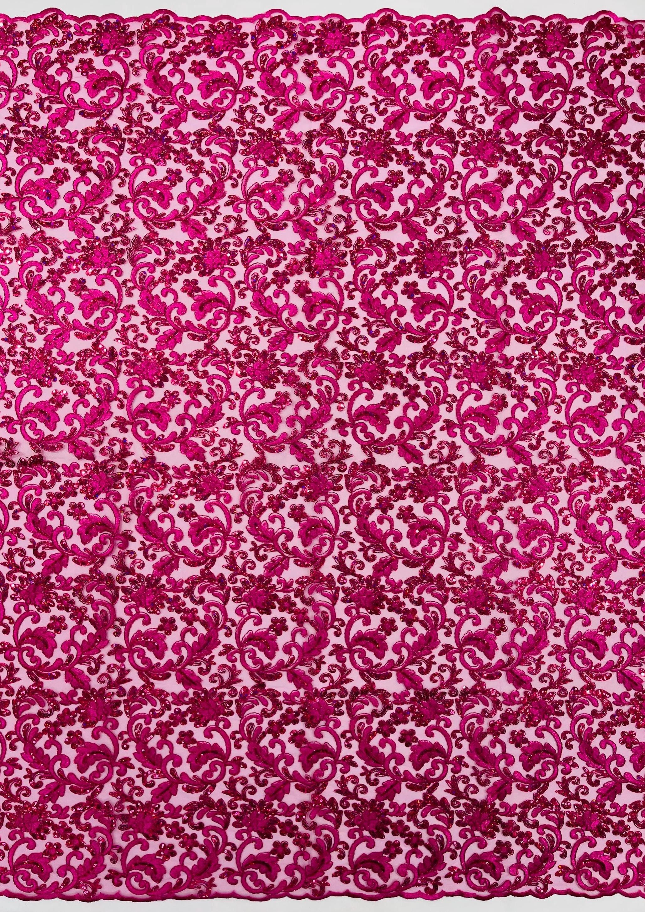 Fuchsia Metallic Corded Flower Lace Fabric by the yard: Embroider With Holographic Sequins Fabric