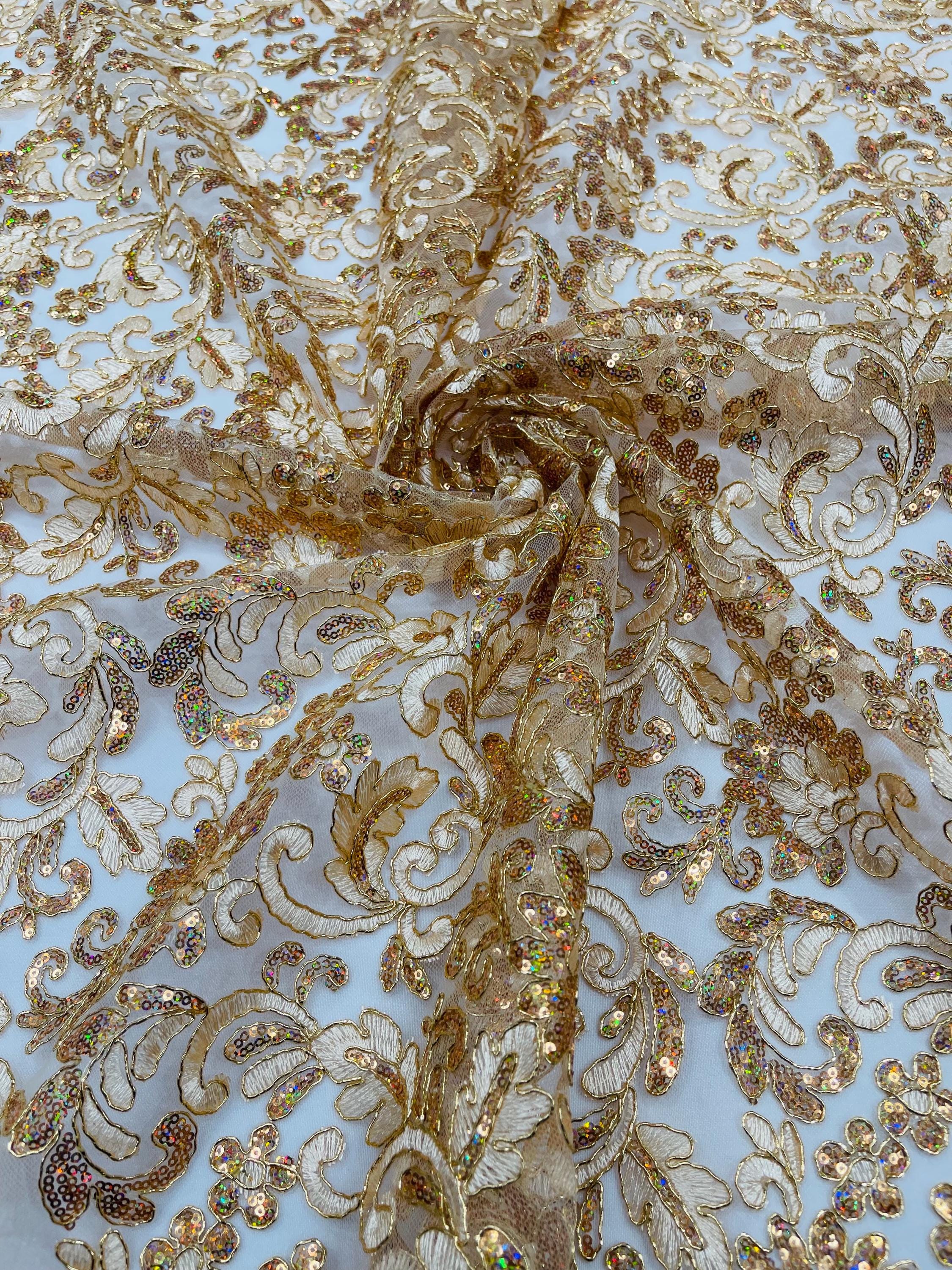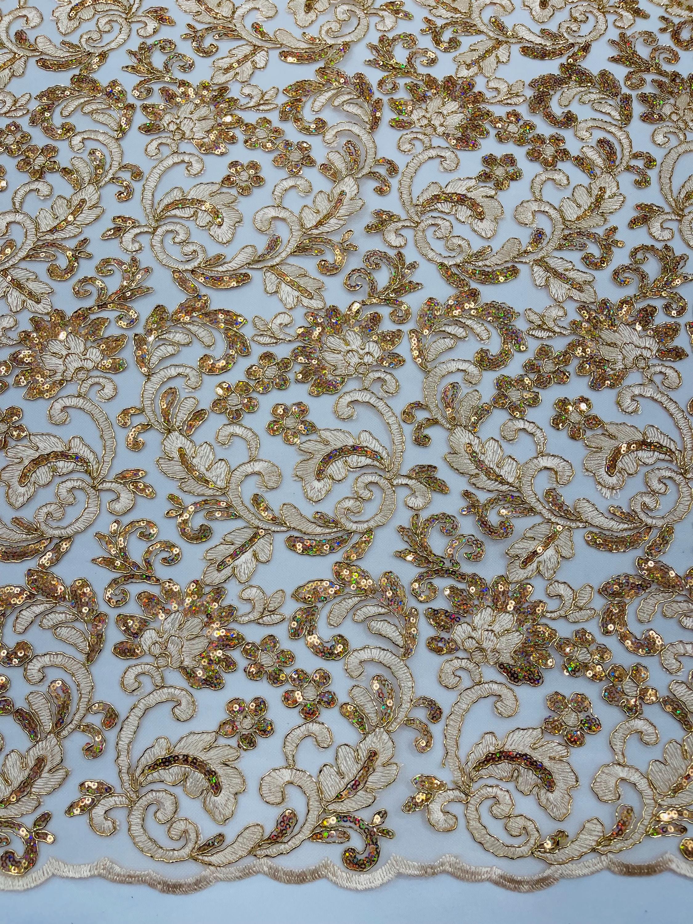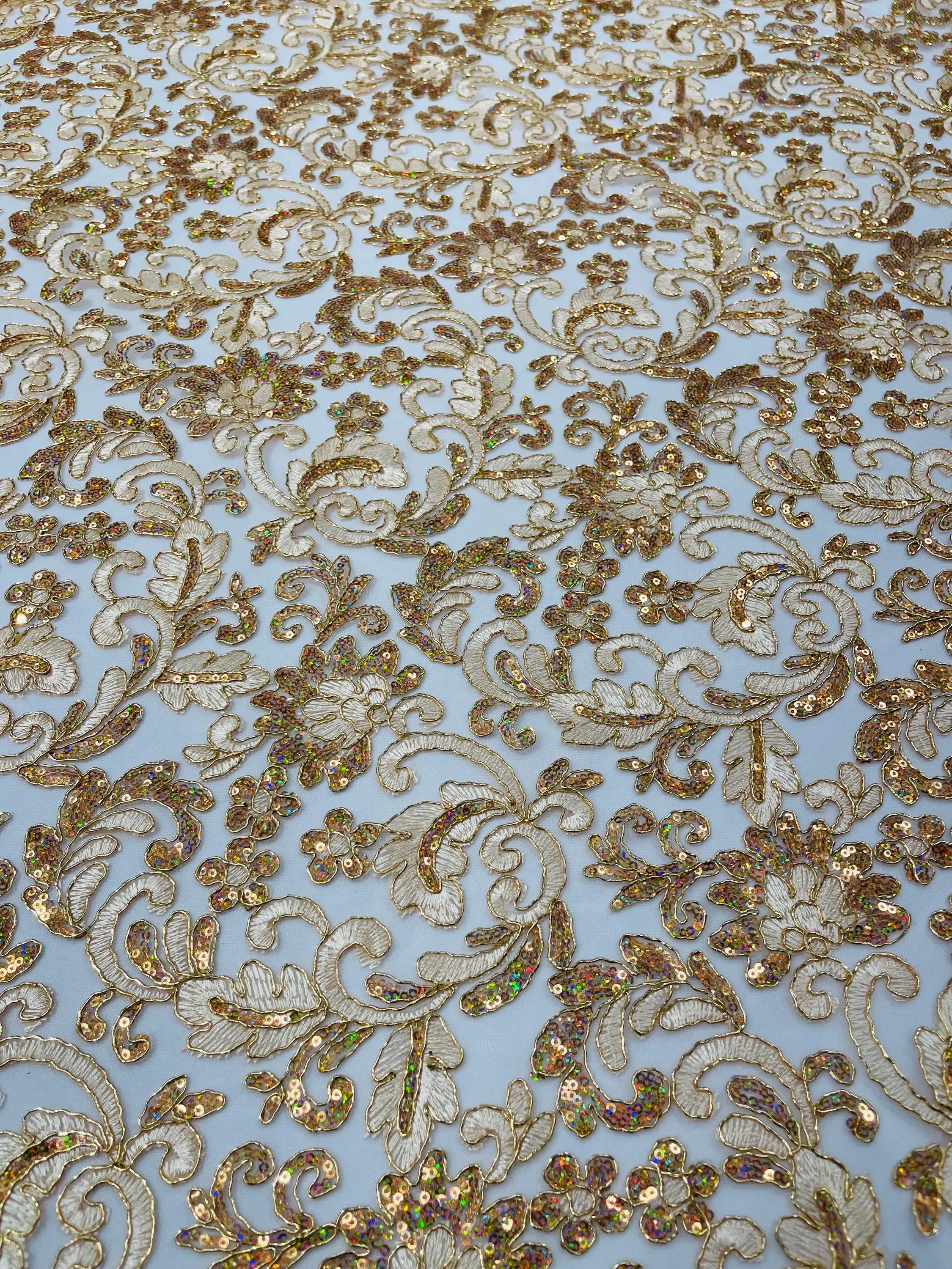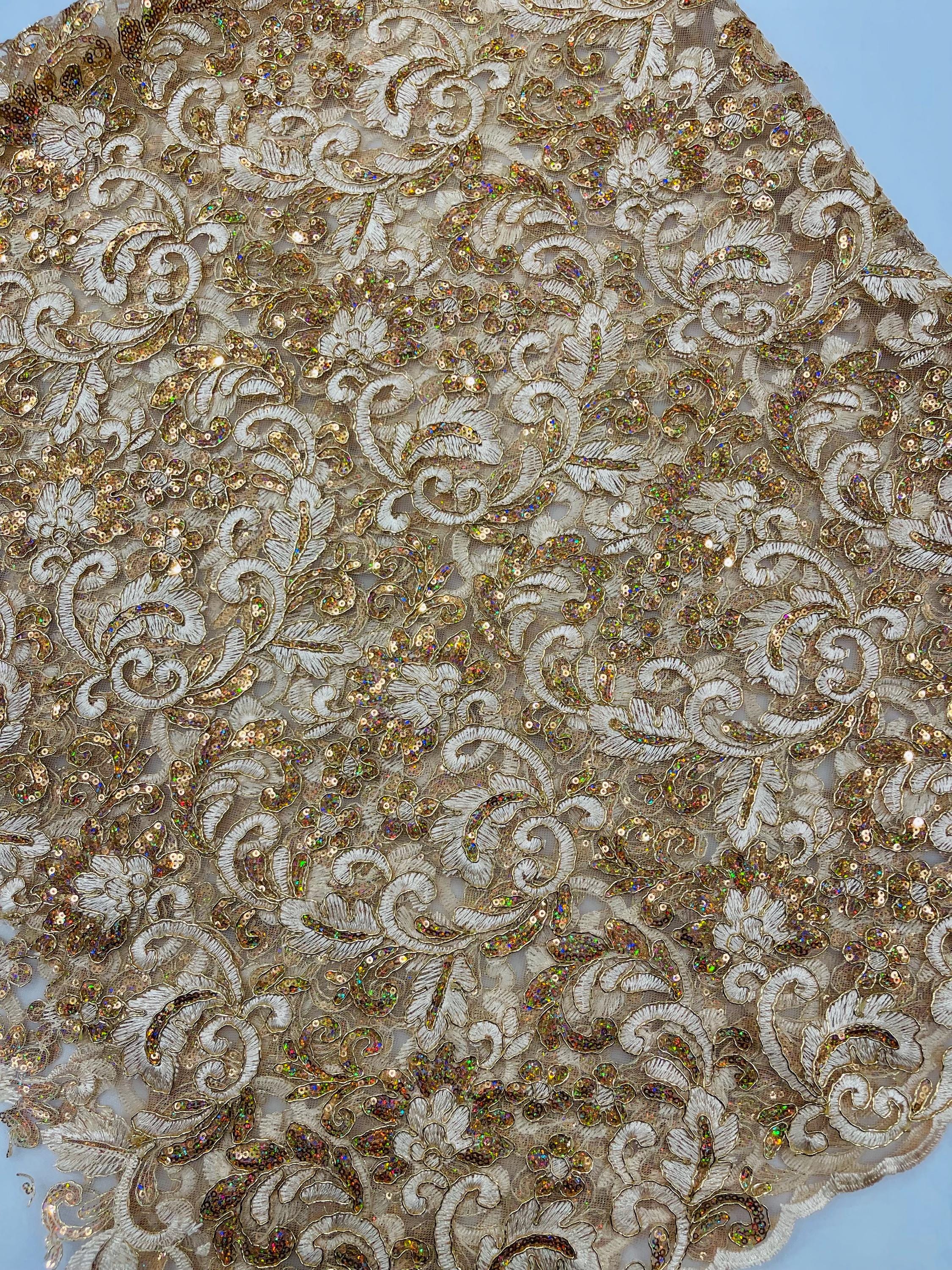 Champagne Metallic Corded Flower Lace Fabric by the yard: Embroider With Holographic Sequins Fabric