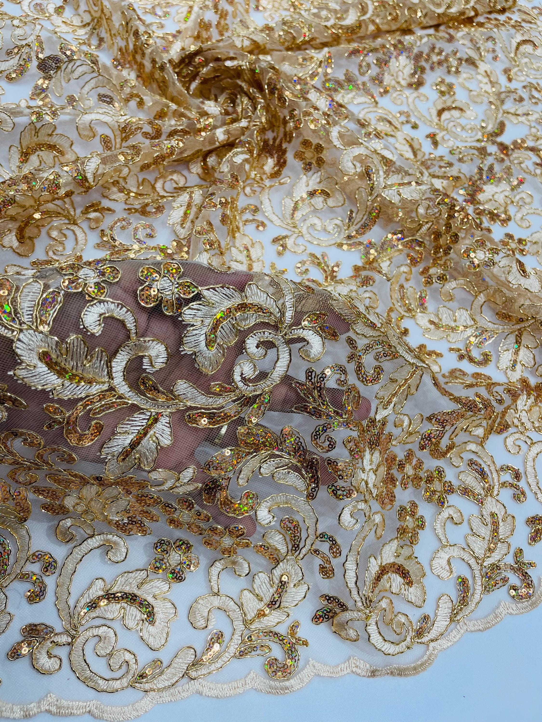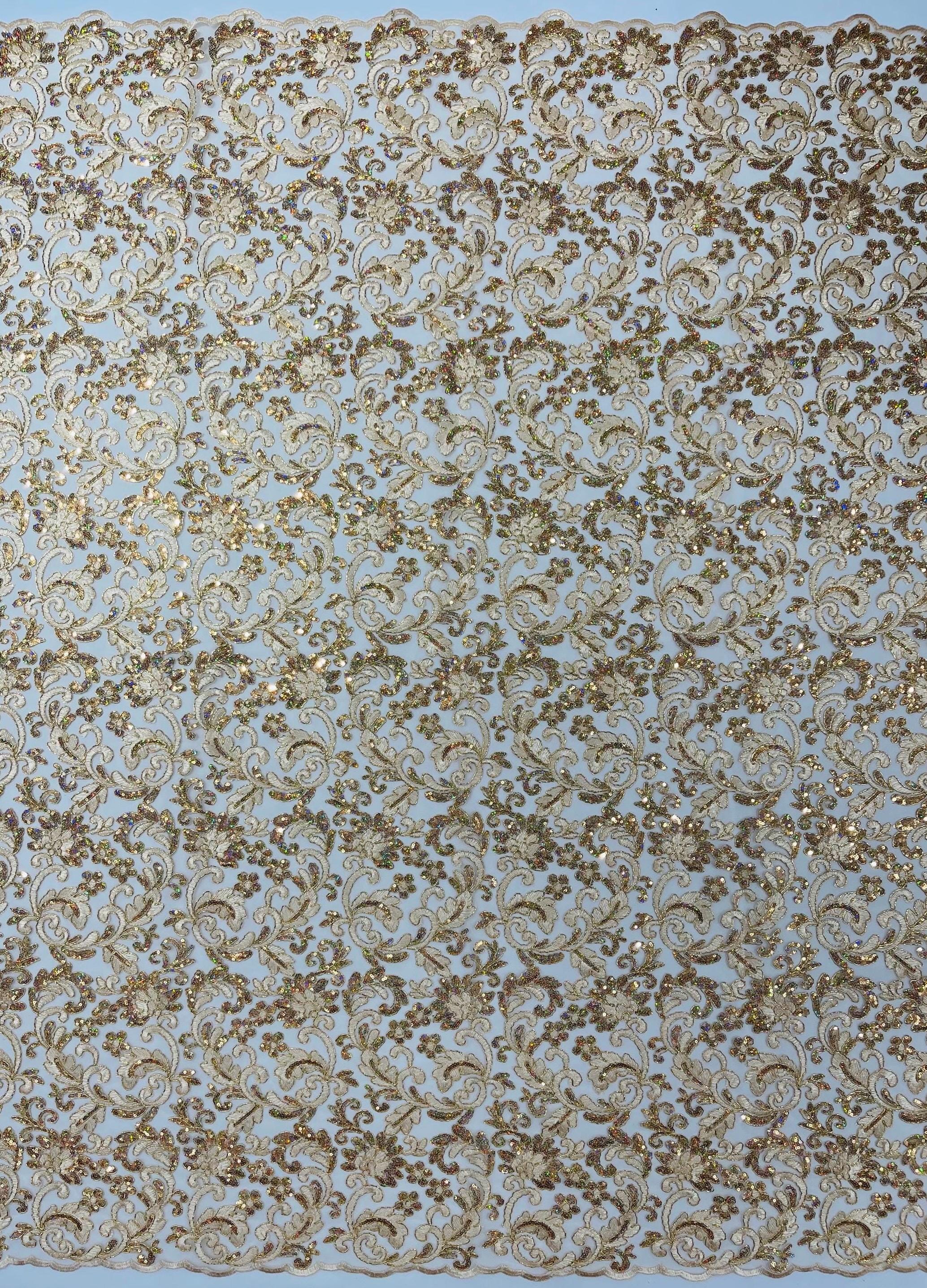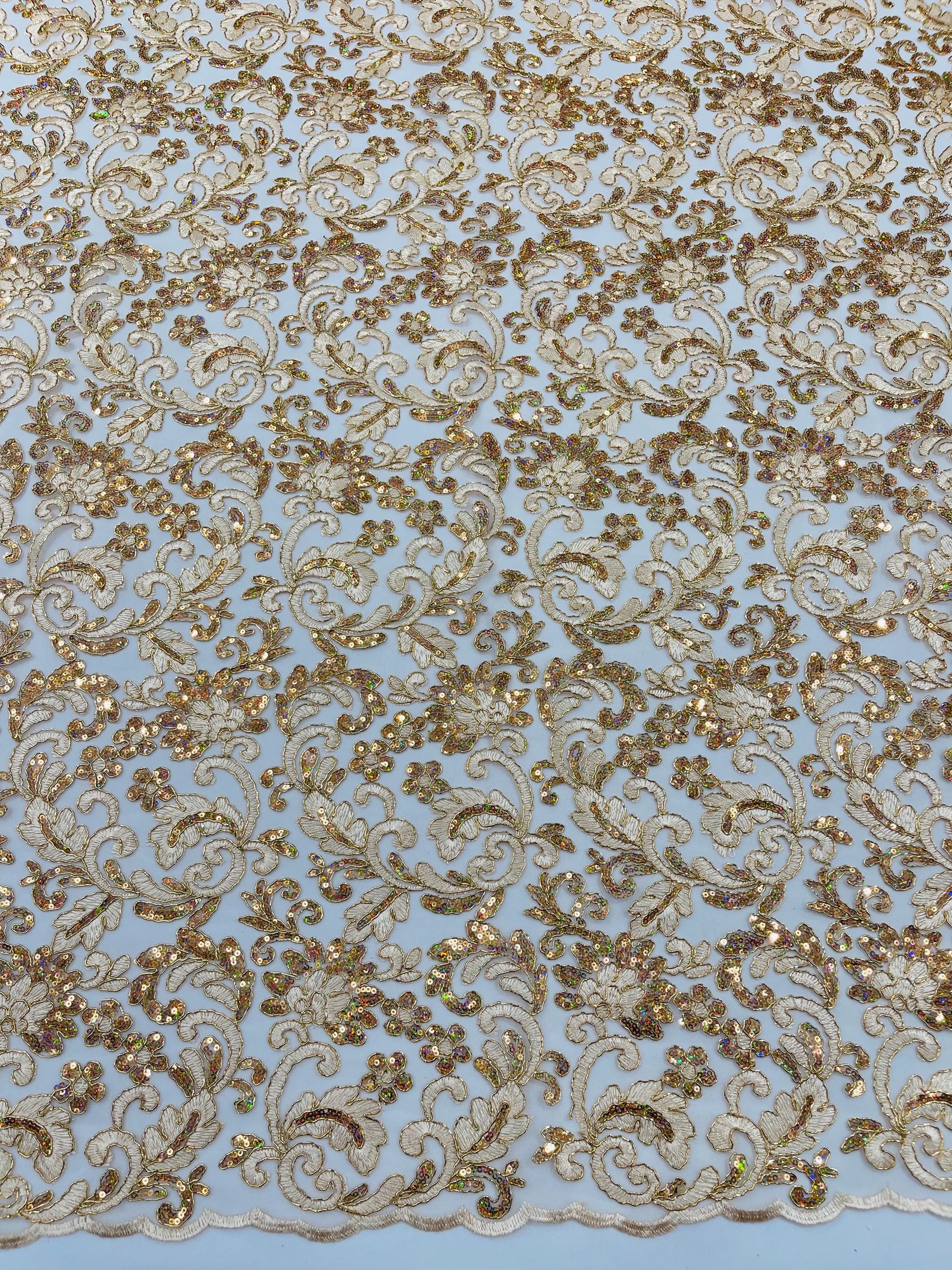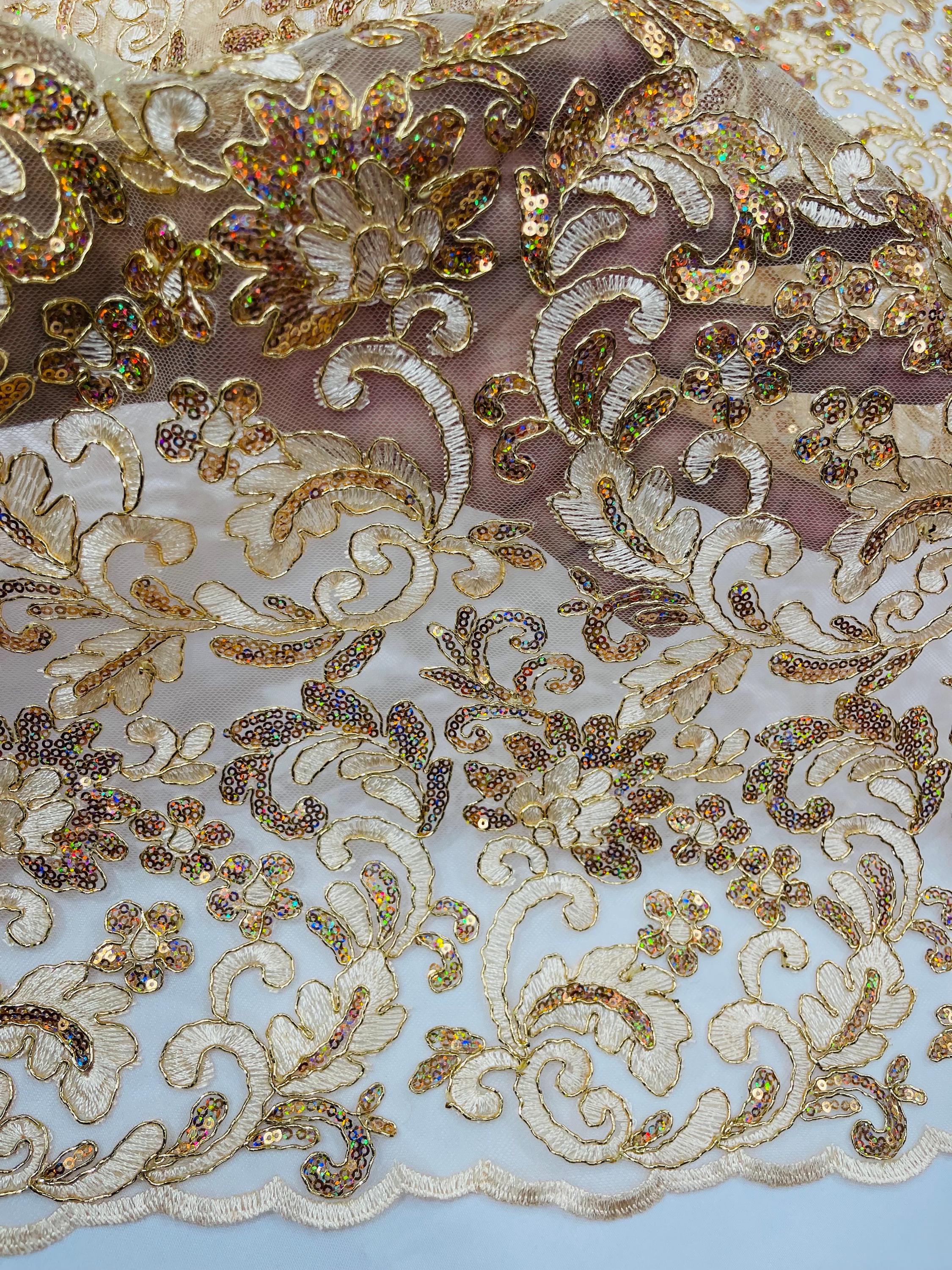 Champagne Metallic Corded Flower Lace Fabric by the yard: Embroider With Holographic Sequins Fabric