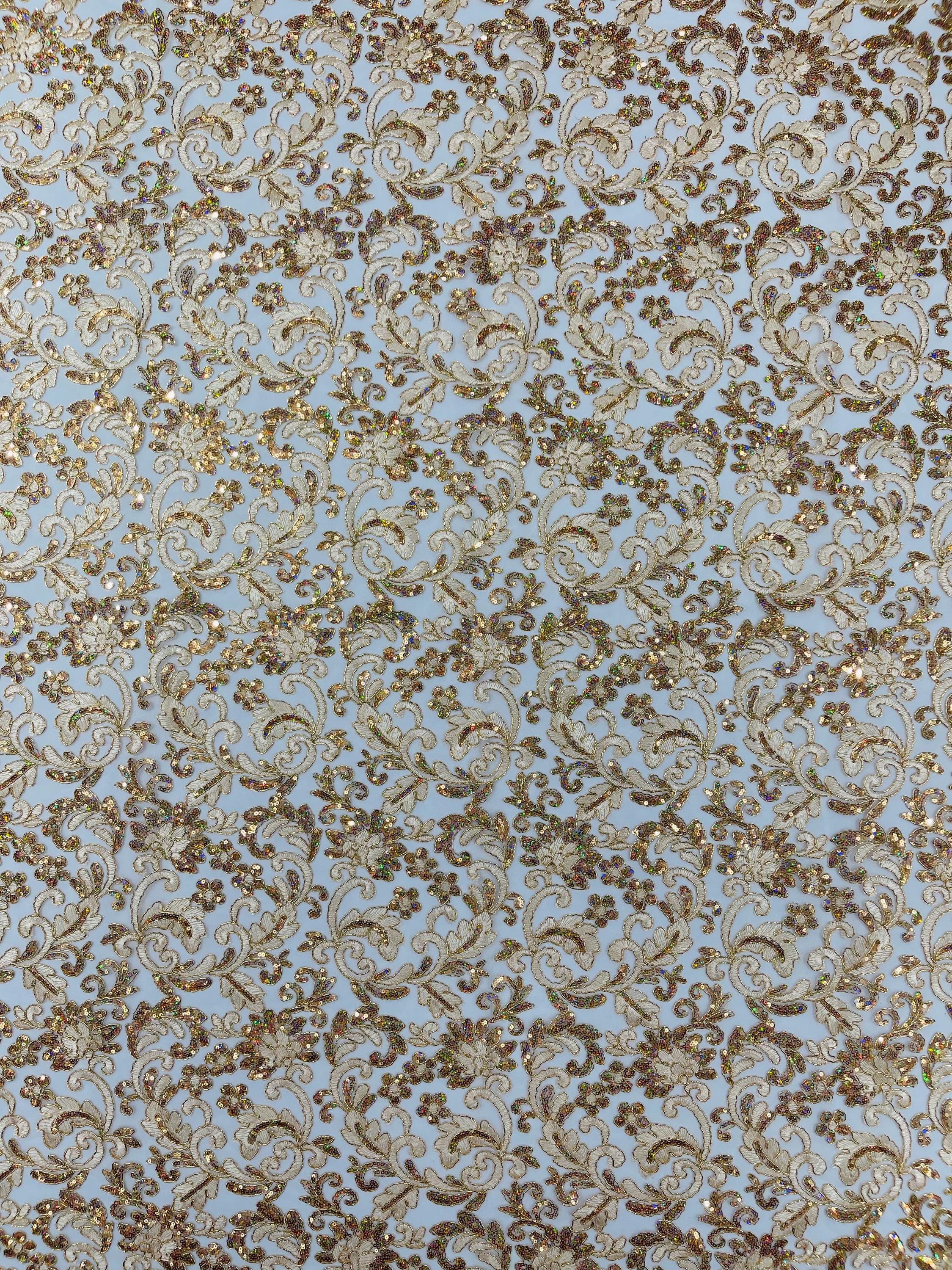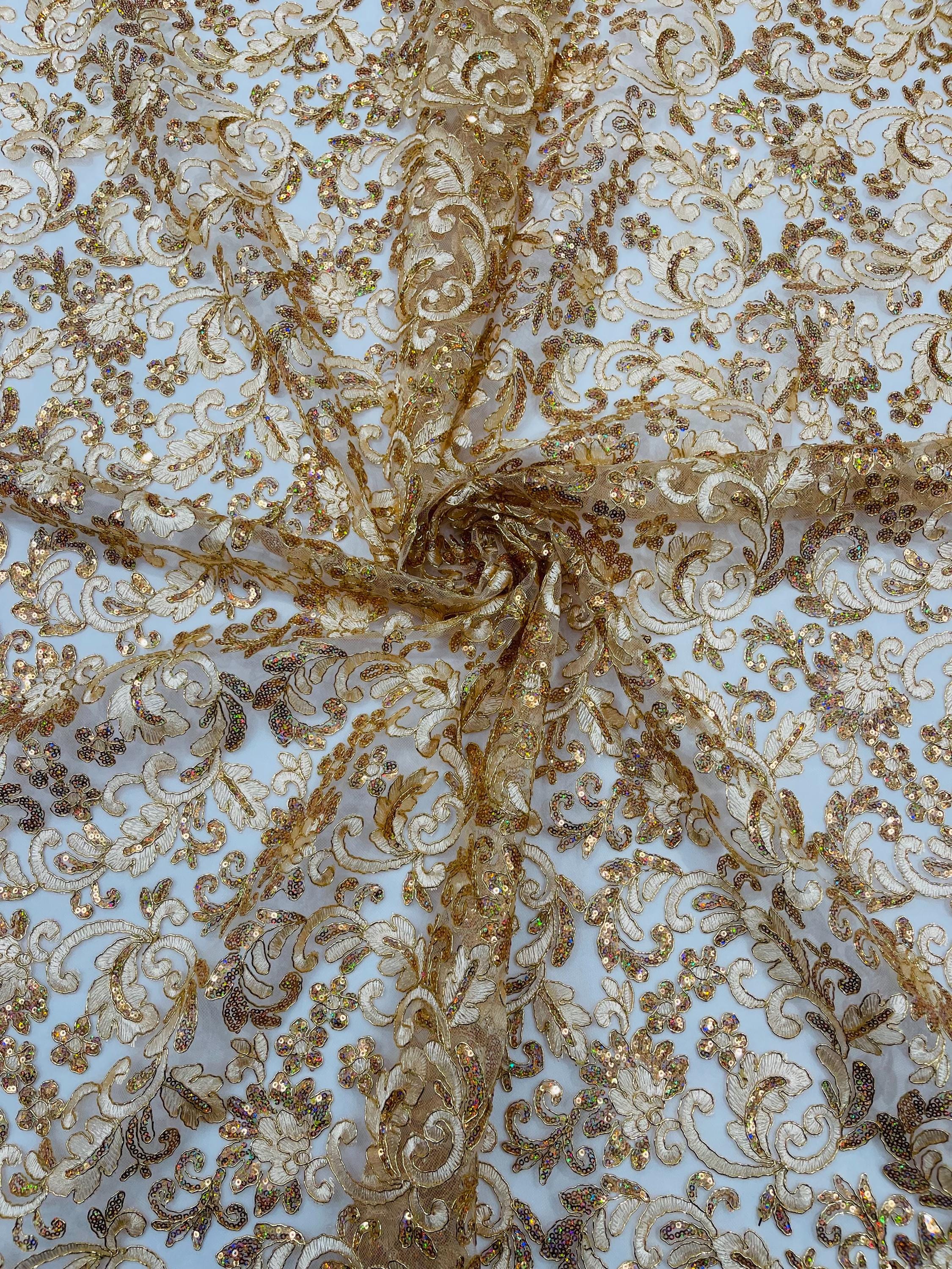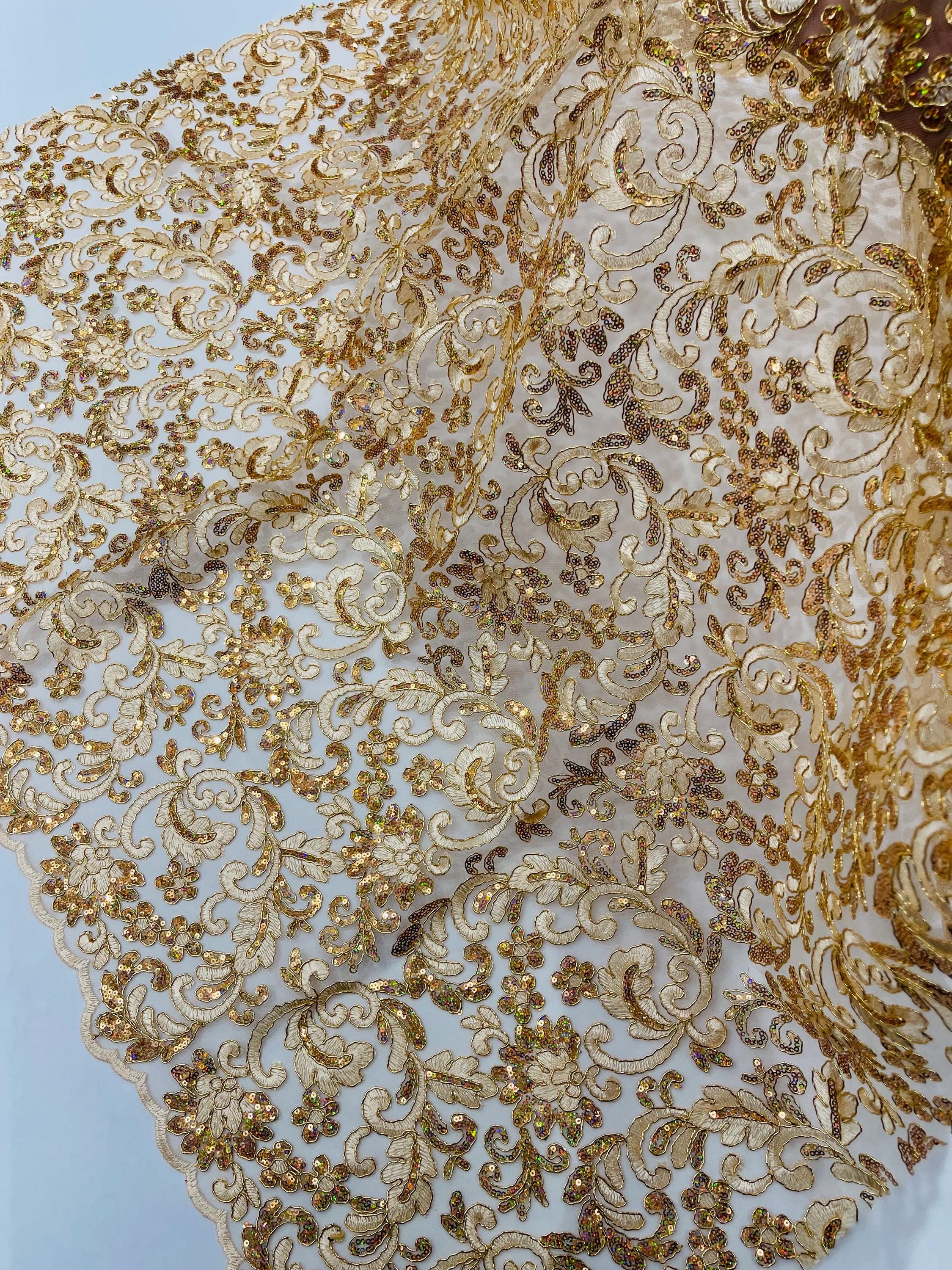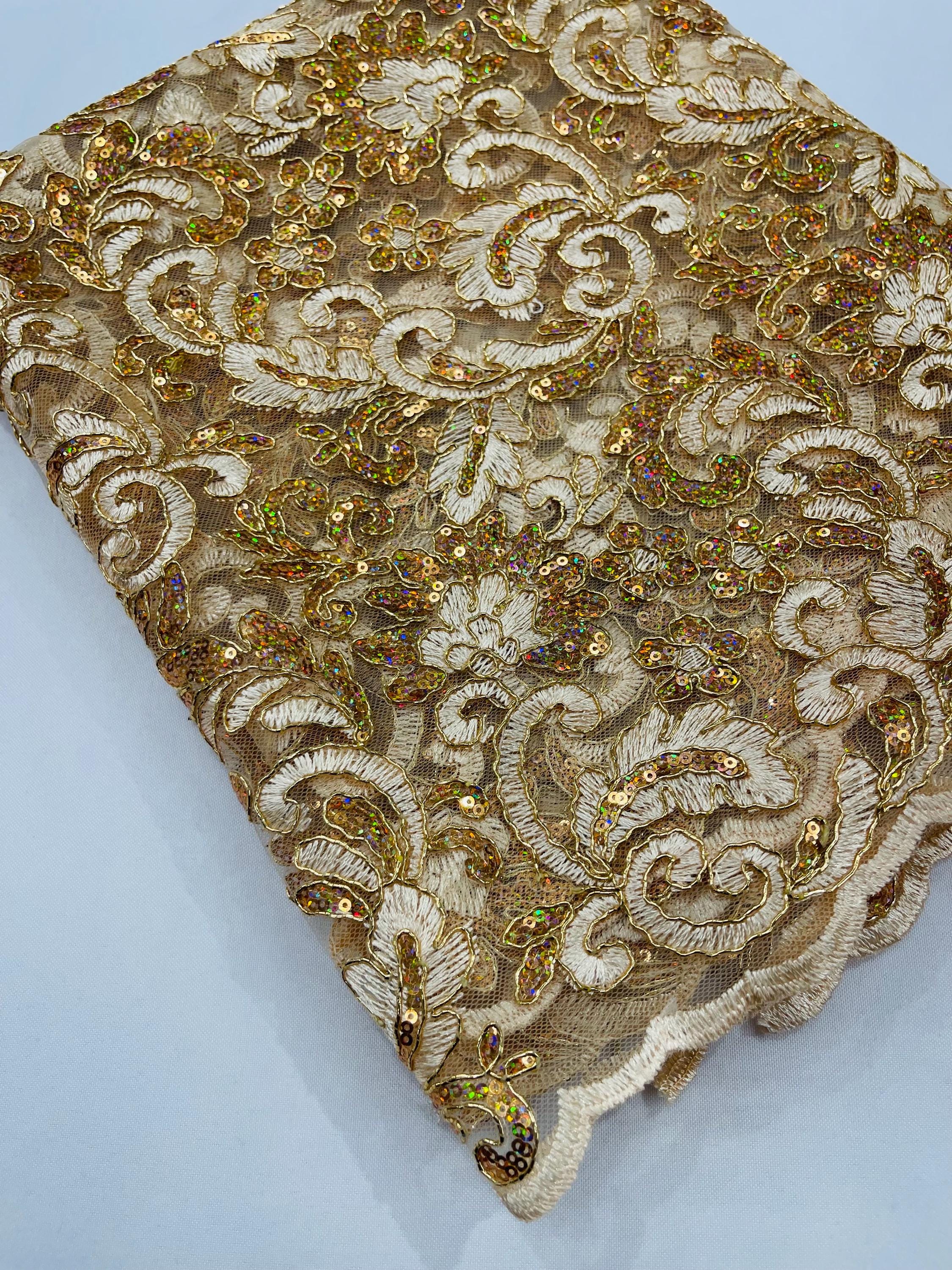 Champagne Metallic Corded Flower Lace Fabric by the yard: Embroider With Holographic Sequins Fabric