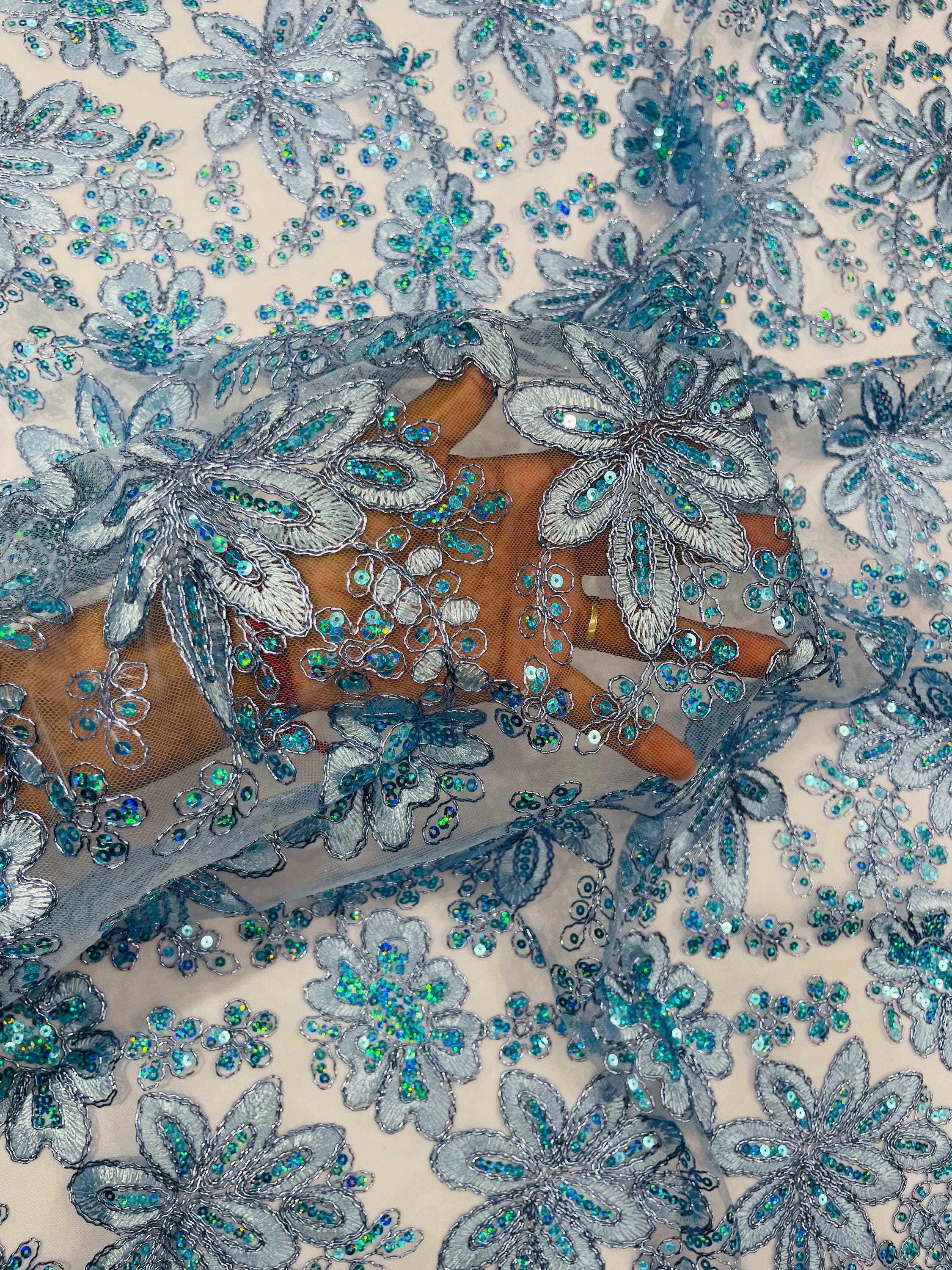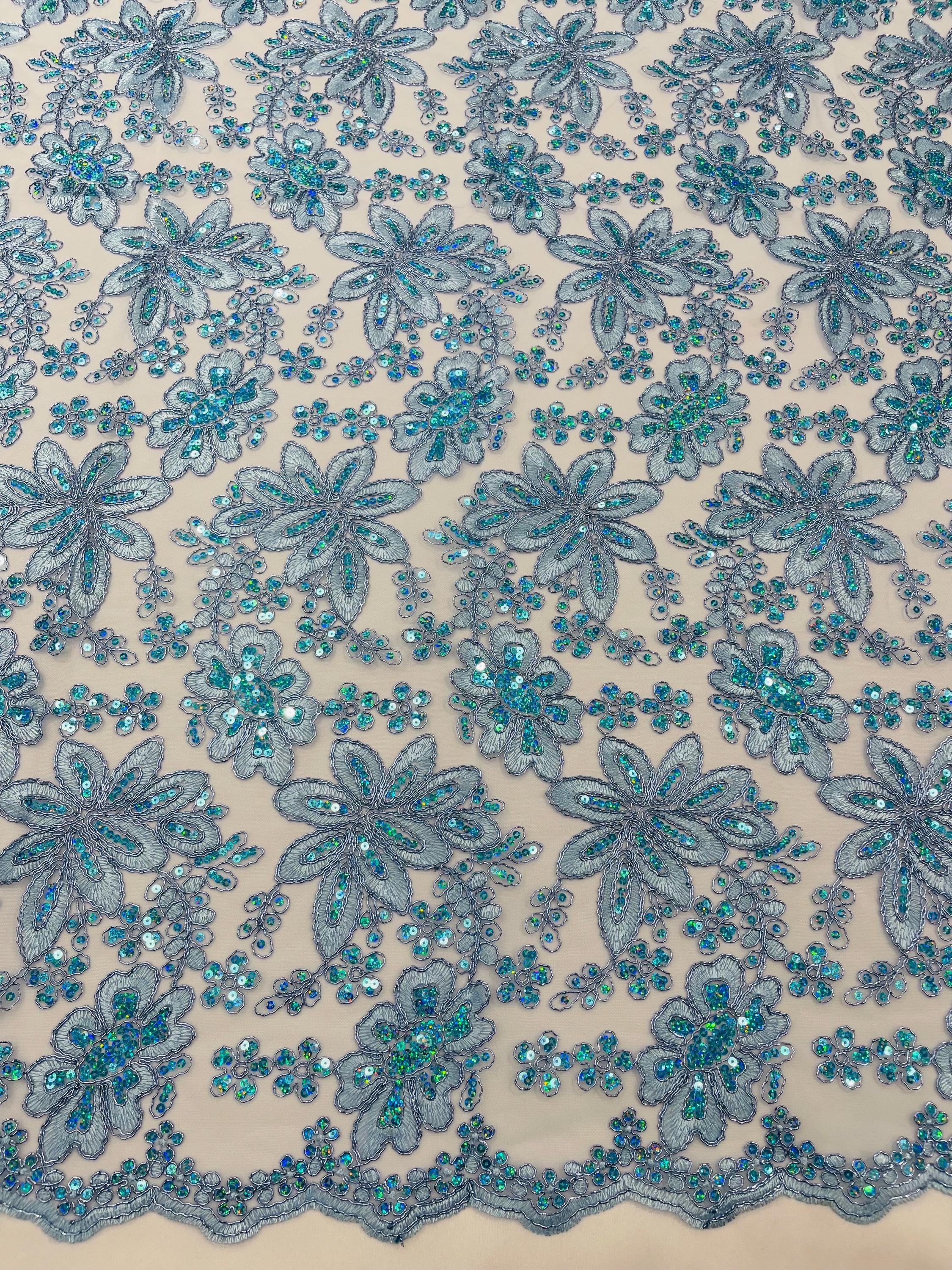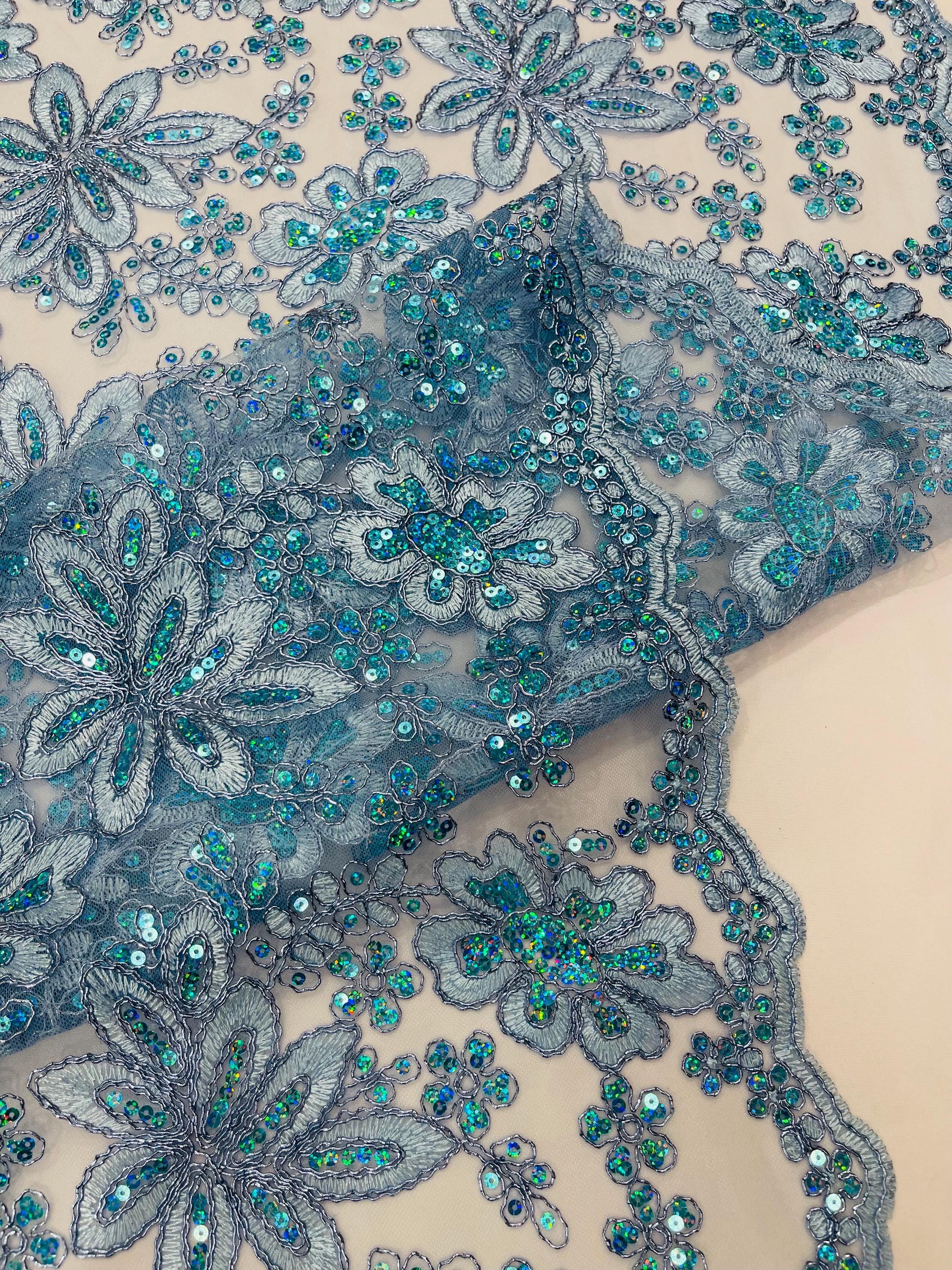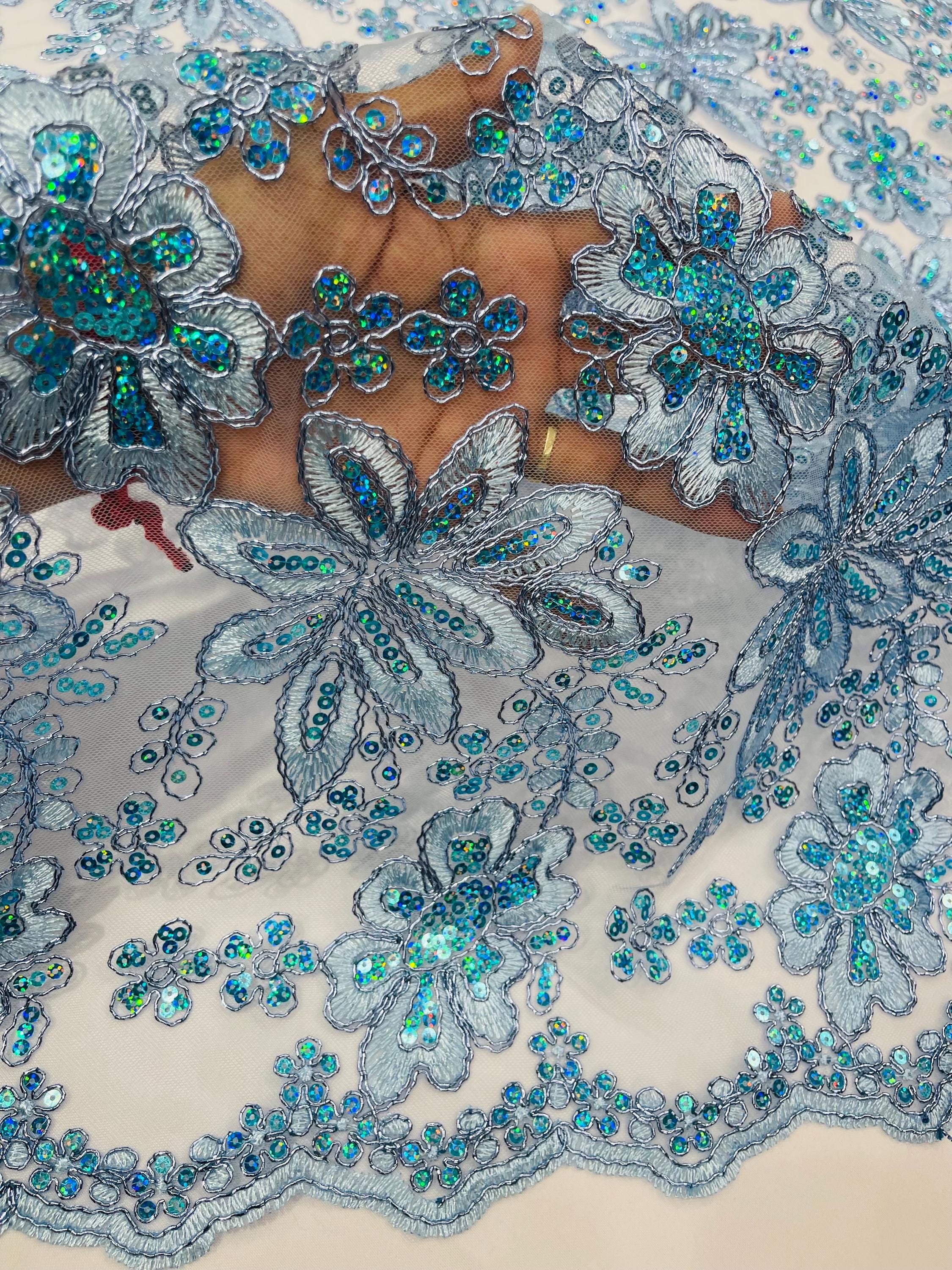 Light Blue Metallic Corded Floral Lace Fabric by the yard: Embroider With Holographic Sequins Fabric