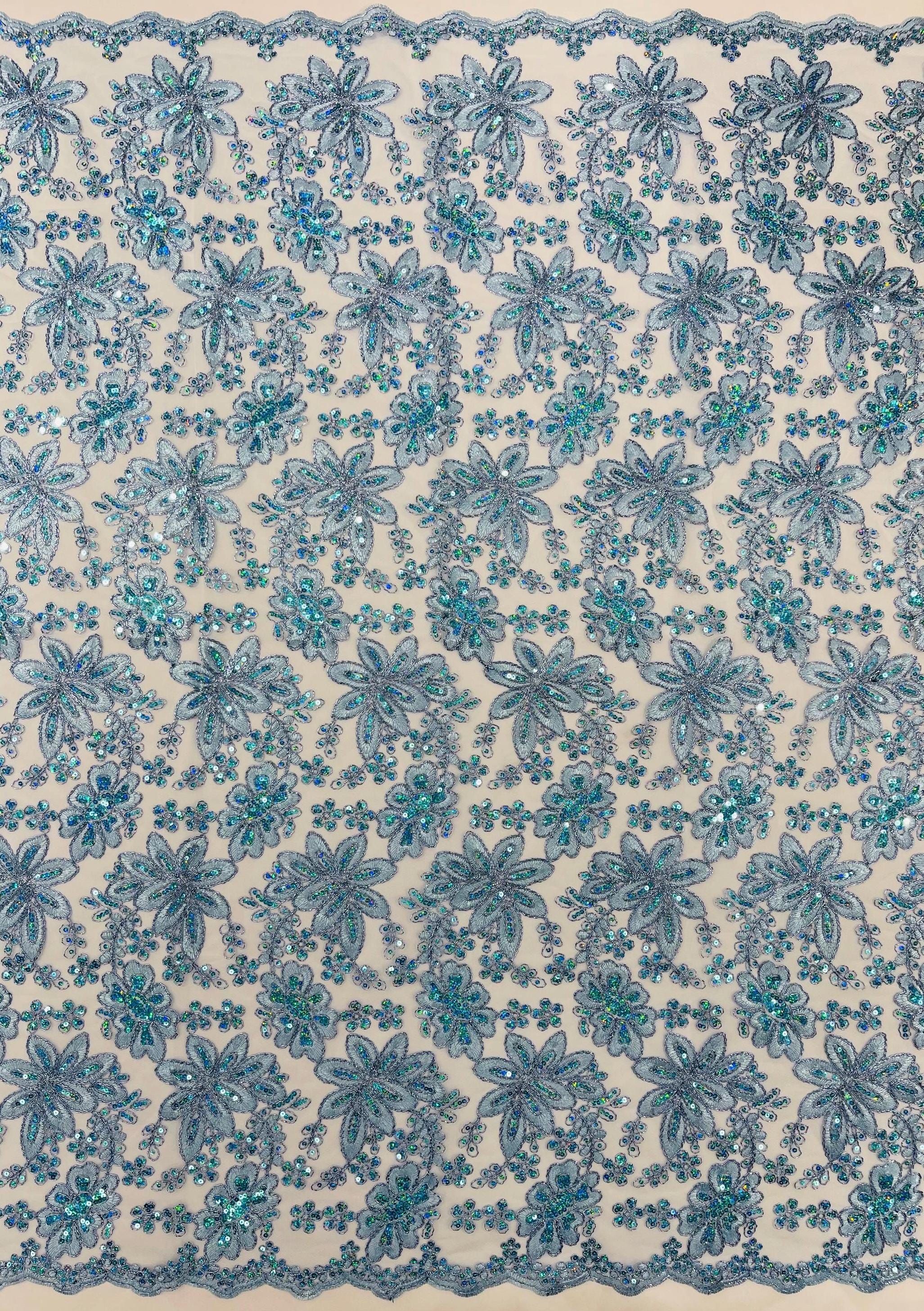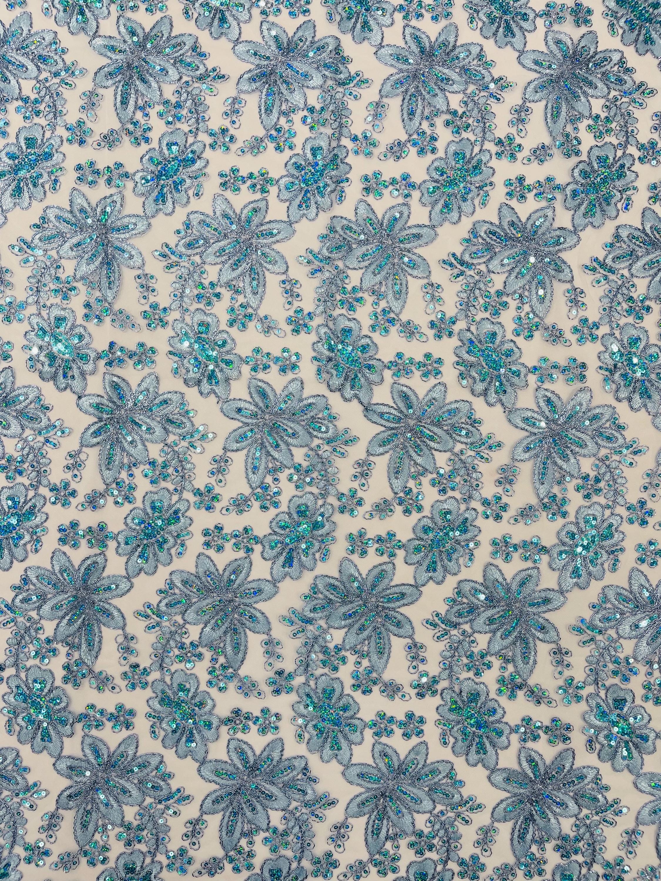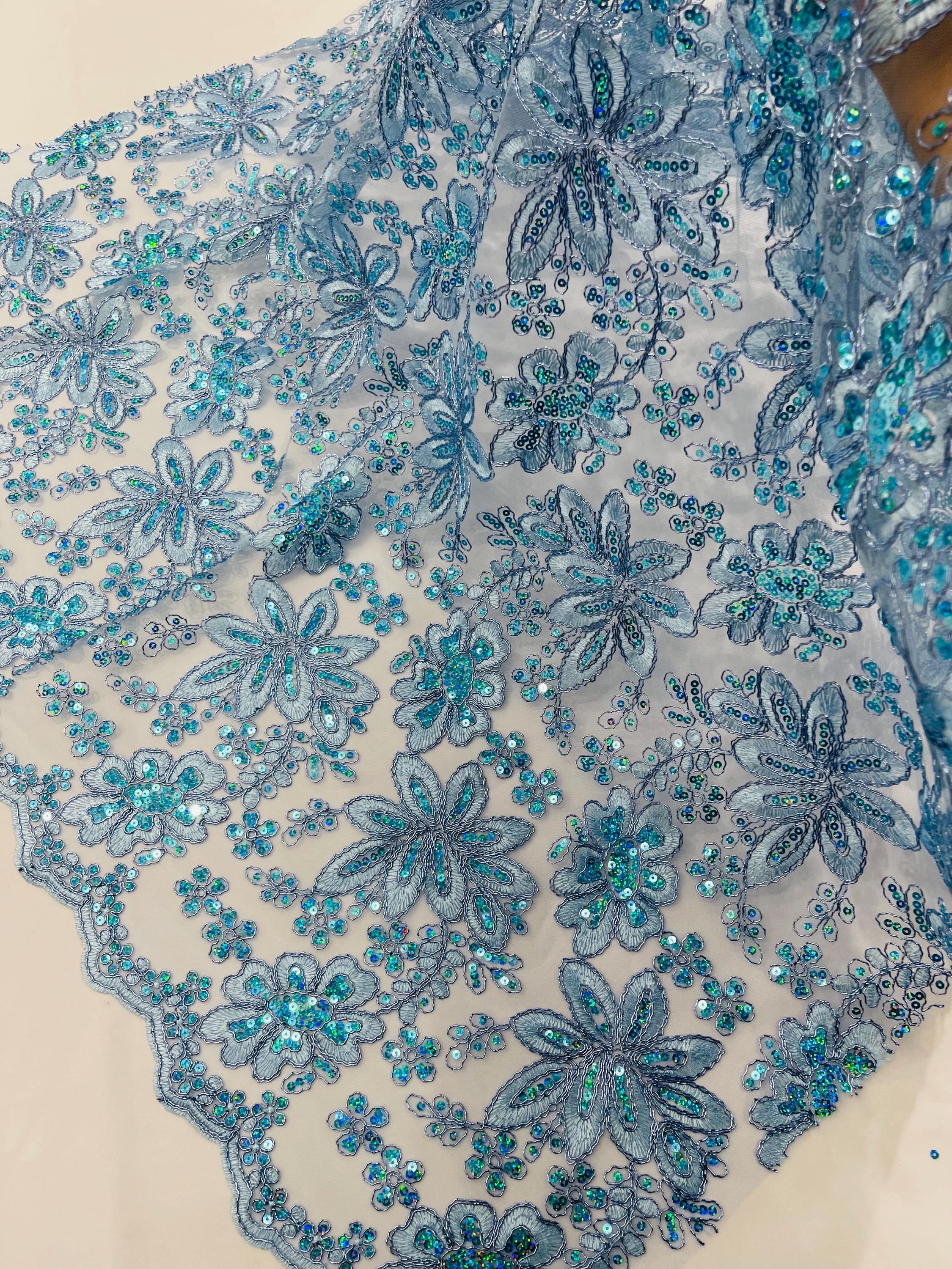 Light Blue Metallic Corded Floral Lace Fabric by the yard: Embroider With Holographic Sequins Fabric