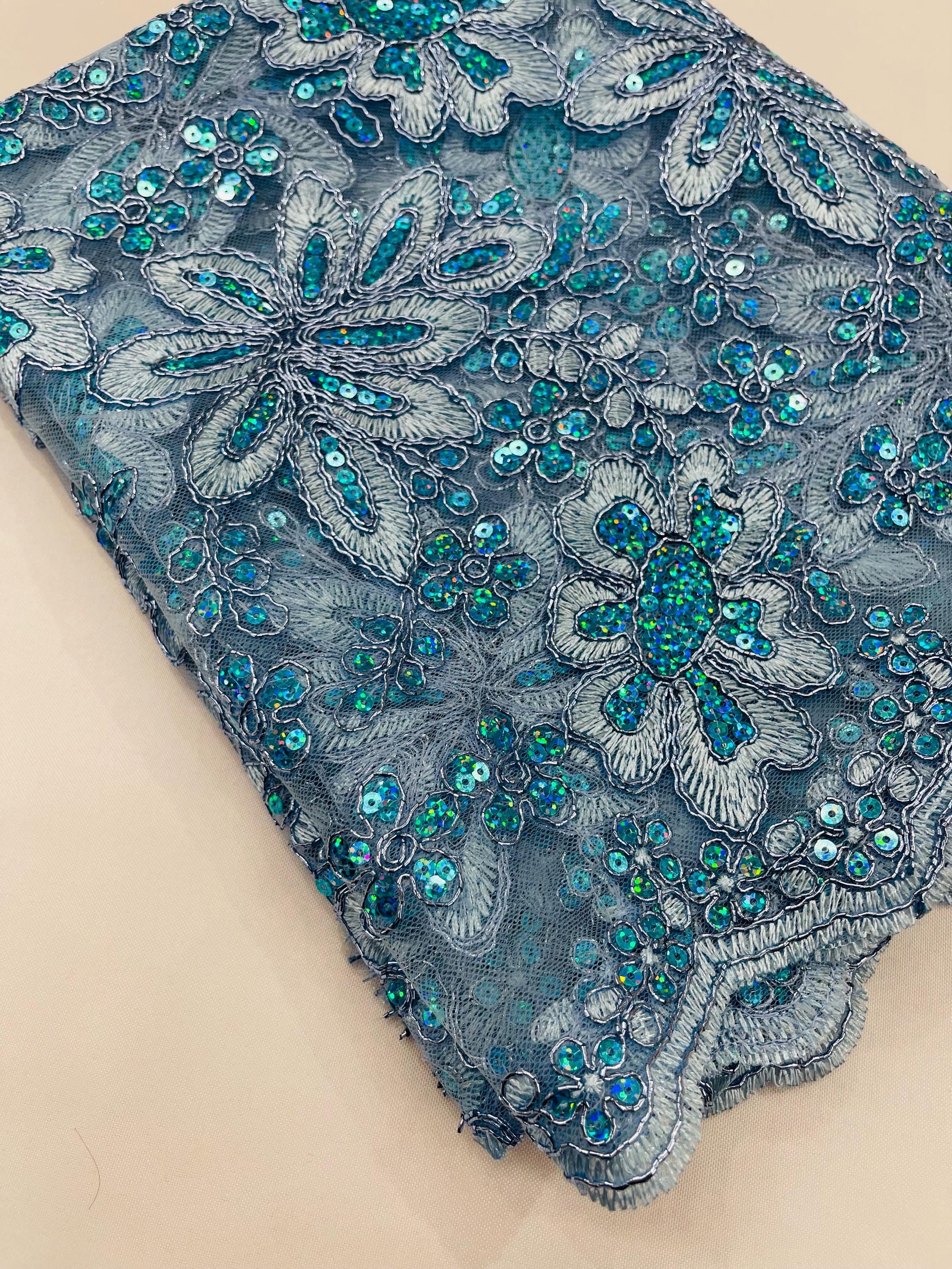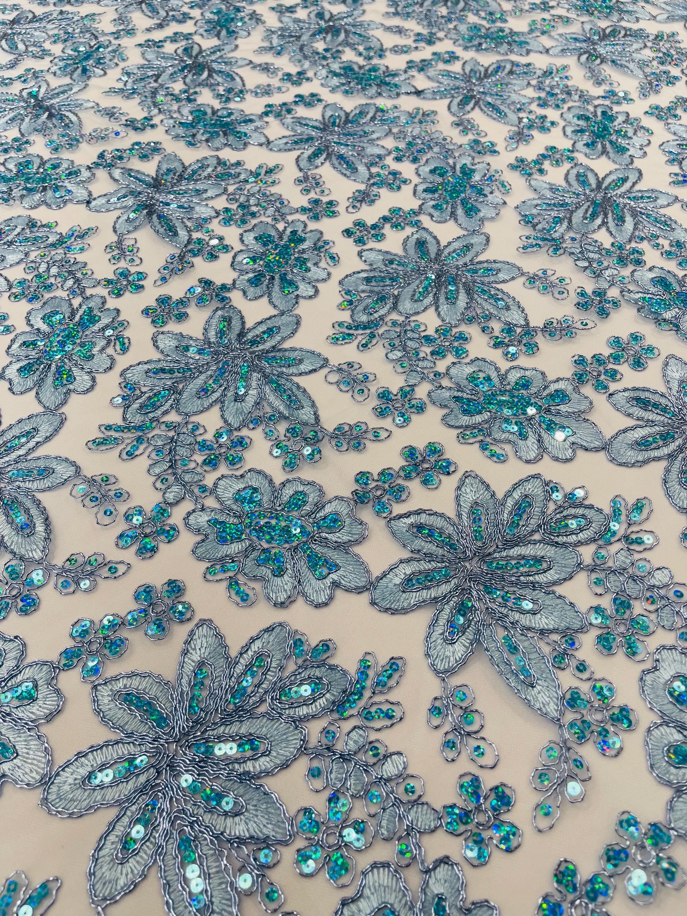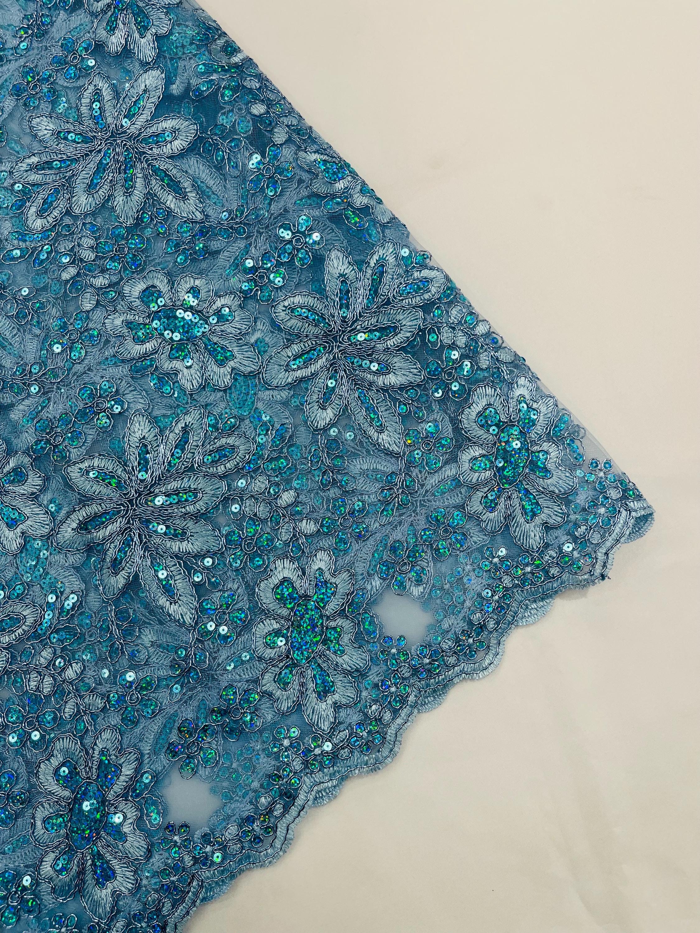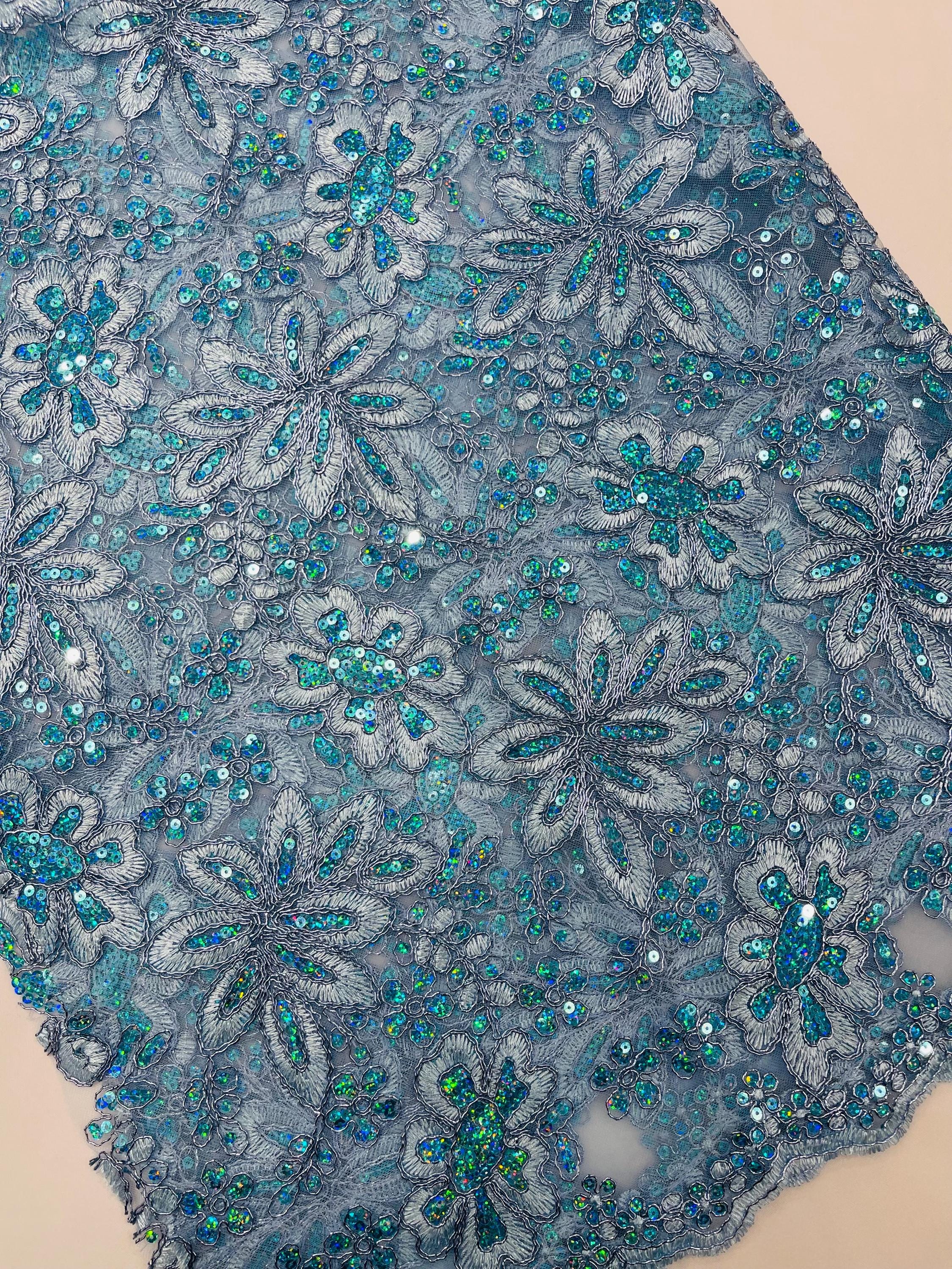 Light Blue Metallic Corded Floral Lace Fabric by the yard: Embroider With Holographic Sequins Fabric