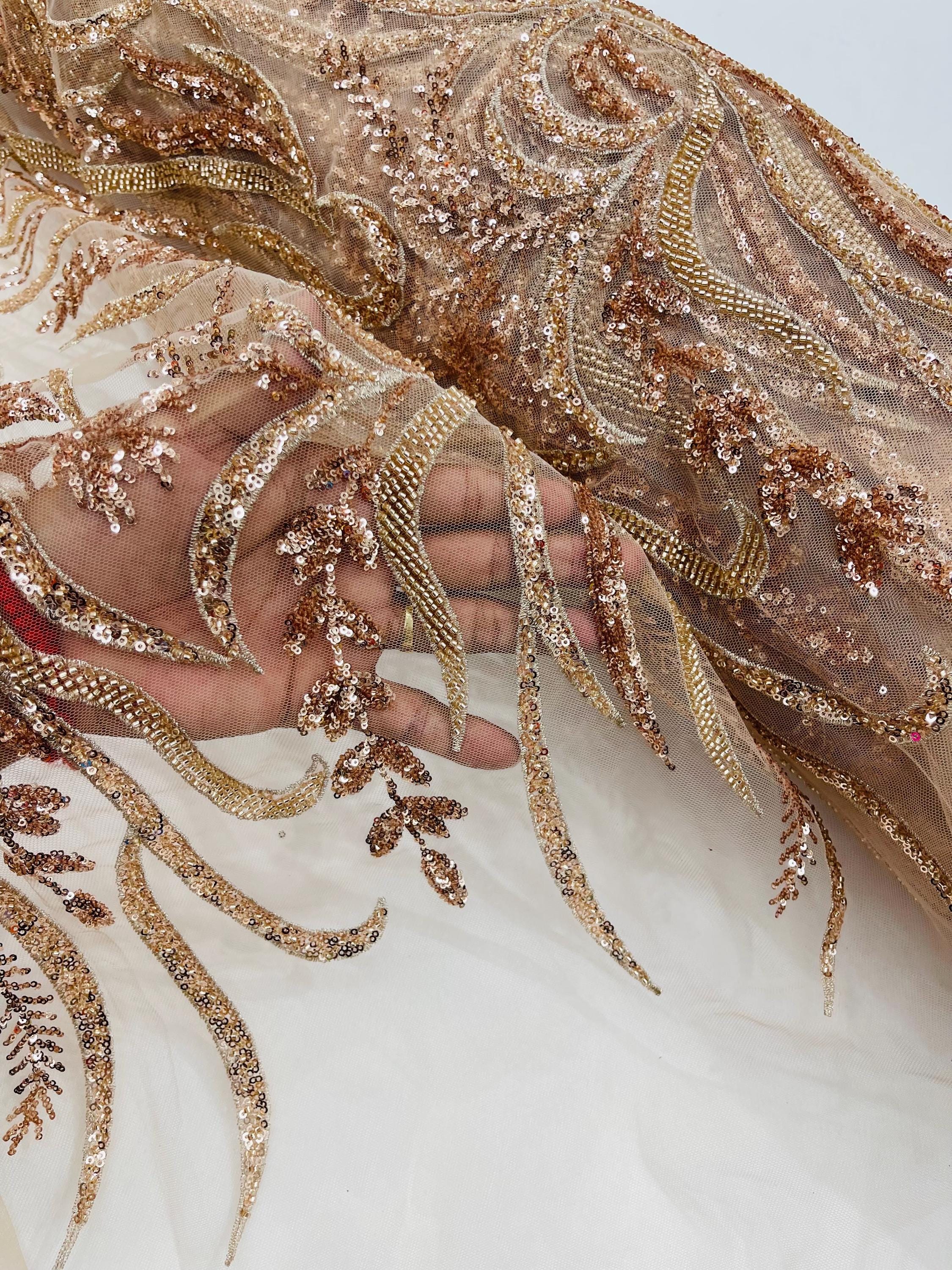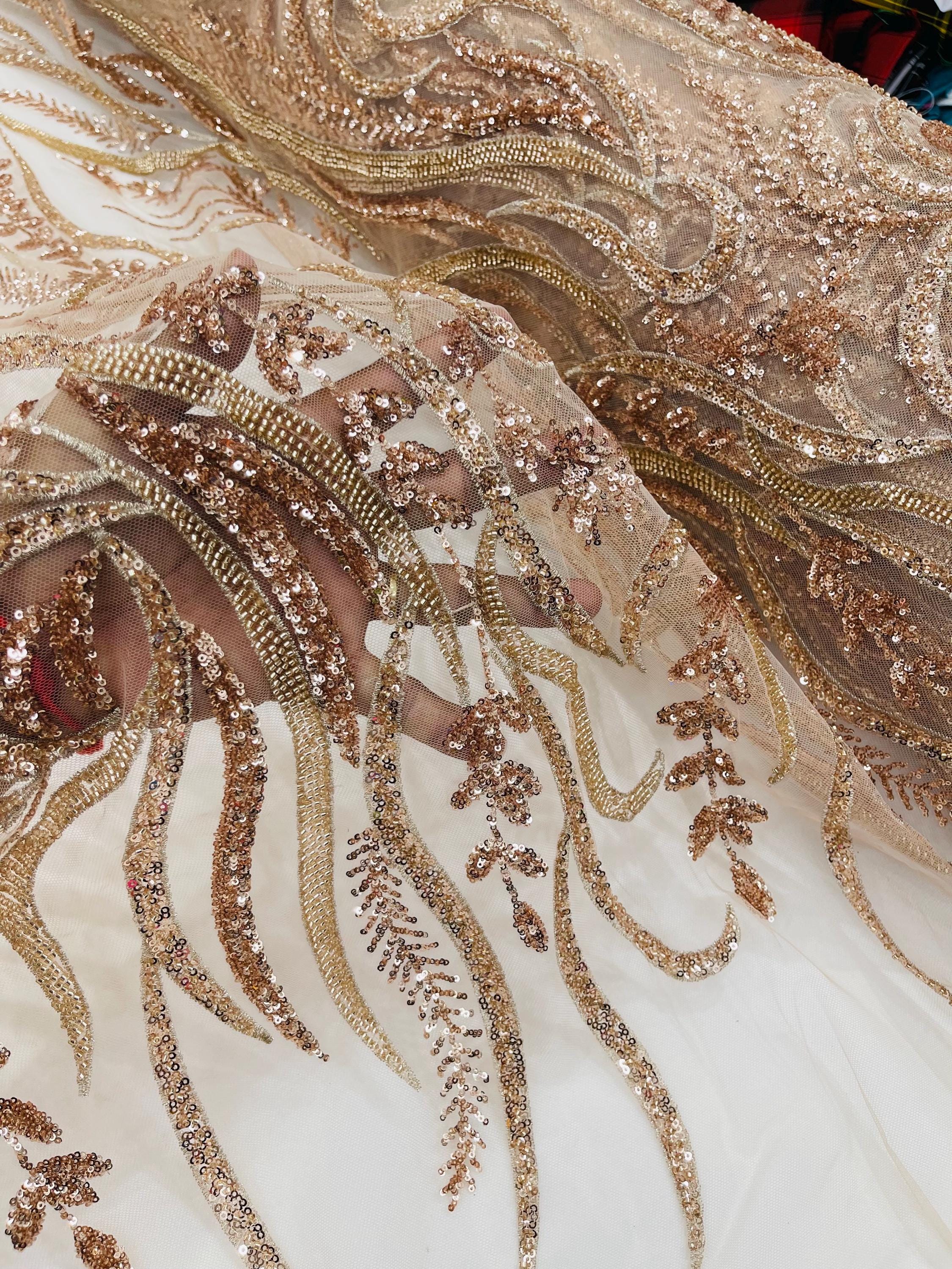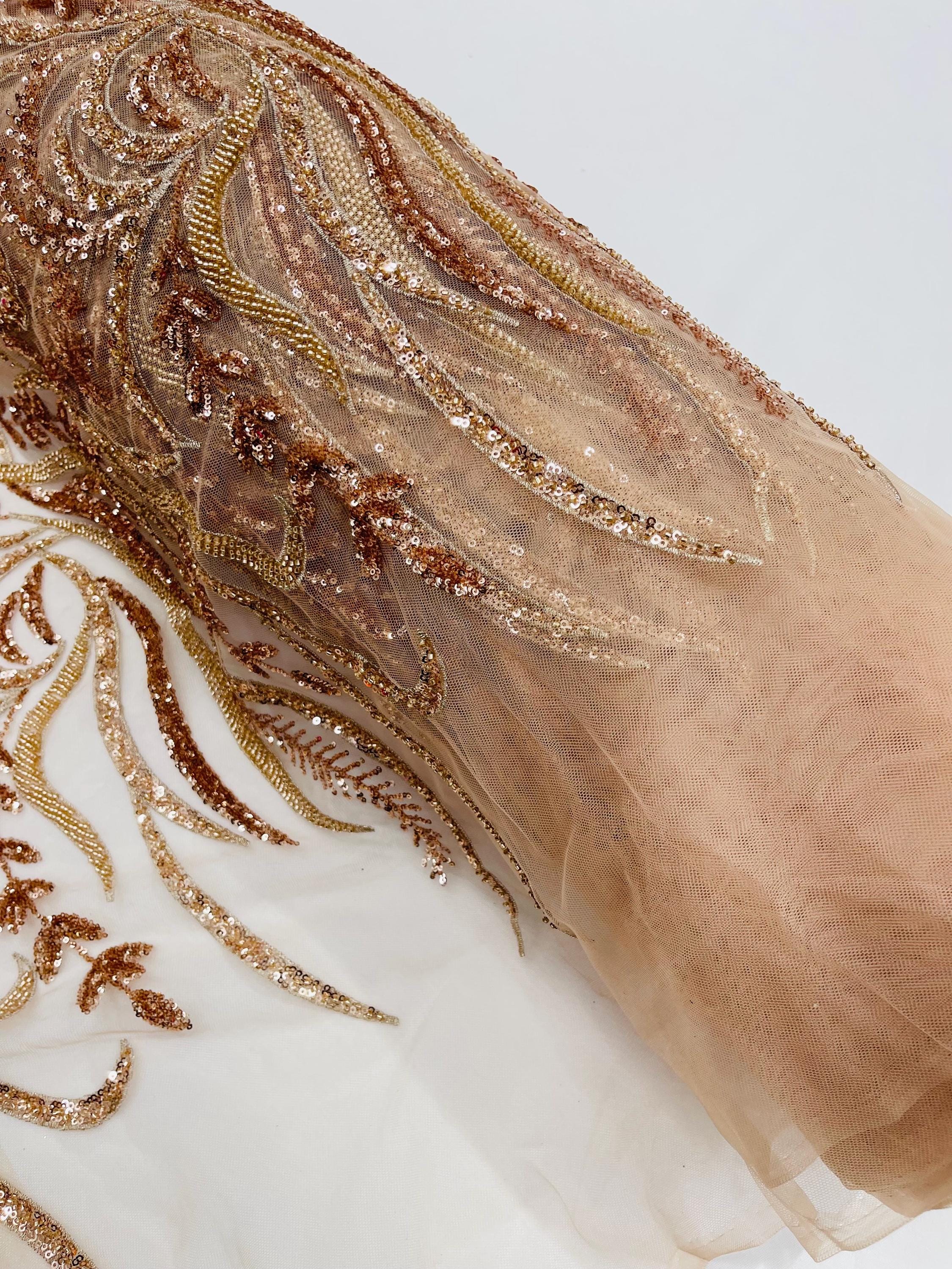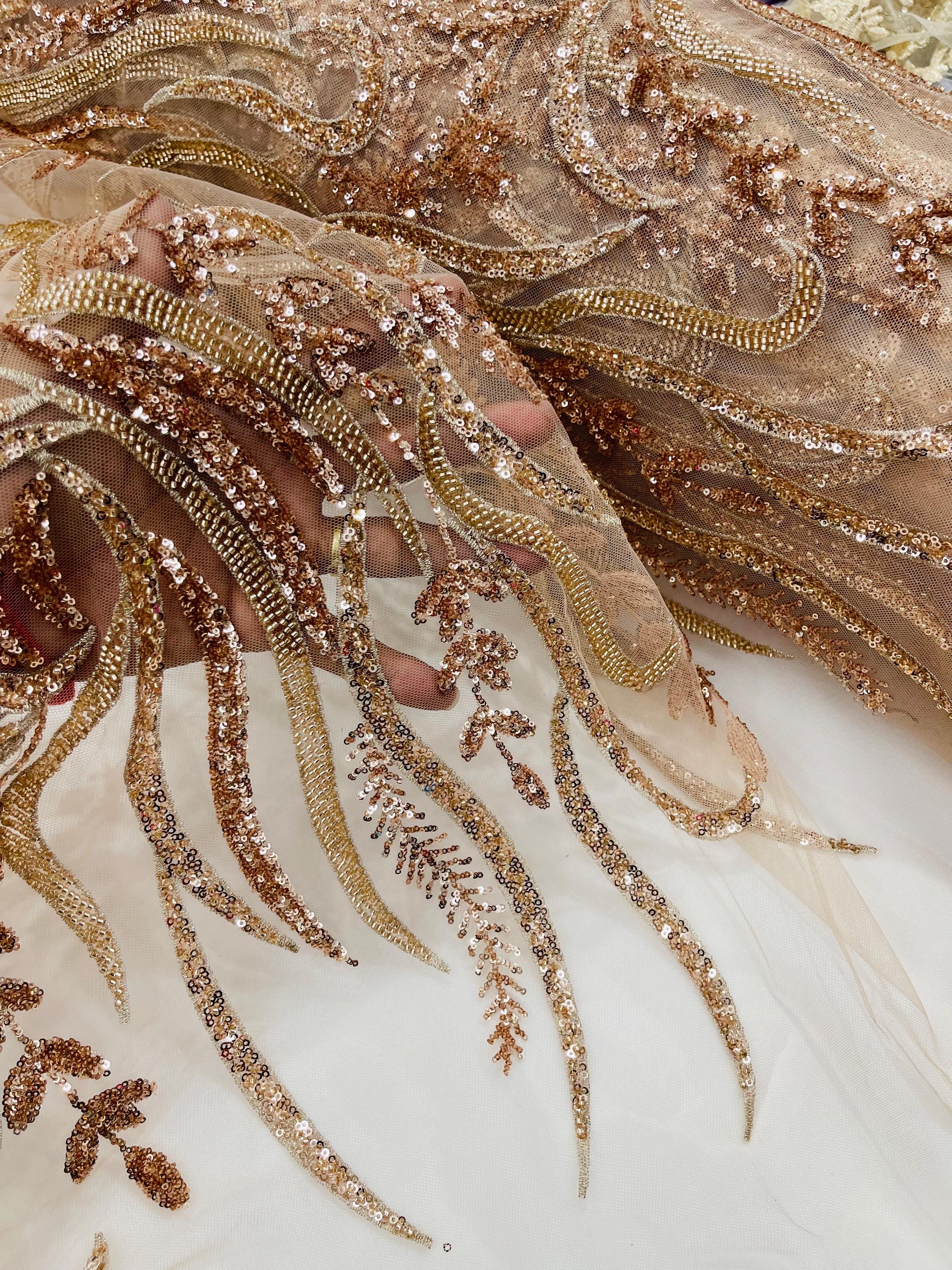 Rose Gold Beaded Lace Fabric: Embroidered Floral Mesh, Bridal Gown Material