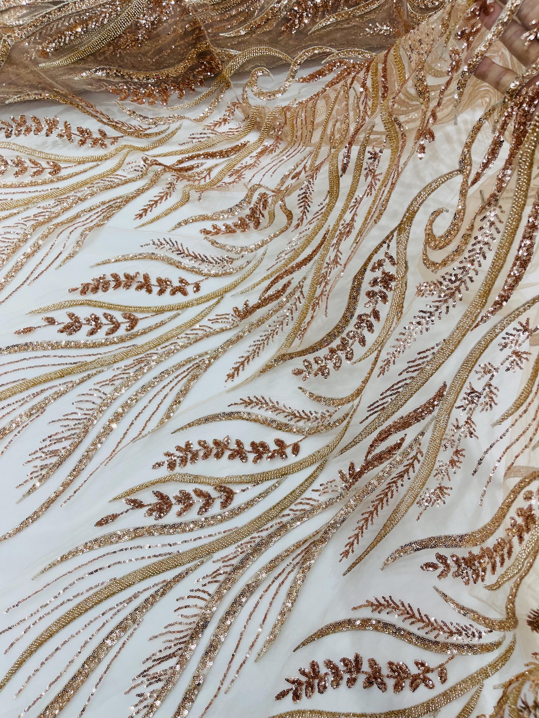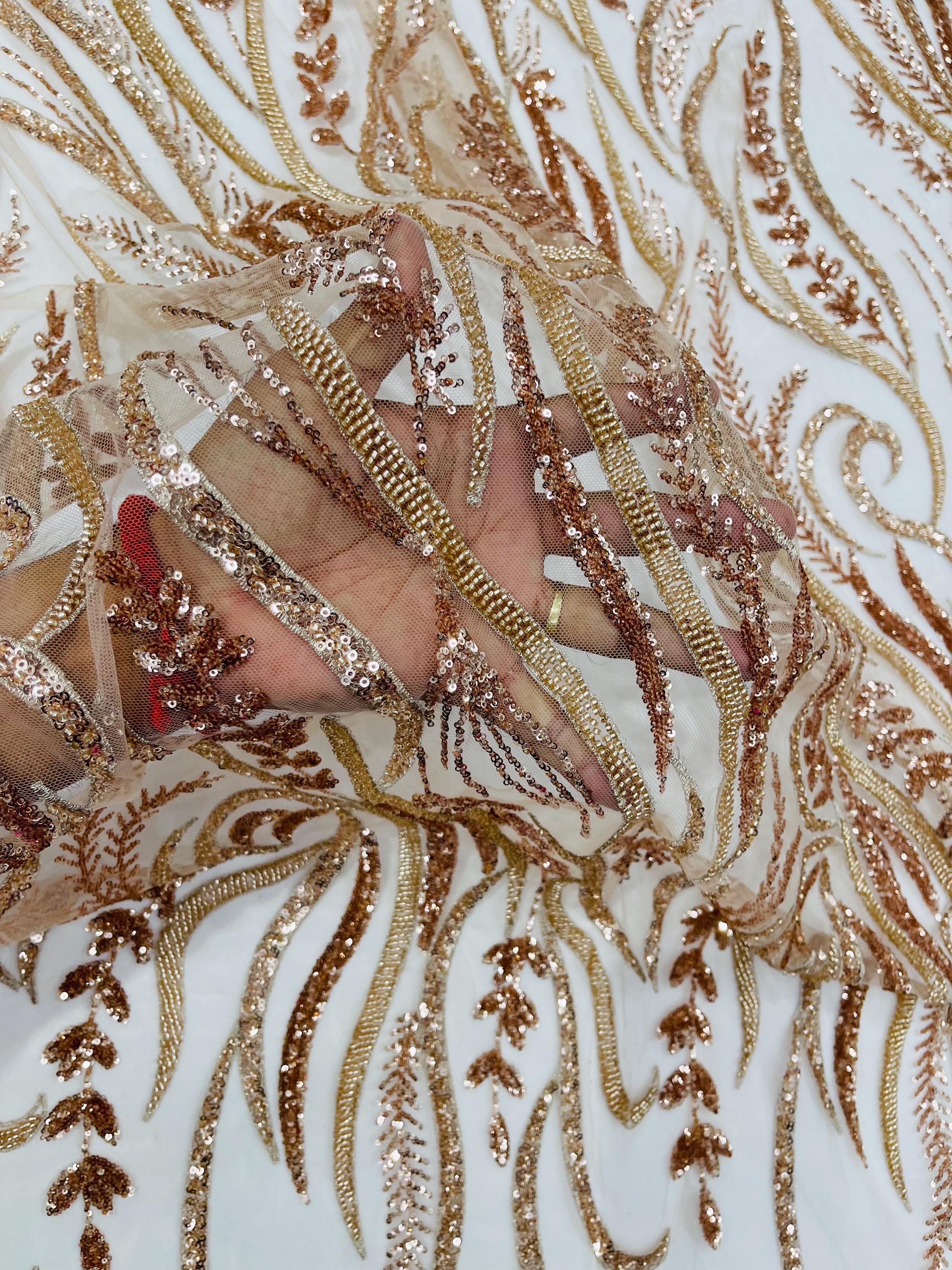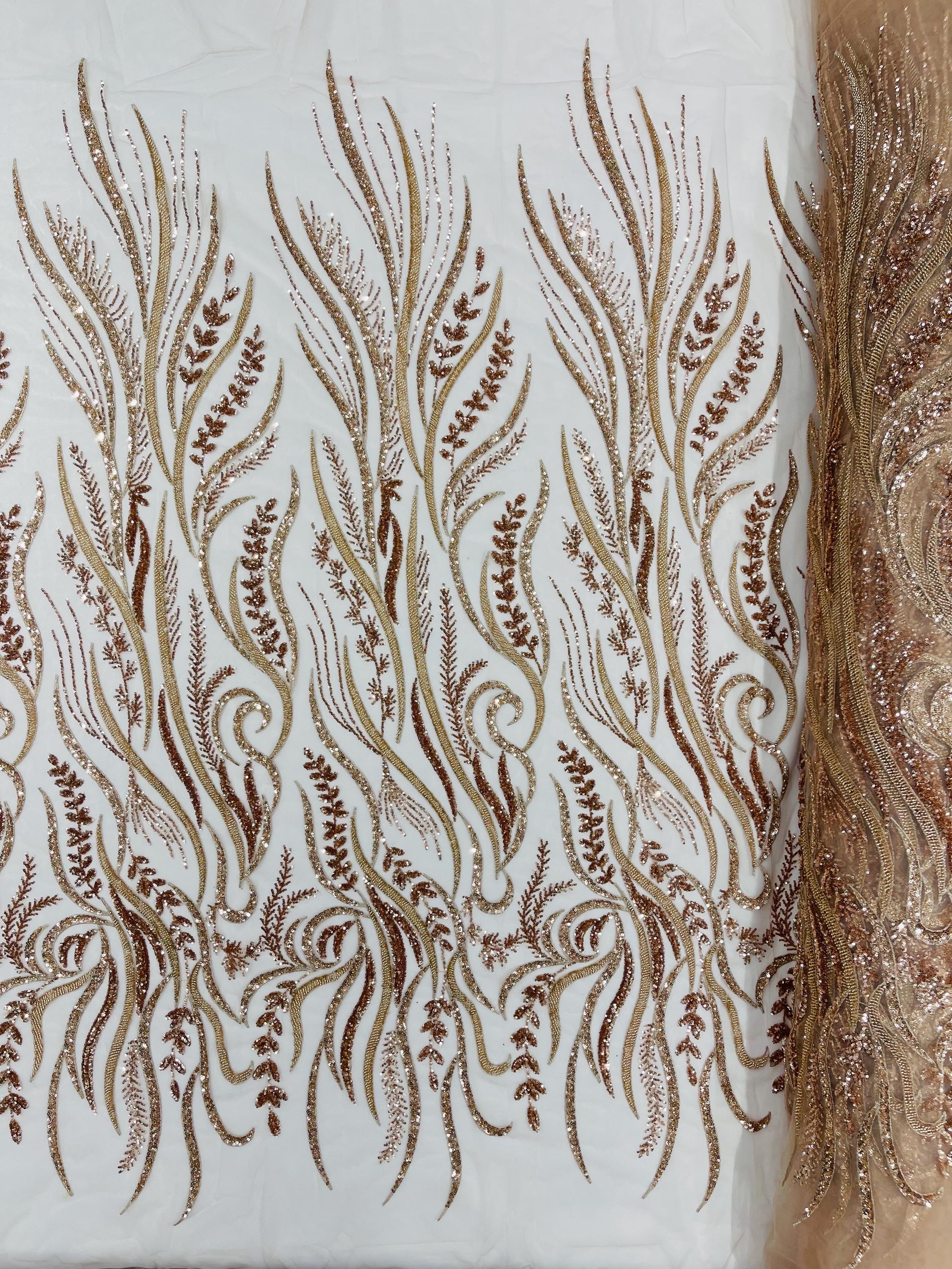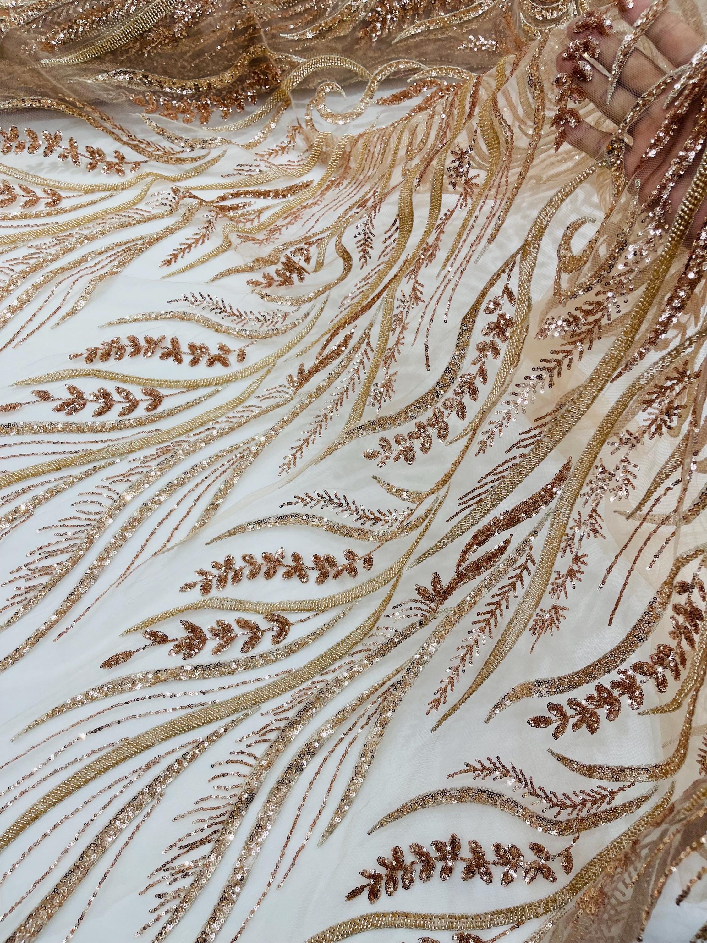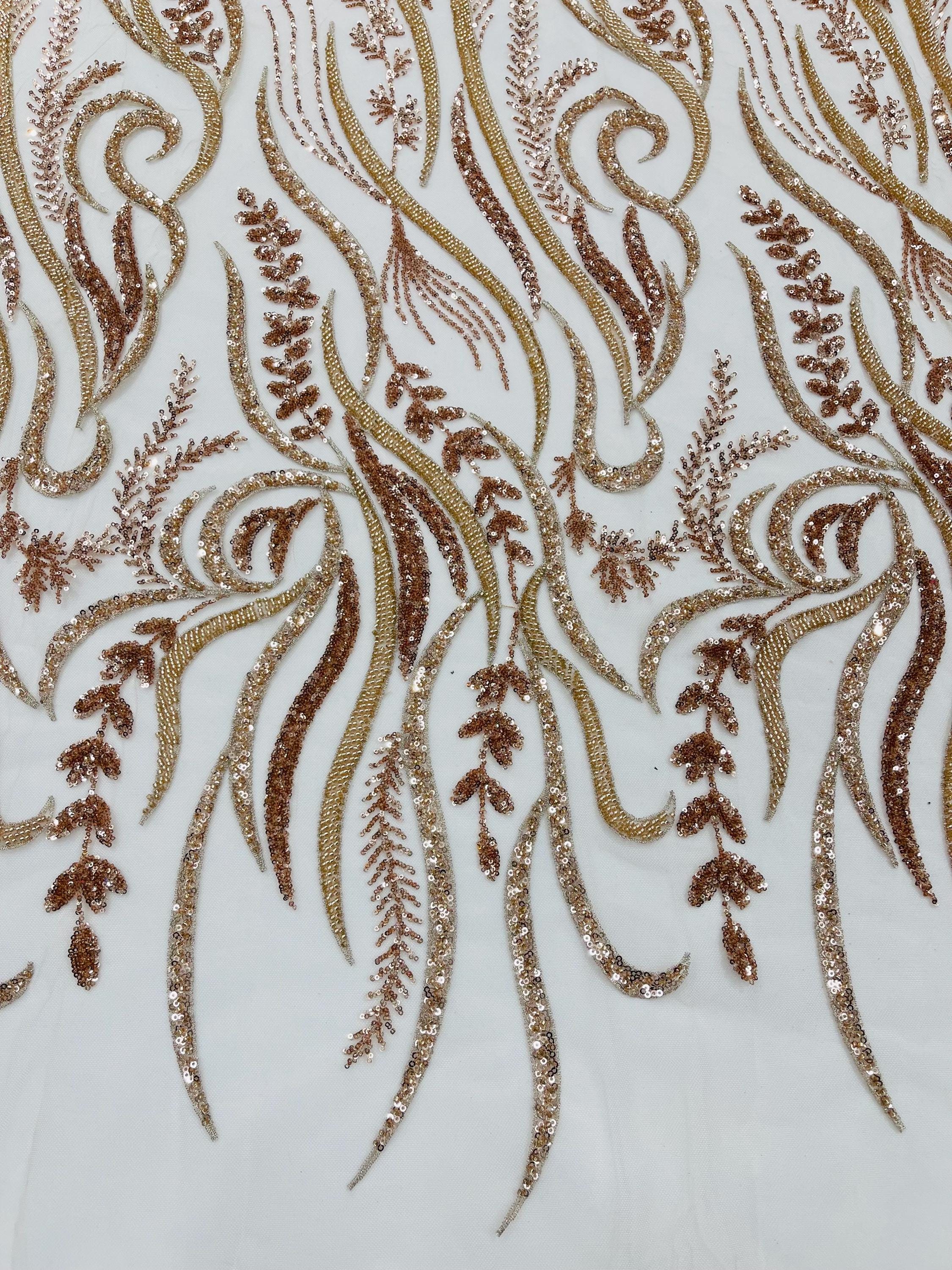 Rose Gold Beaded Lace Fabric: Embroidered Floral Mesh, Bridal Gown Material