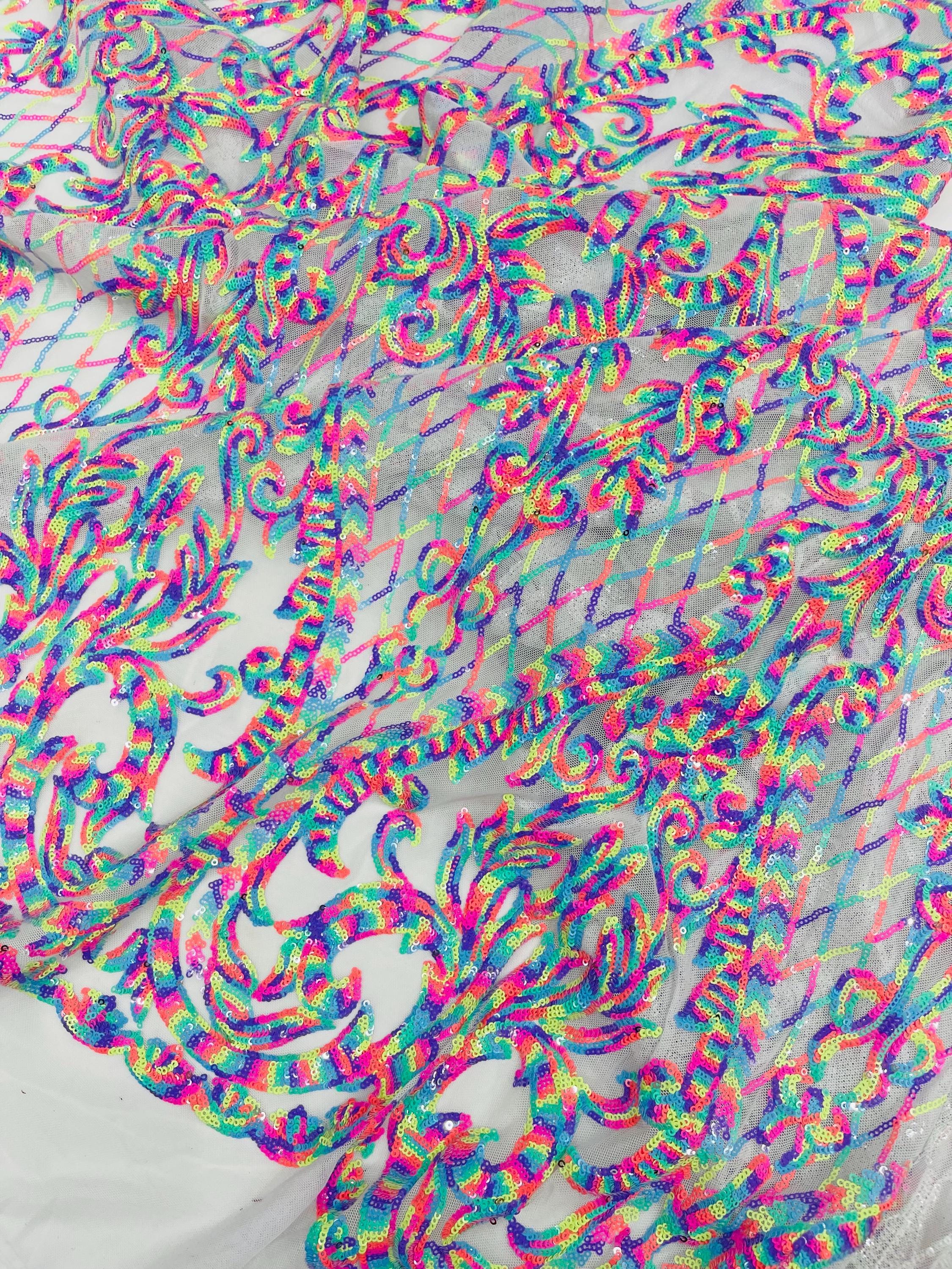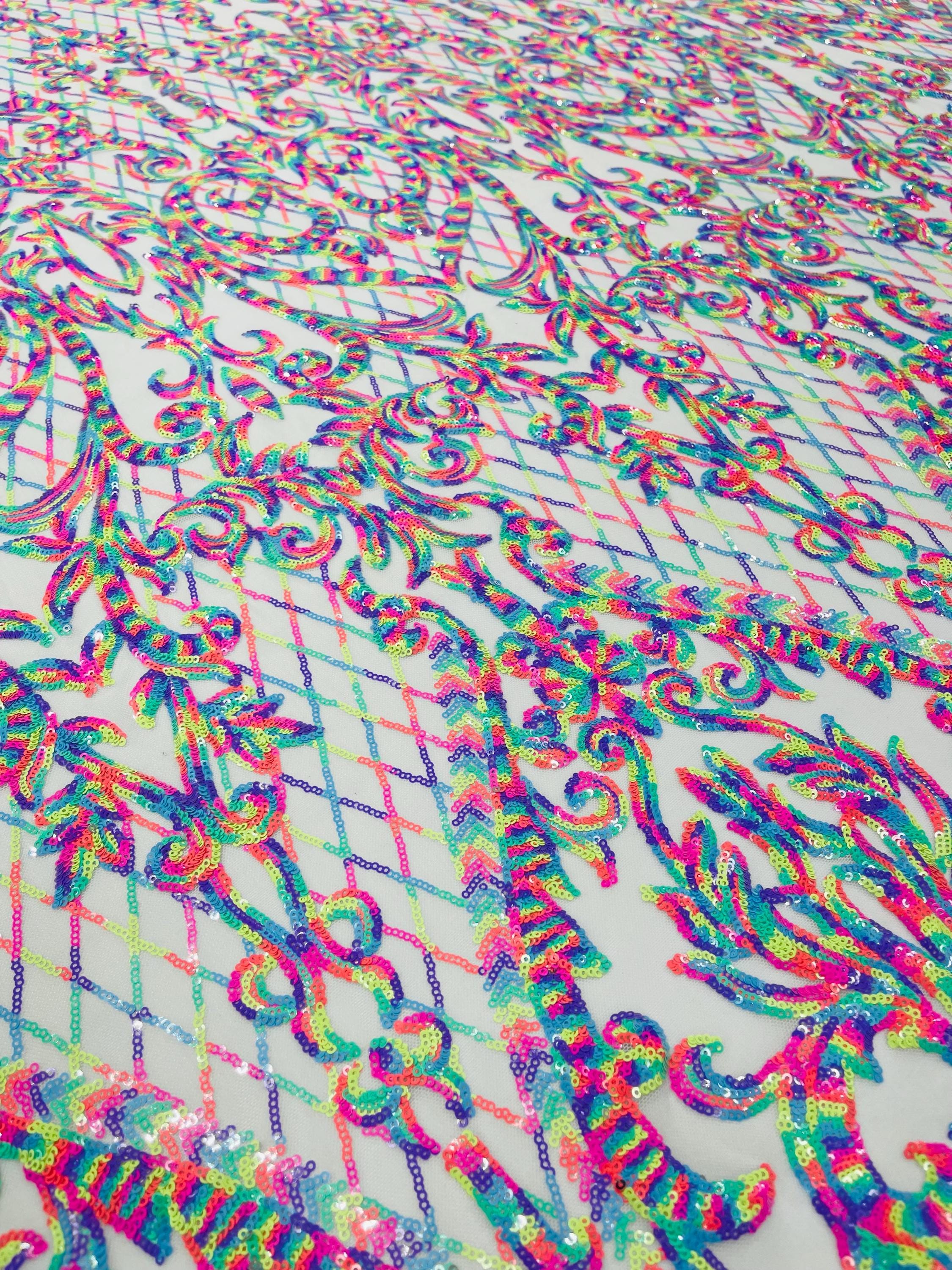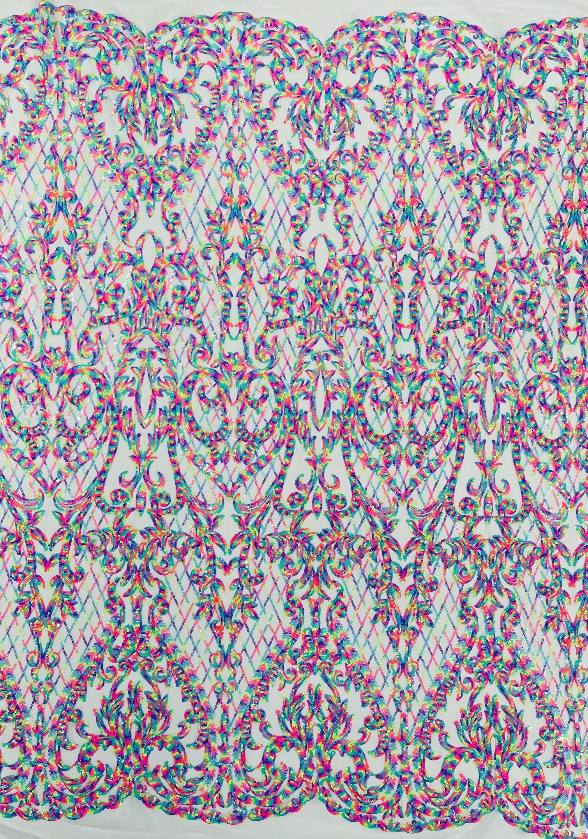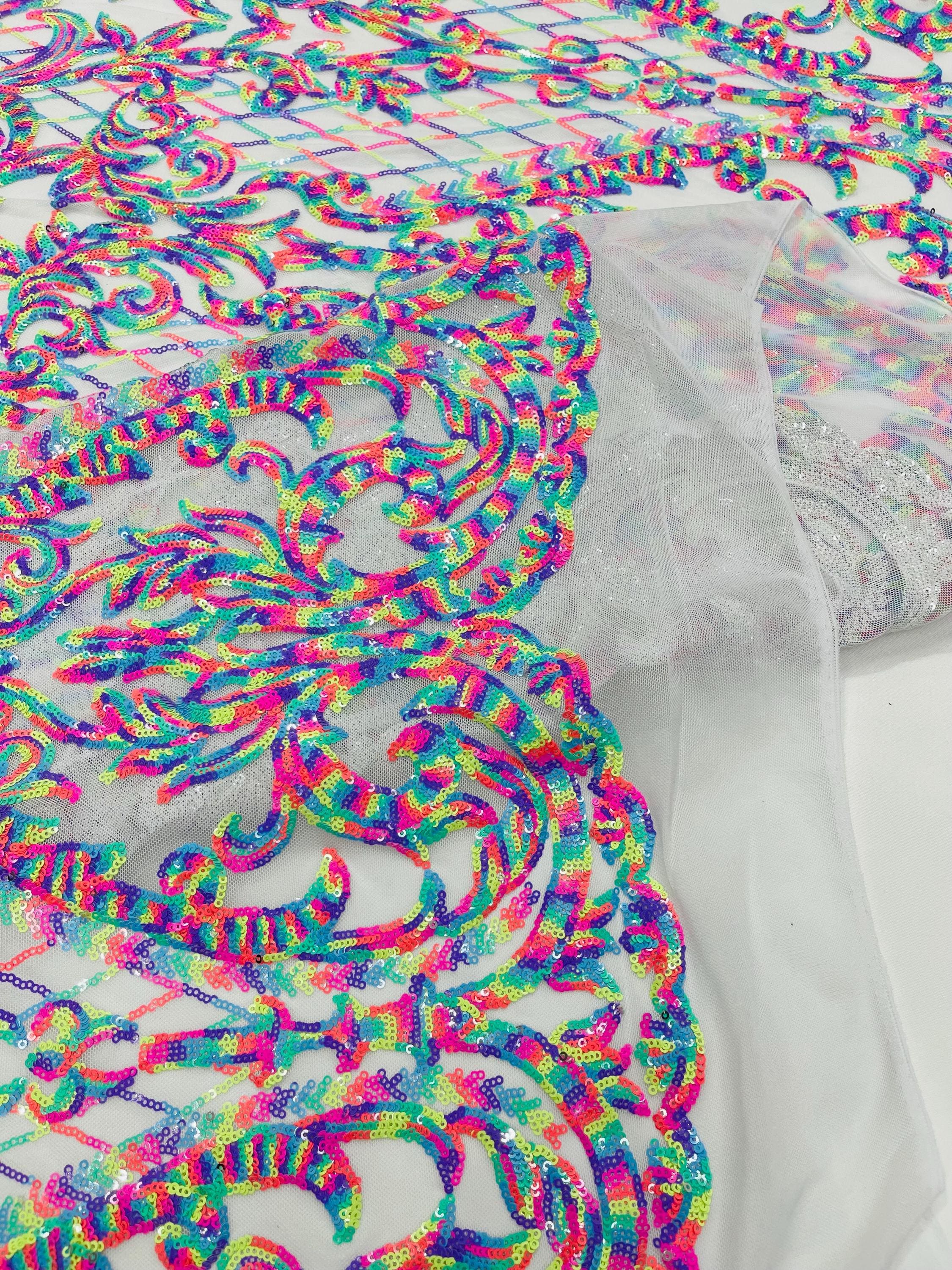 The material has a luxurious sequin design embroidered on the mesh.