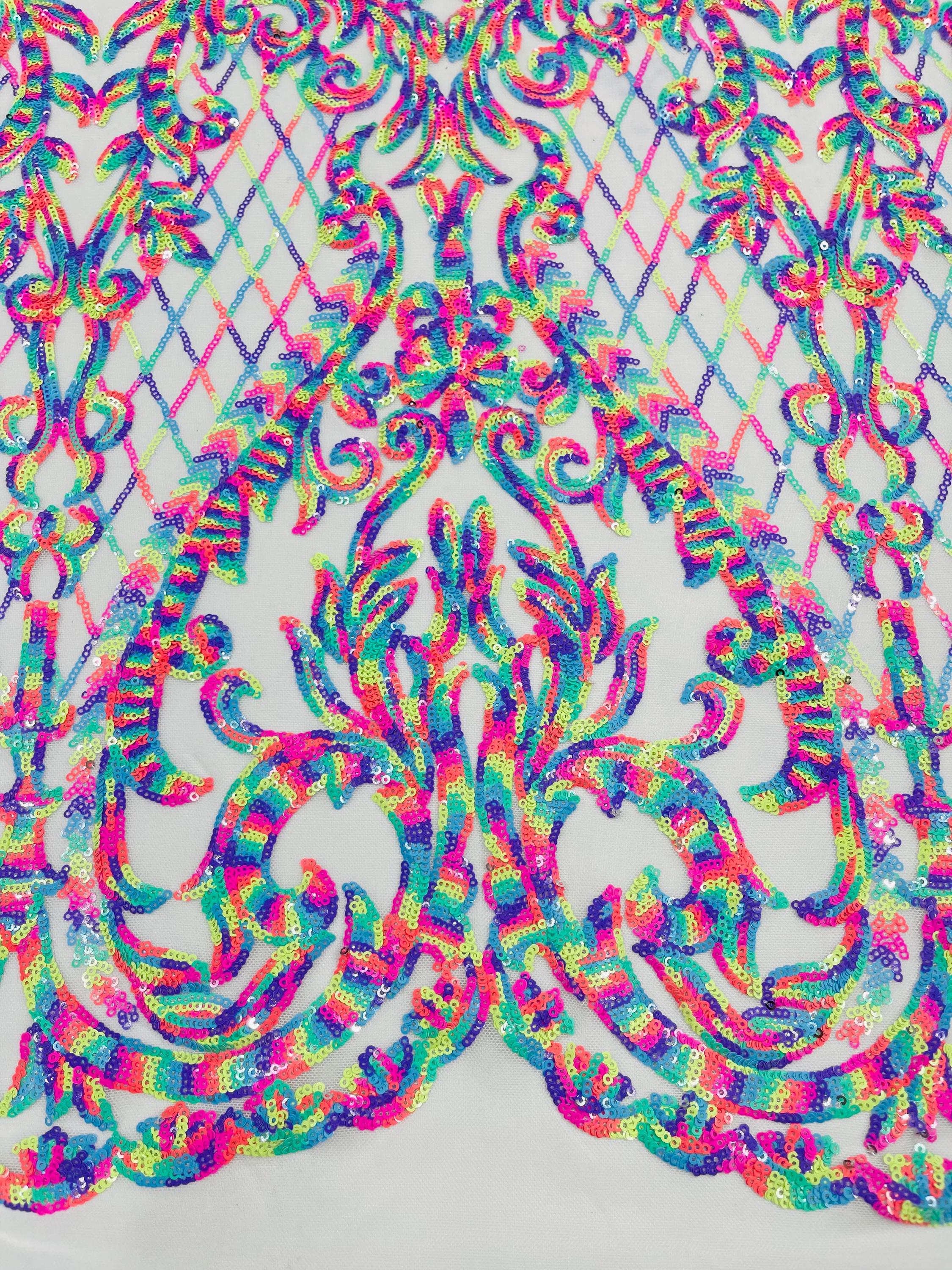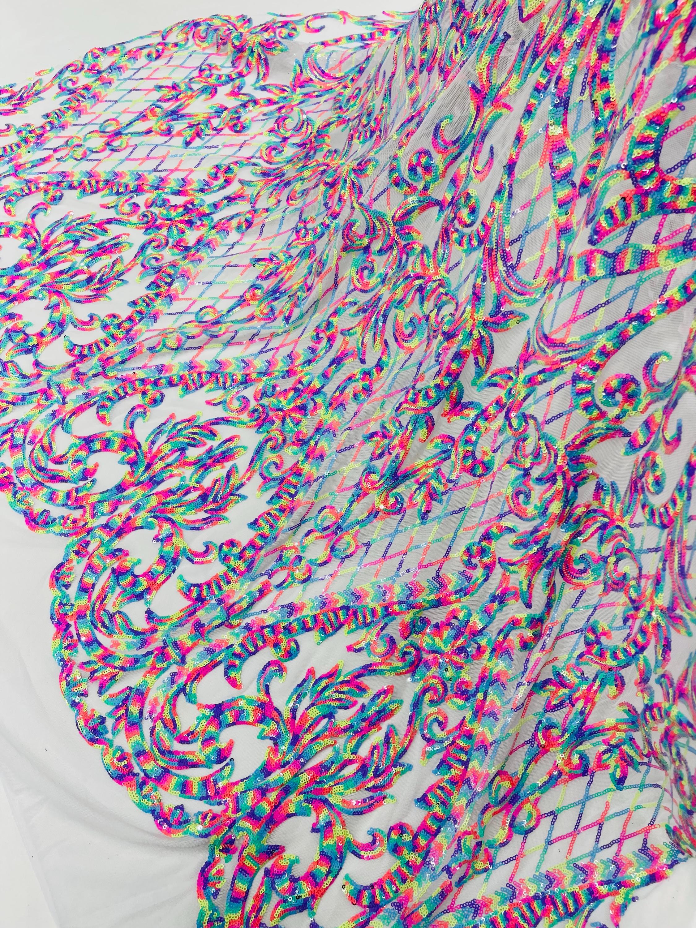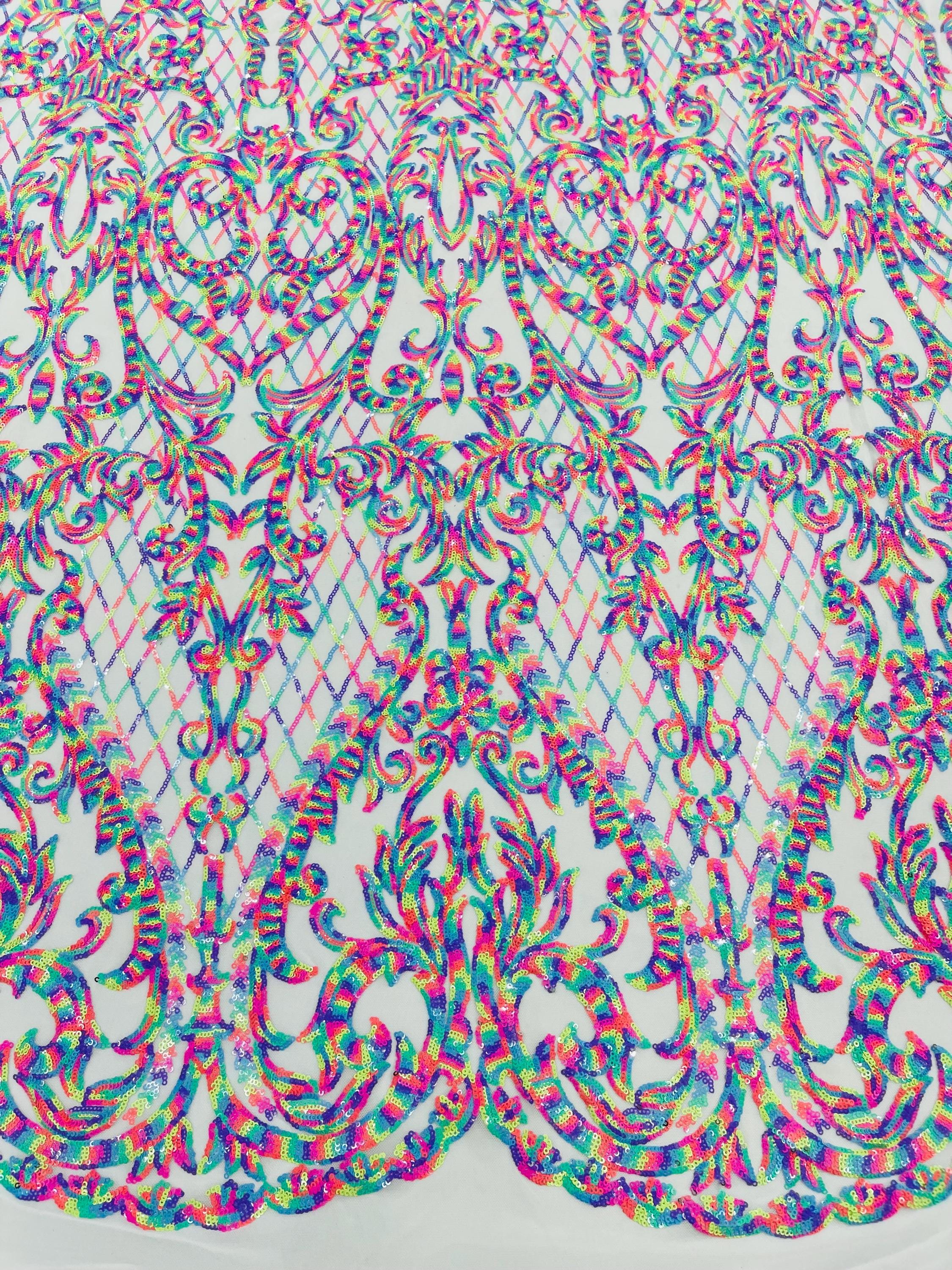 The material has a luxurious sequin design embroidered on the mesh.