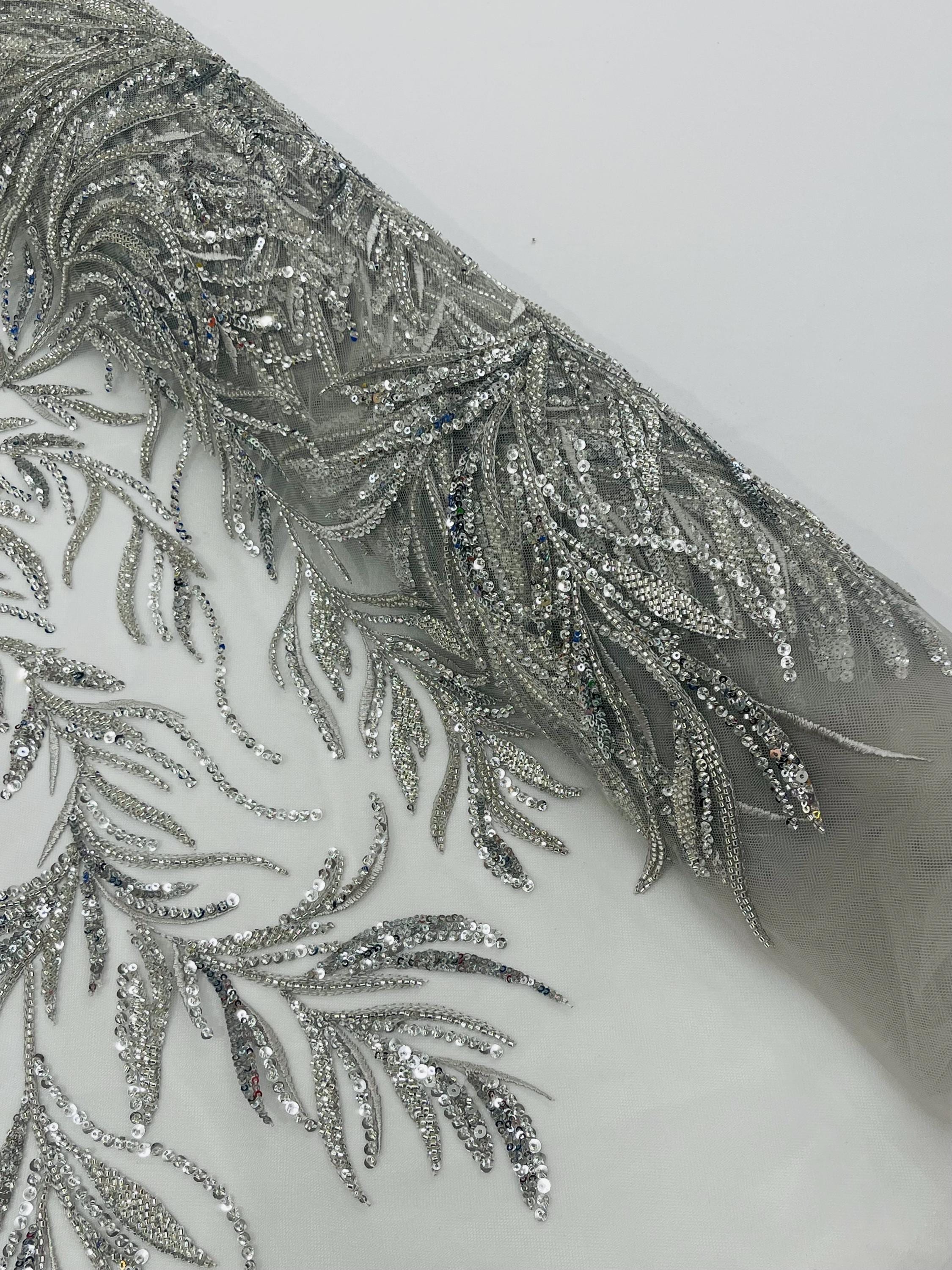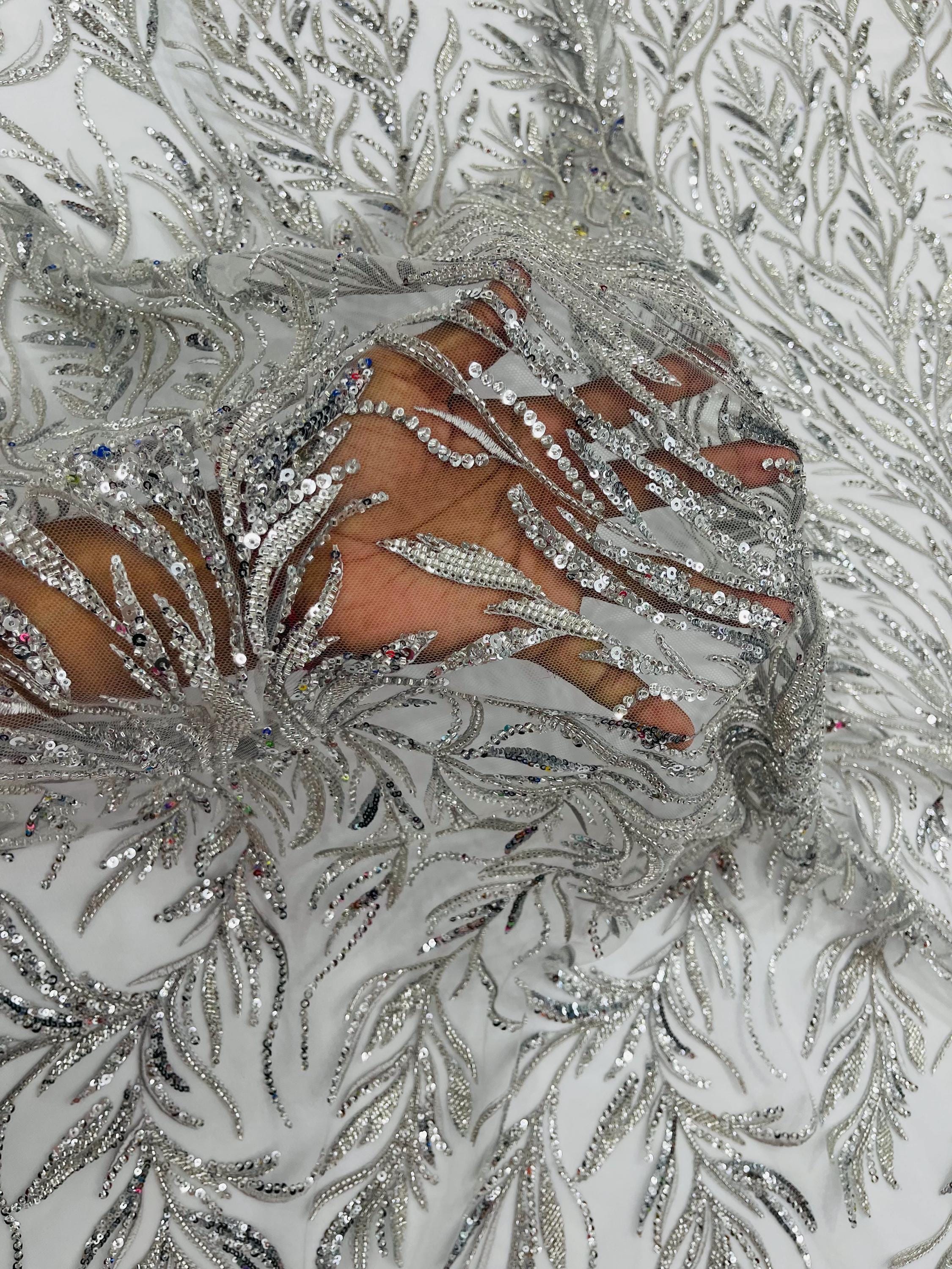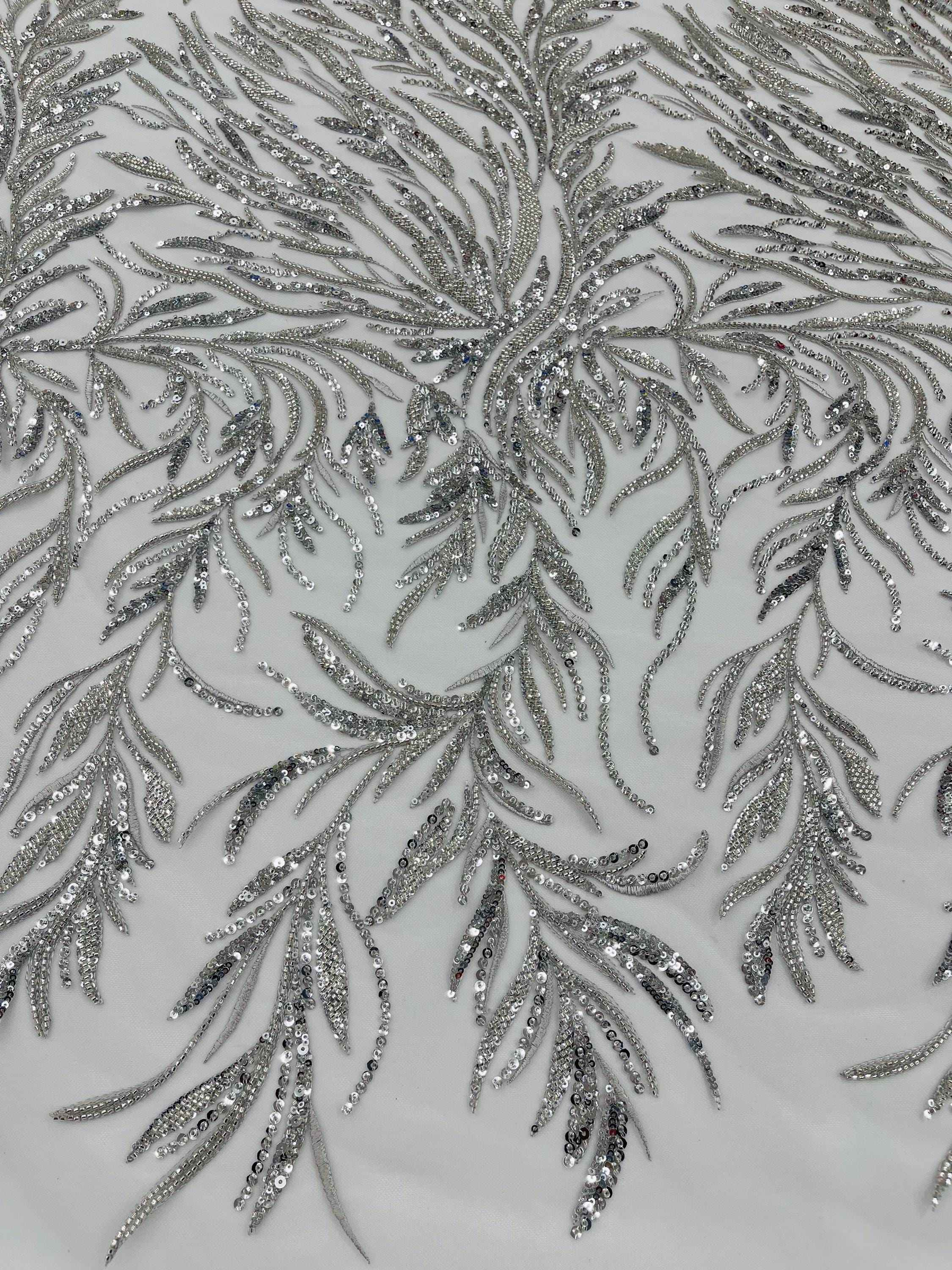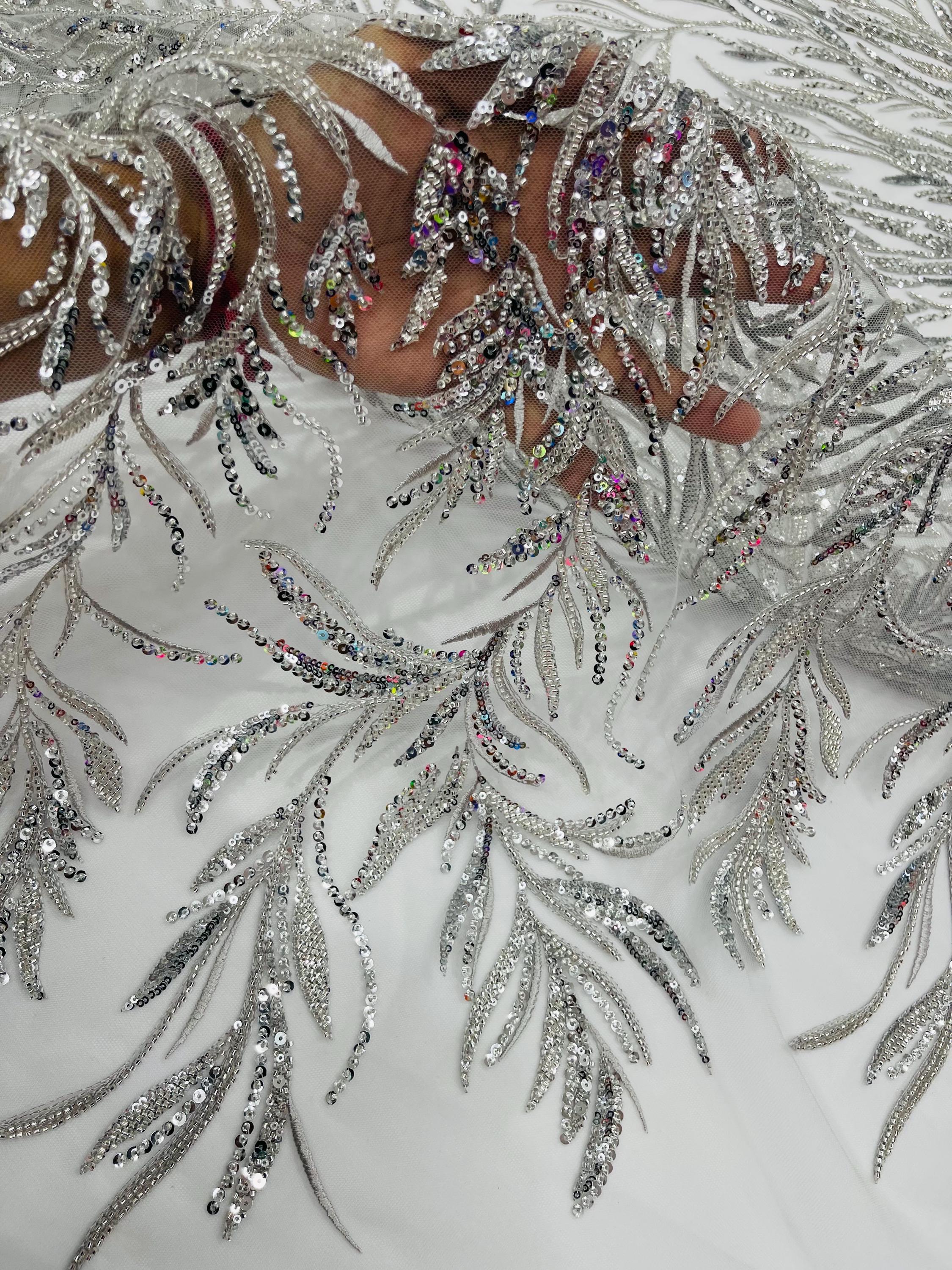 The beautiful design includes embroidered wavy leaf patterns with beads across a mesh fabric of great quality. It has a beautiful border on both ends. This lace can be used for dresses, tablecloths, nightgowns, prom gowns, bridesmaid gowns, wedding gowns, table covers/runners, pillows, home /event decorations, and much more.