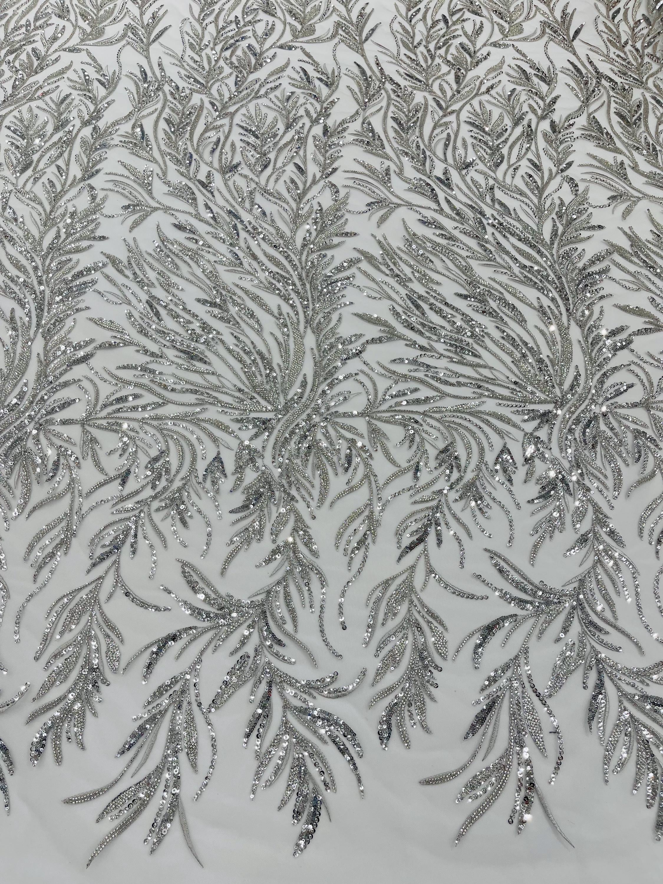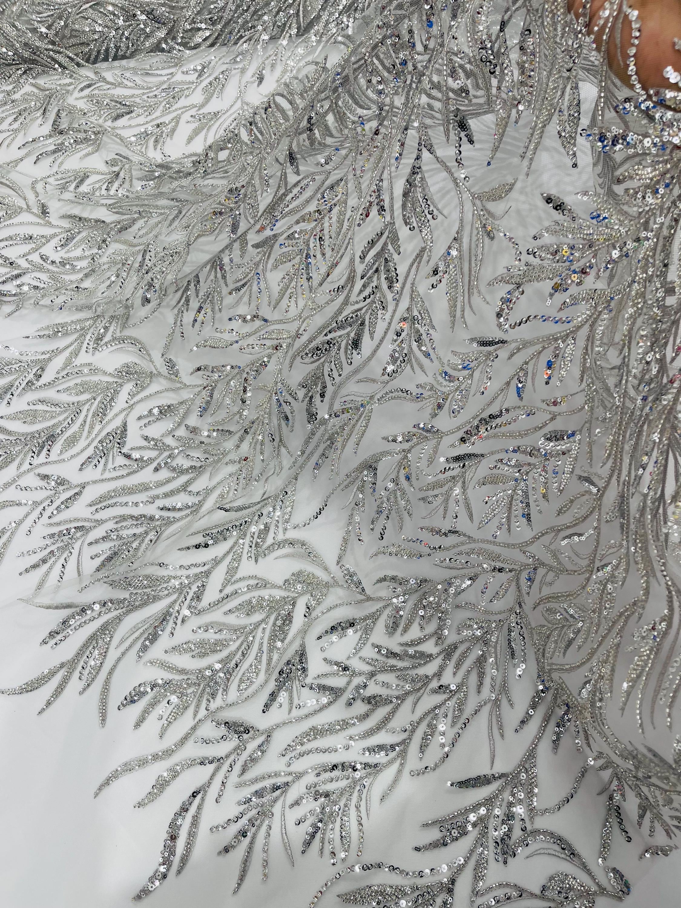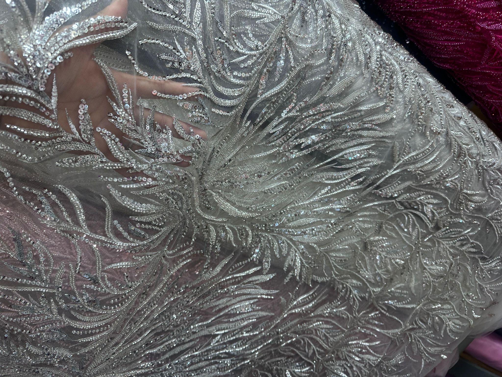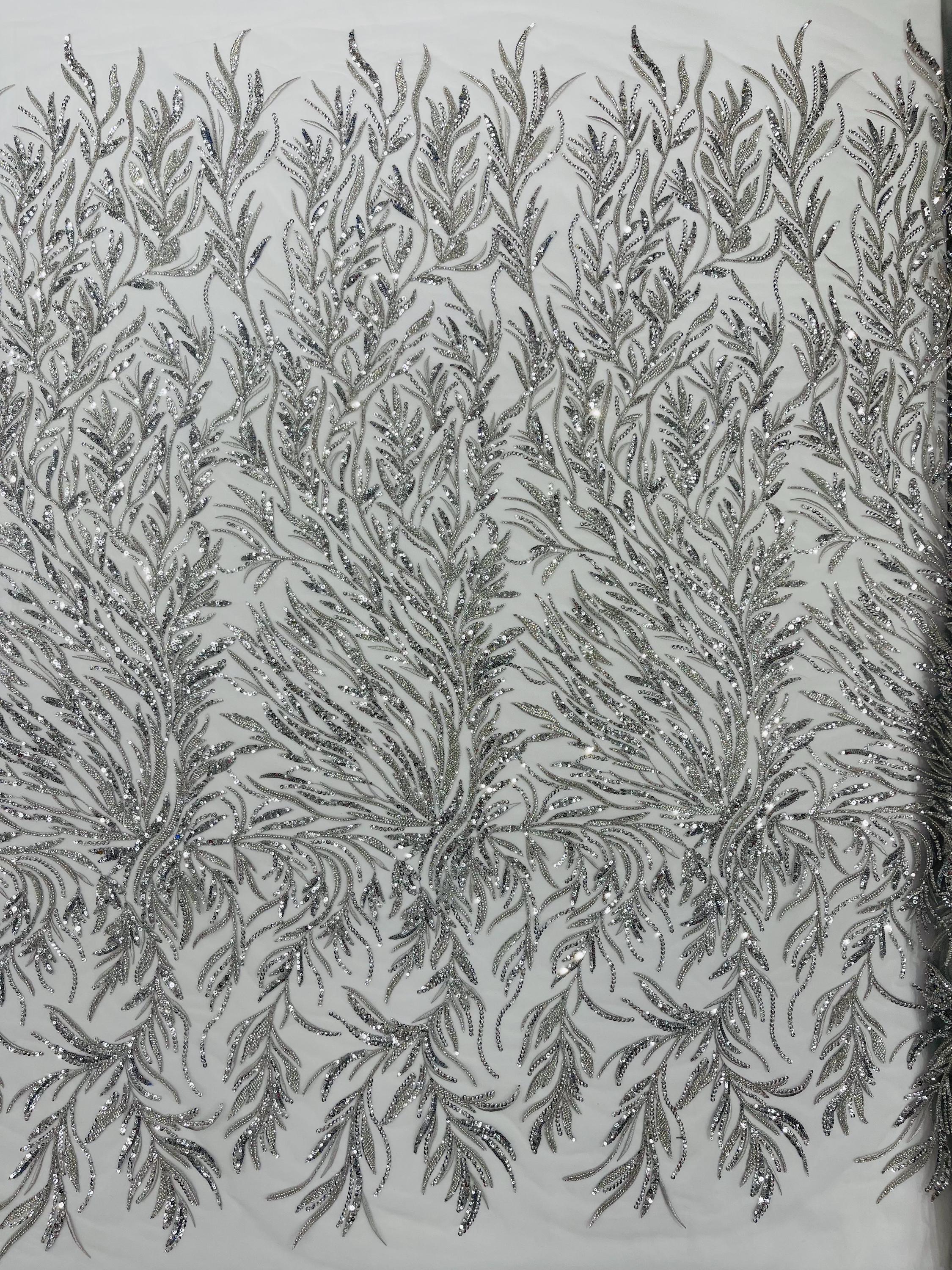 The beautiful design includes embroidered wavy leaf patterns with beads across a mesh fabric of great quality. It has a beautiful border on both ends. This lace can be used for dresses, tablecloths, nightgowns, prom gowns, bridesmaid gowns, wedding gowns, table covers/runners, pillows, home /event decorations, and much more.