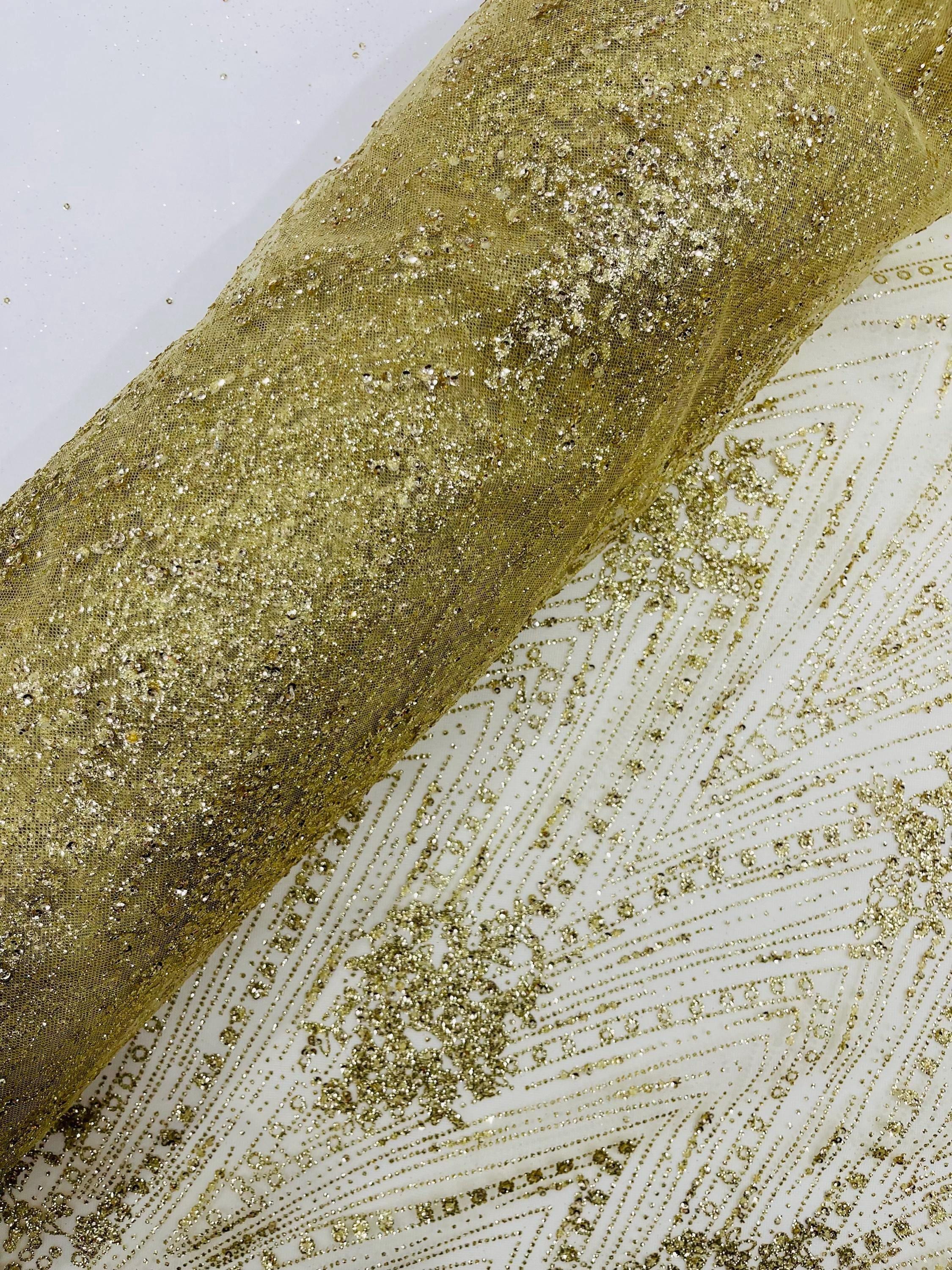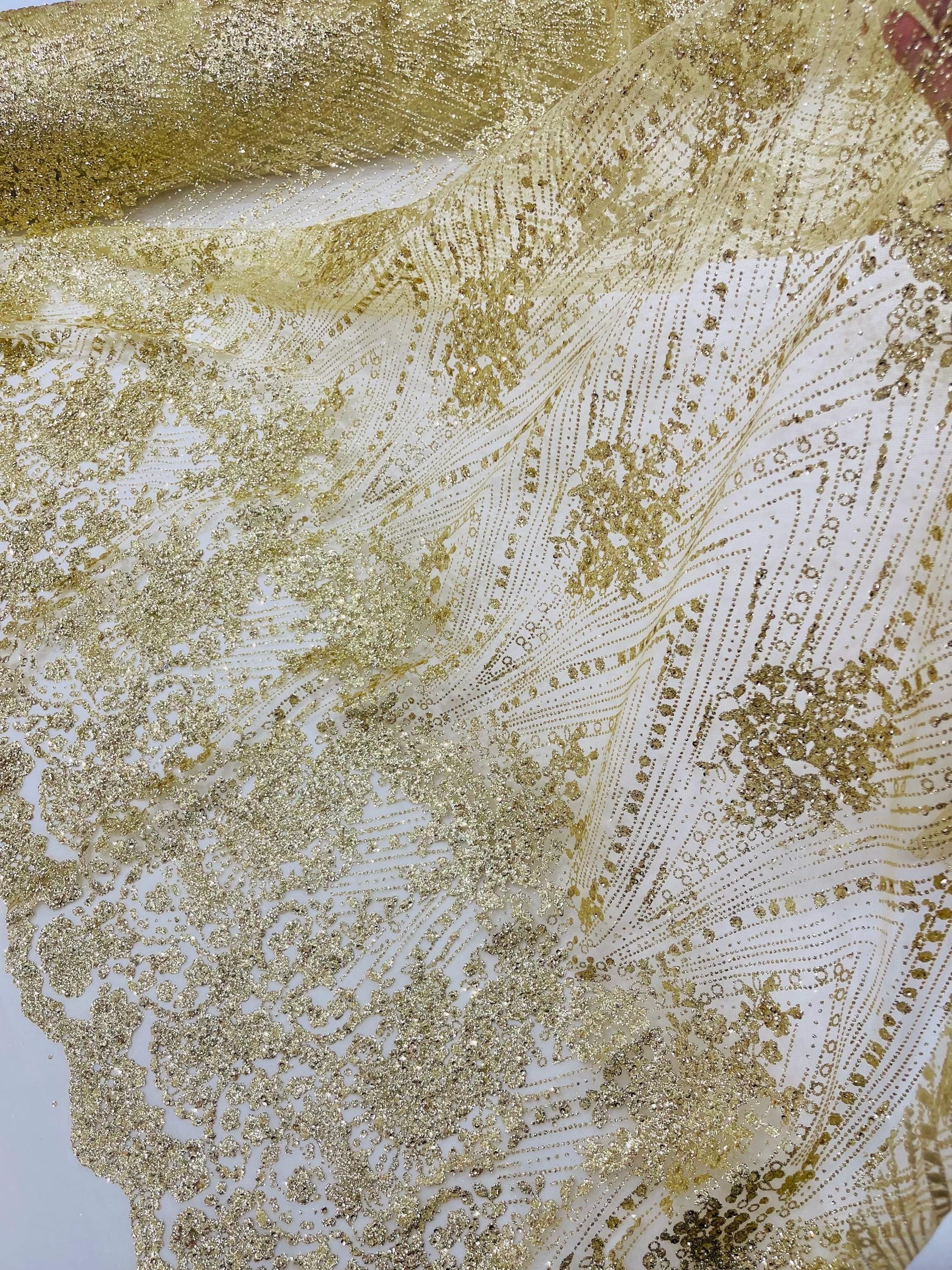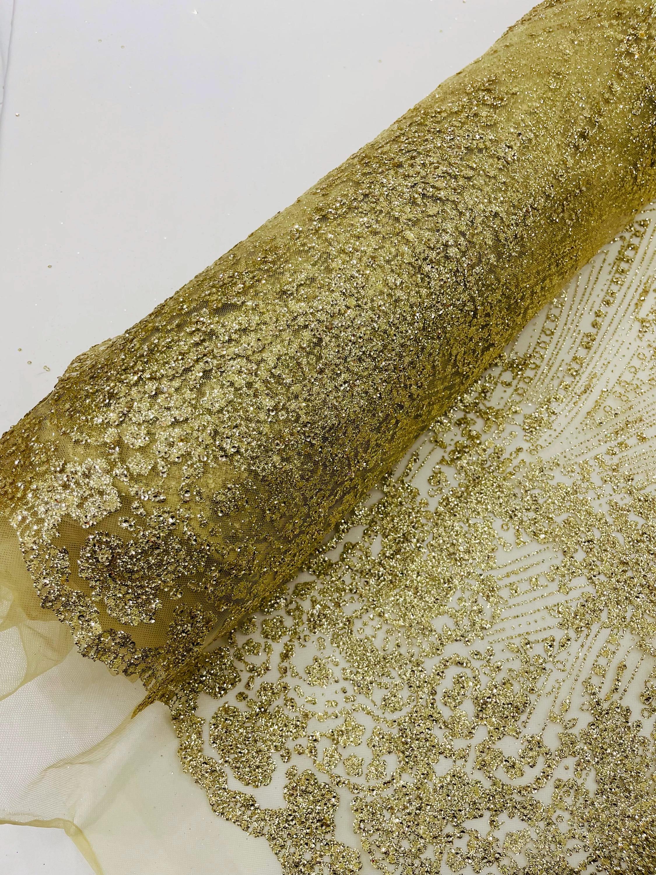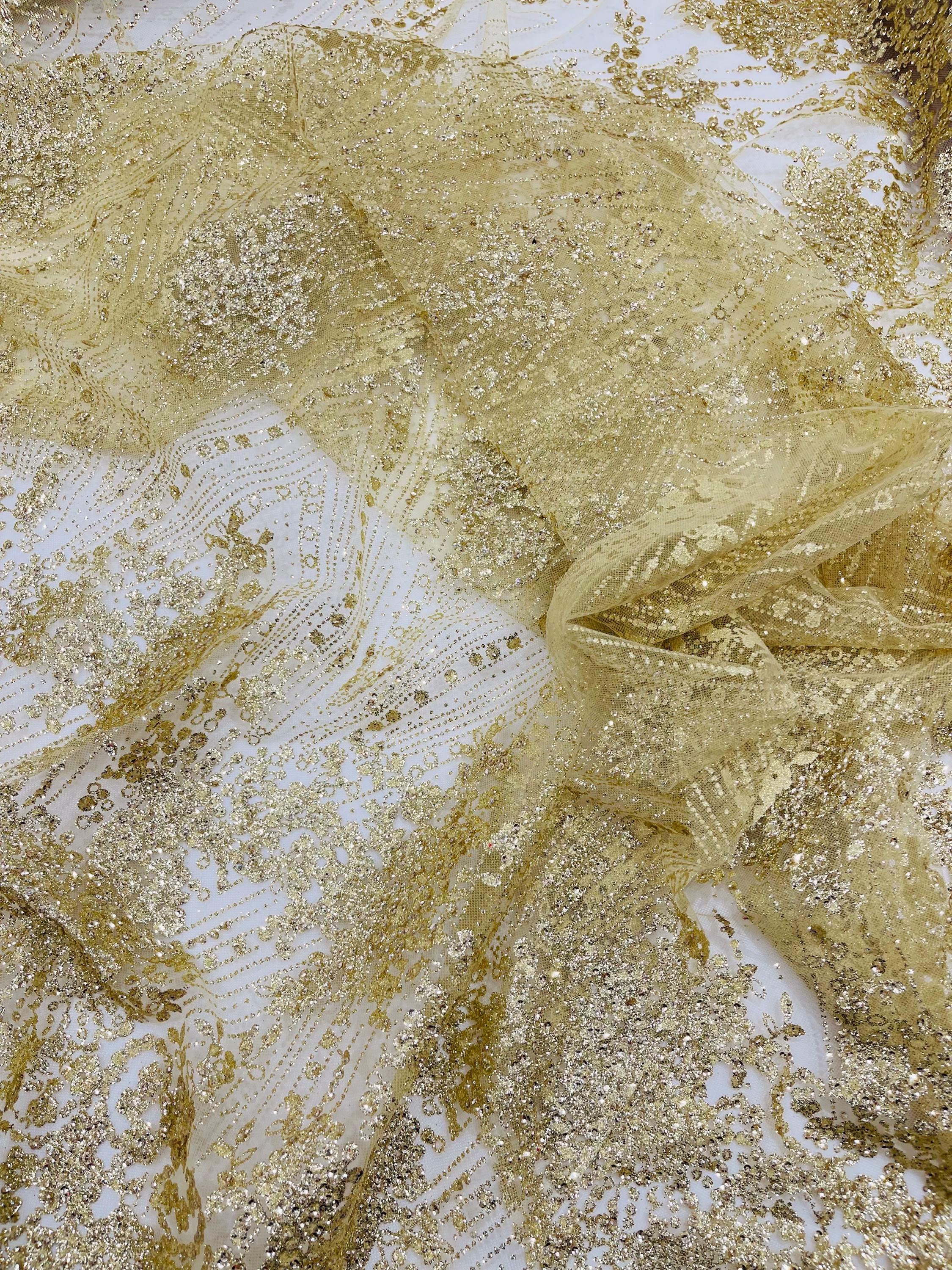 This elegant Glitter on mesh, Stand out magnificently as you gracefully appear wearing this stunning fabric. This lace has small Glitters glued on the mesh fabric and sheds too. Also this fabric is sheer with lots of glitters. If there is any shedding, it remains very sparkly. The whole Fabric Intricate throughout with color Glitter giving it a gorgeous and regal feel.