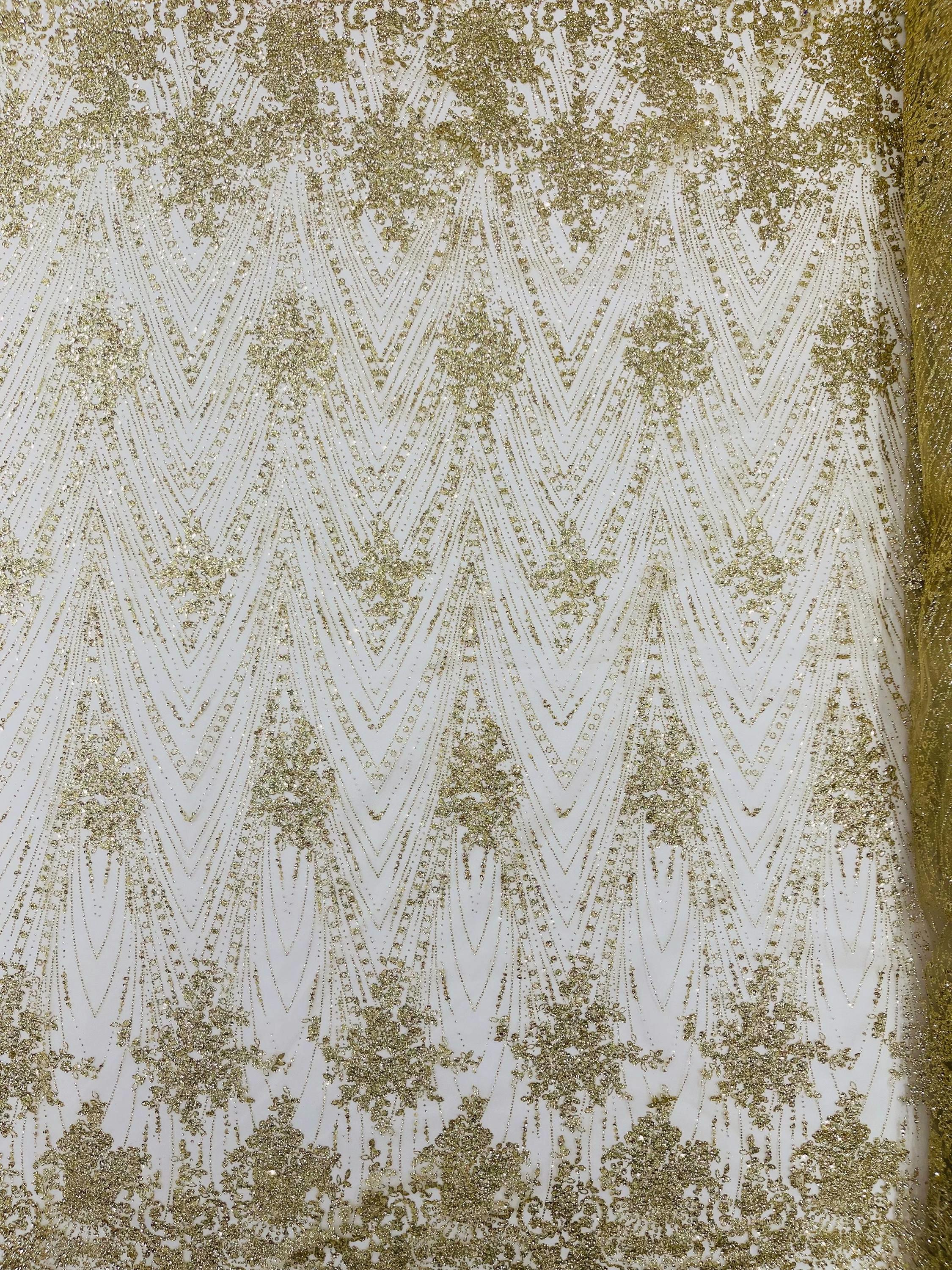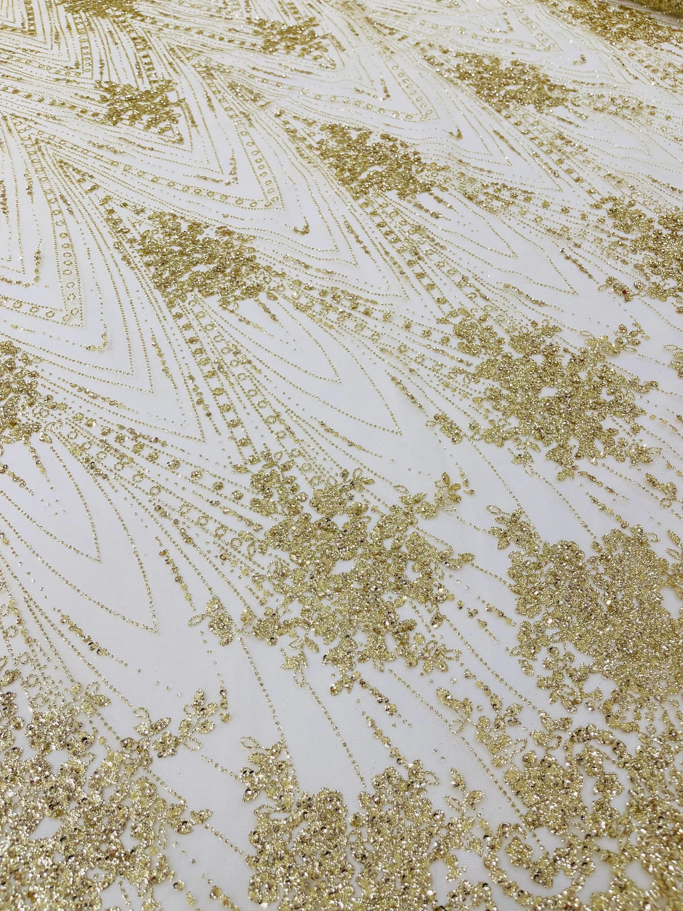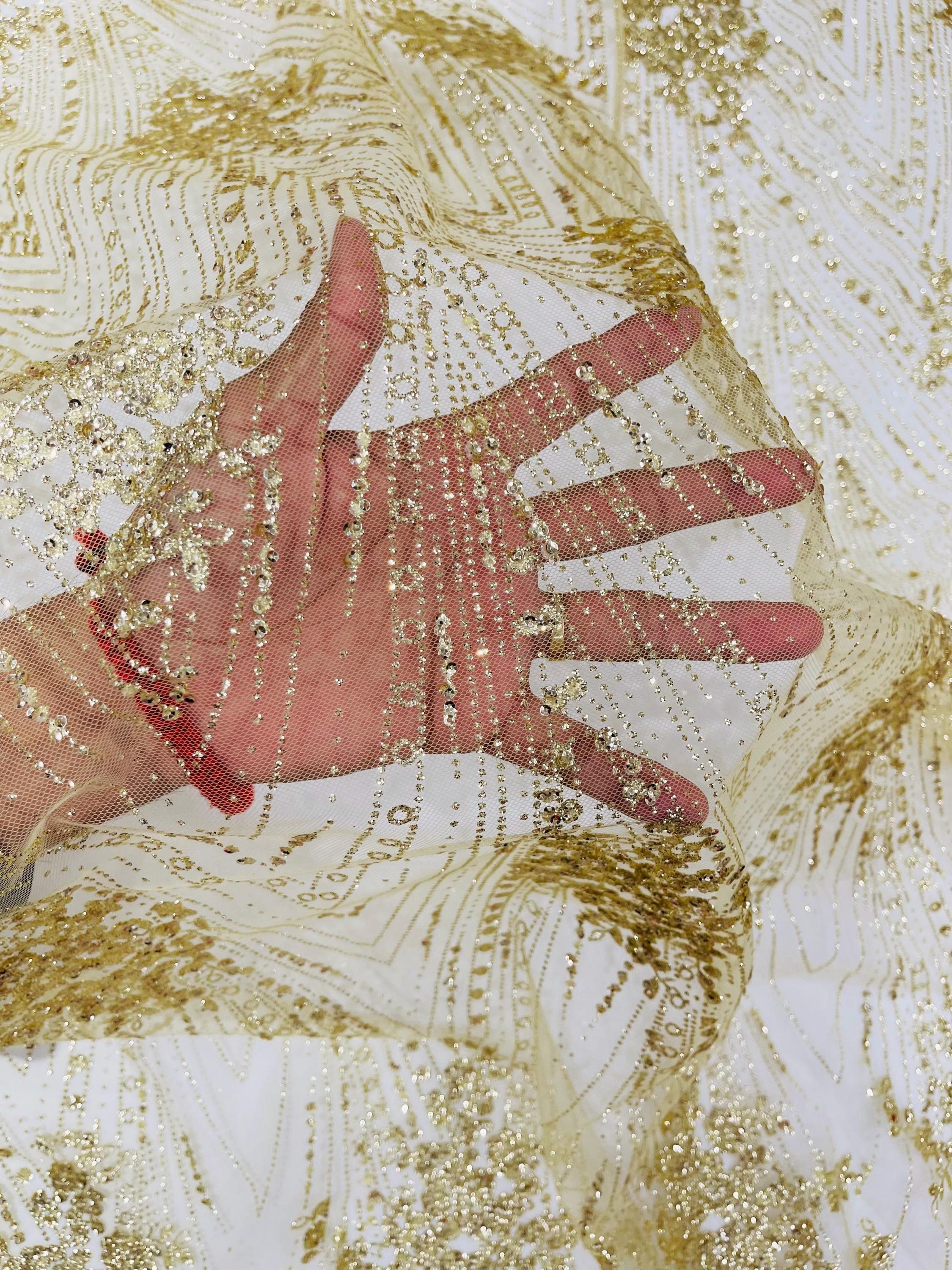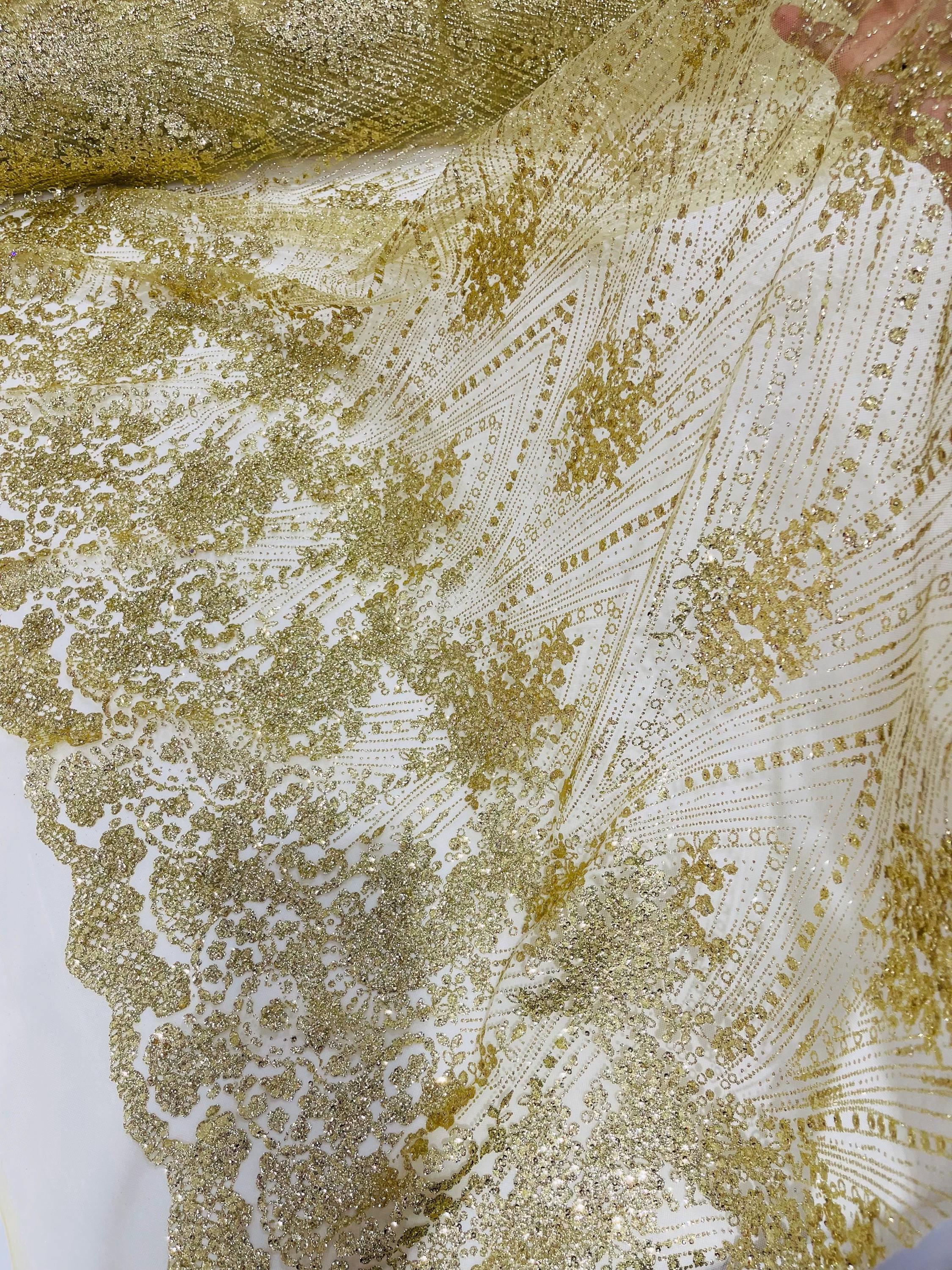 This elegant Glitter on mesh, Stand out magnificently as you gracefully appear wearing this stunning fabric. This lace has small Glitters glued on the mesh fabric and sheds too. Also this fabric is sheer with lots of glitters. If there is any shedding, it remains very sparkly. The whole Fabric Intricate throughout with color Glitter giving it a gorgeous and regal feel.