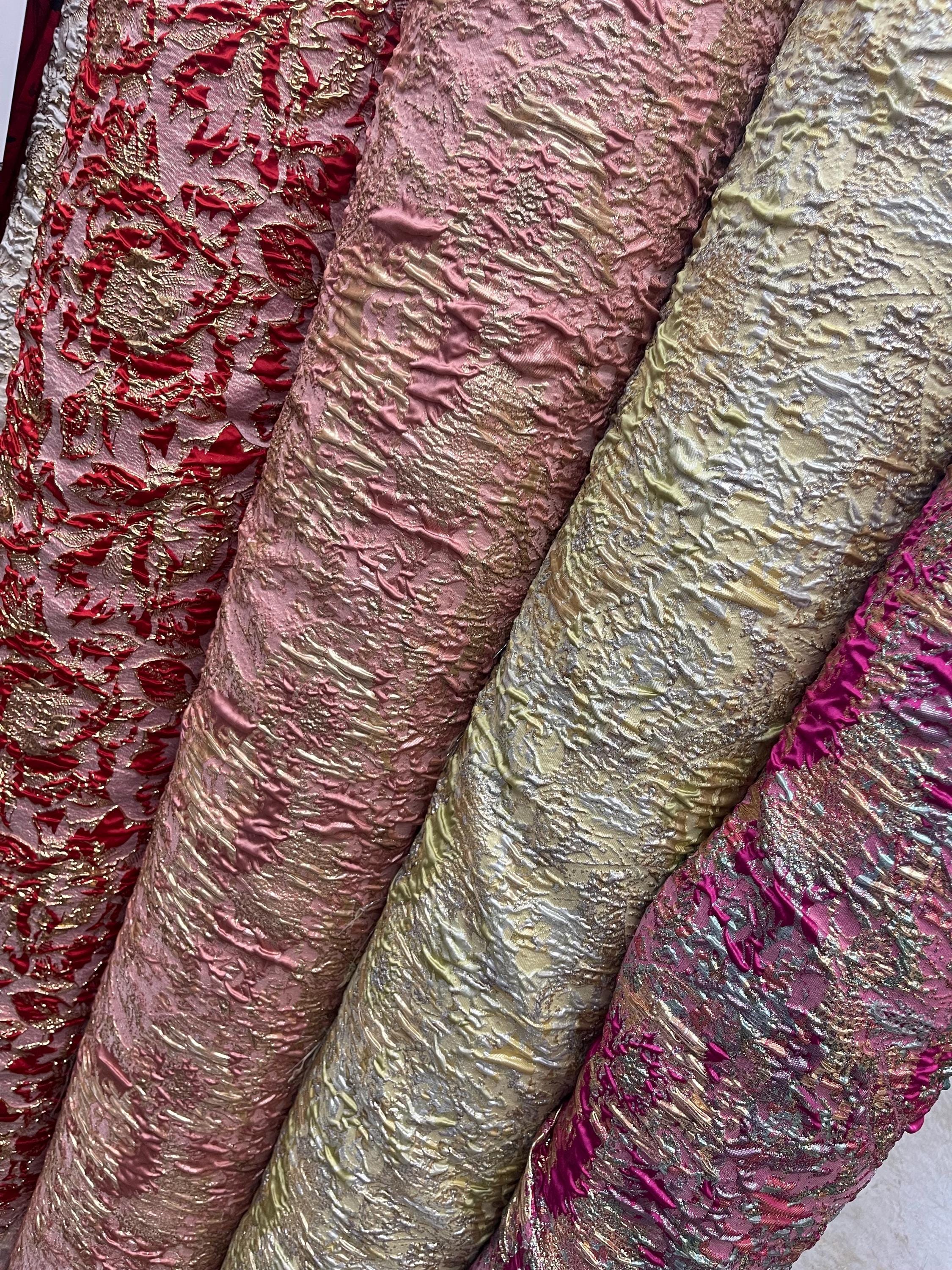 This is a rich and unique crinkle flower pattern that gives a perfect texture to any project with a mixture of fuchsia, pink, green, mint and silver shades that make the perfect combination. Exquisite flower jacquard design fabric that showcases a nice crinkle texture that together with shinny metallic gold yarn gives the perfect shine from every angle.