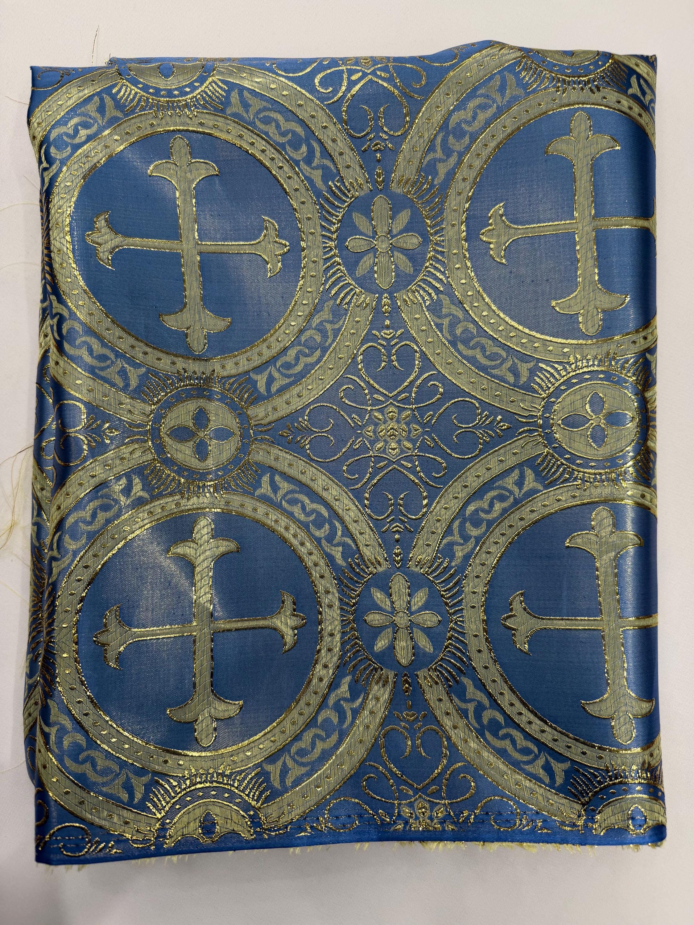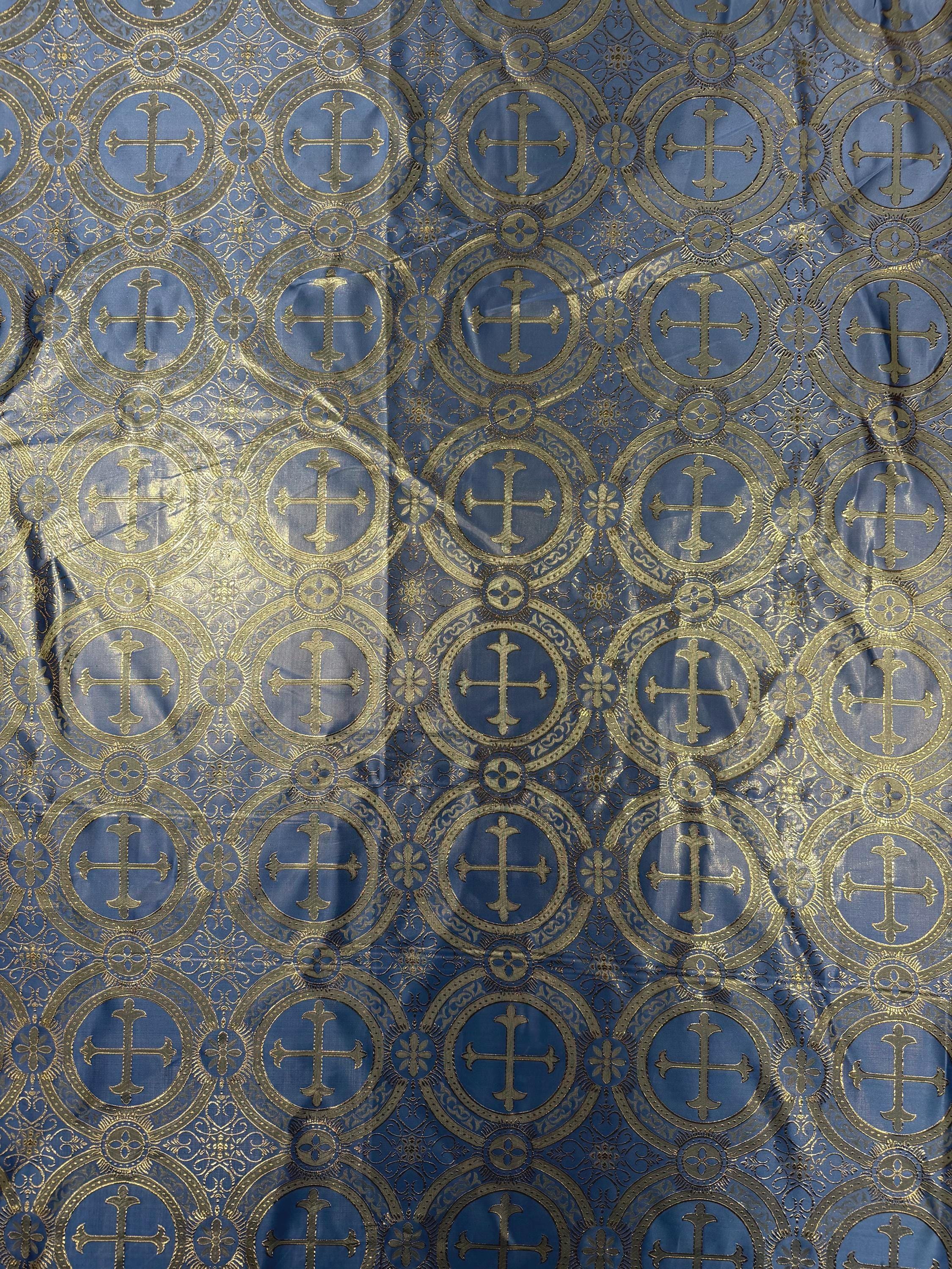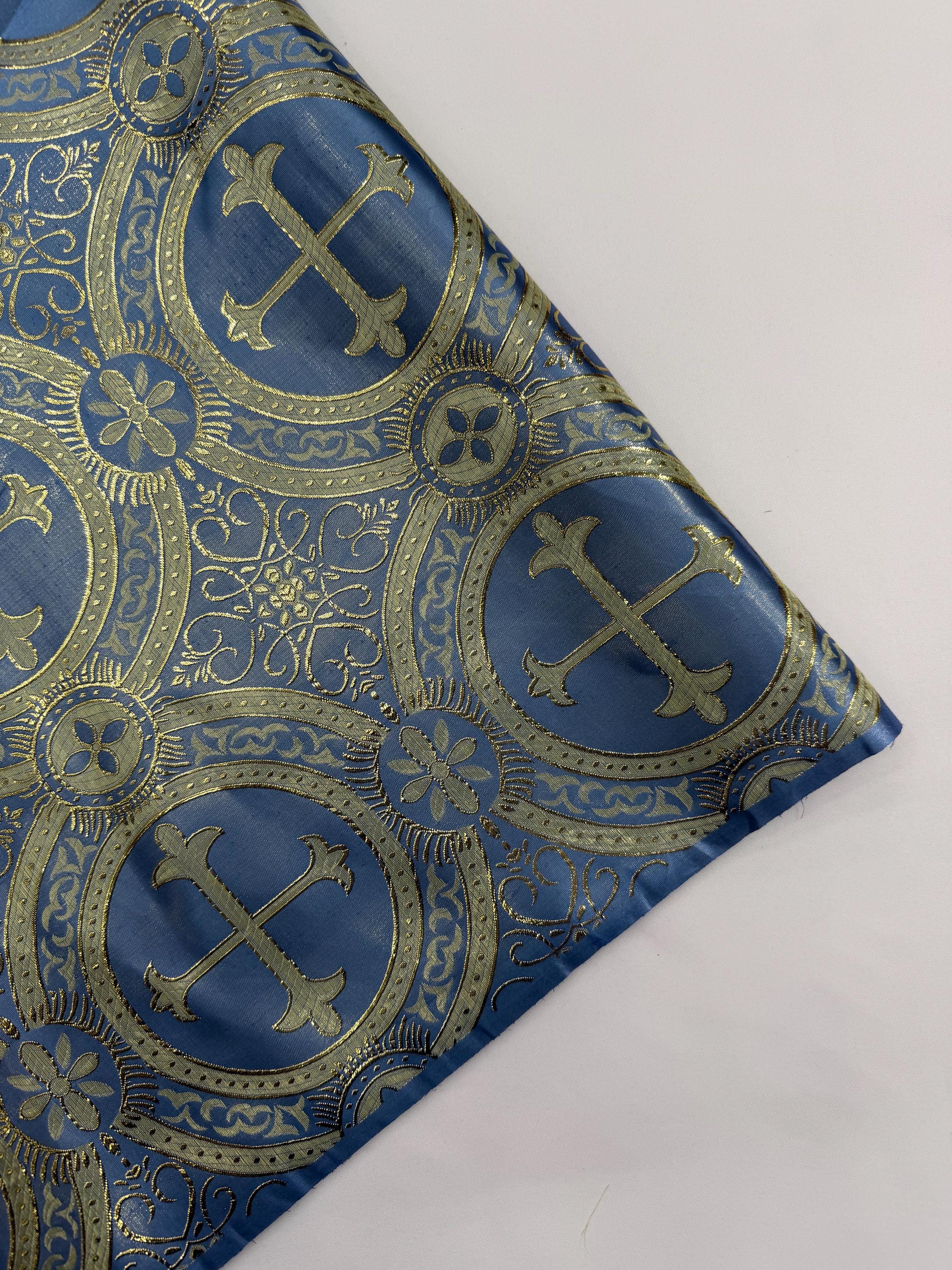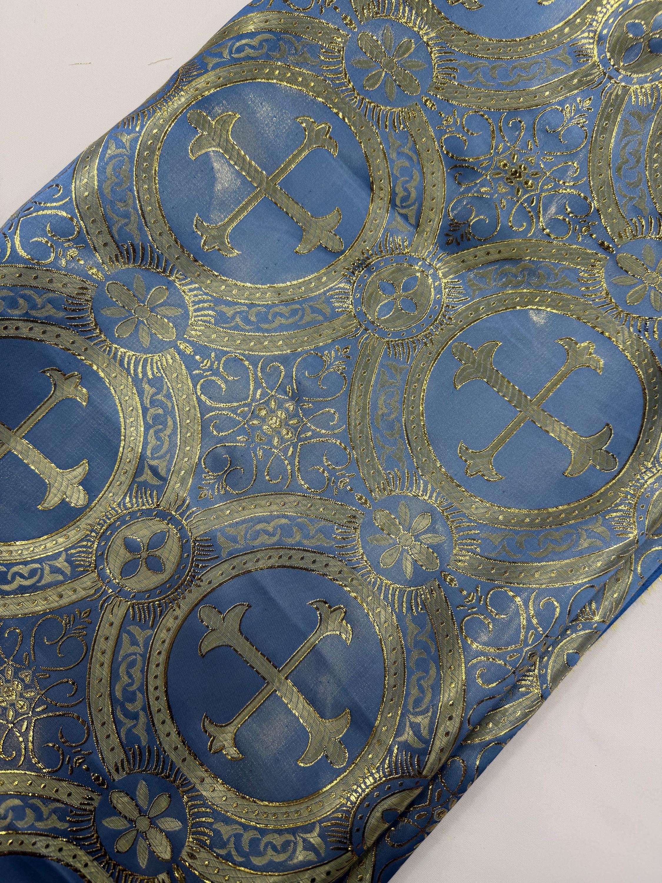 Coppen Blue/Gold Cross Brocade Fabric: Religious Vestment Material - 58/60" Wide