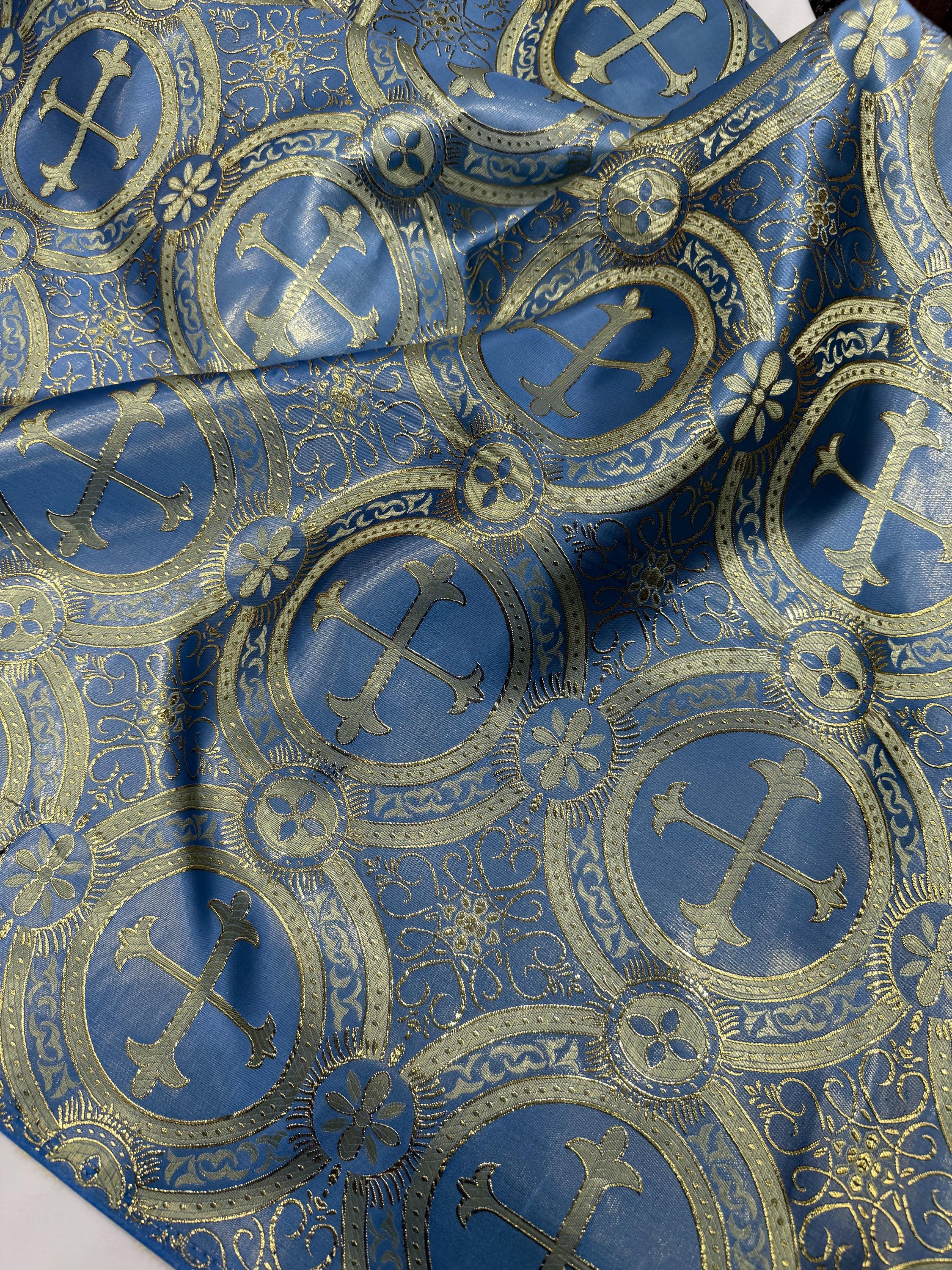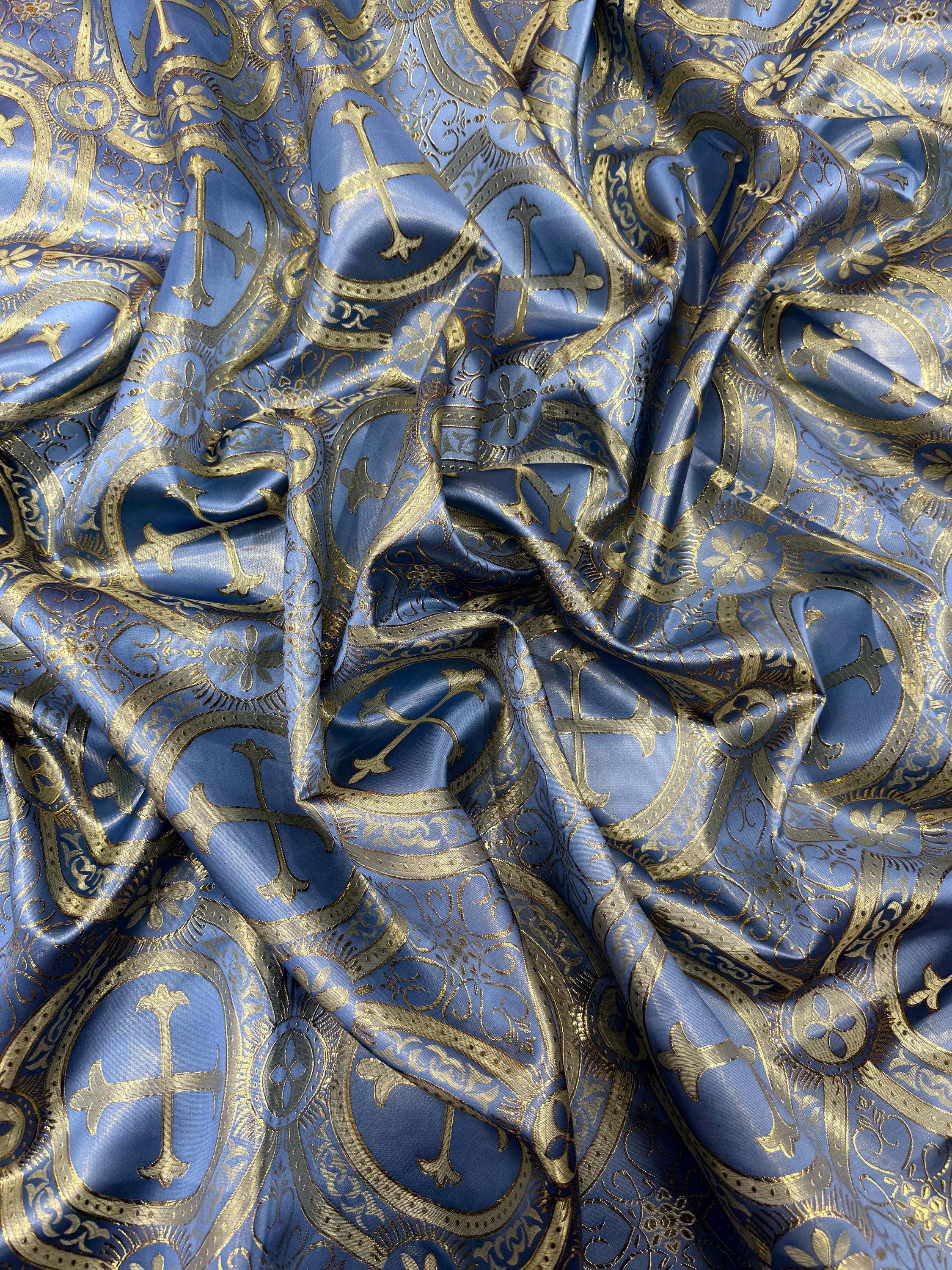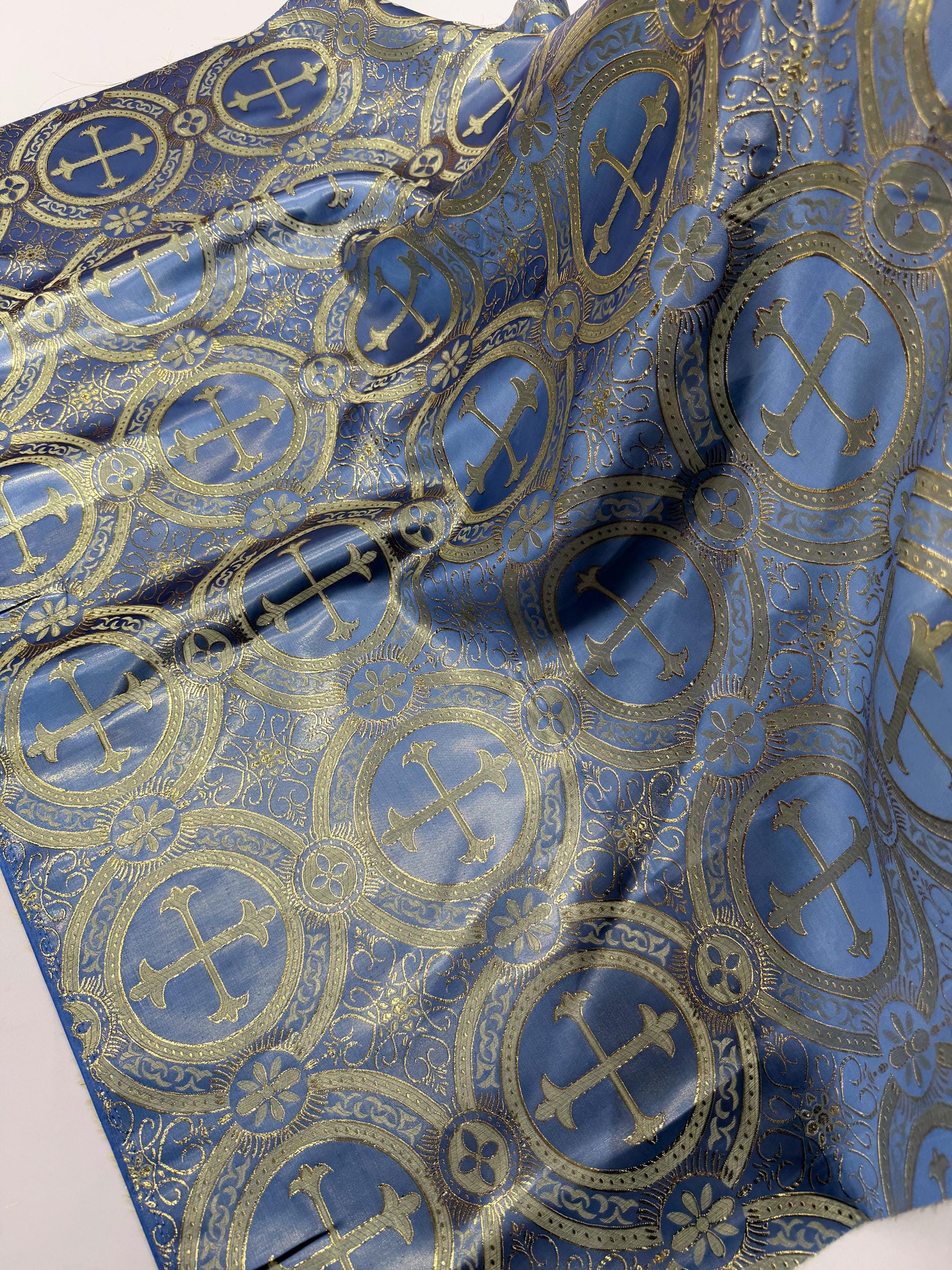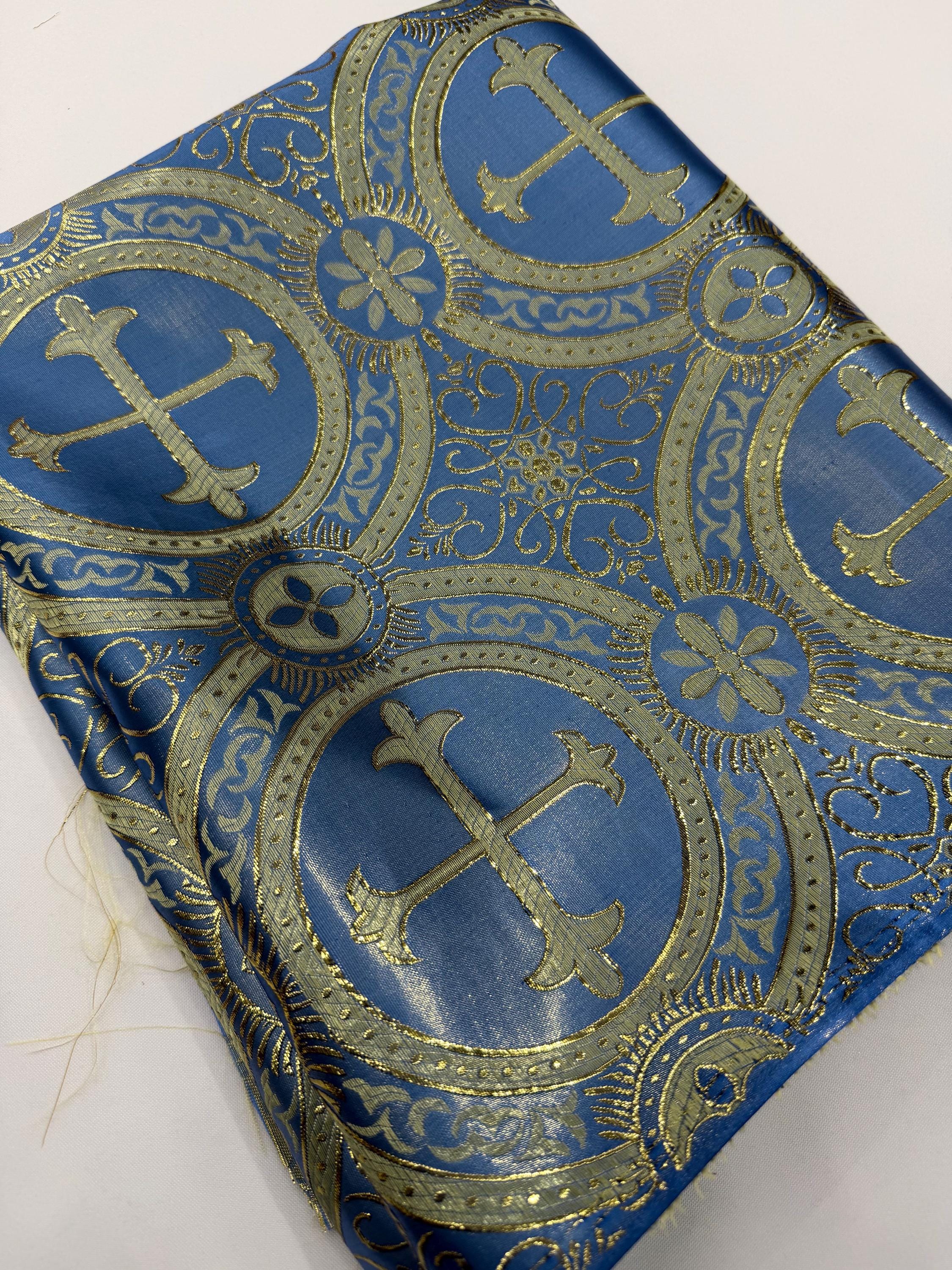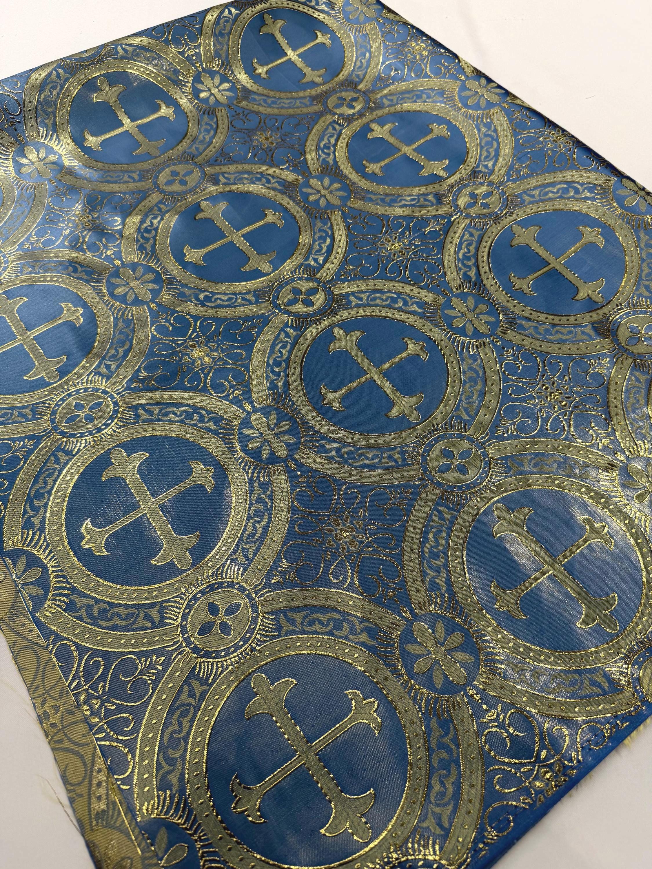 Coppen Blue/Gold Cross Brocade Fabric: Religious Vestment Material - 58/60" Wide
