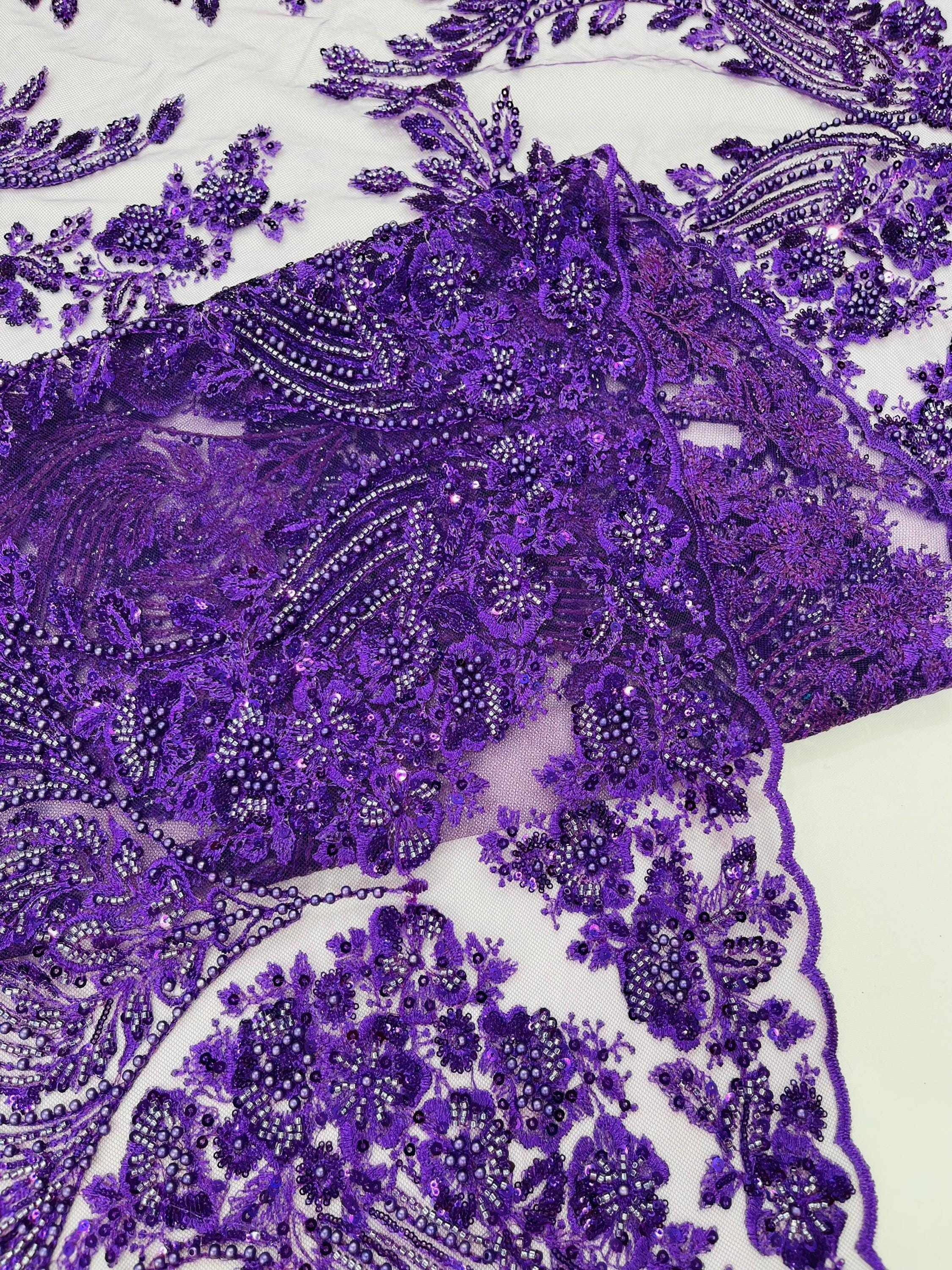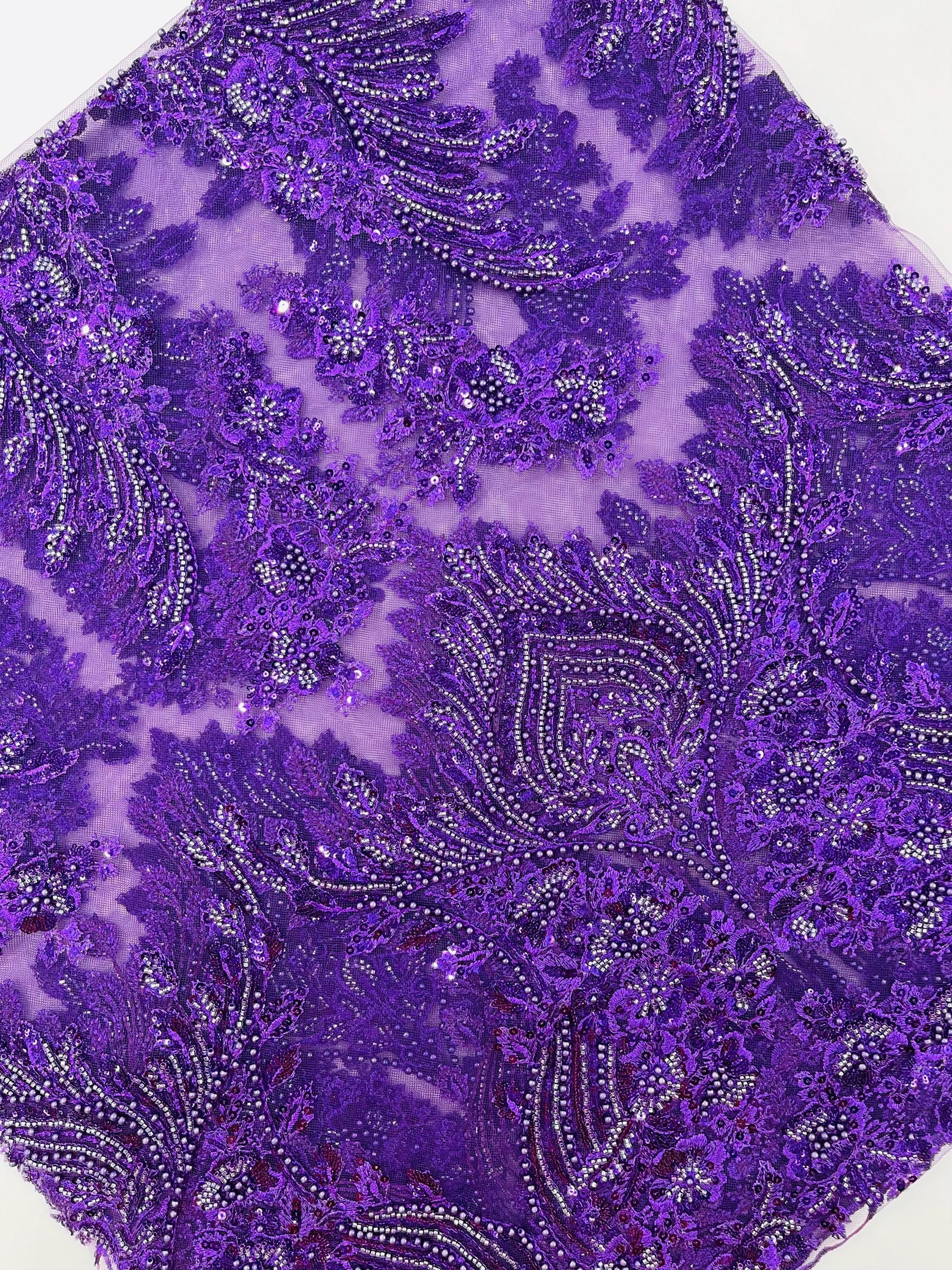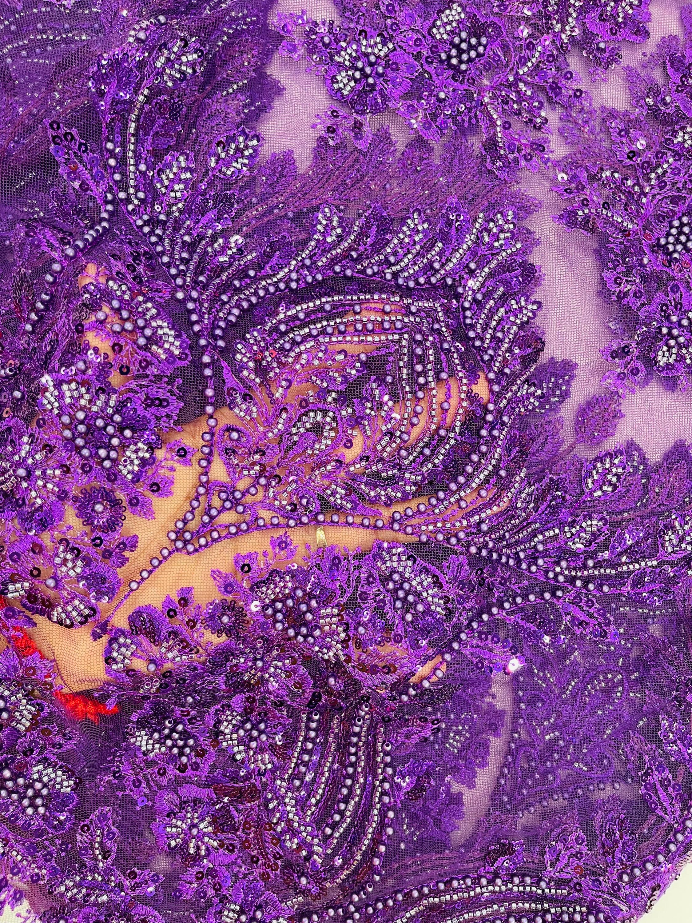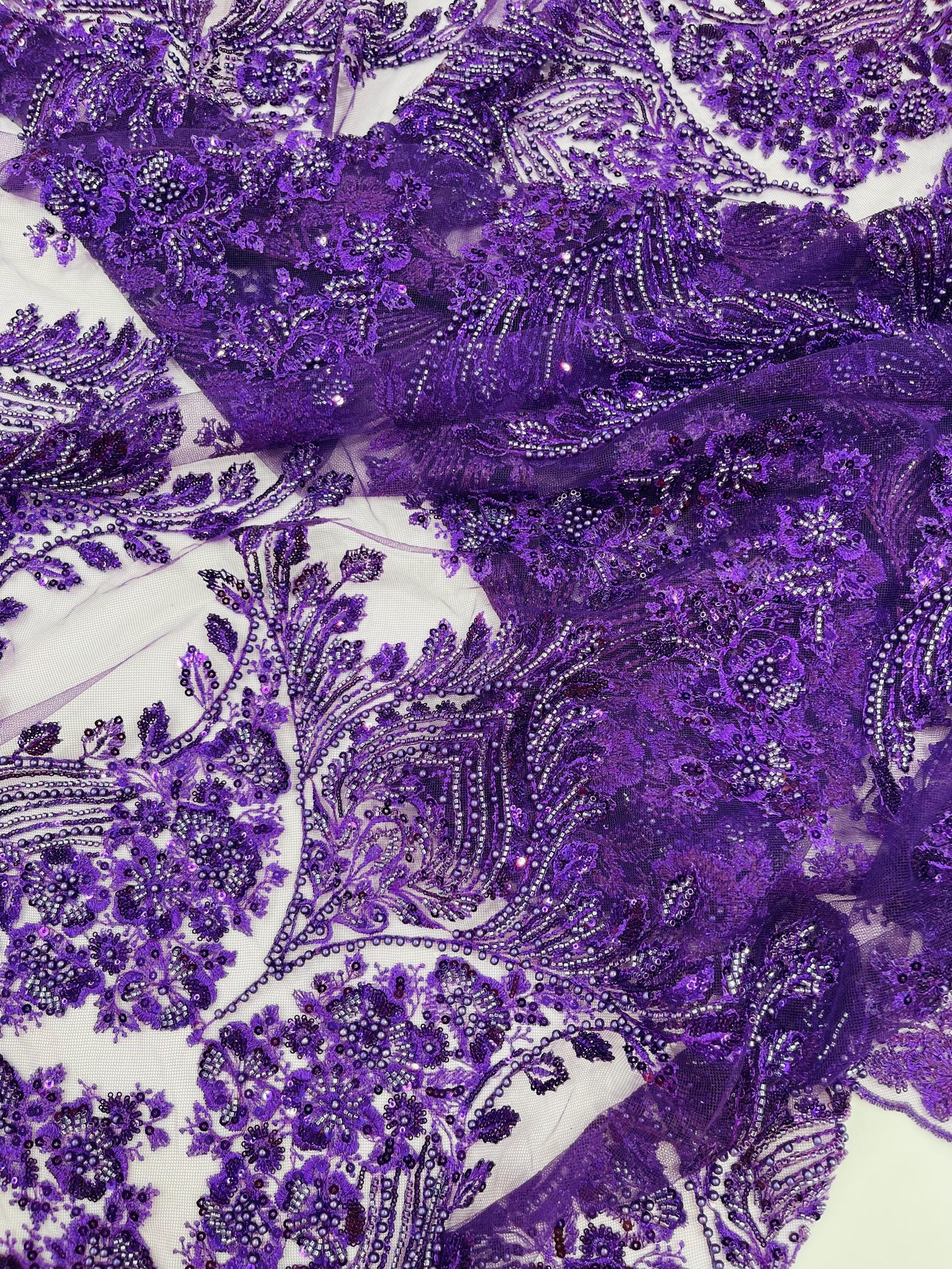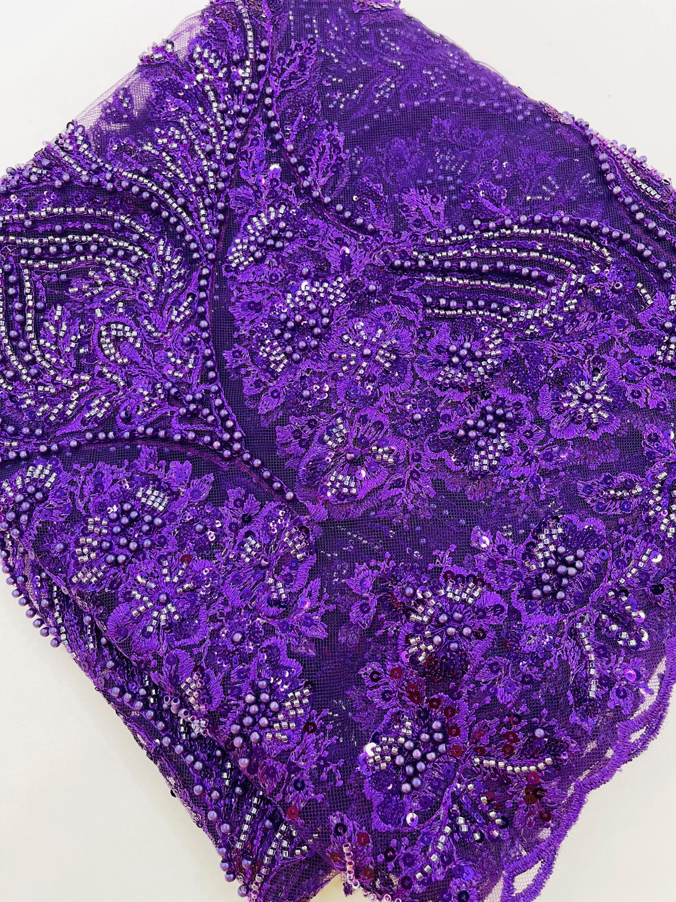 Purple Beaded Fabric: Embroidered Butterfly Pattern, Bridal Wedding Fabric