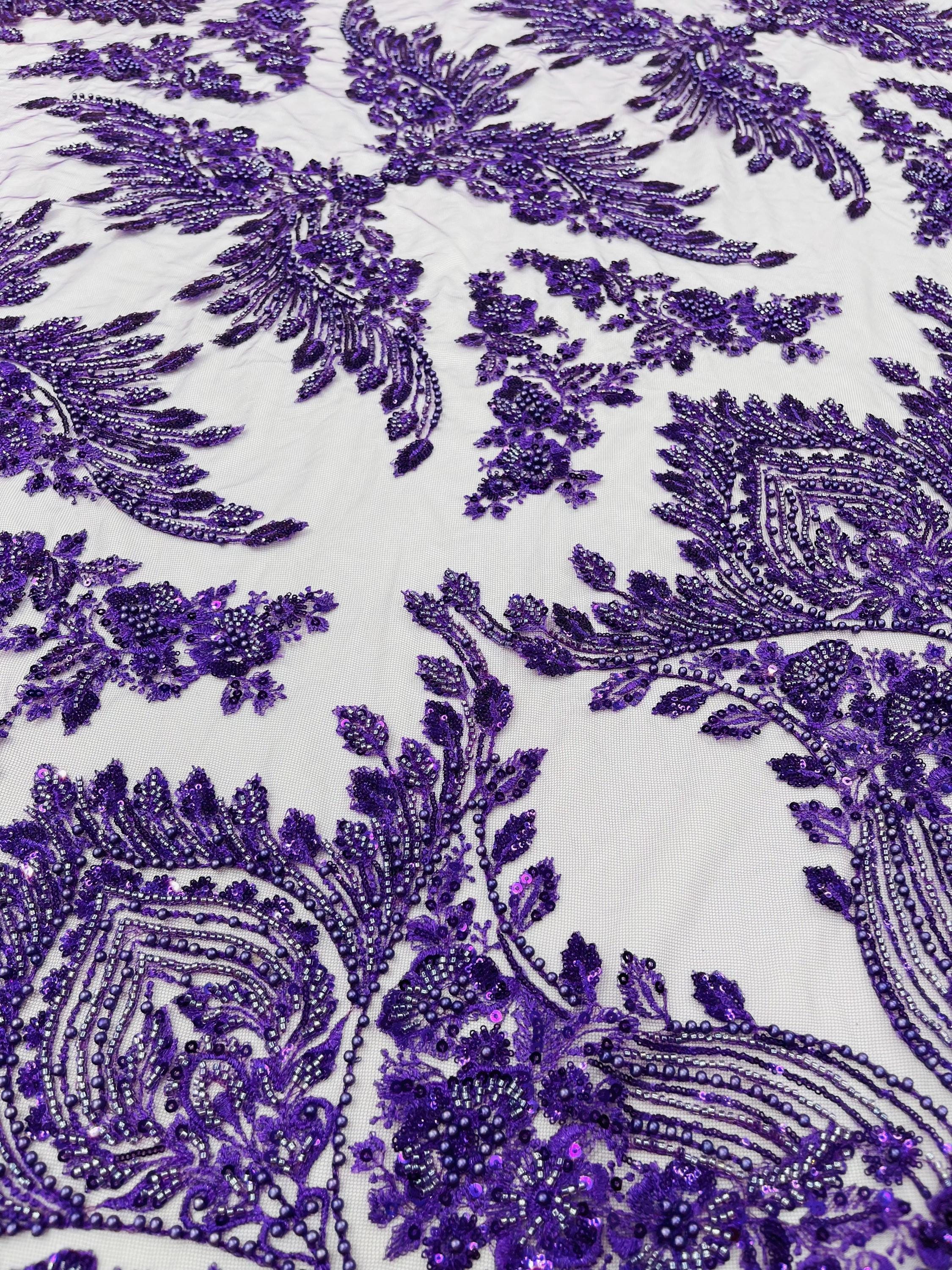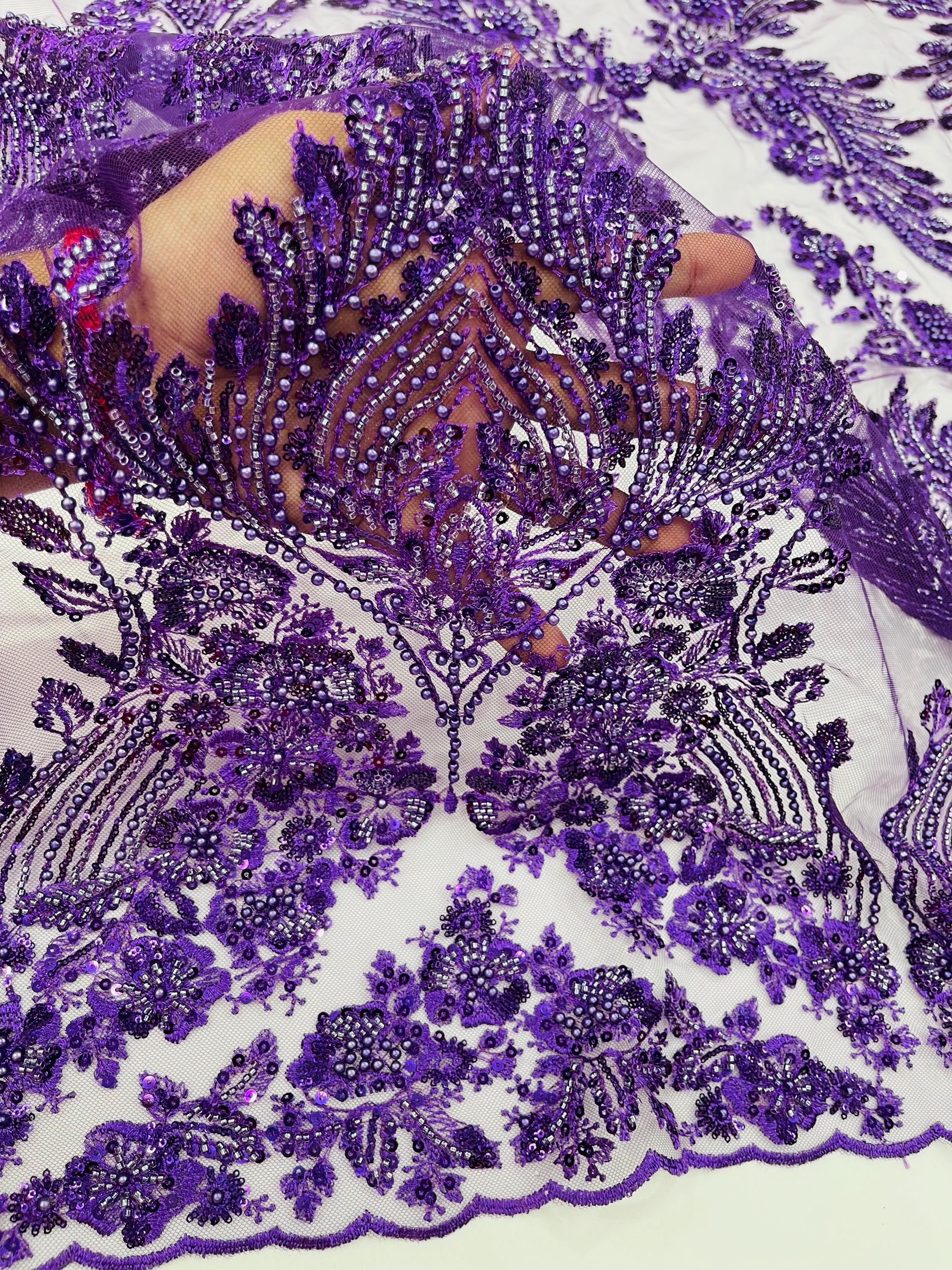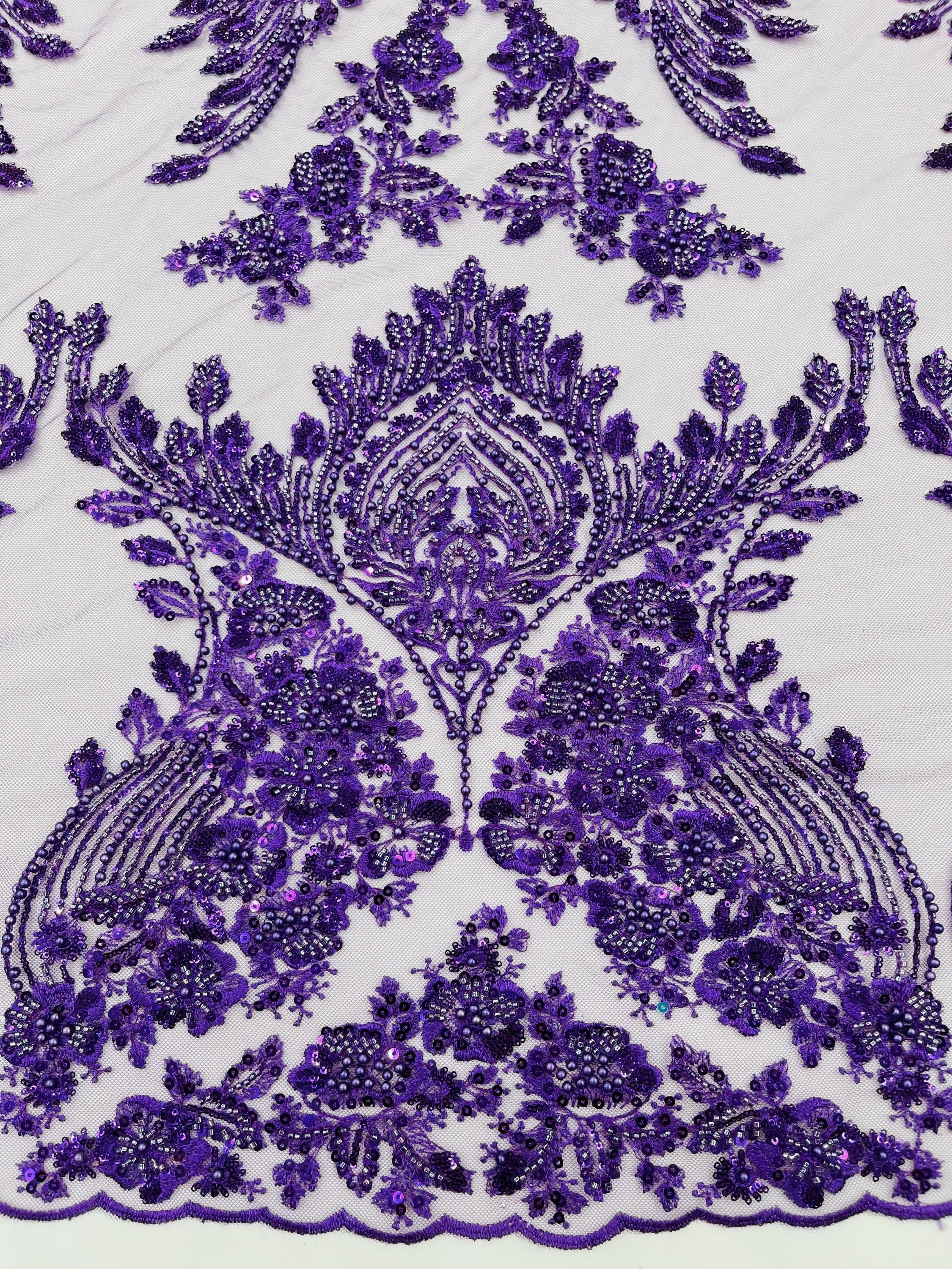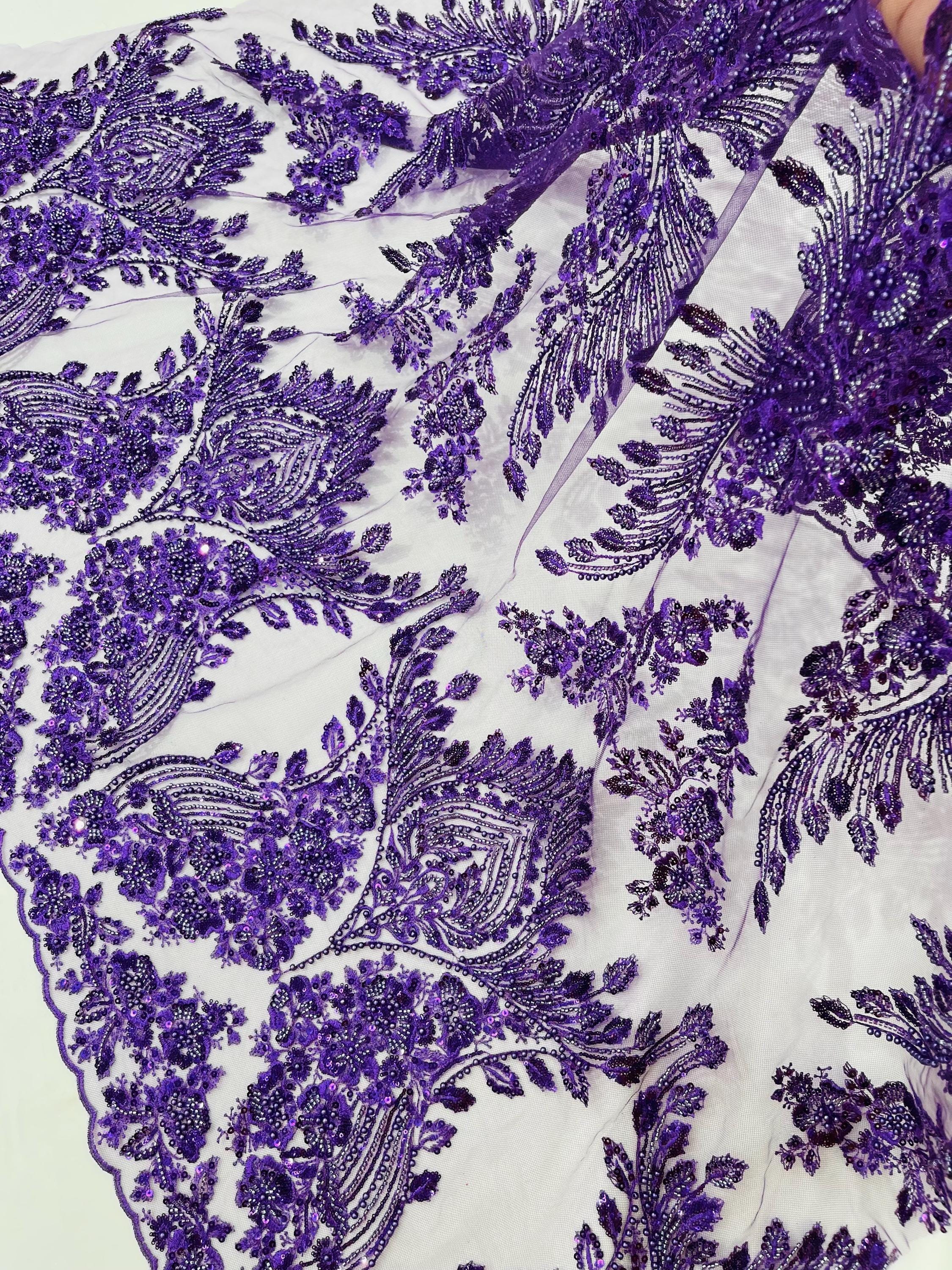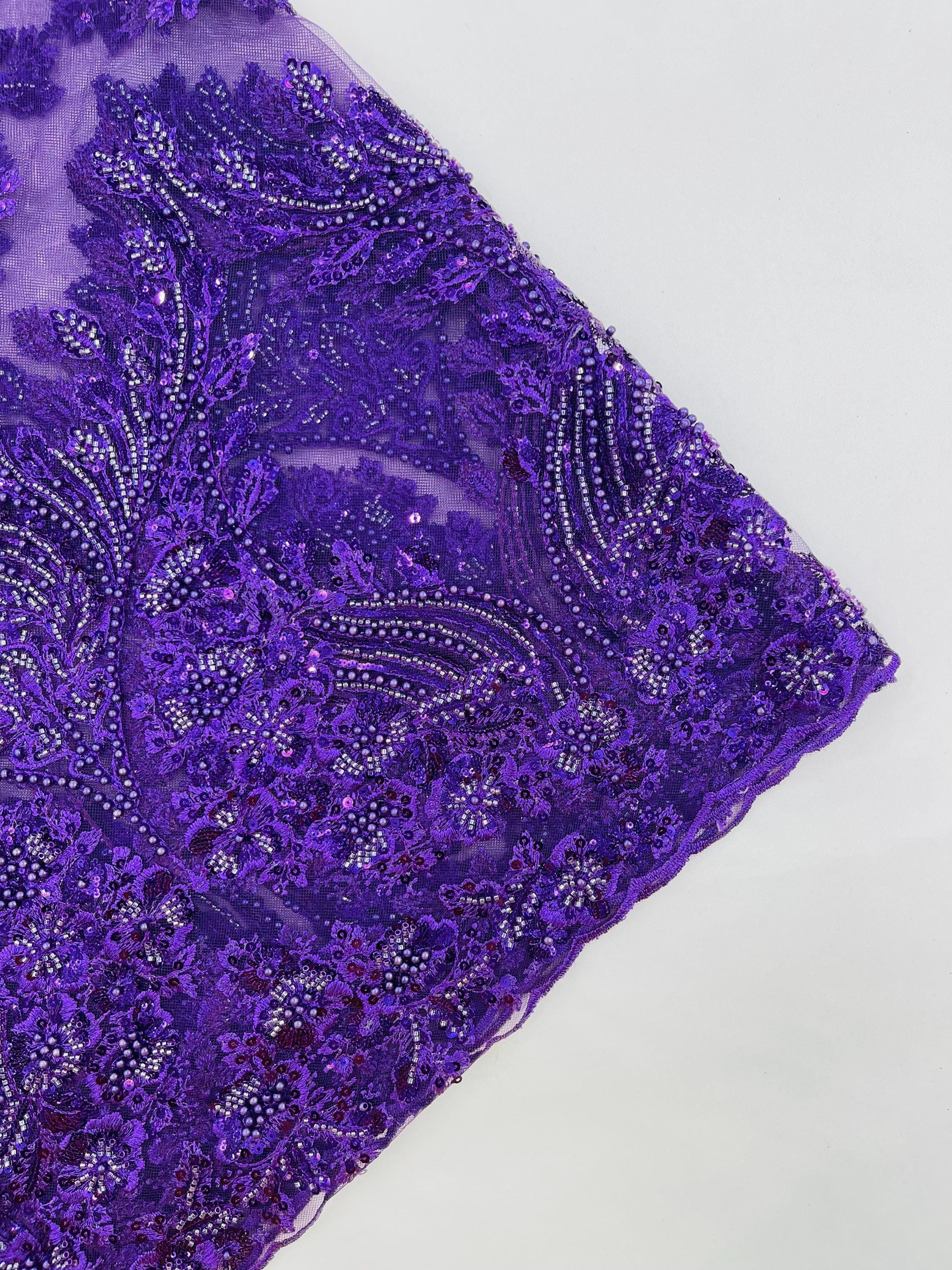Purple Beaded Fabric: Embroidered Butterfly Pattern, Bridal Wedding Fabric