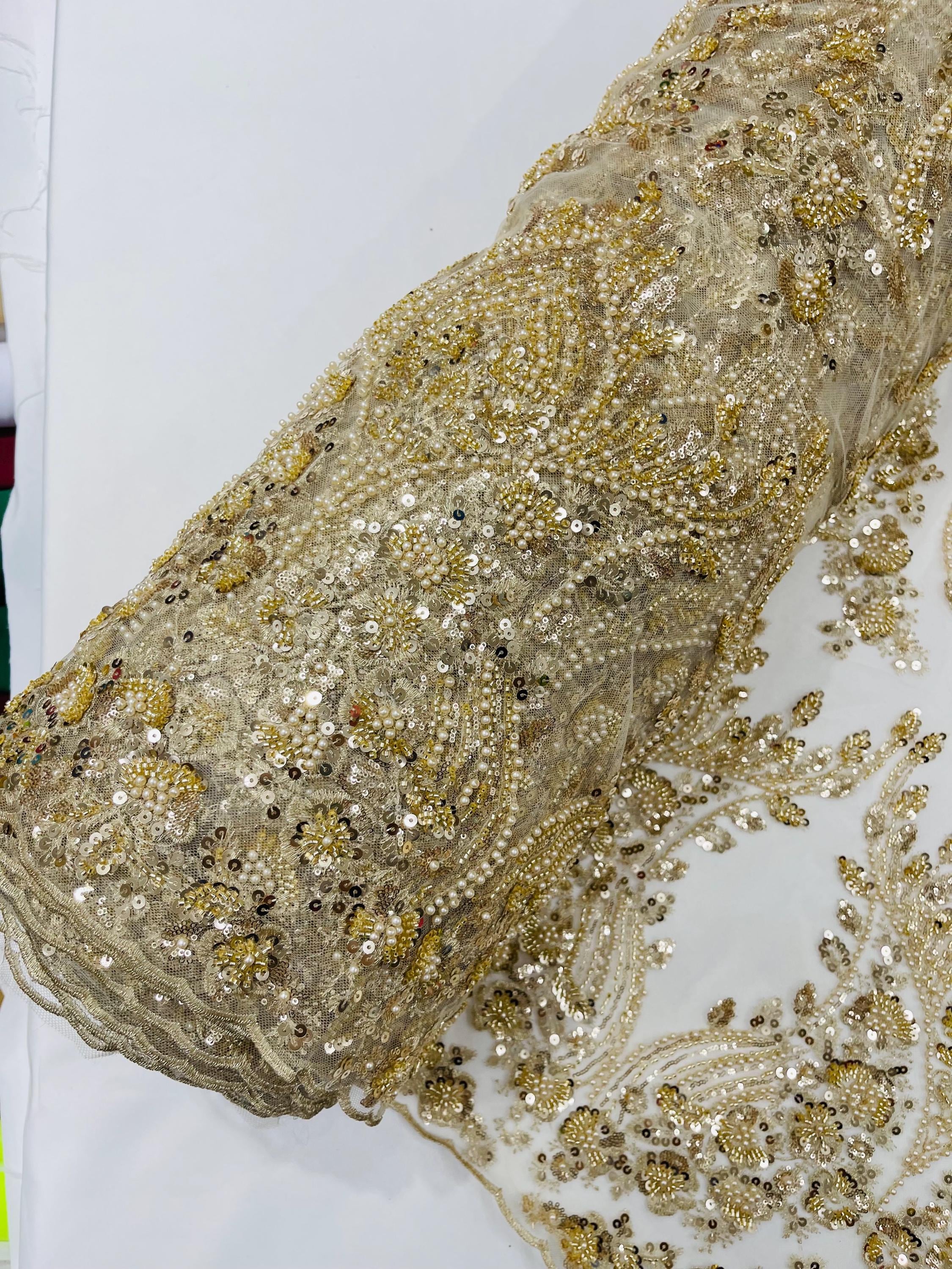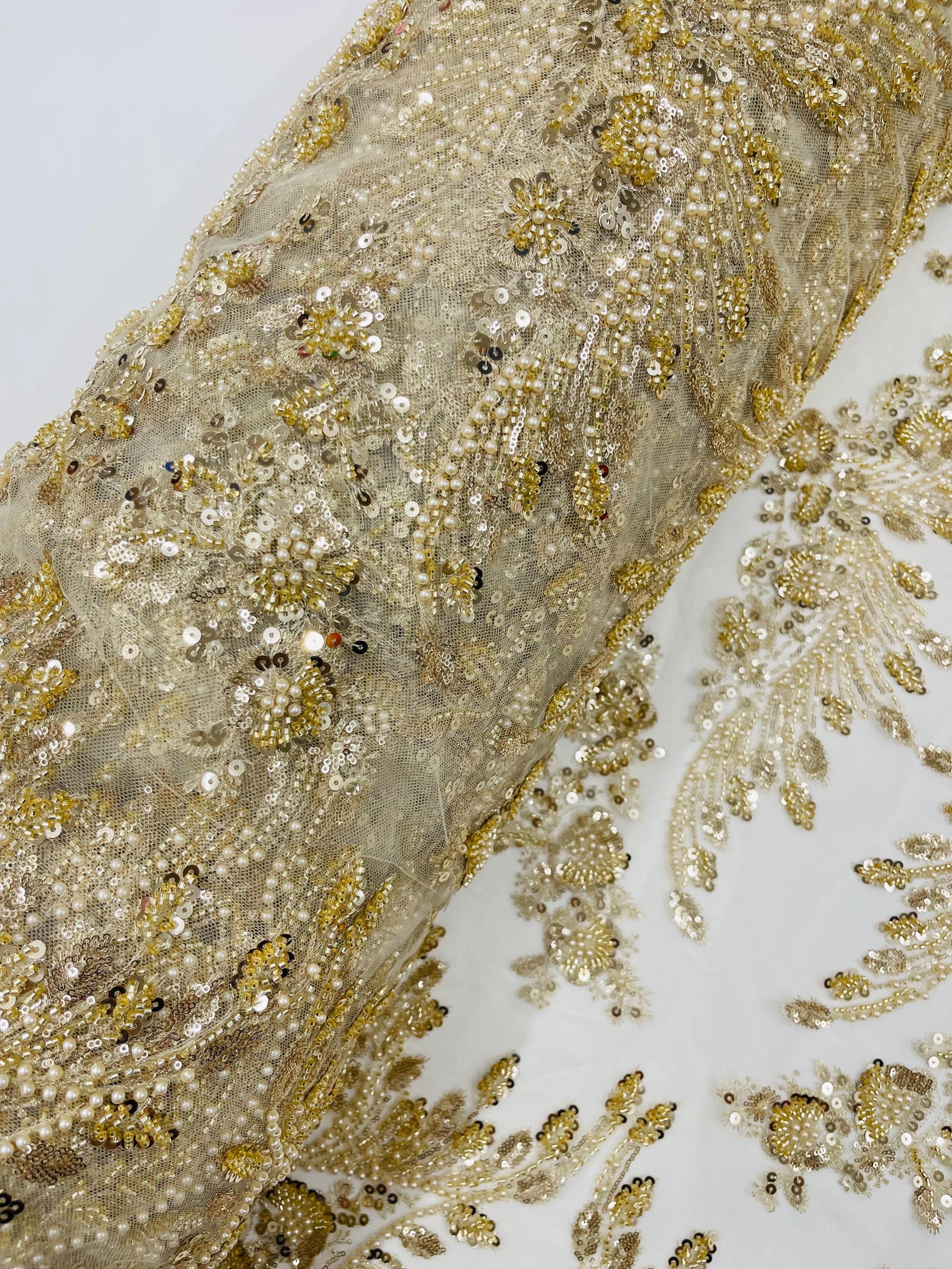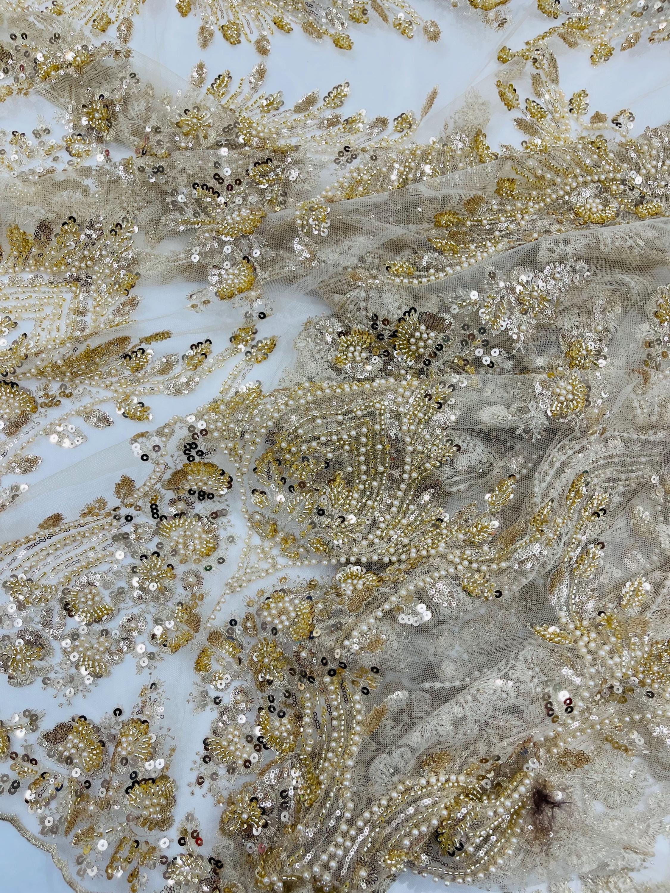 Champagne Beaded Fabric: Embroidered Butterfly Pattern, Bridal Wedding Fabric